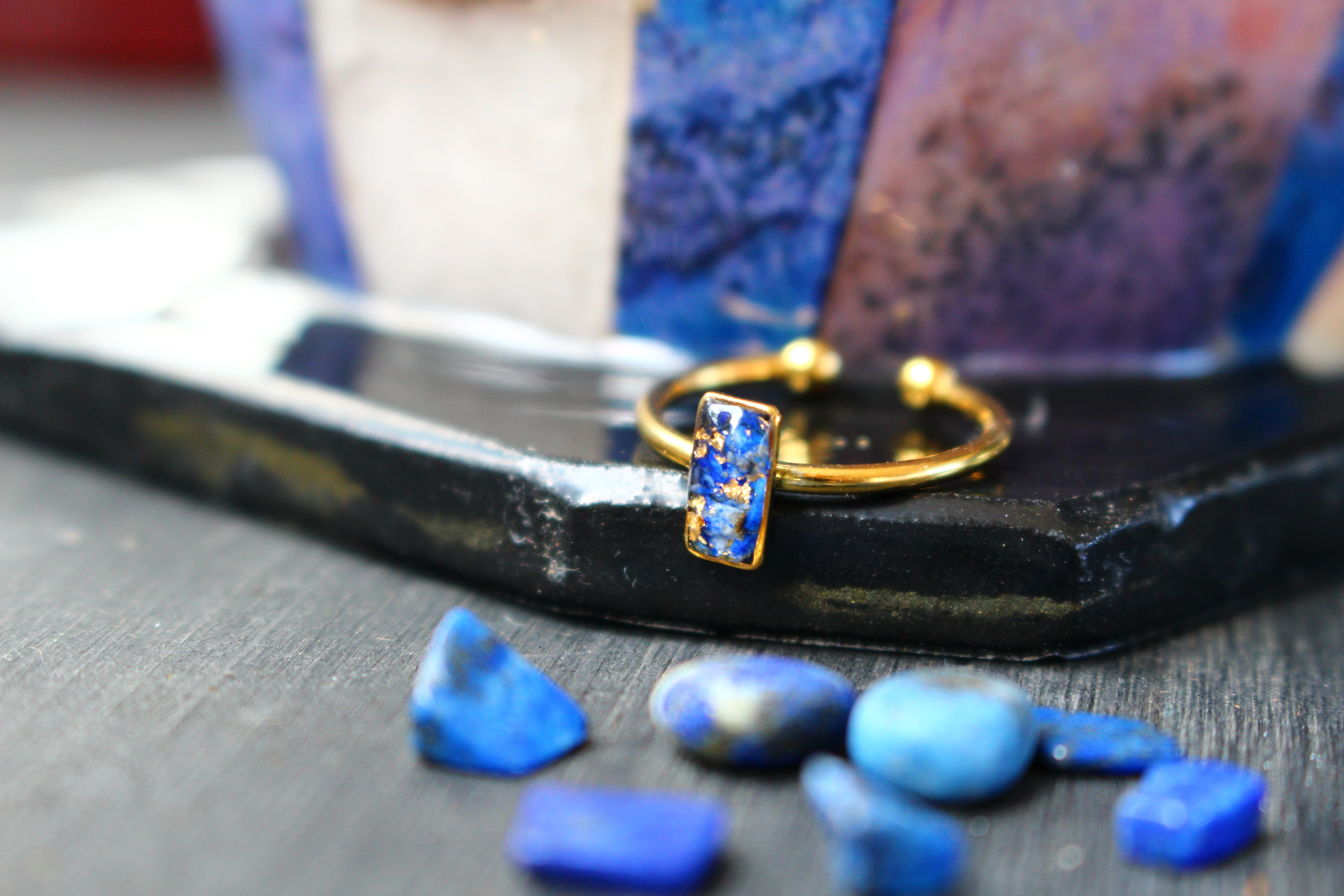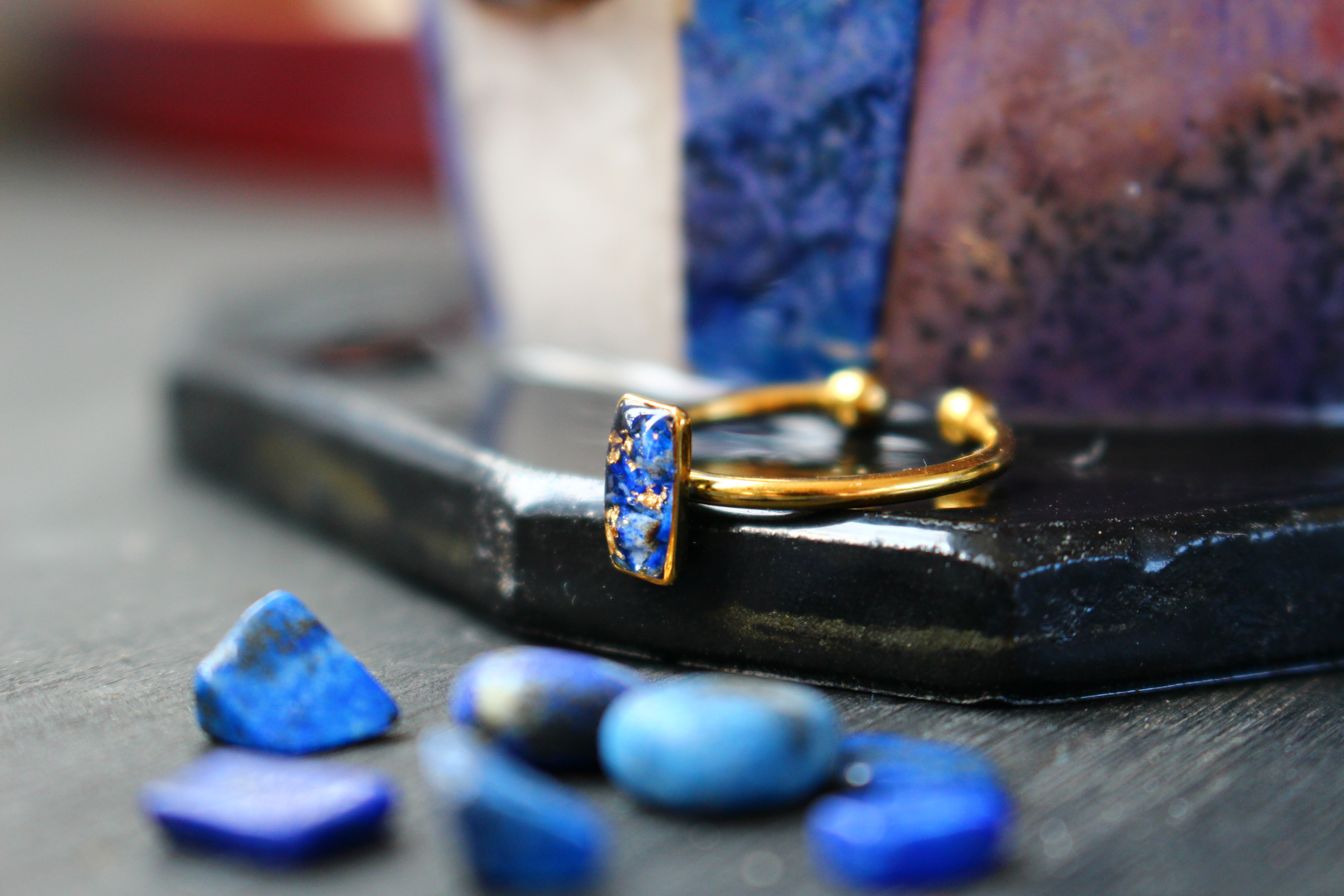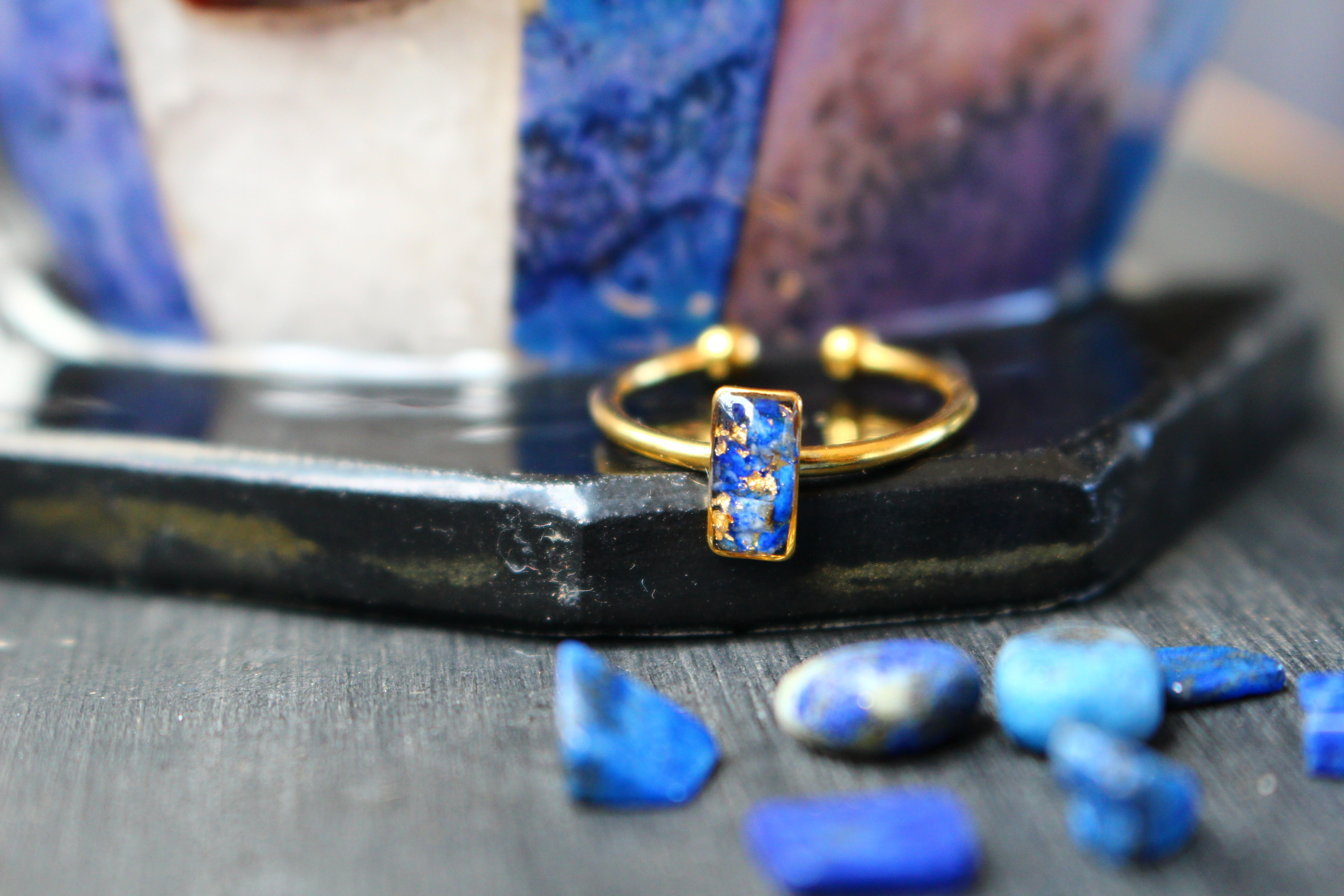 Bague avec cabochon rectangulaire rempli de résine dans laquelle sont incrustées de petits morceaux de pierres de lapis lazuli et des paillettes de feuilles d'or.