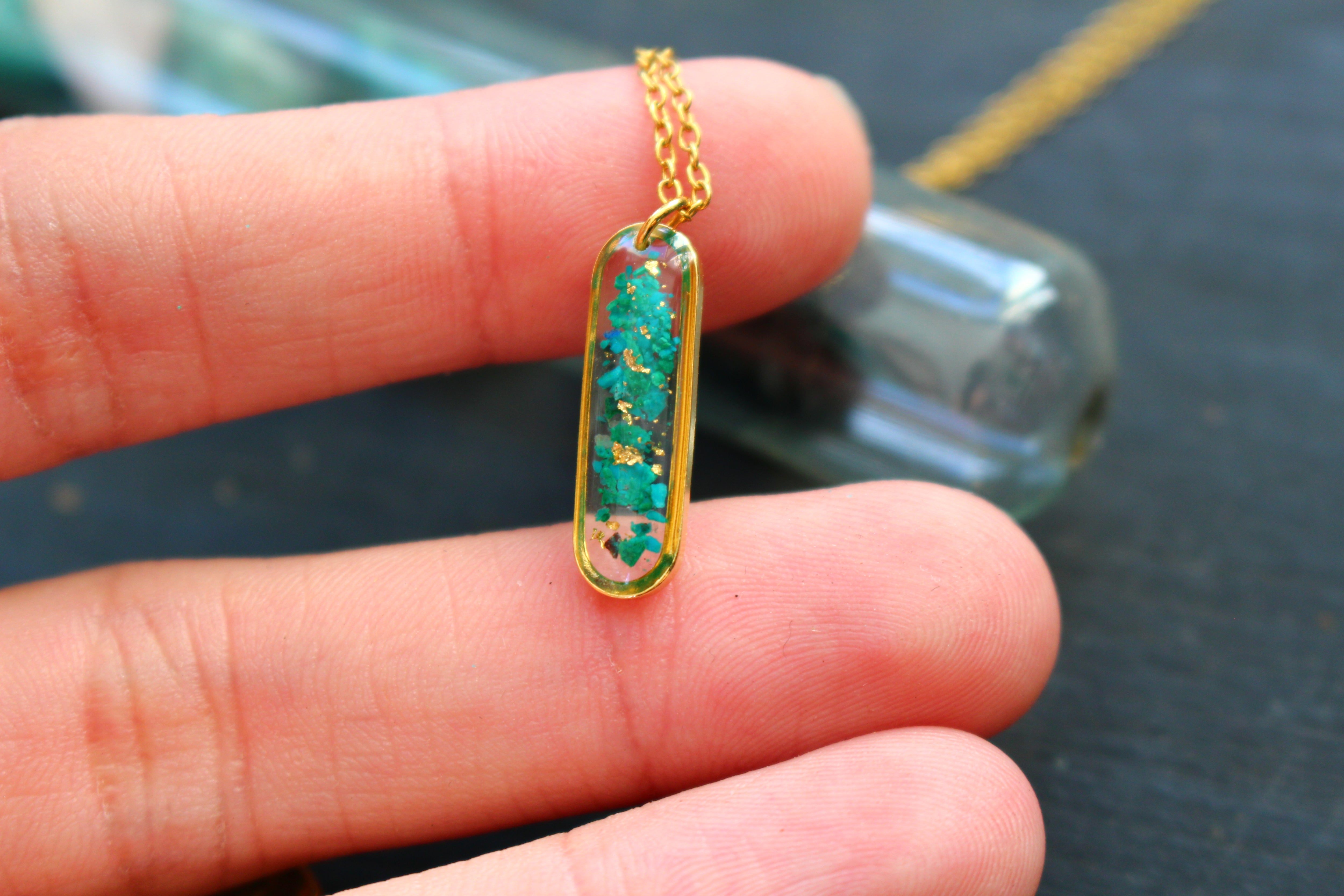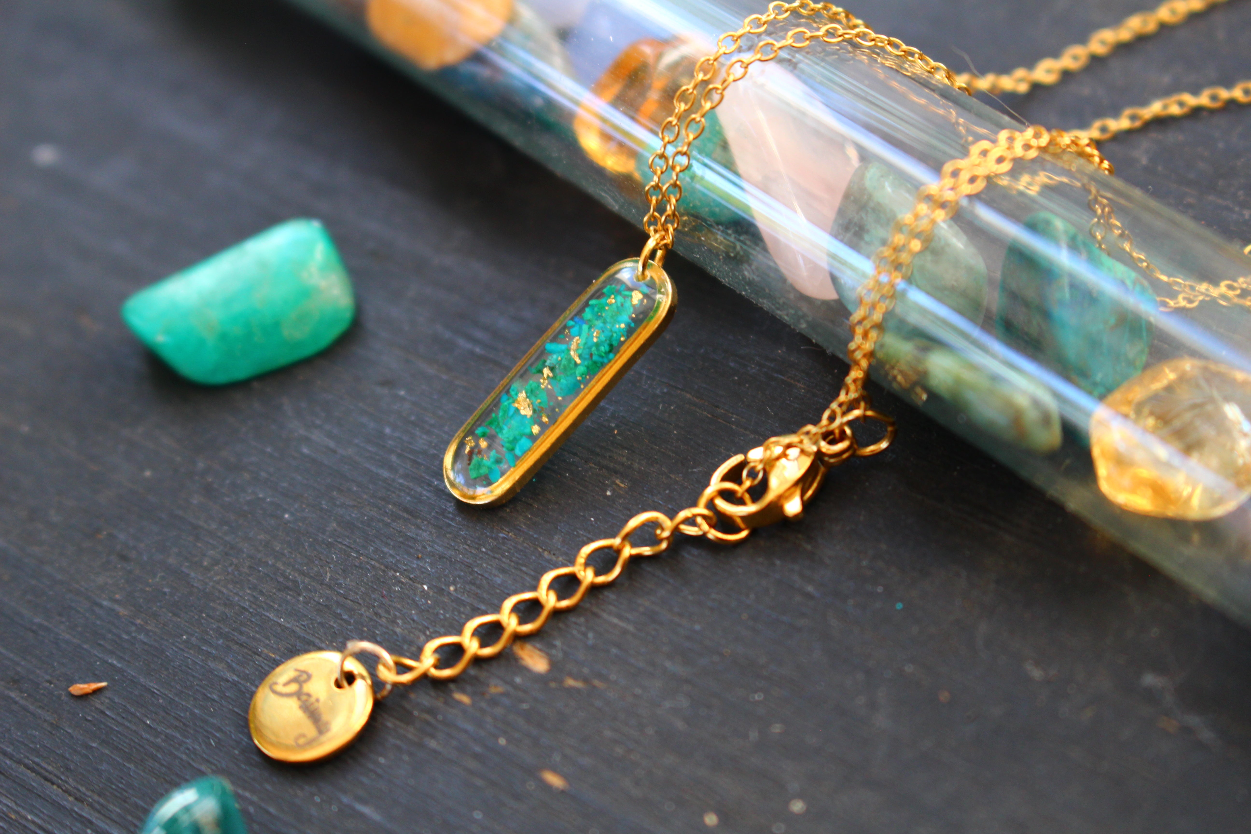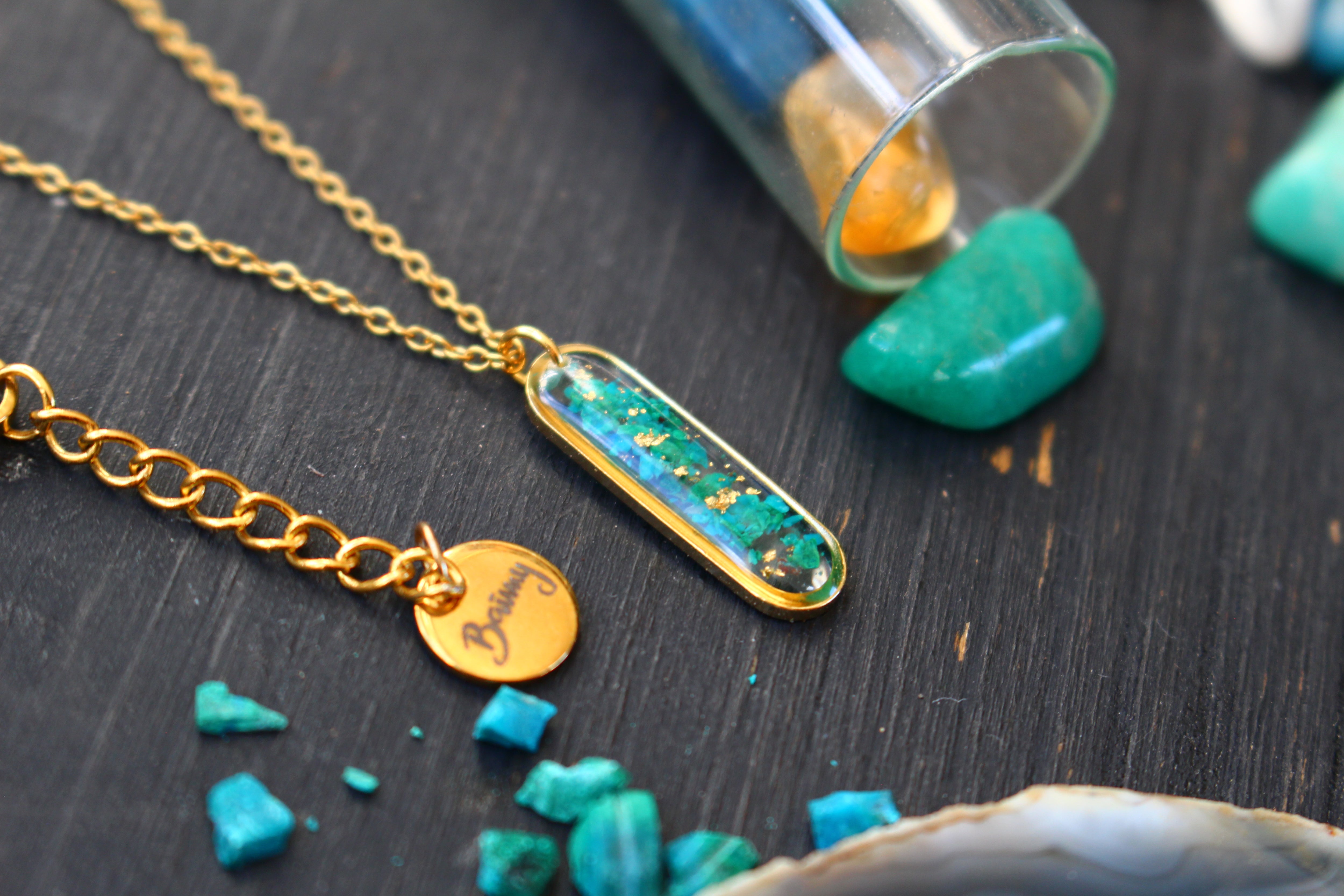 Collier composé d'un médaillon de allongé rempli de résine dans laquelle j'ai incrusté de pierres de Chrysocolle et de la feuille d'or