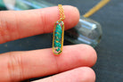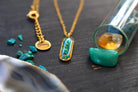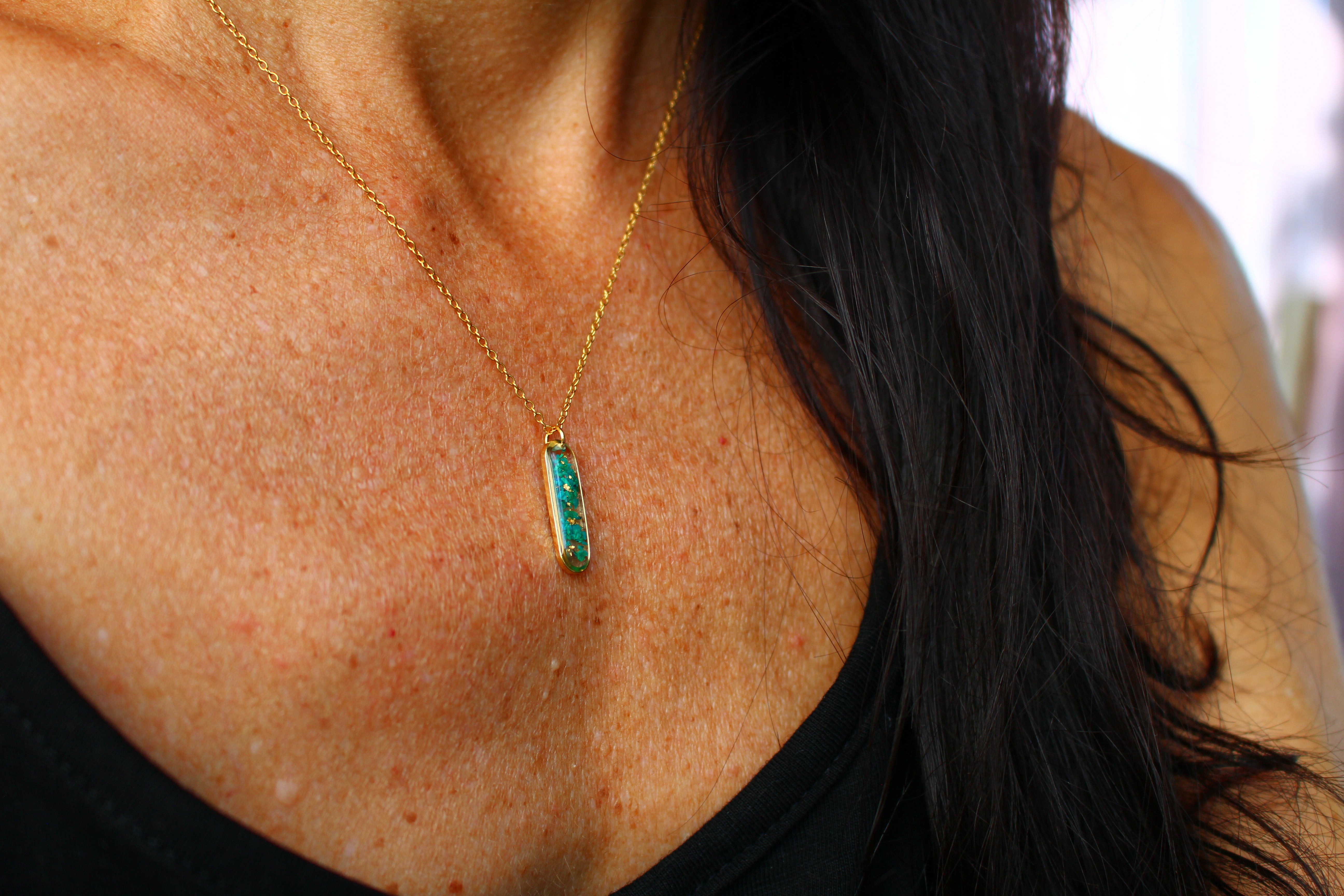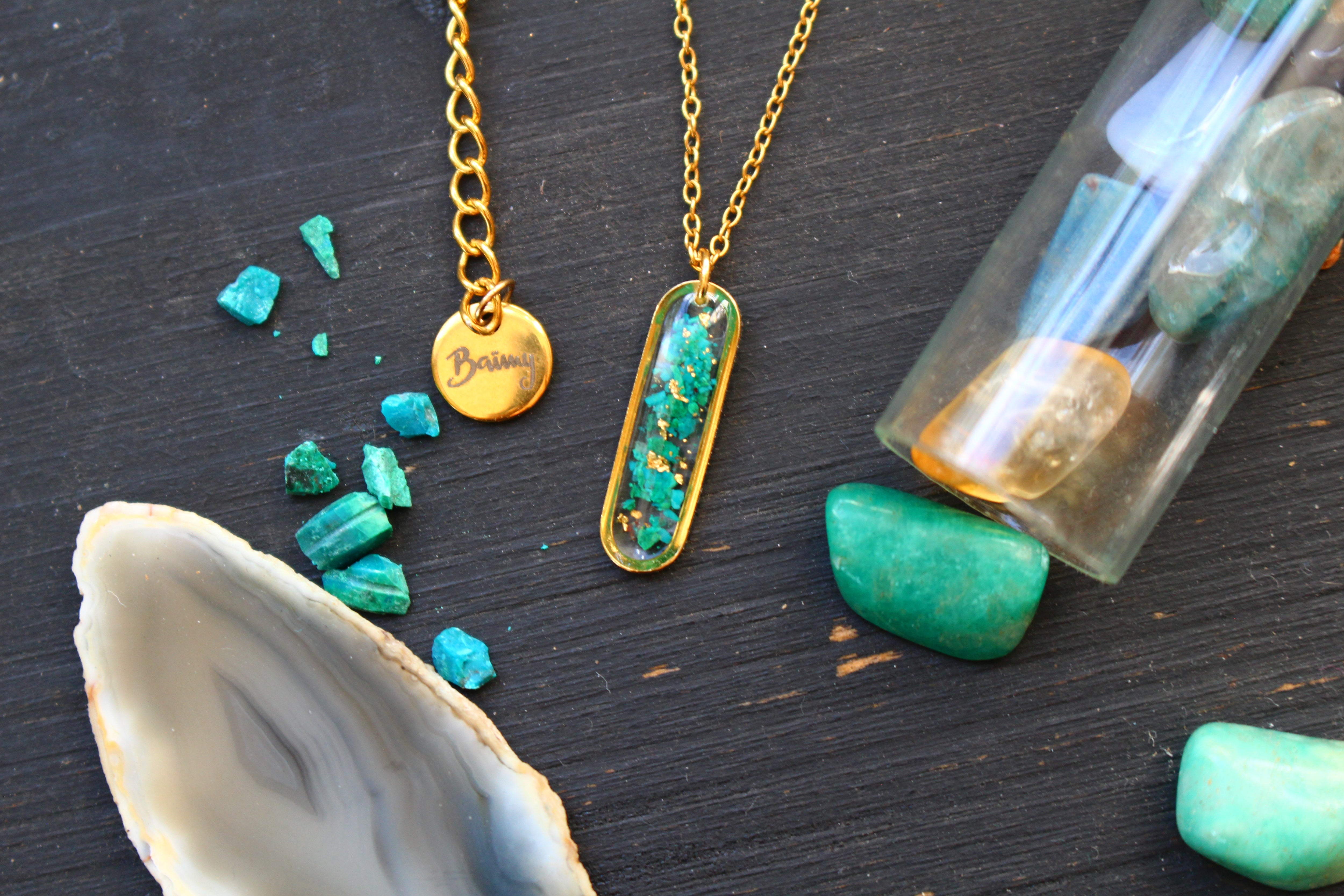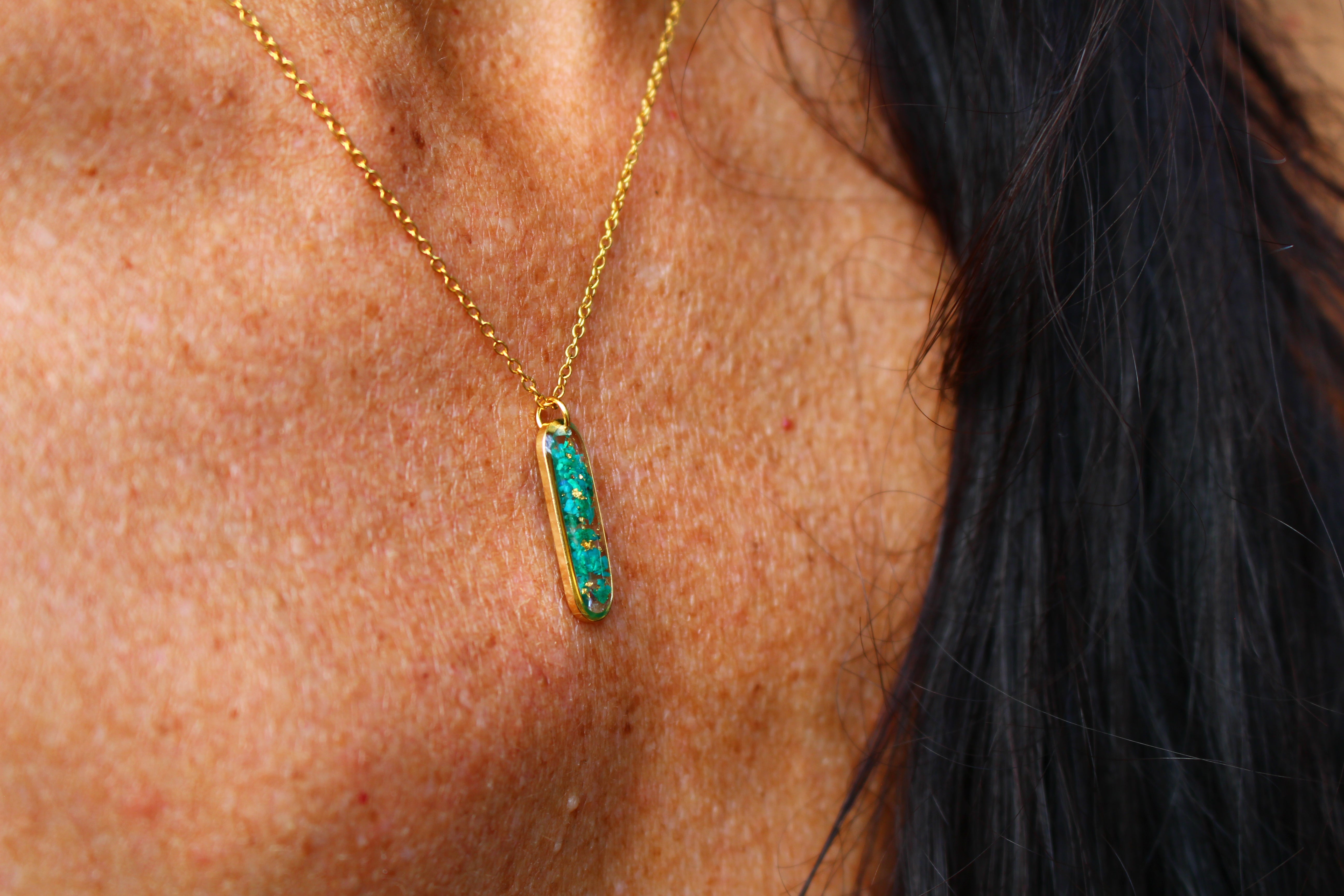 Collier composé d'un médaillon de allongé rempli de résine dans laquelle j'ai incrusté de pierres de Chrysocolle et de la feuille d'or
