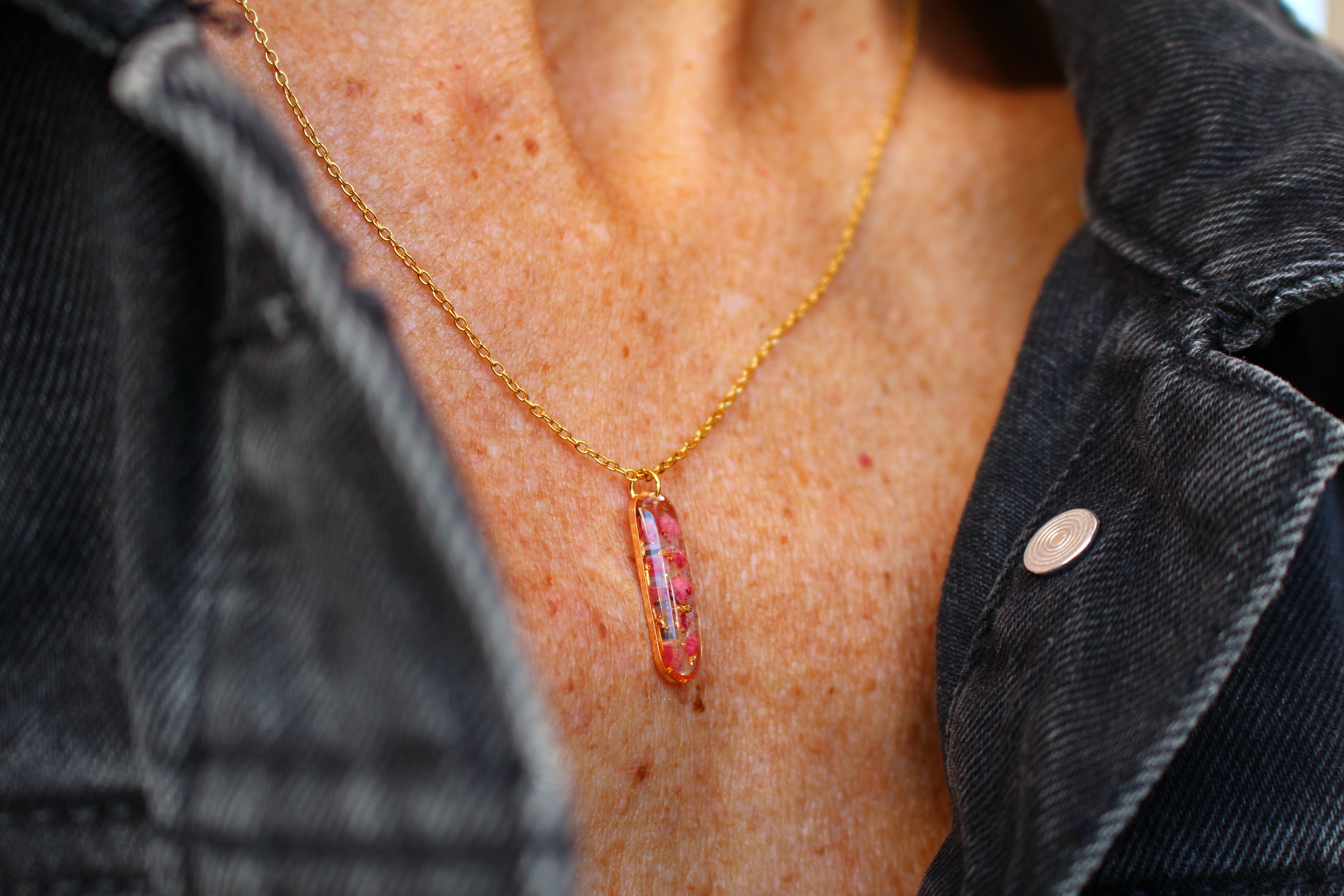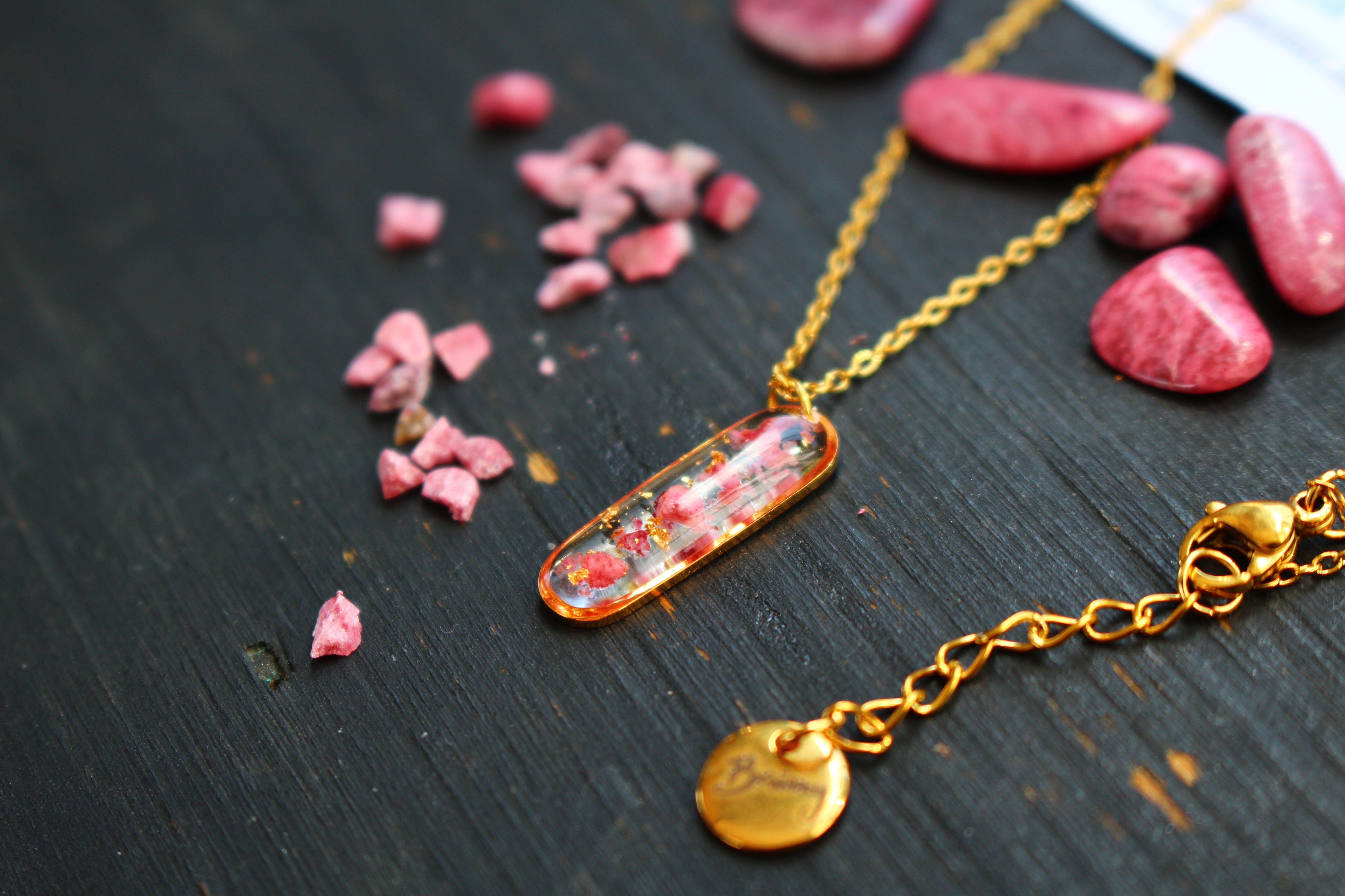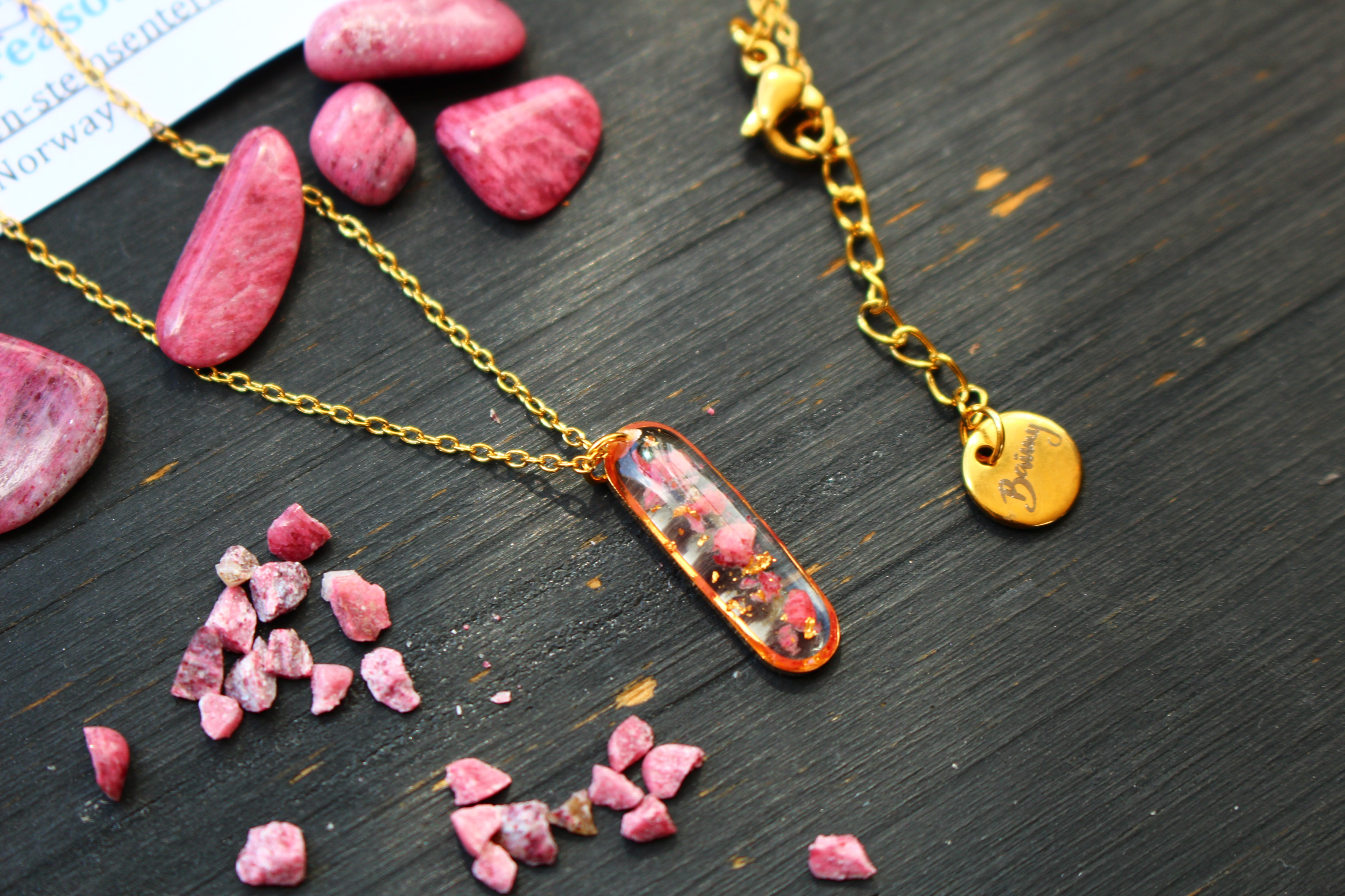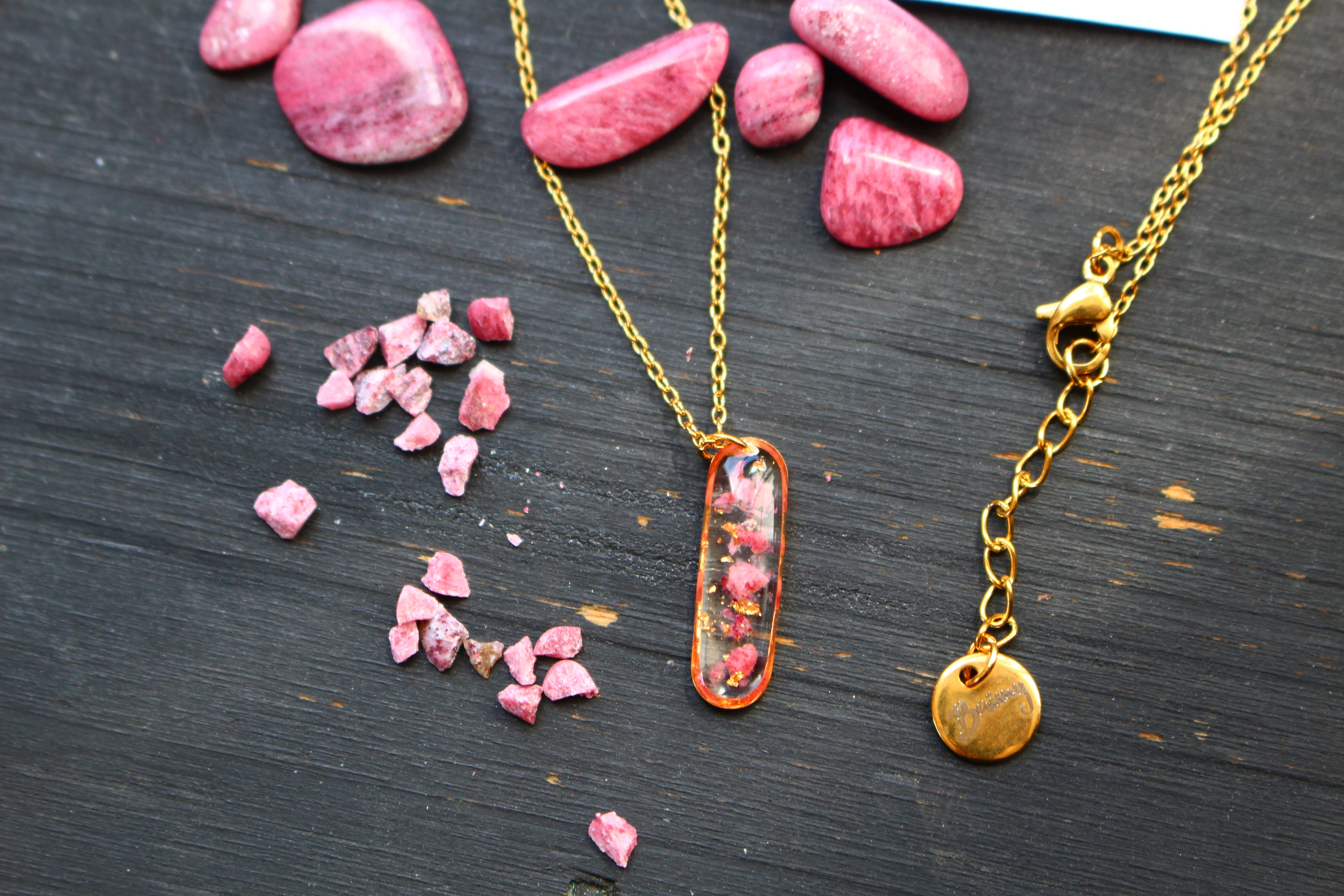 Collier composé d'un médaillon de allongé rempli de résine dans laquelle j'ai incrusté de pierres de Thulite et de la feuille d'or