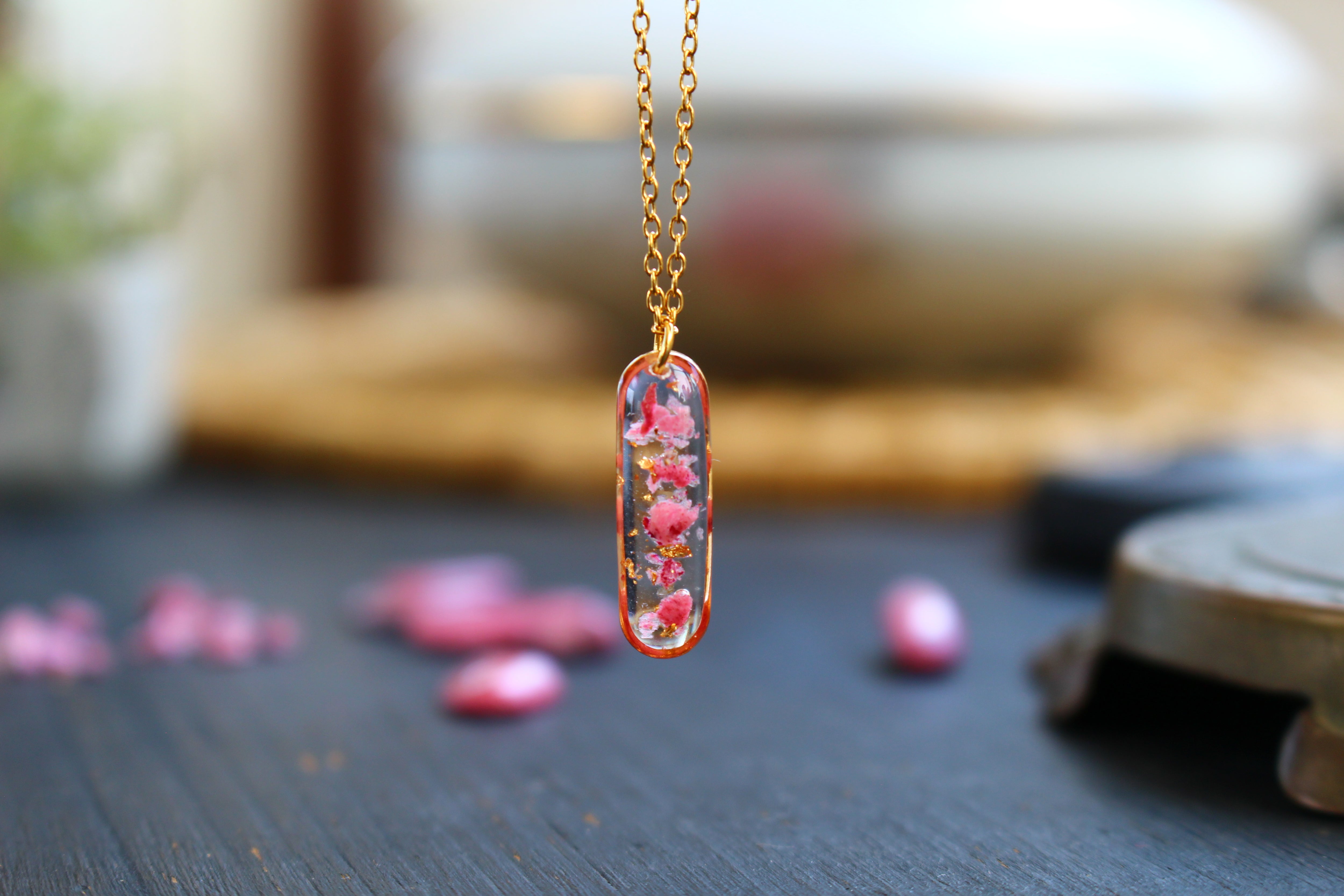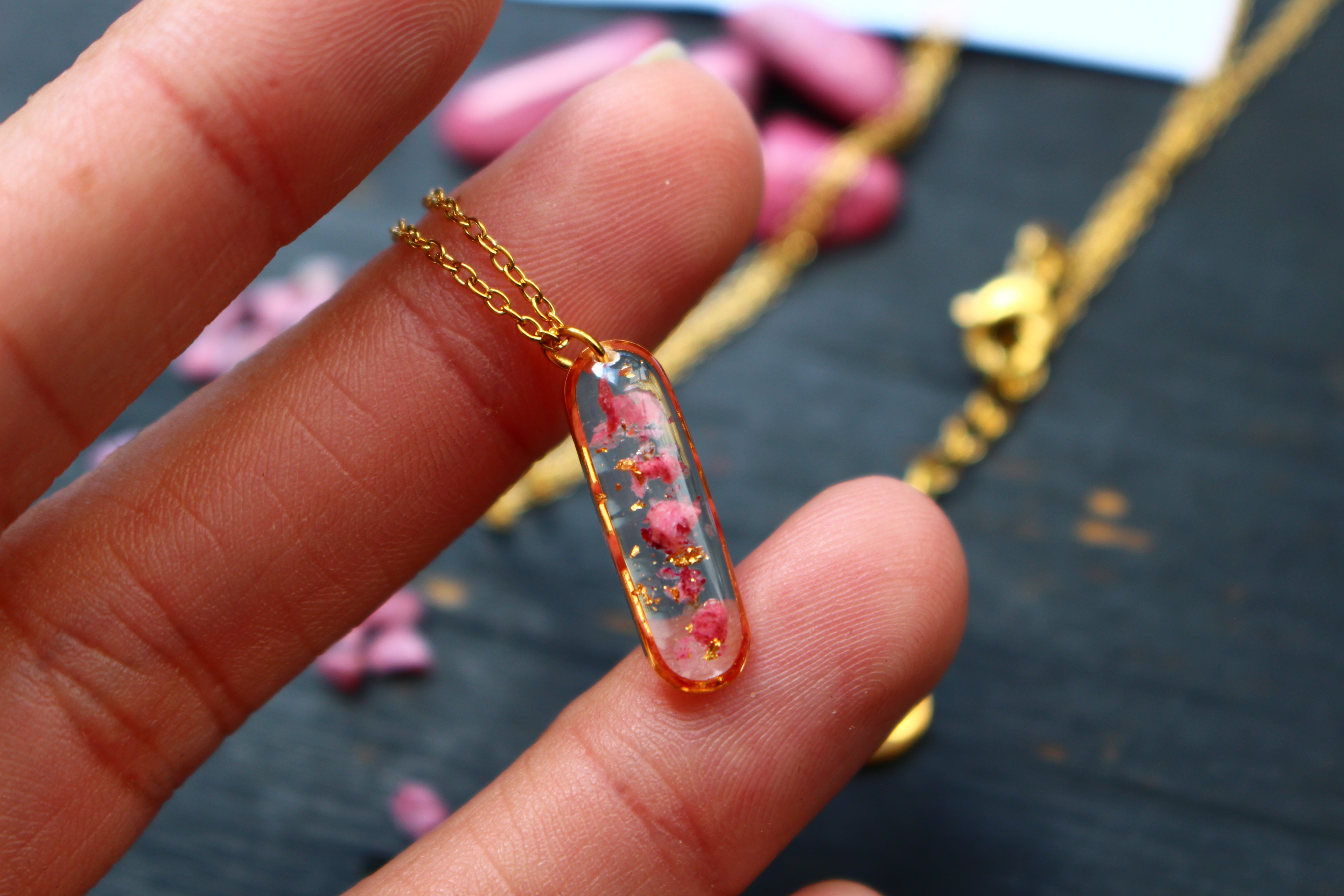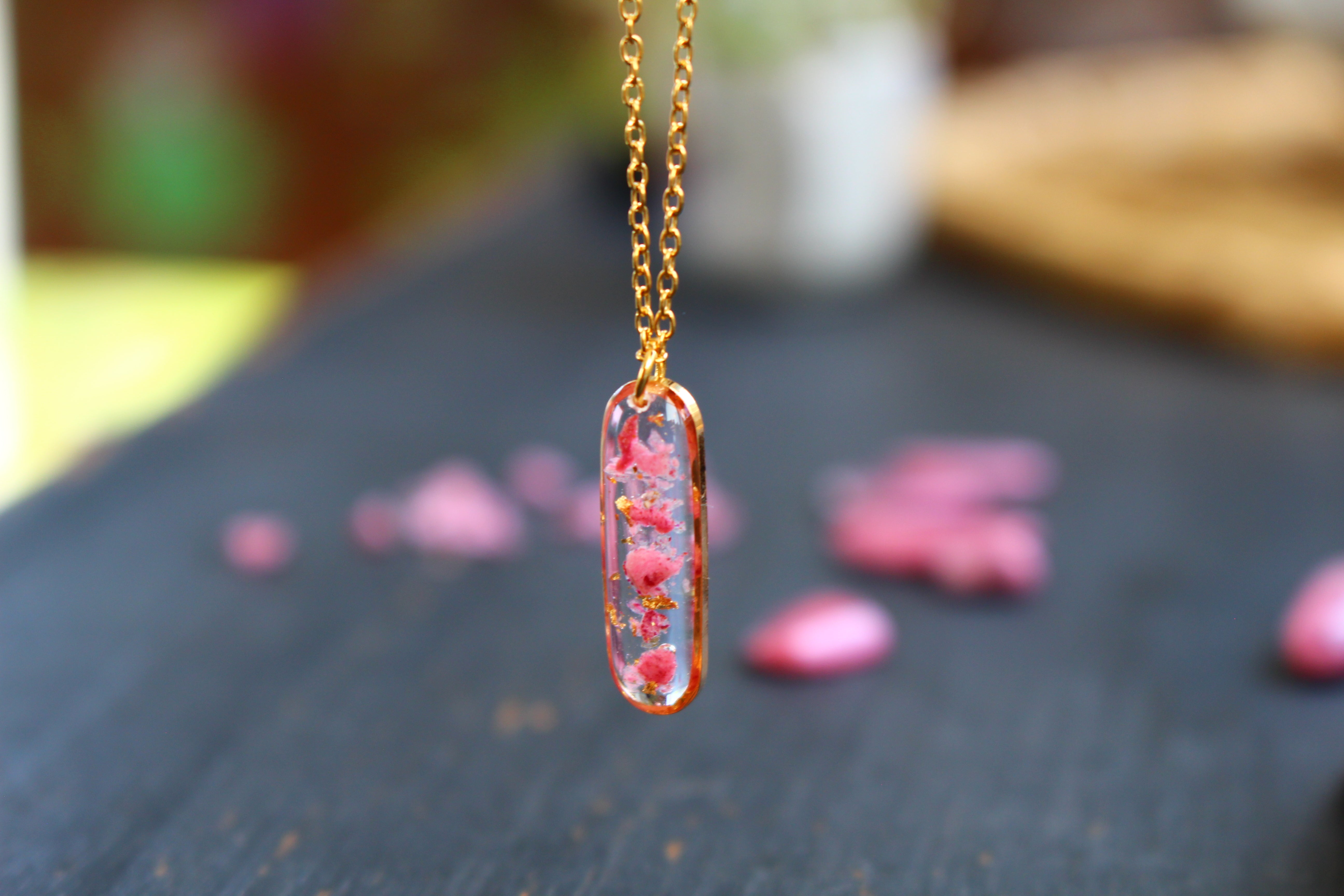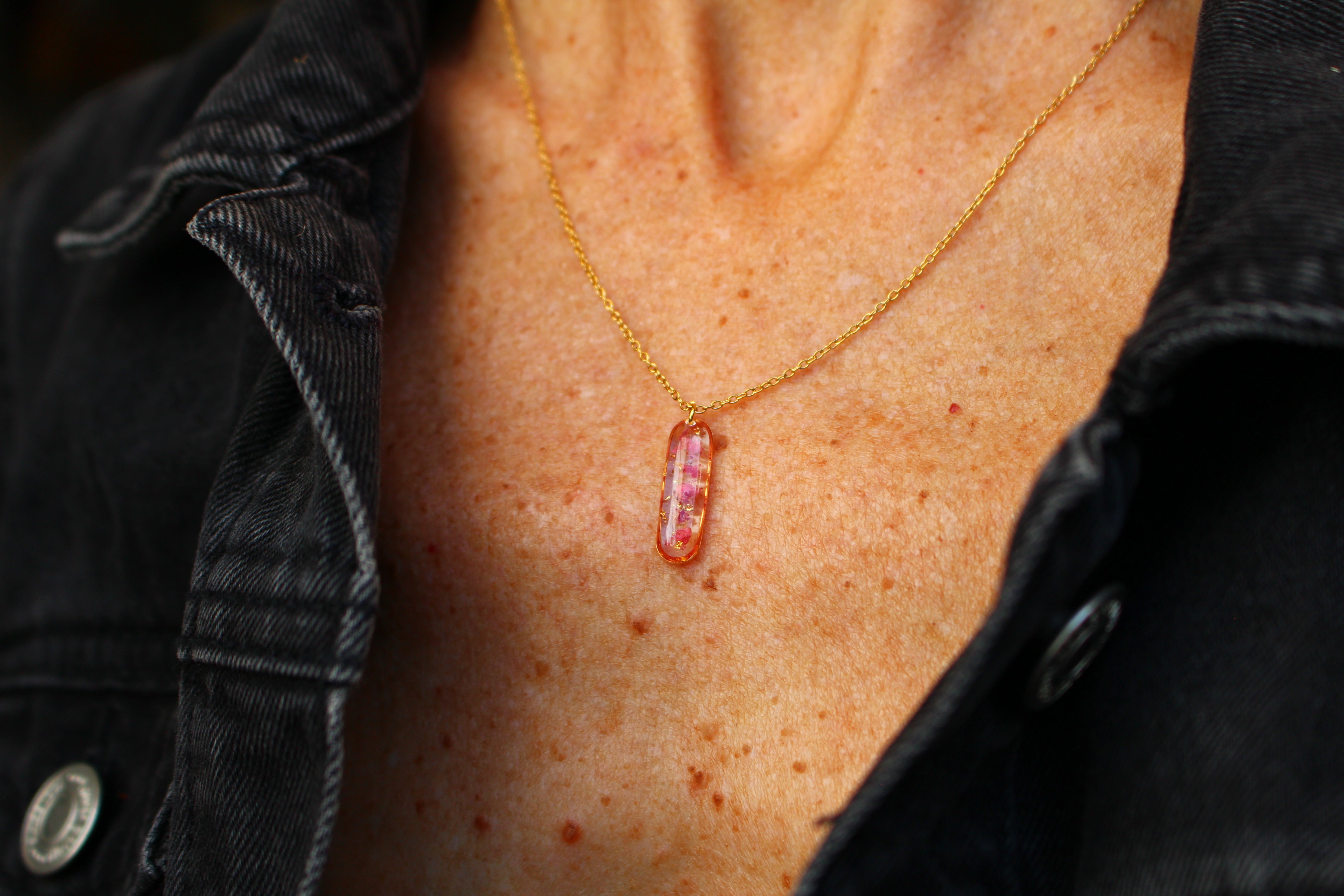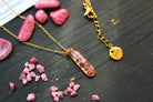 Collier composé d'un médaillon de allongé rempli de résine dans laquelle j'ai incrusté de pierres de Thulite et de la feuille d'or