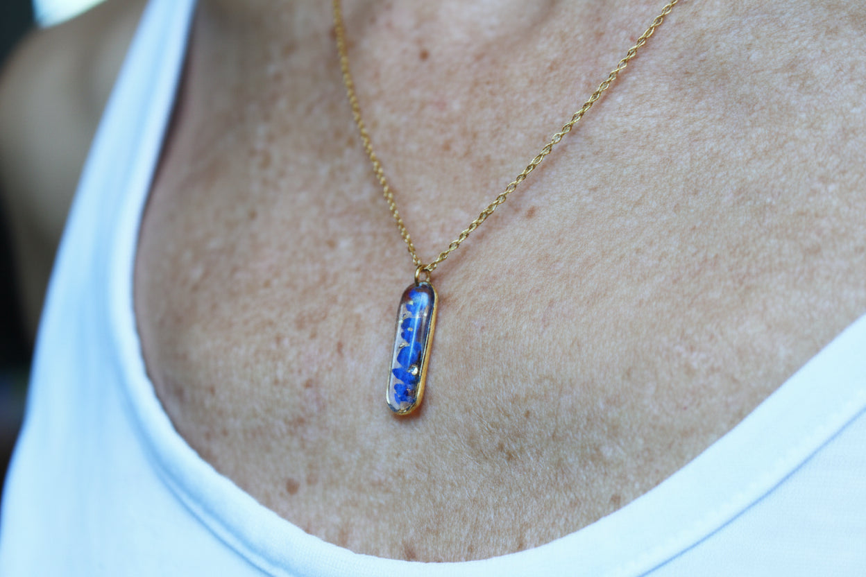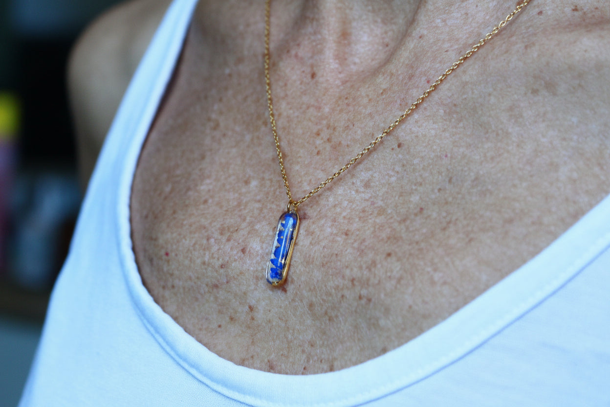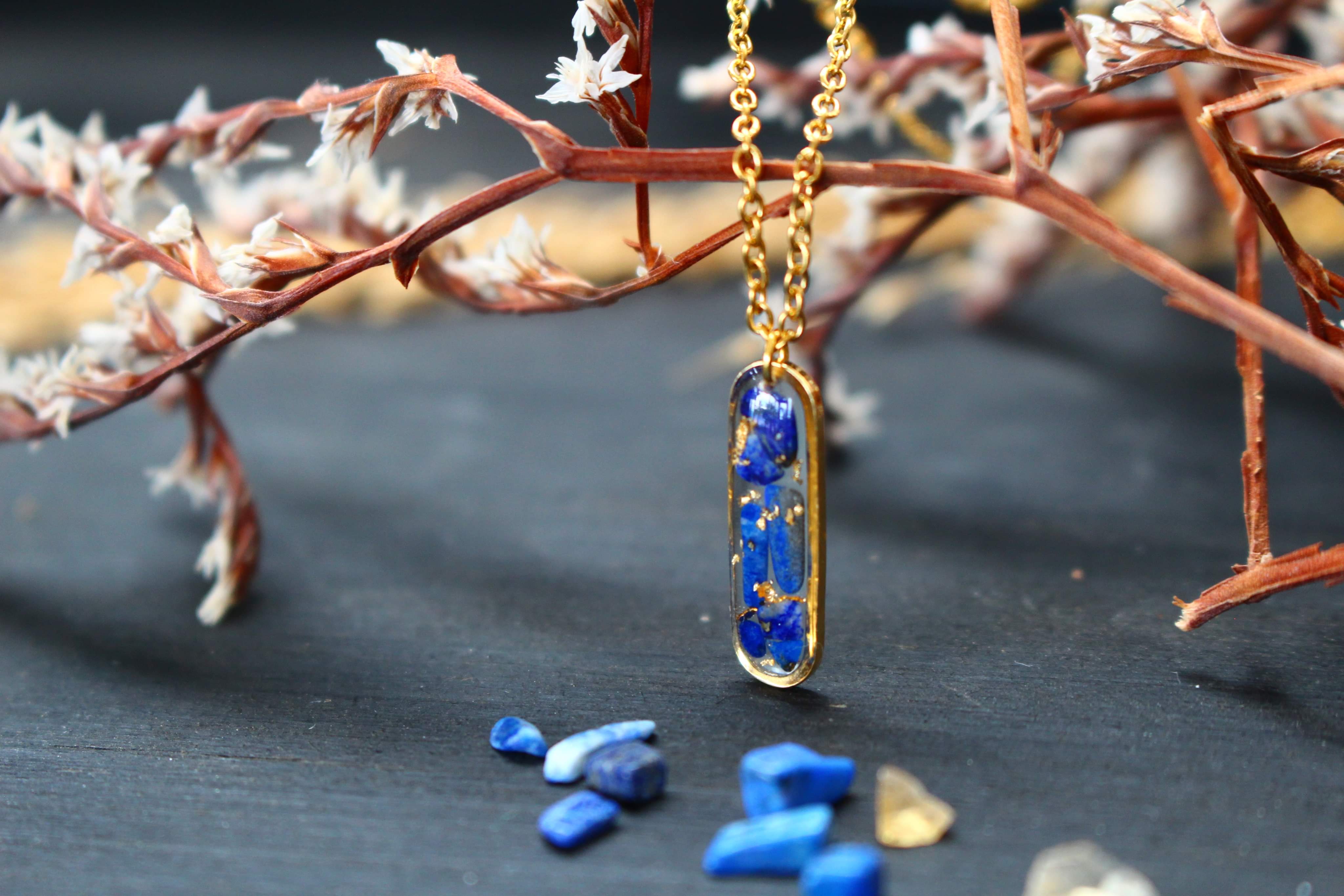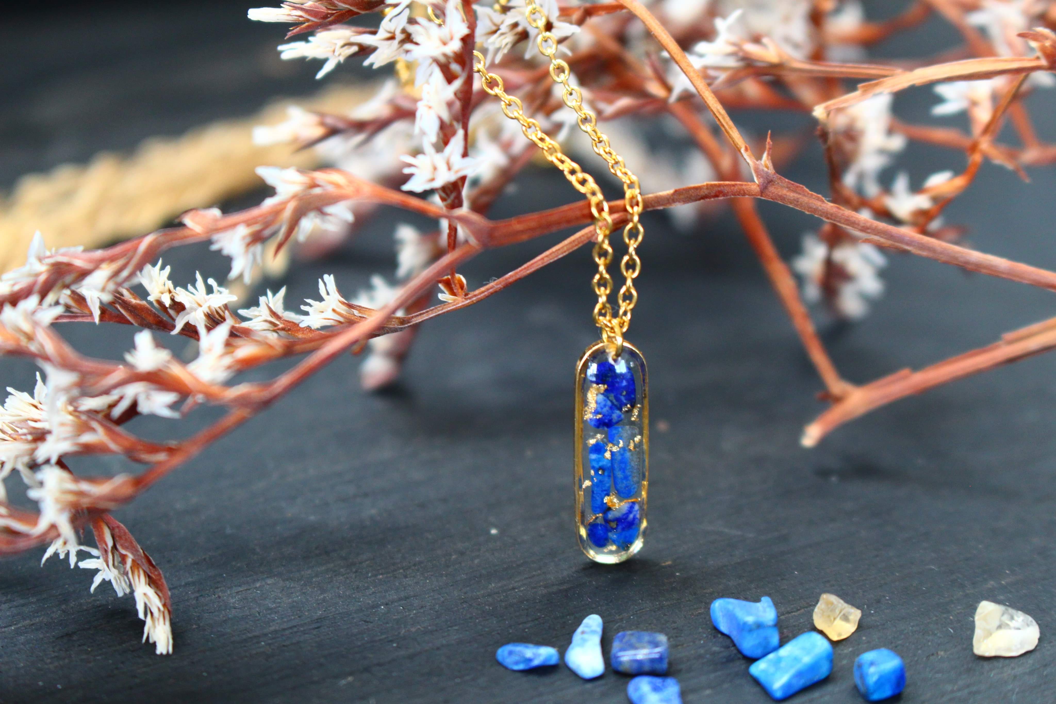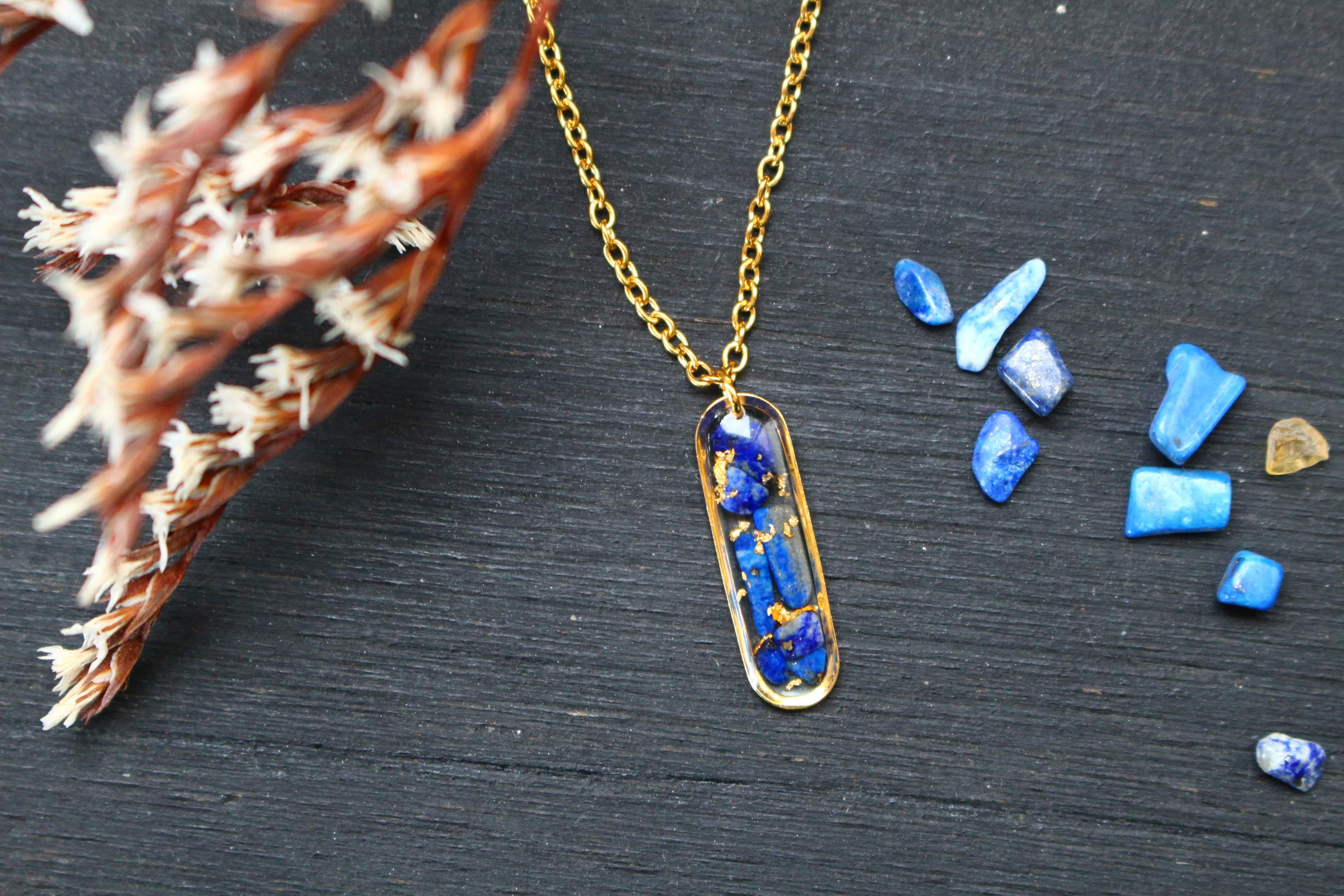 Collier composé d'un petit médaillon allongé en acier inoxydable rempli de résine dans laquelle j'ai incrusté de pierres de lapis lazuli et de la feuille d'or