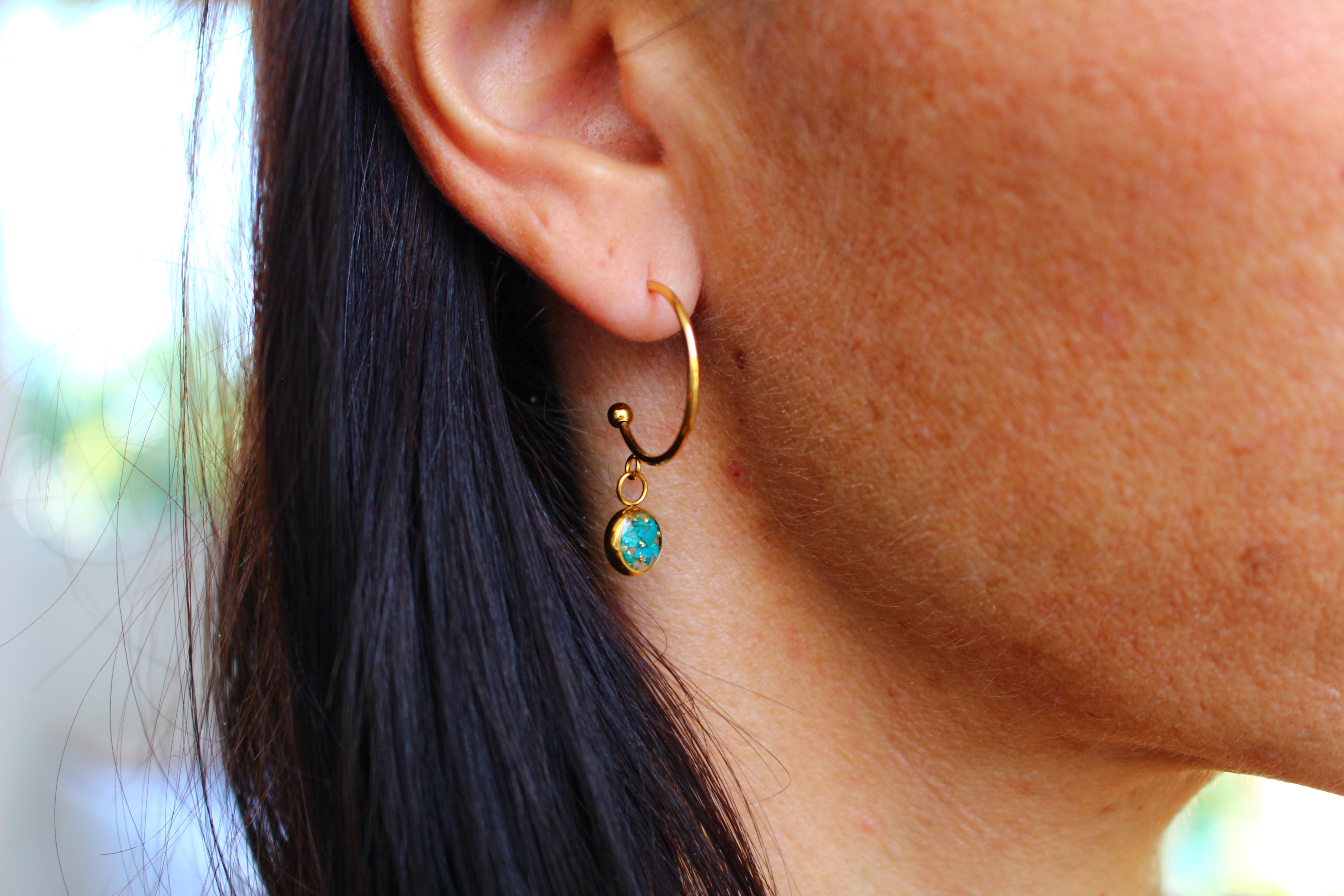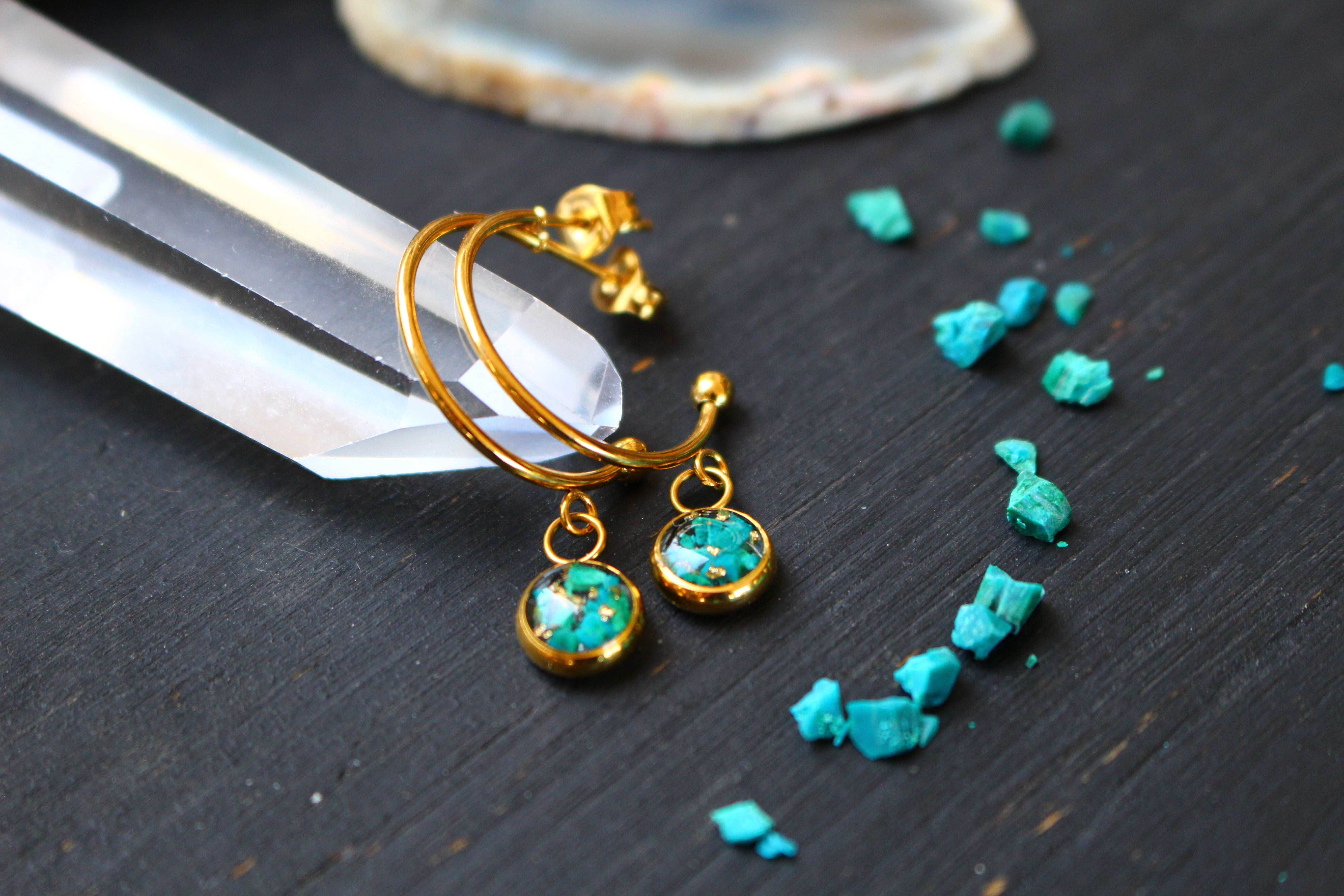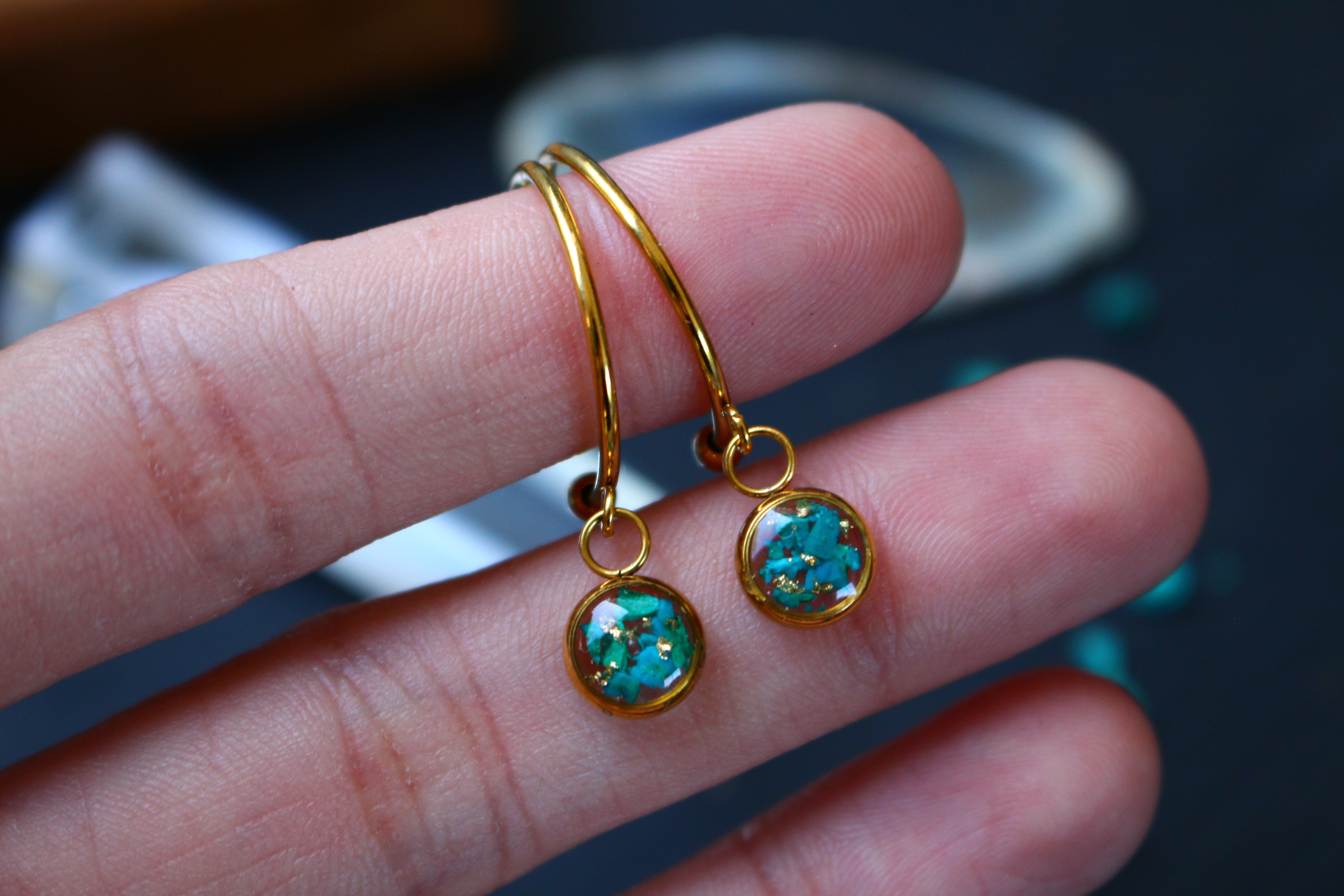 Boucles type créoles composées de médaillons de 6mm de diamètre rempli de résine dans laquelle j'ai incrusté de pierres de Chrysocolle et de la feuille d'or