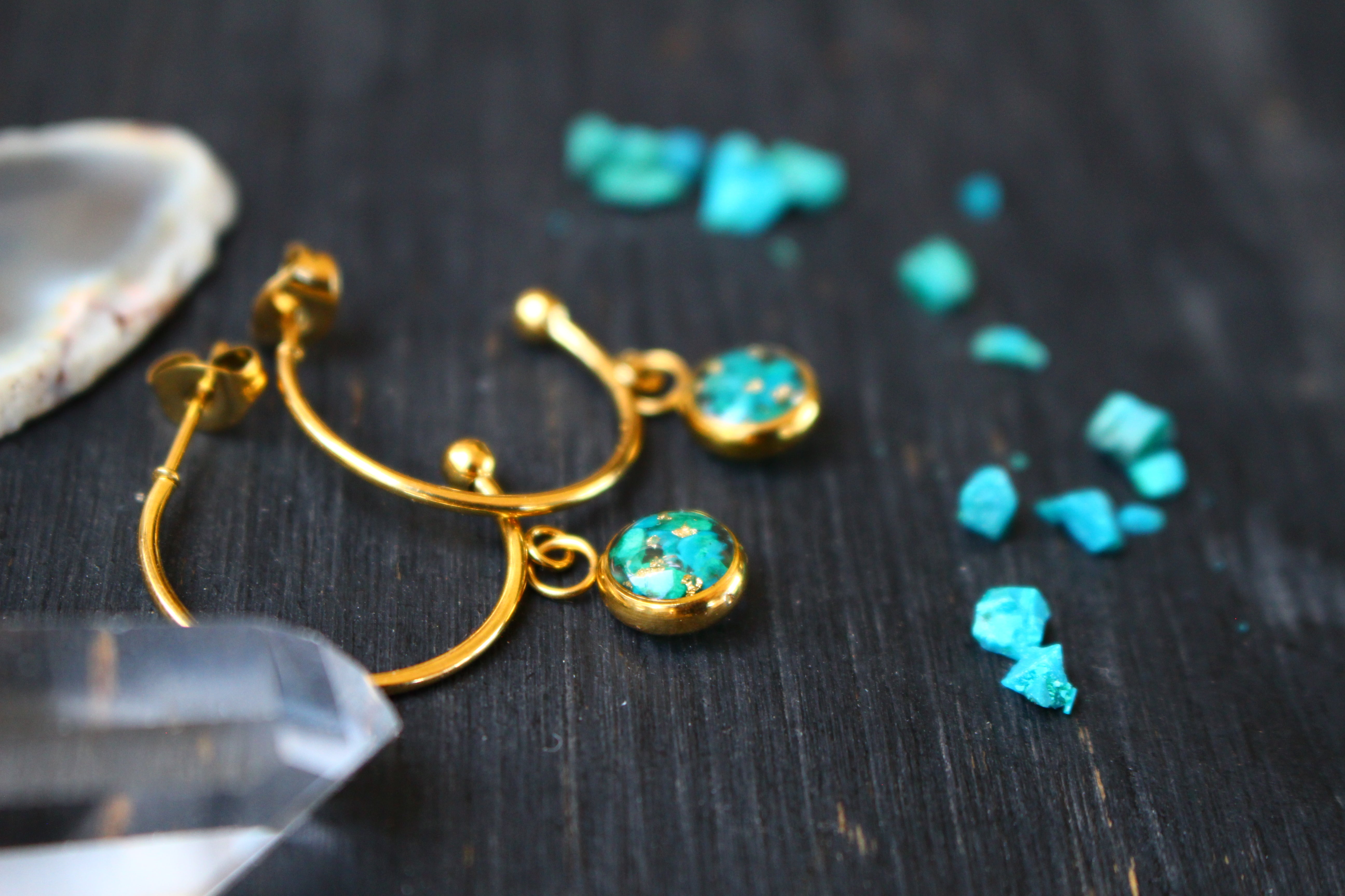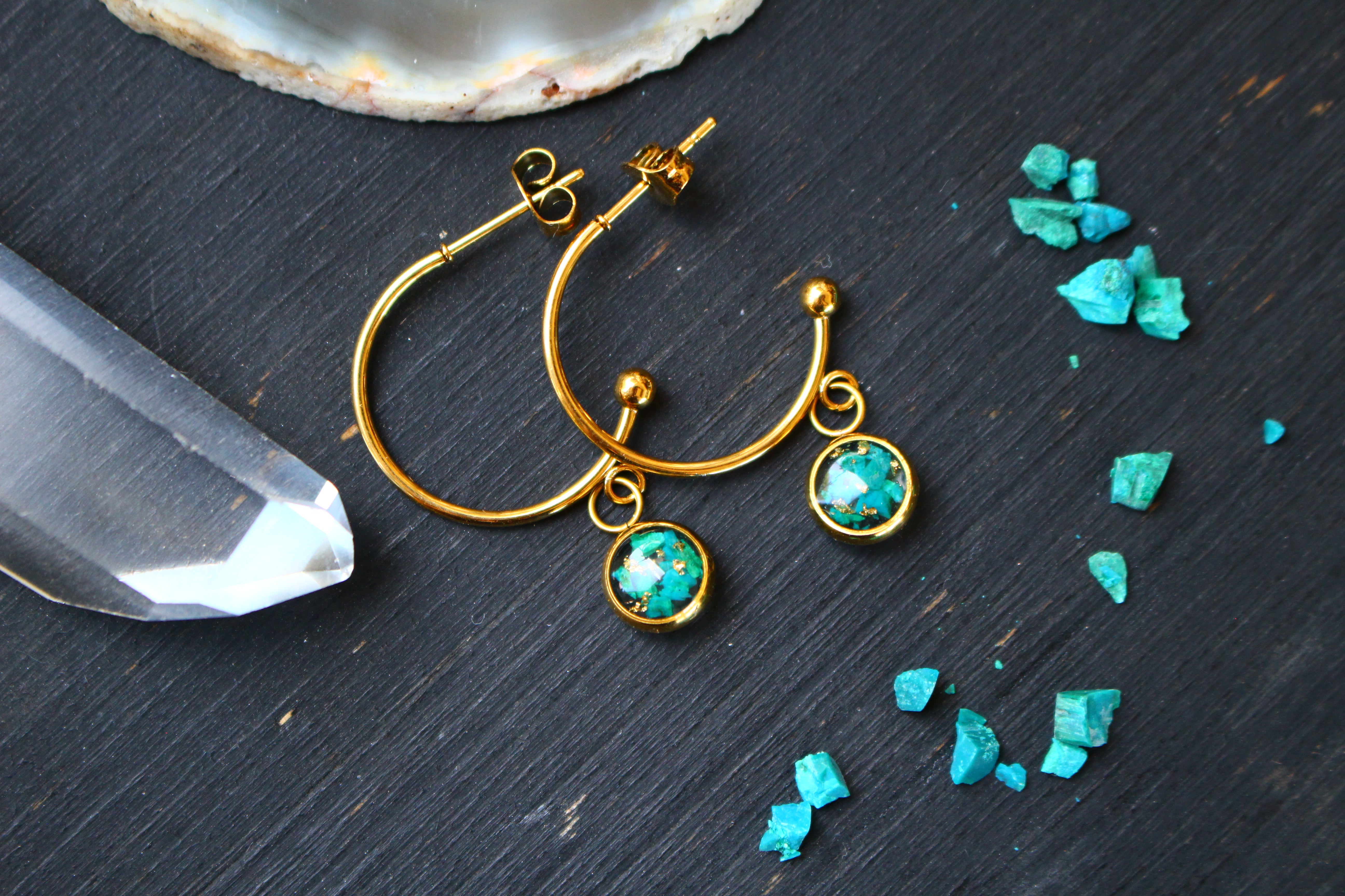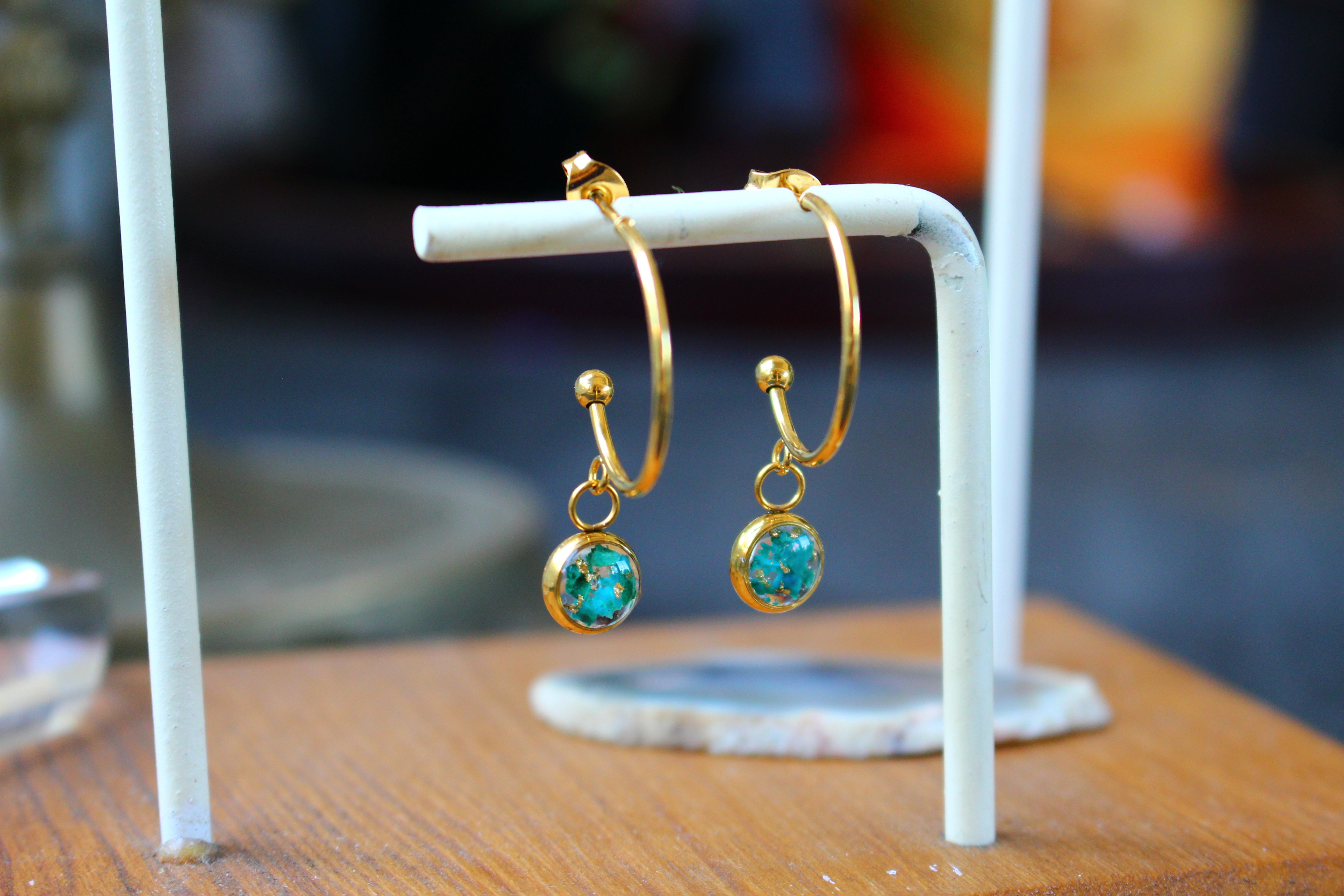 Boucles type créoles composées de médaillons de 6mm de diamètre rempli de résine dans laquelle j'ai incrusté de pierres de Chrysocolle et de la feuille d'or