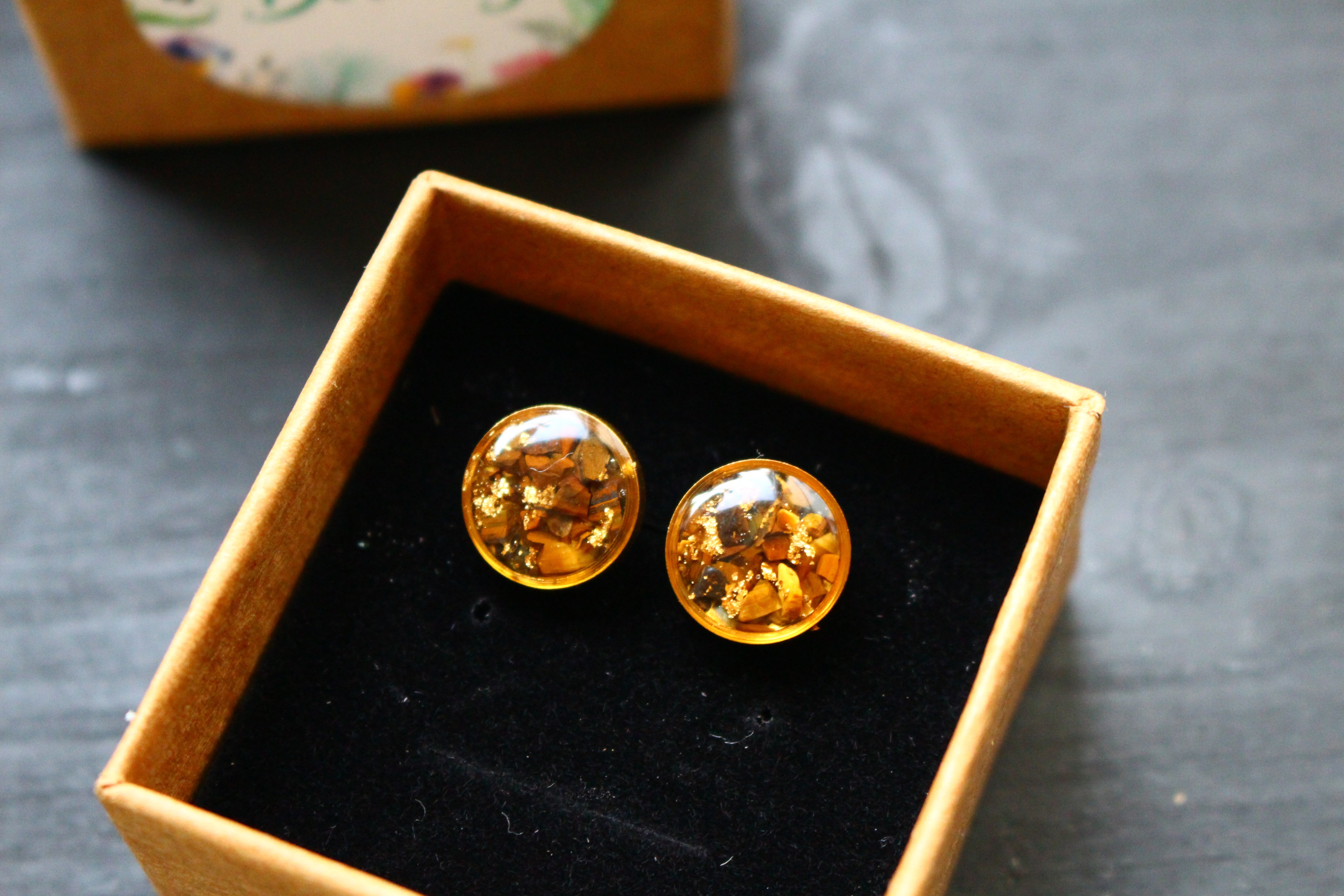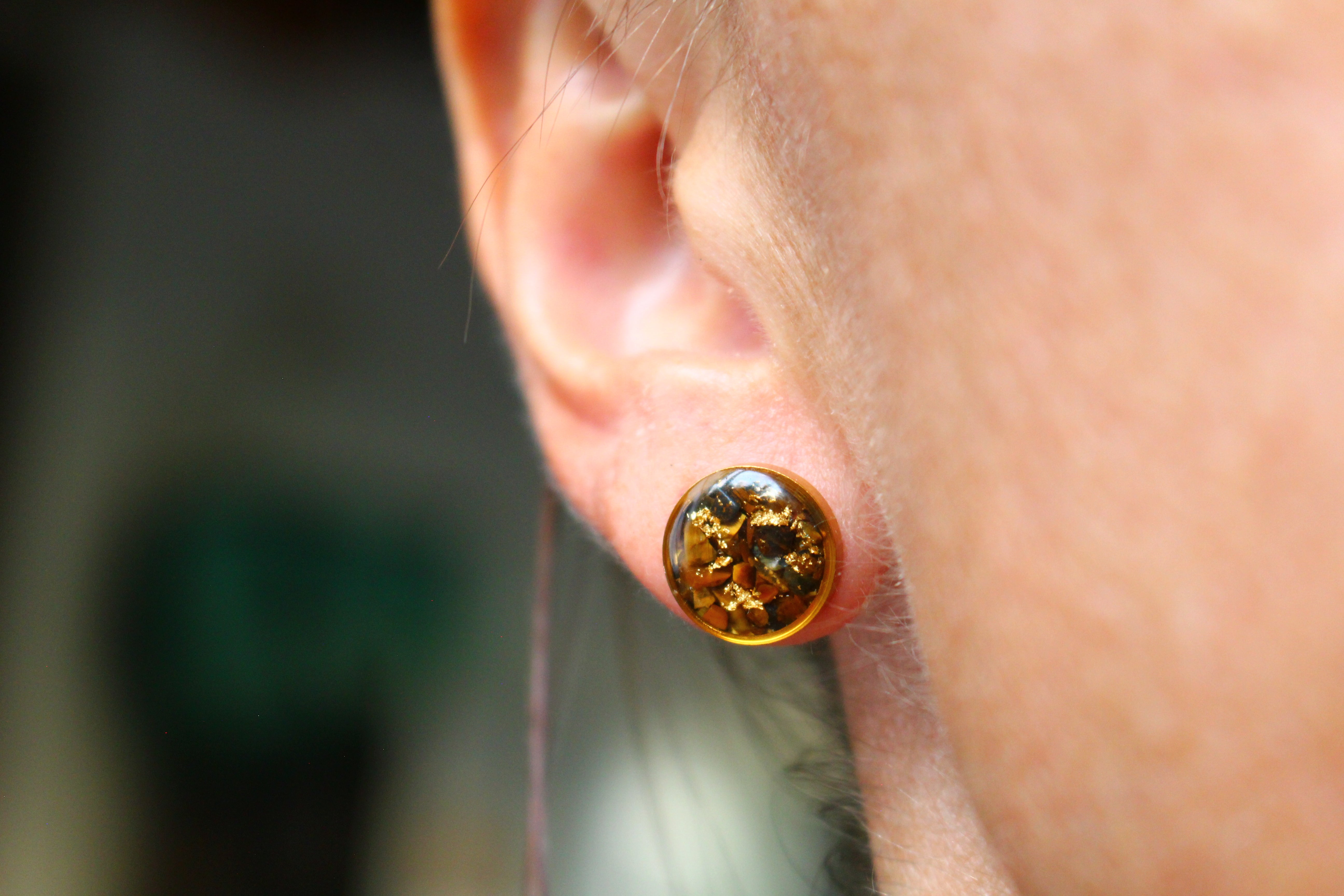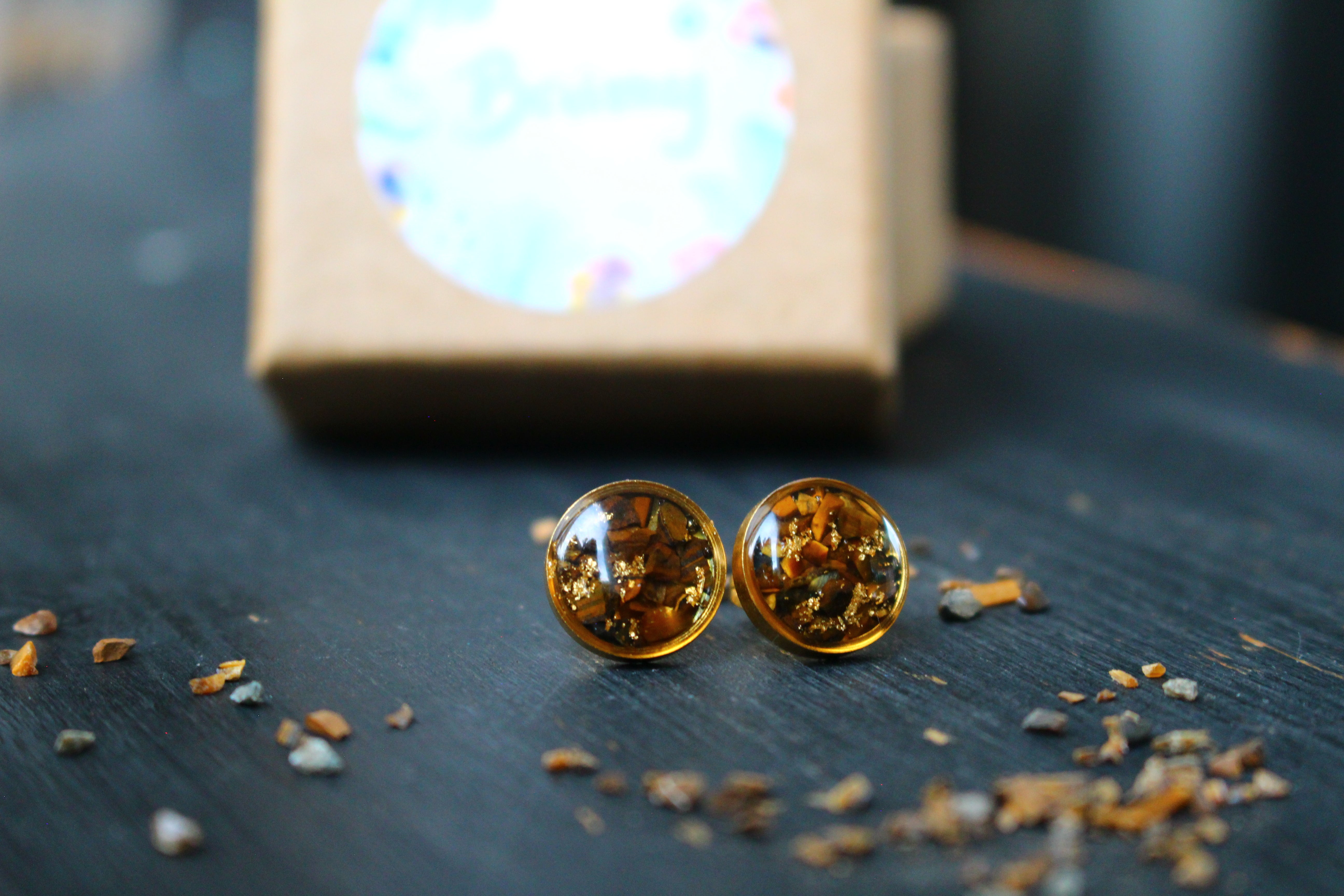 Boucles composées de cabochons de 10mm de diamètre rempli de résine dans laquelle j'ai incrusté de pierres d'oeil de tigre et de la feuille d'or