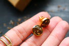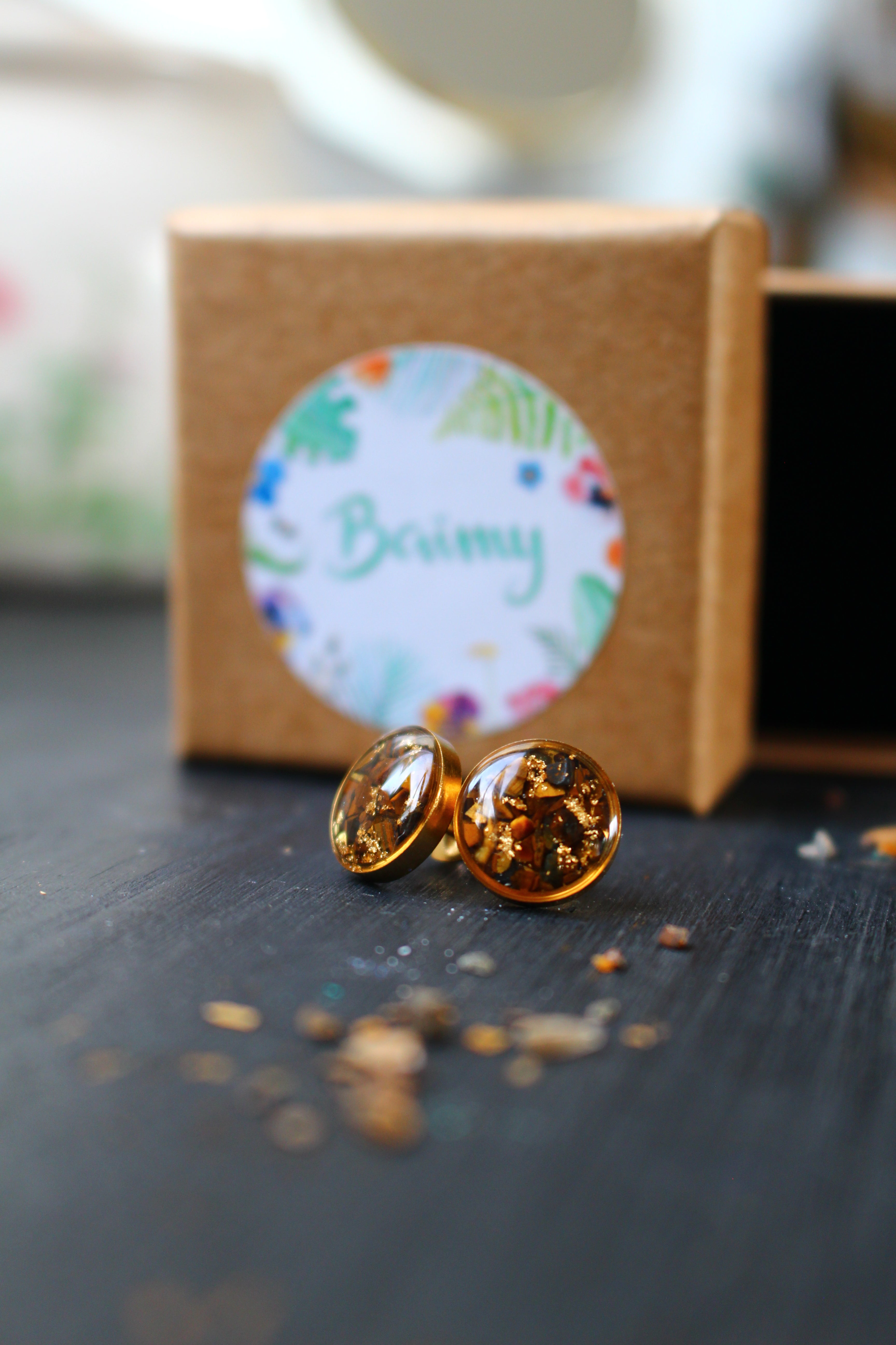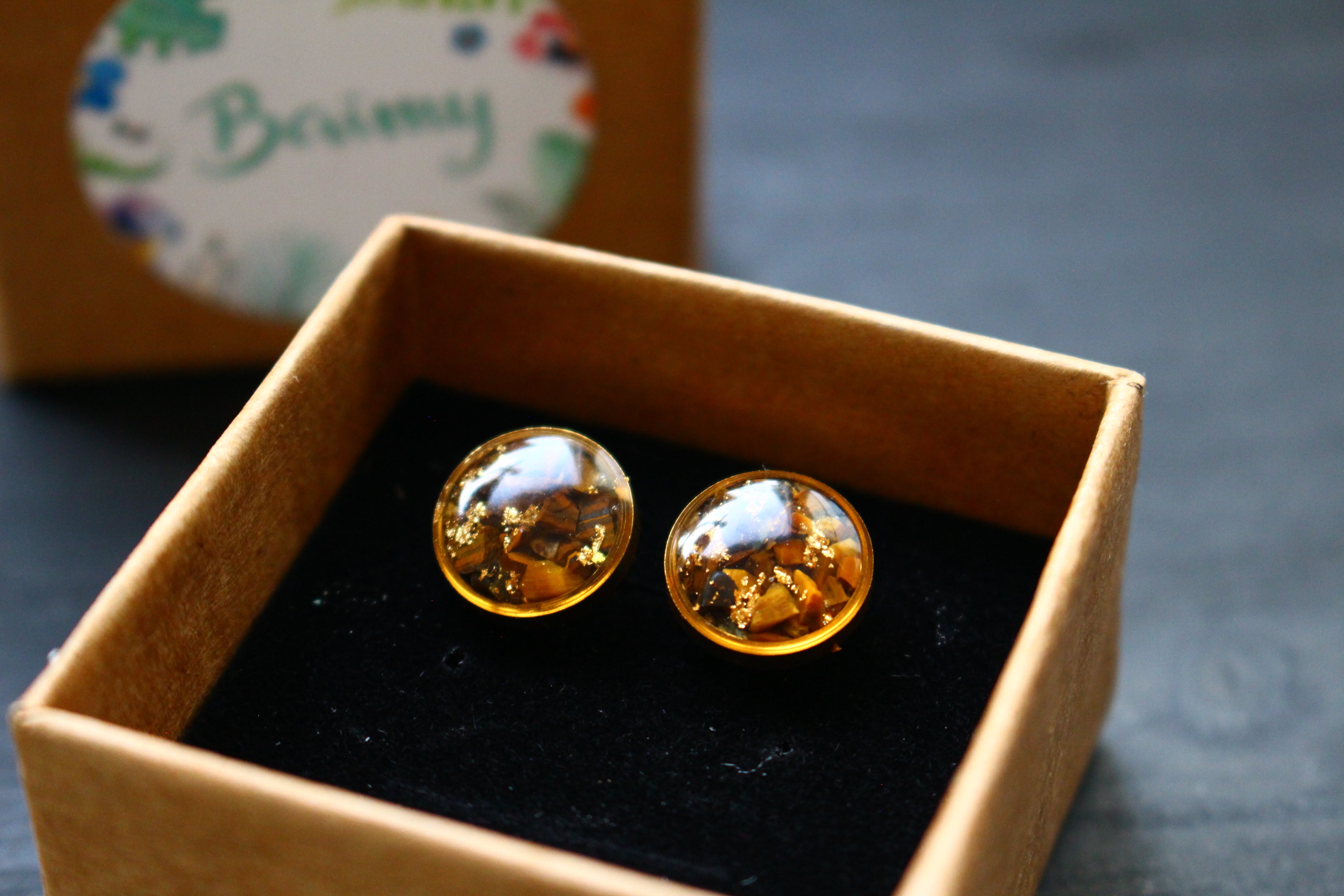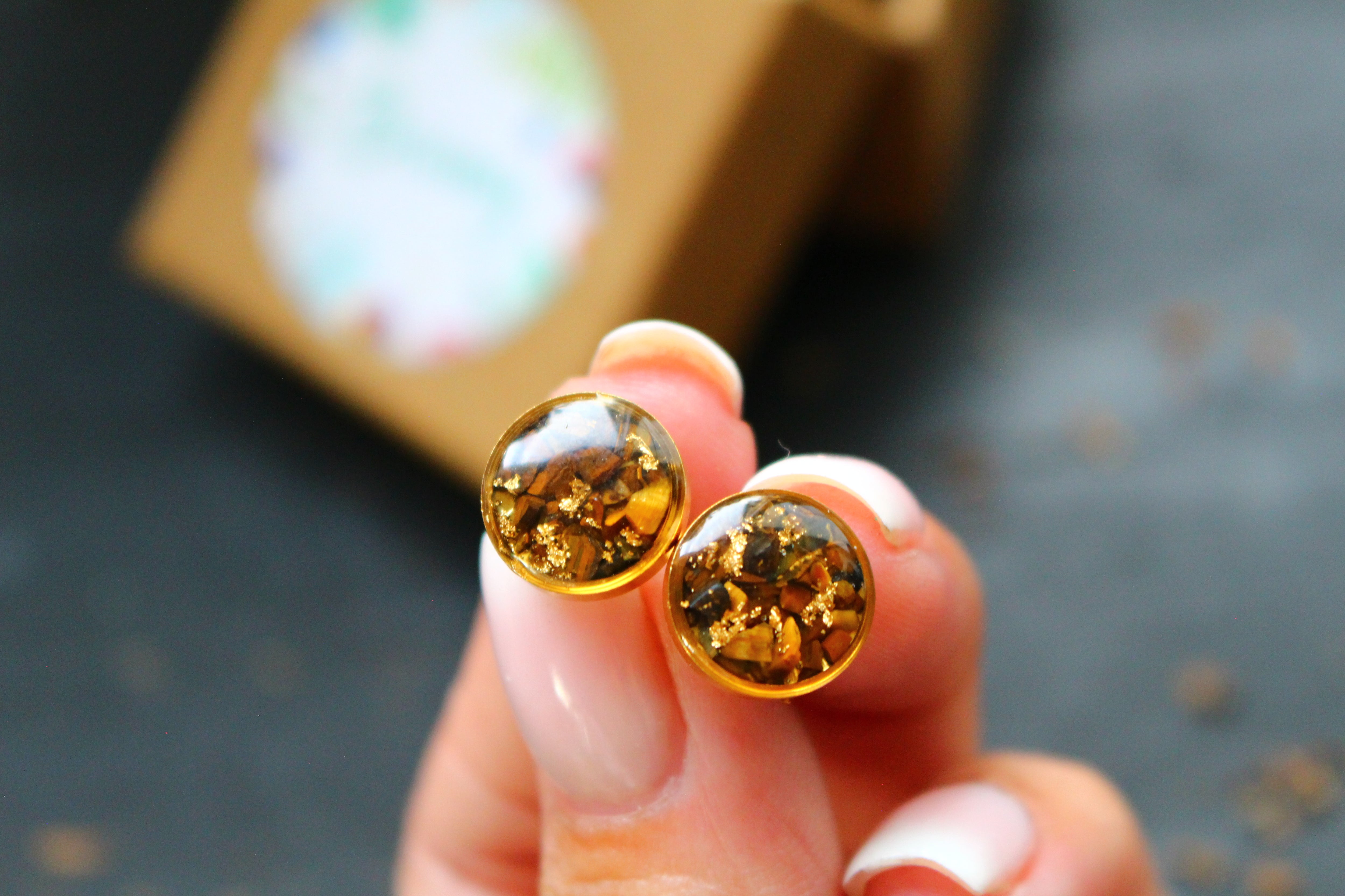 Boucles composées de cabochons de 10mm de diamètre rempli de résine dans laquelle j'ai incrusté de pierres d'oeil de tigre et de la feuille d'or