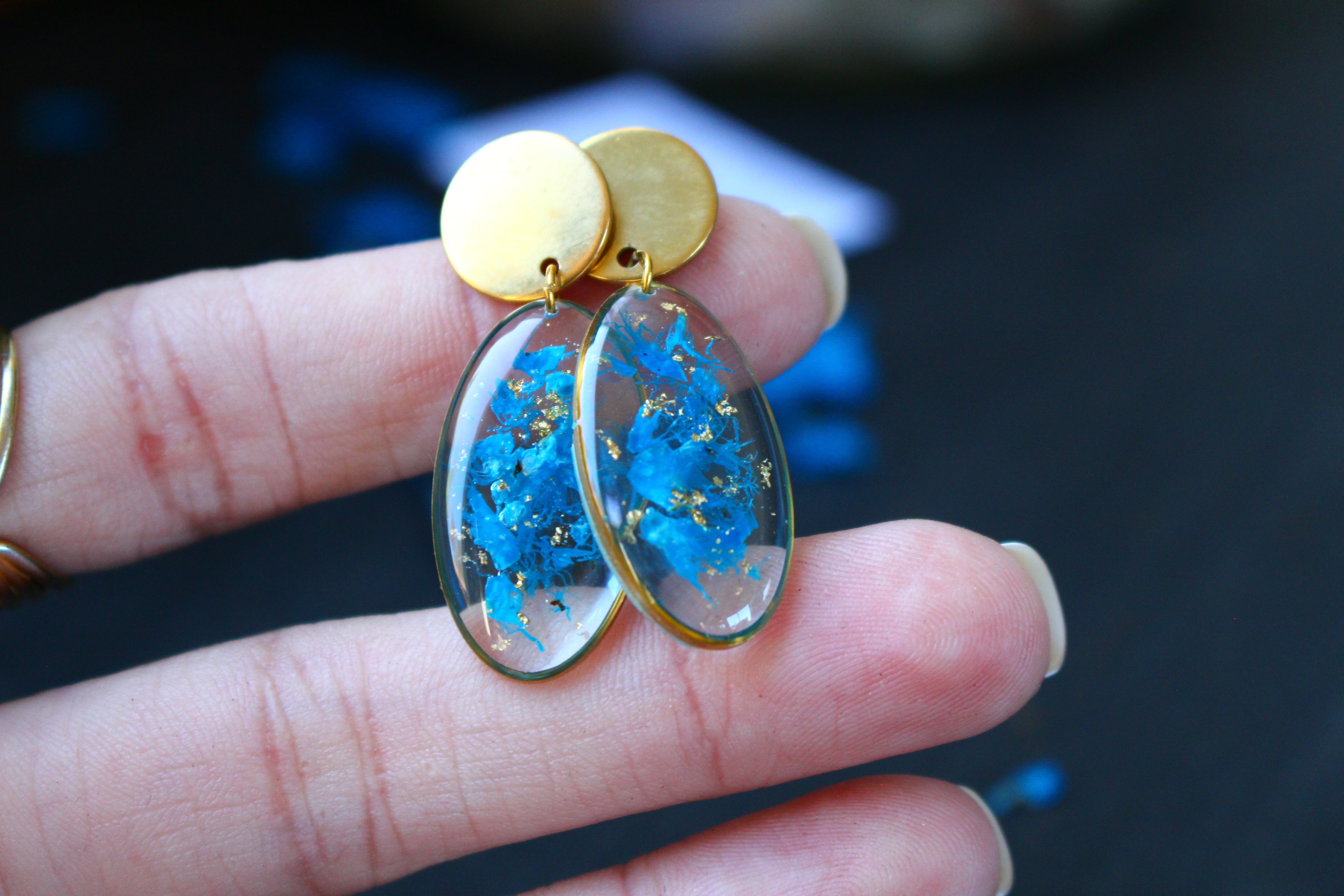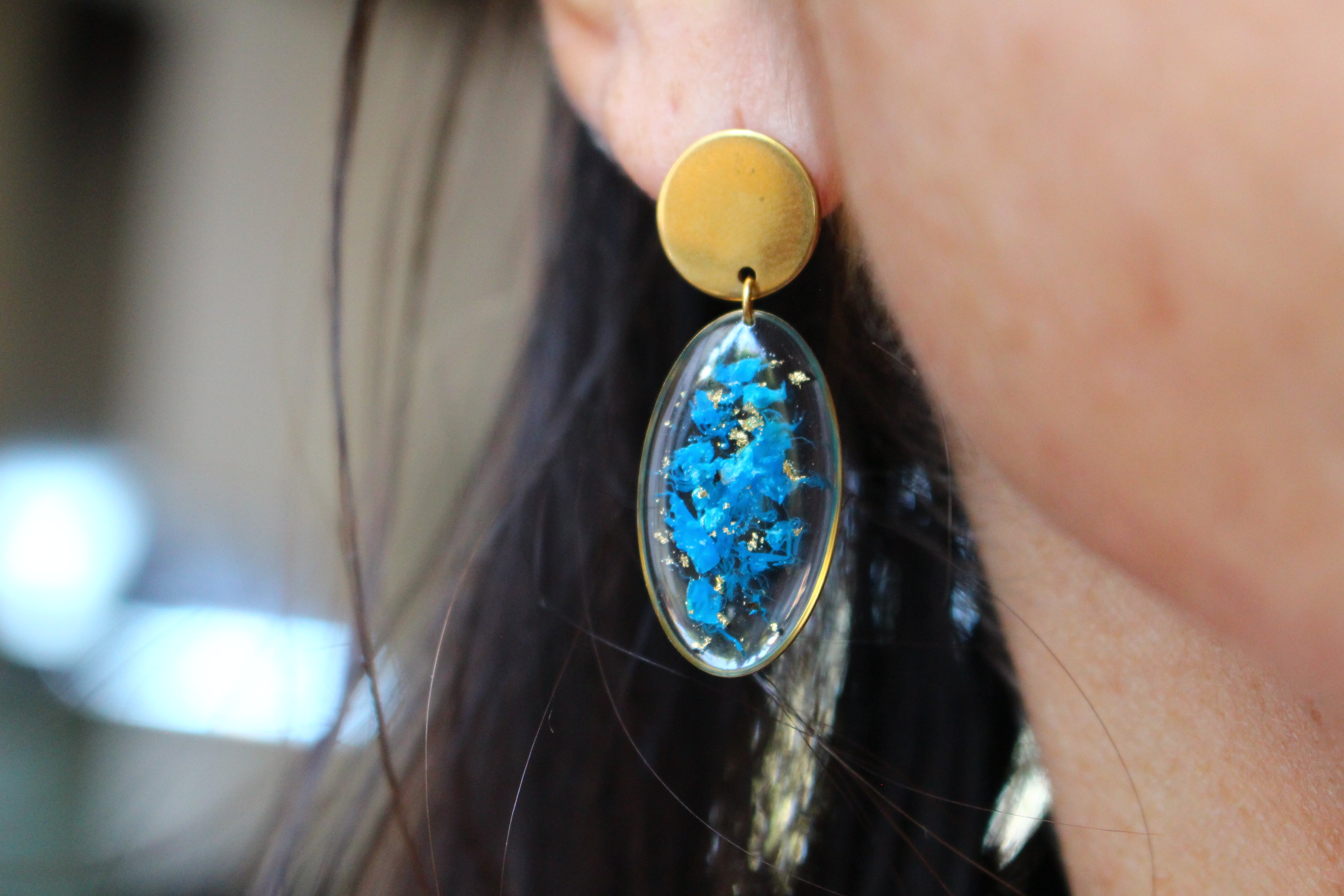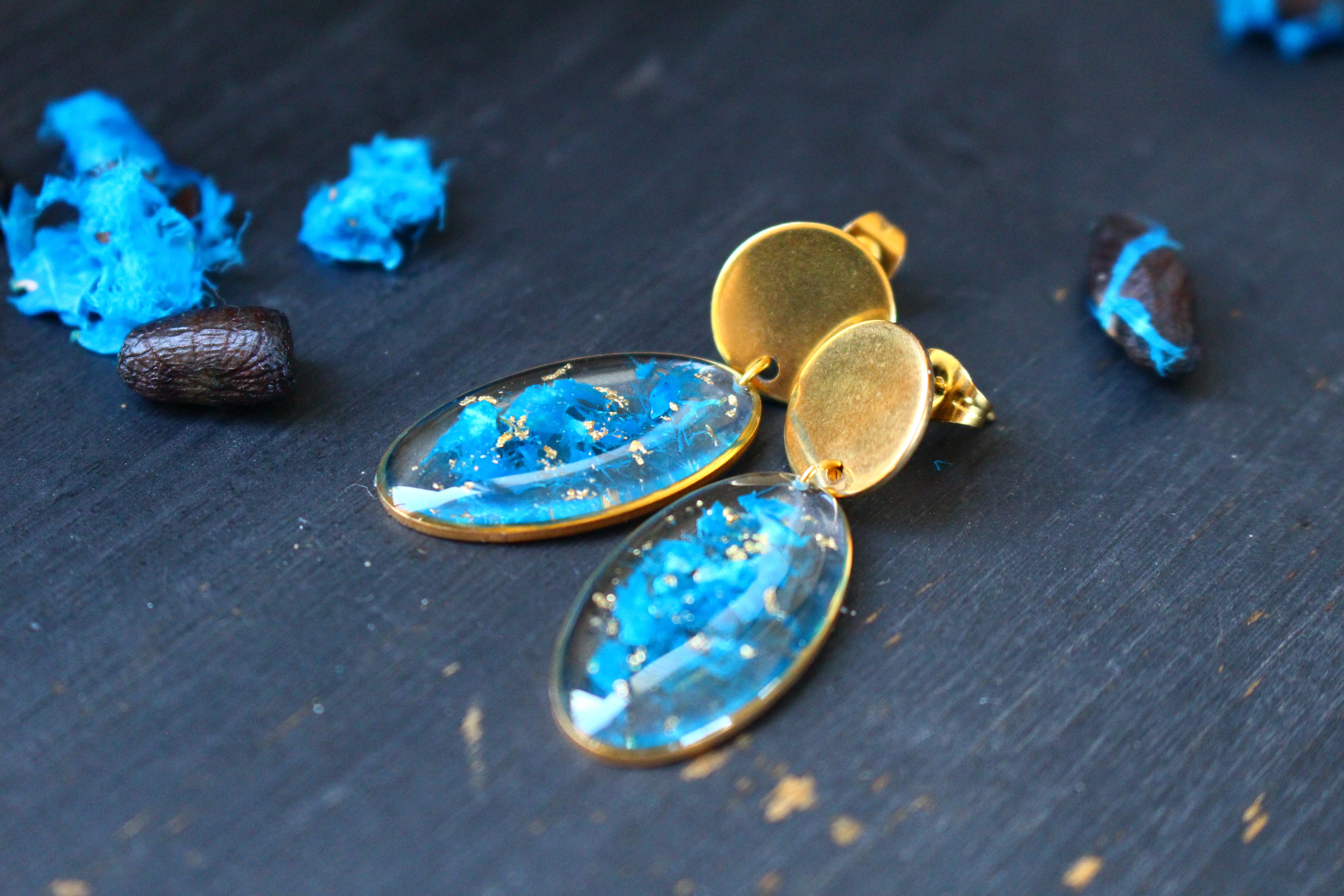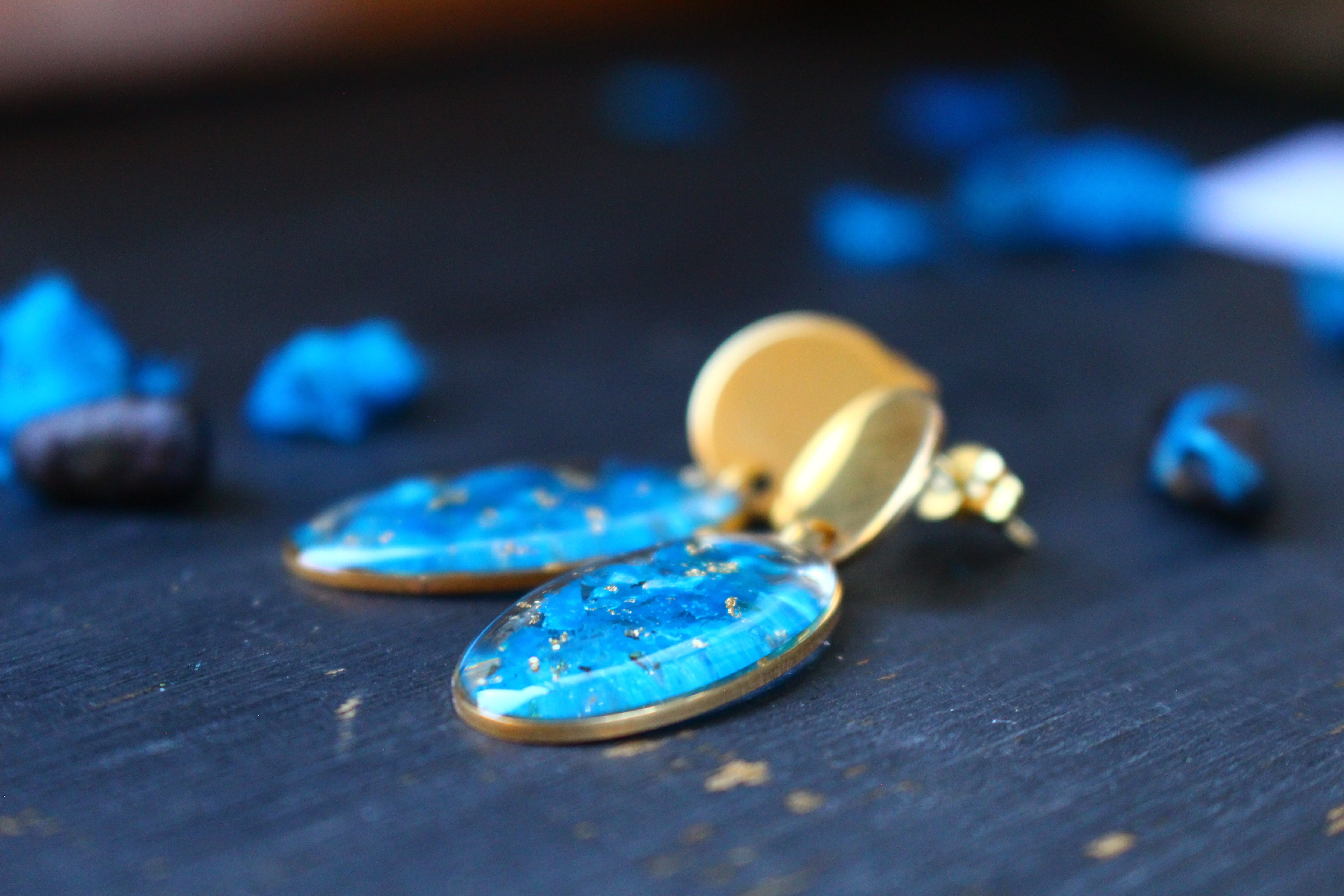 Boucles composées de médaillons ovales remplis de résine dans laquelle j'ai incrusté des morceaux d' "arille" (la pellicule bleue qui entoure les graines de ravenale pour attirer la faune) et de la feuille d'or