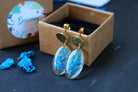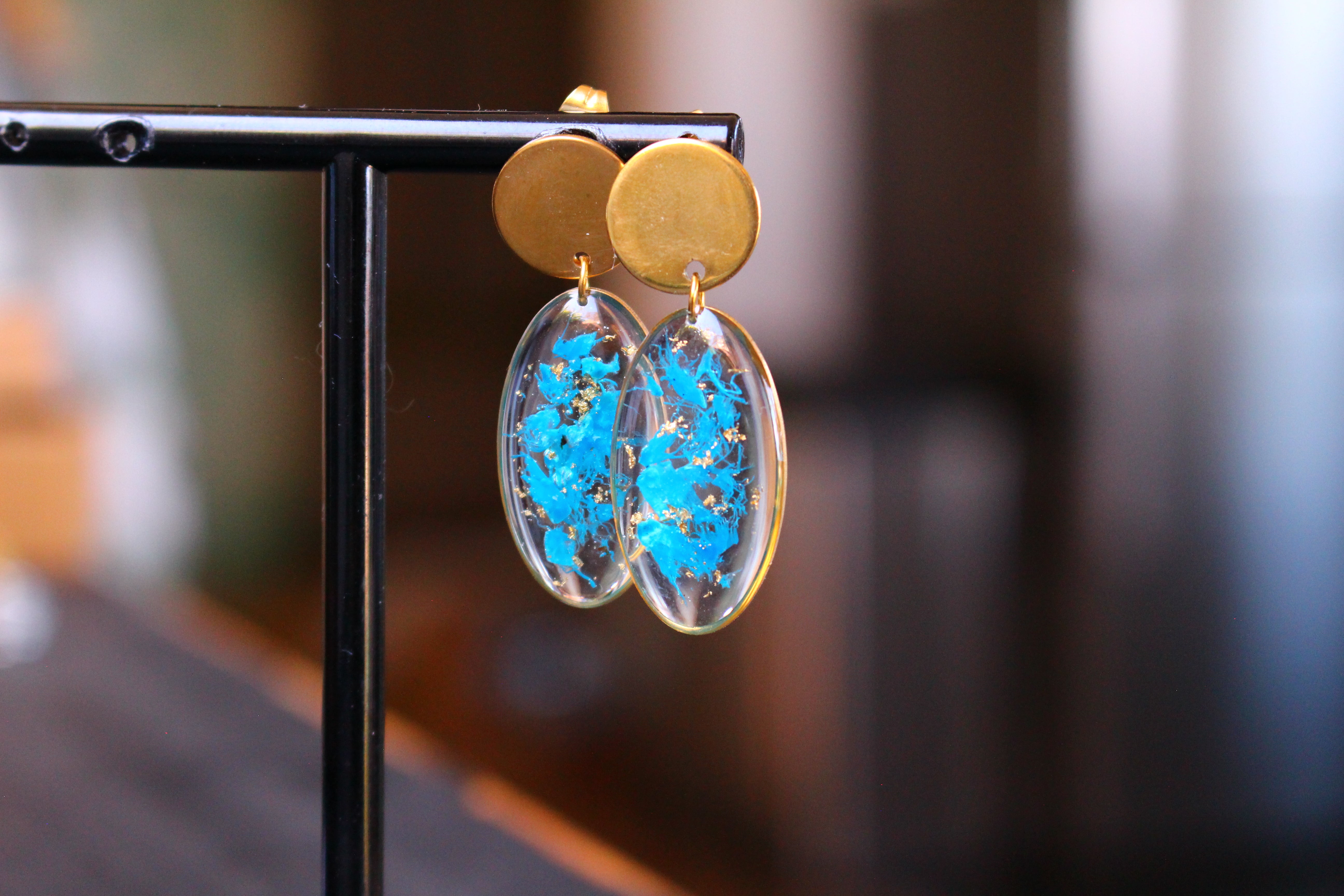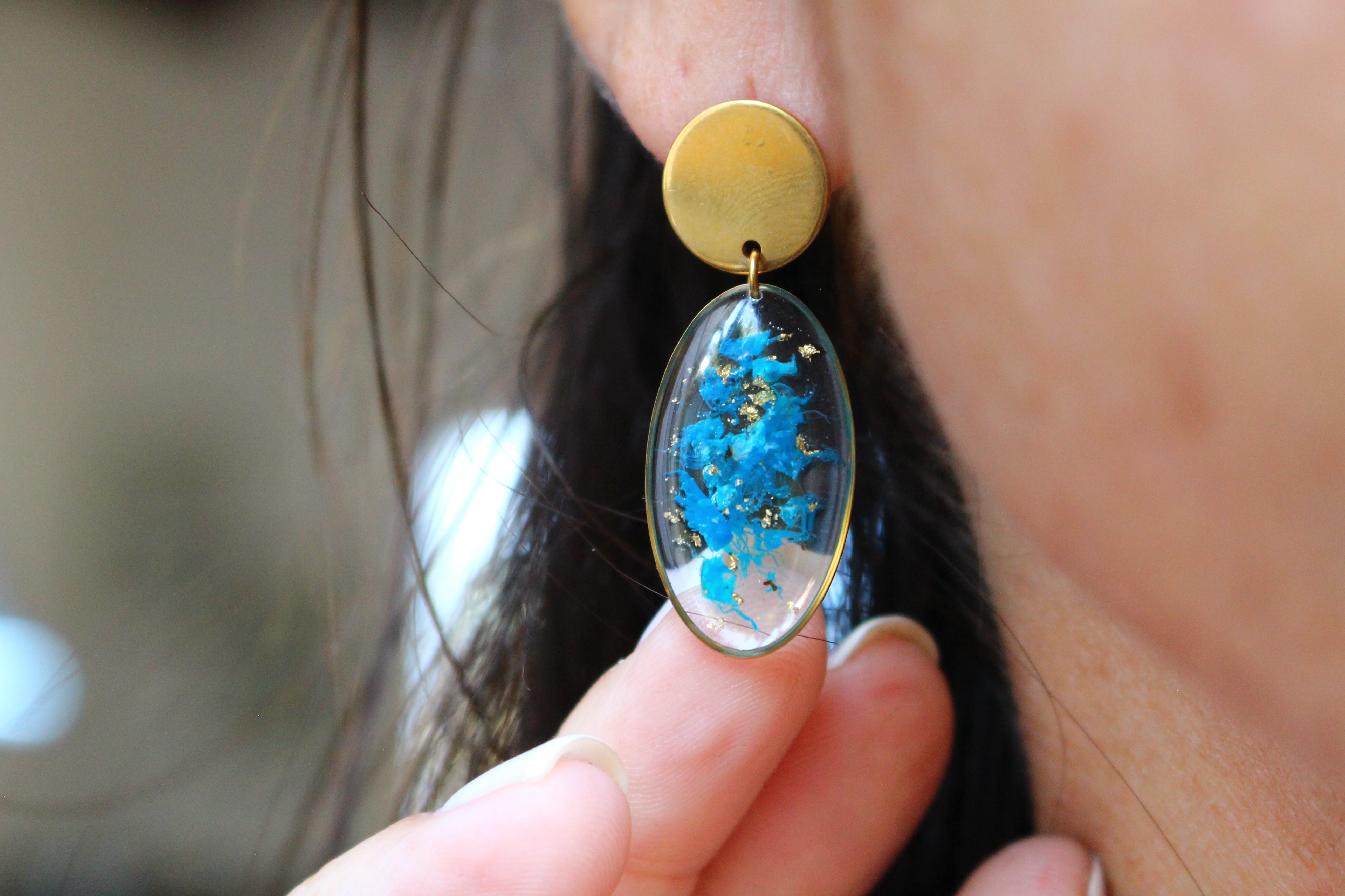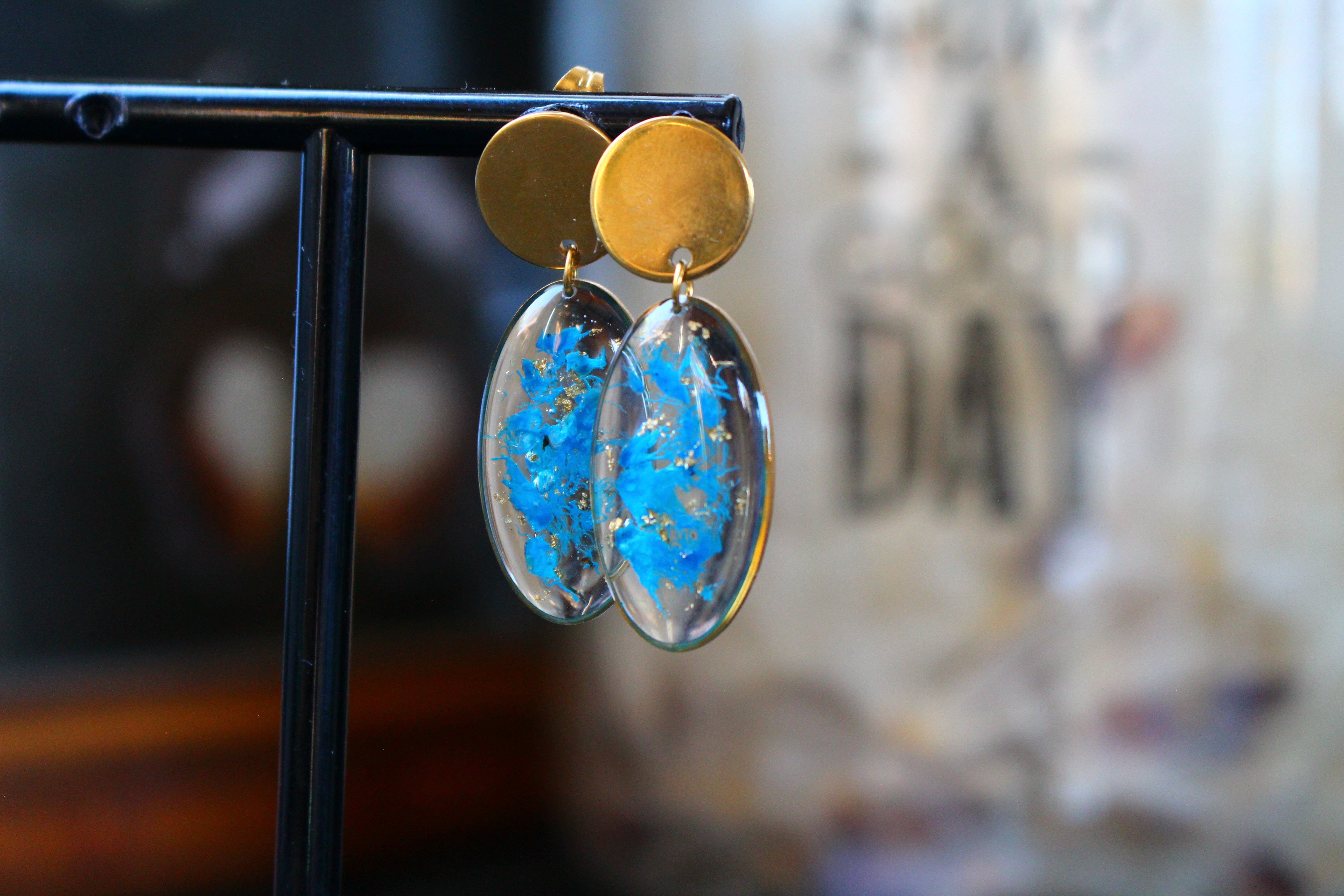 Boucles composées de médaillons ovales remplis de résine dans laquelle j'ai incrusté des morceaux d' "arille" (la pellicule bleue qui entoure les graines de ravenale pour attirer la faune) et de la feuille d'or