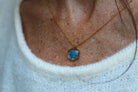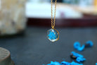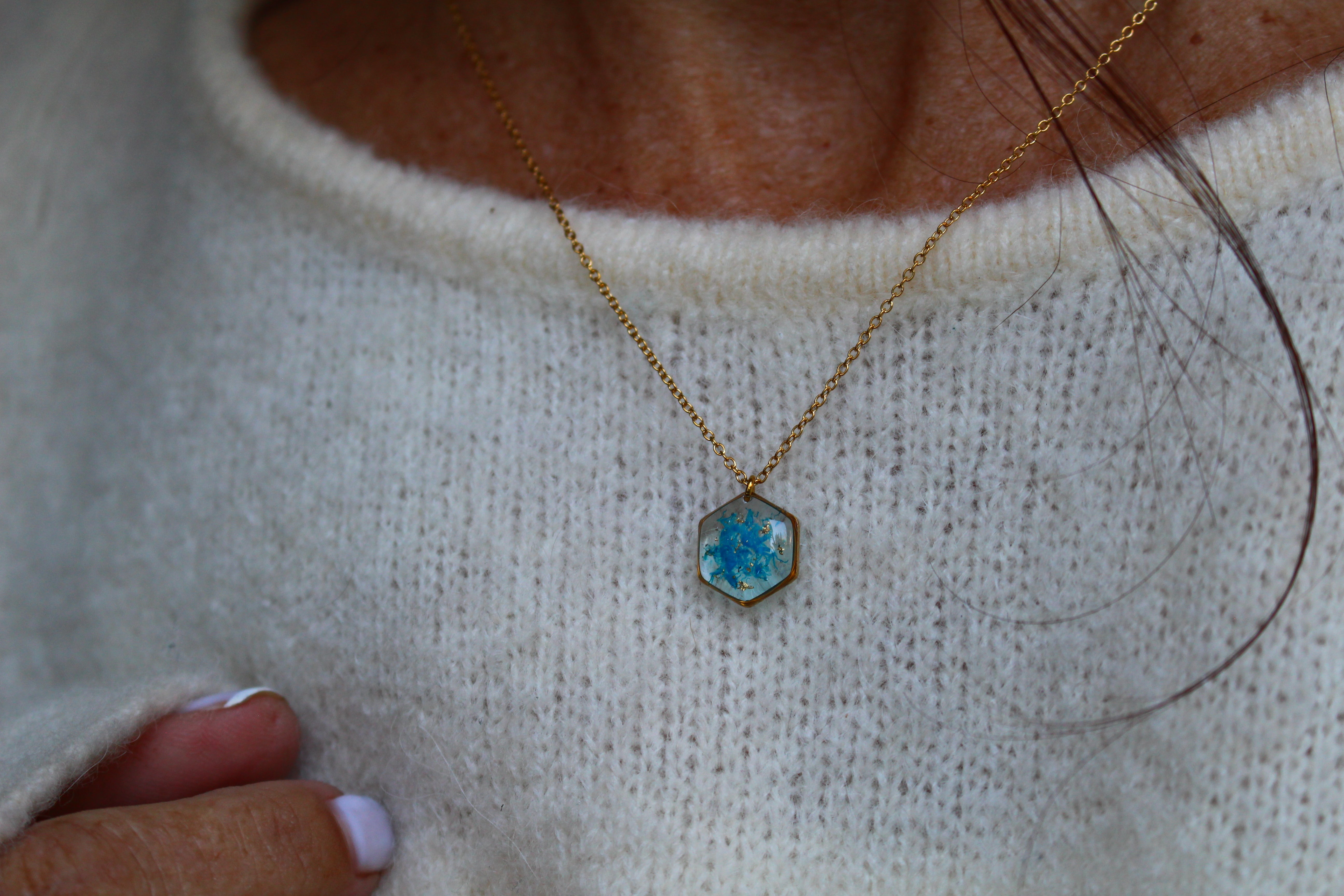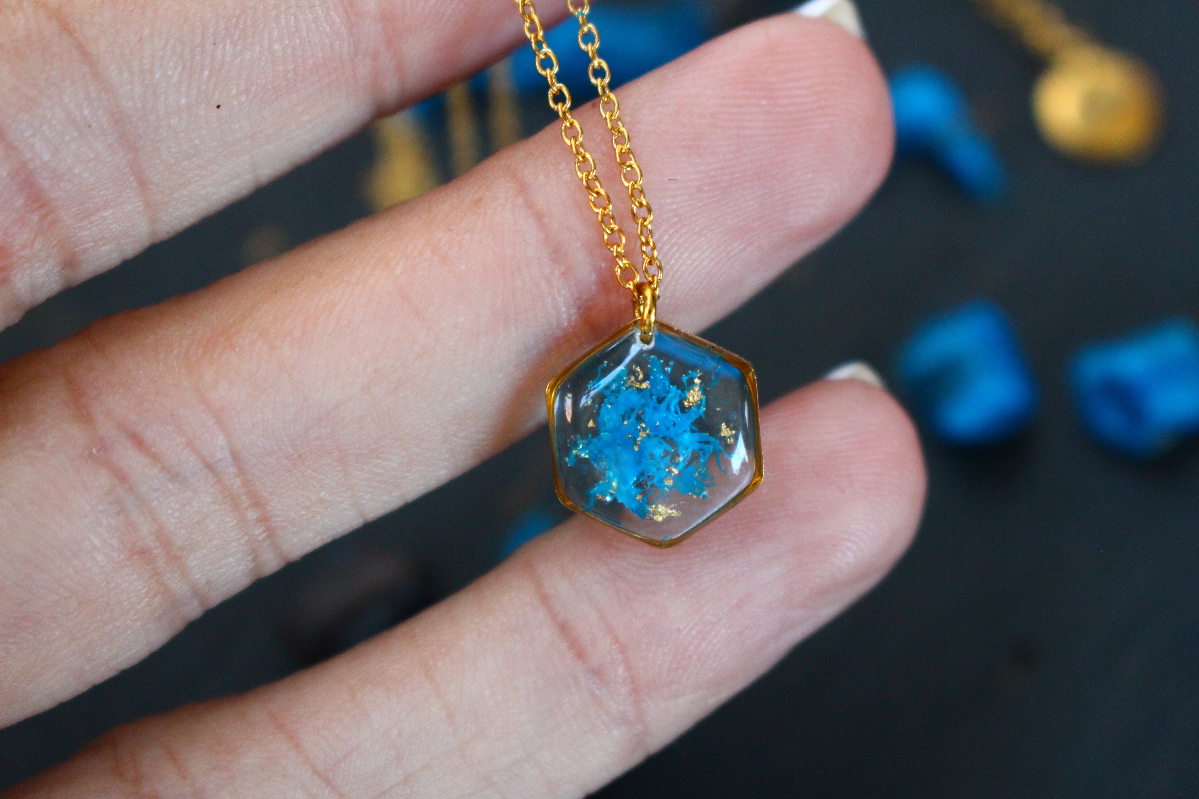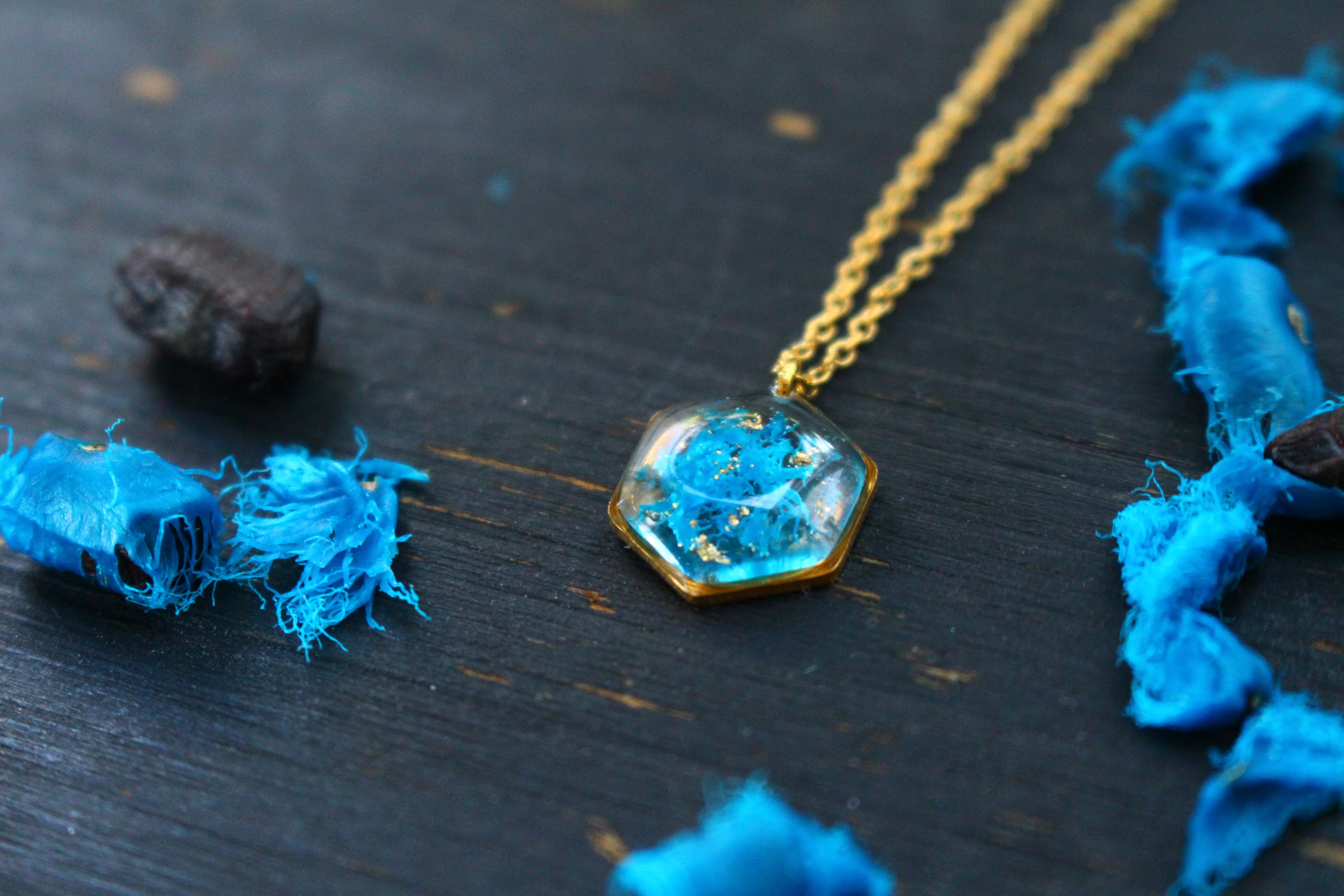Collier composé d'un médaillon hexagonal rempli de résine dans laquelle j'ai incrusté des morceaux d' "arille" (la pellicule bleue qui entoure les graines de ravenale pour attirer la faune) et de la feuille d'or