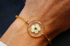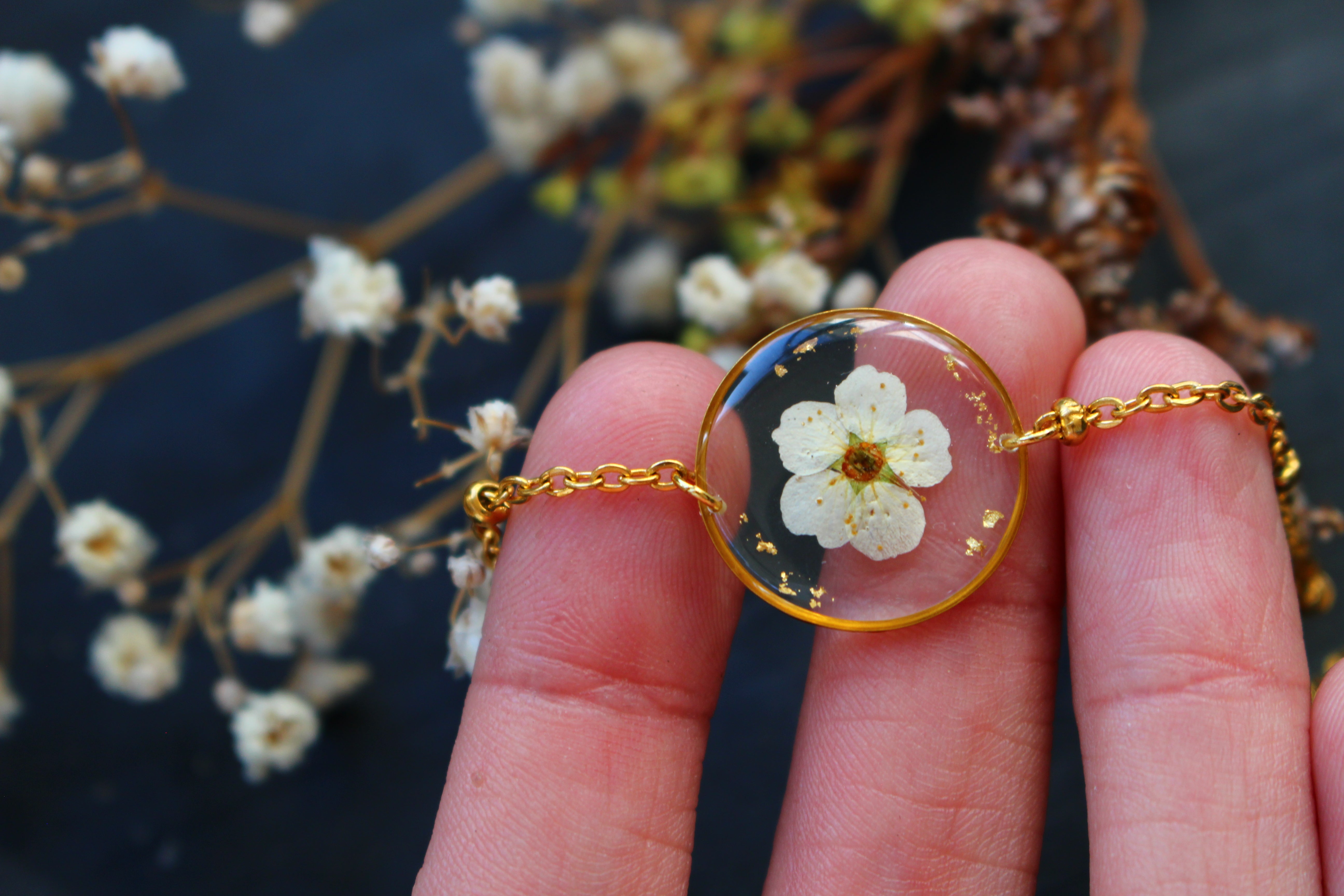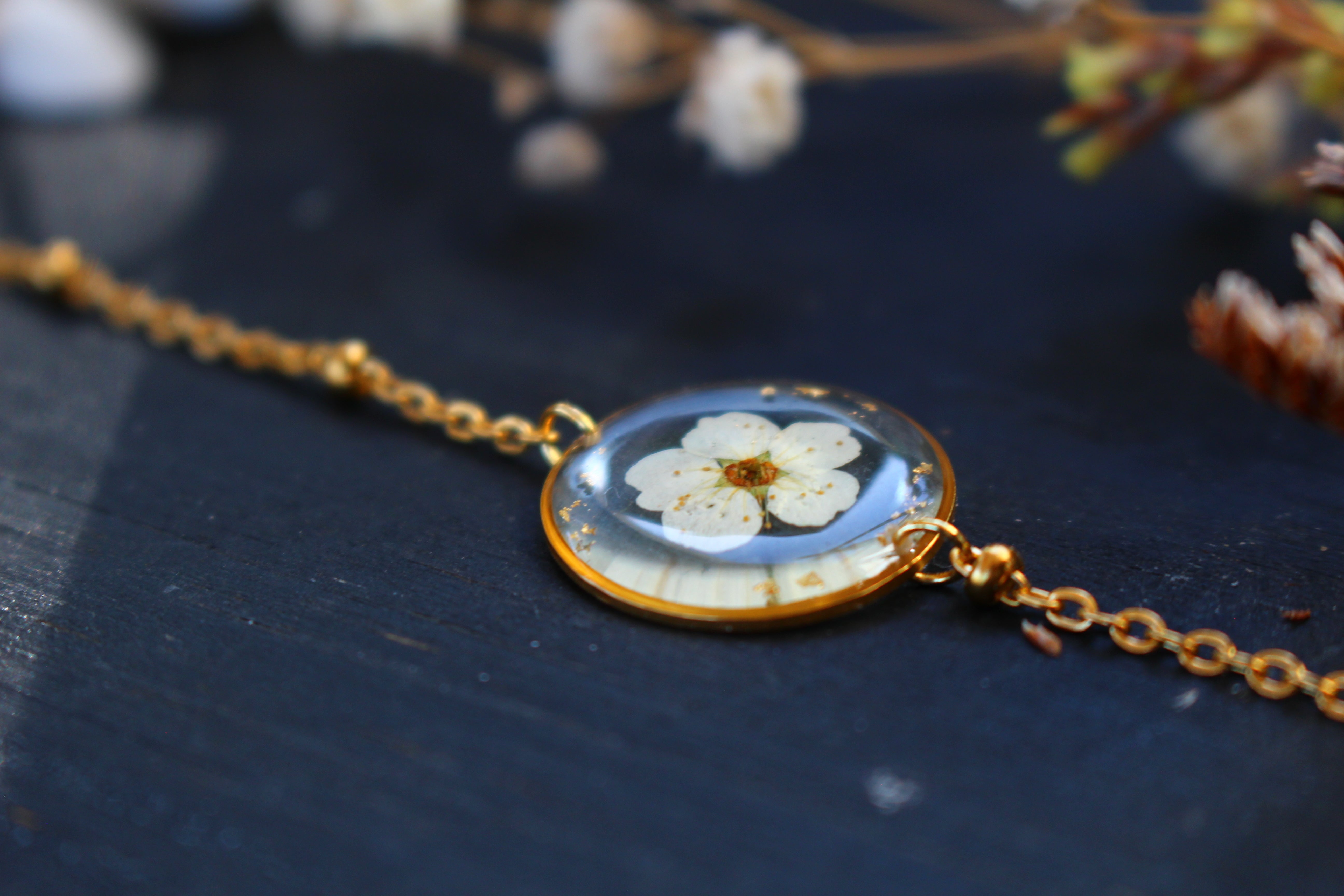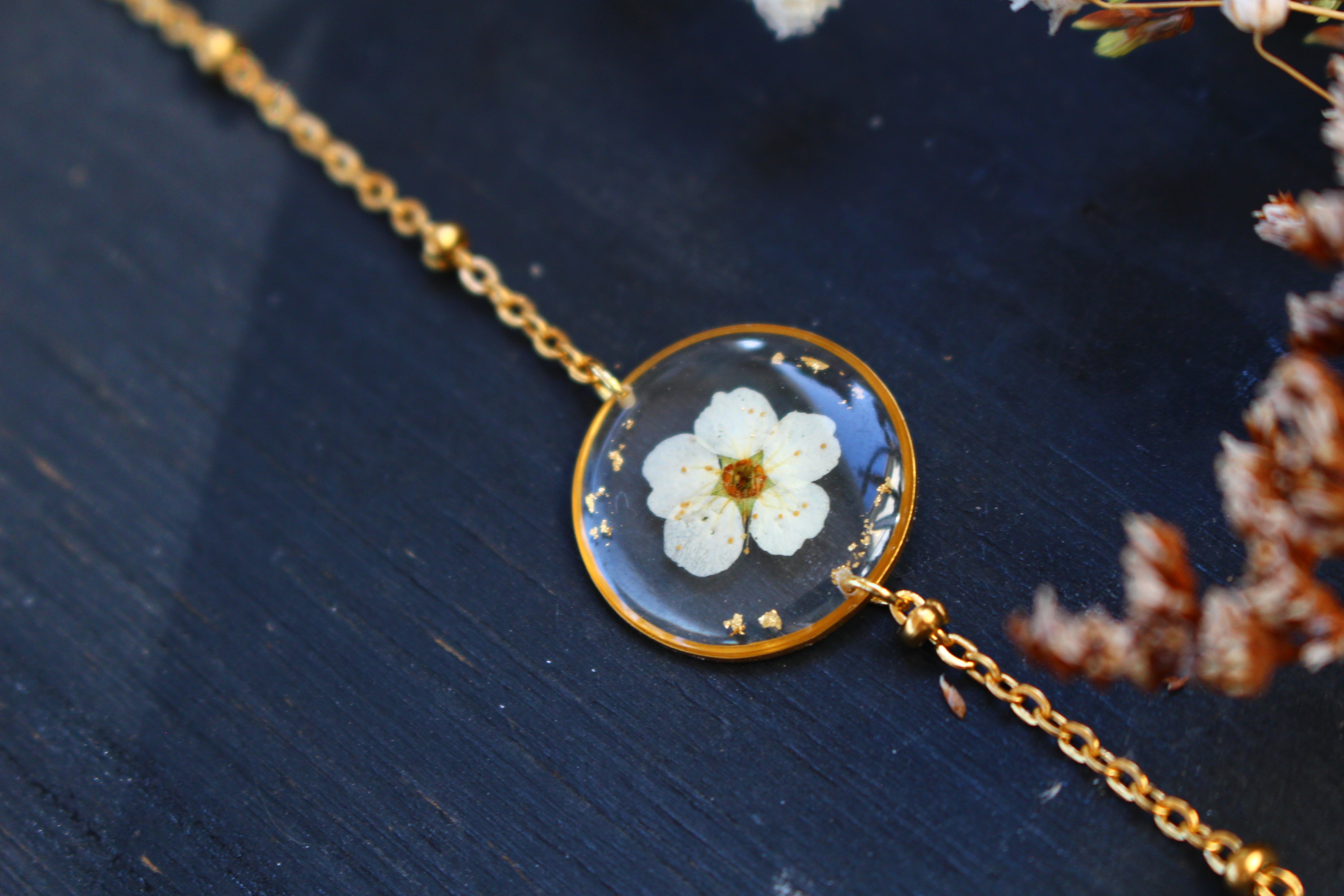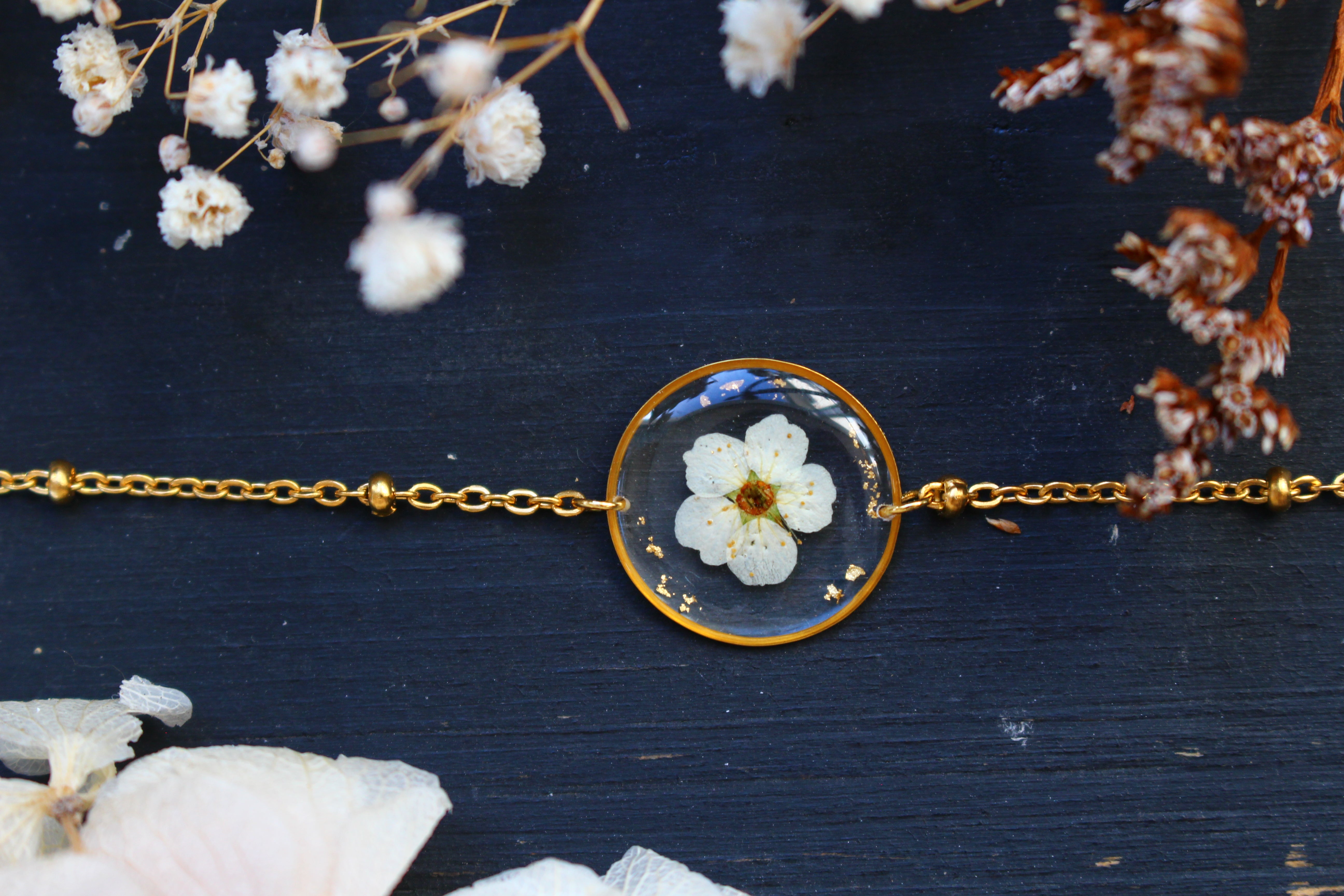 Bracelet composé d'un médaillon de 19mm de diamètre rempli de résine dans laquelle j'ai incrusté une fleur de spirée et quelques feuilles d'or.