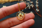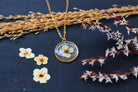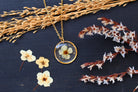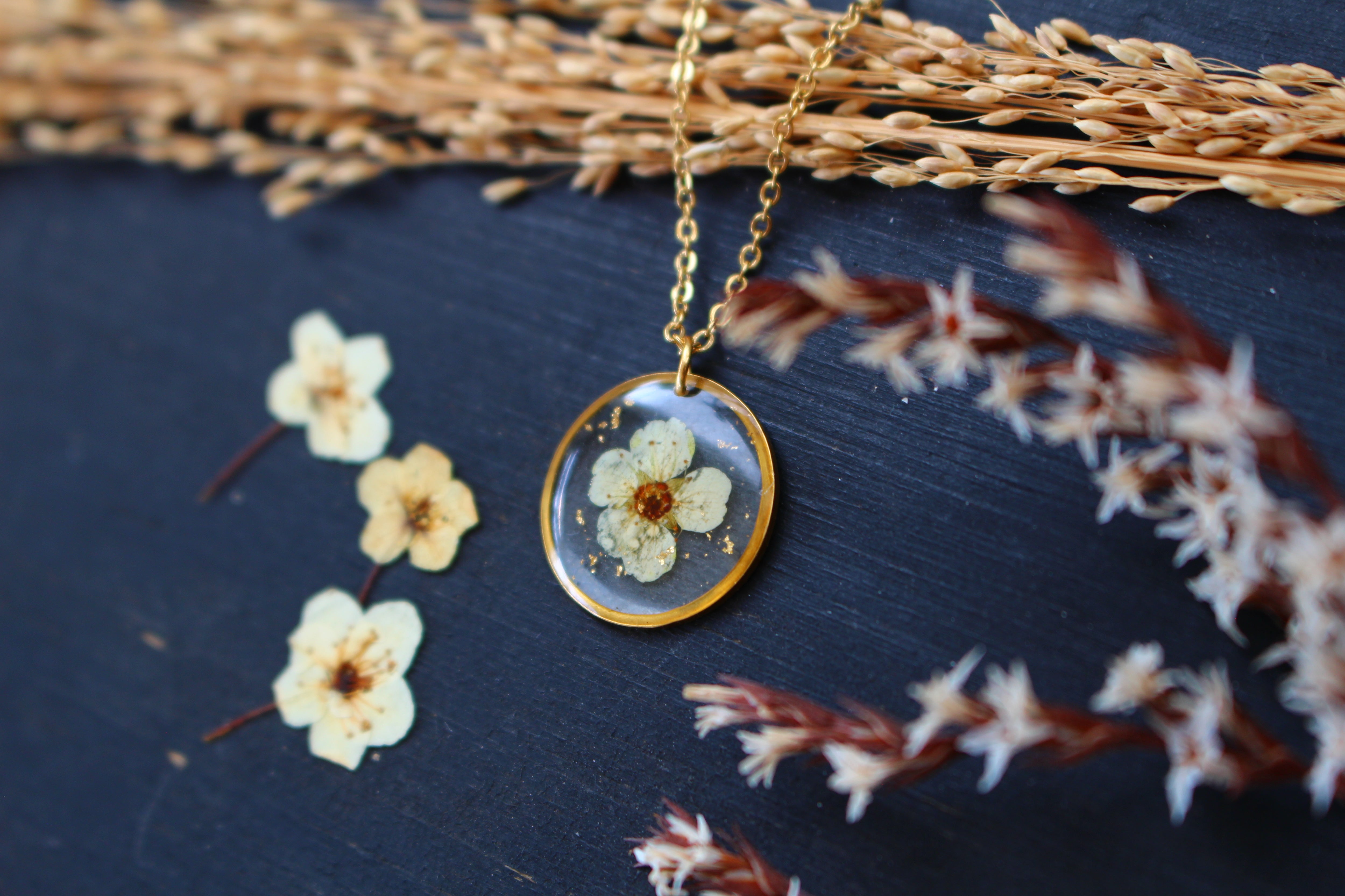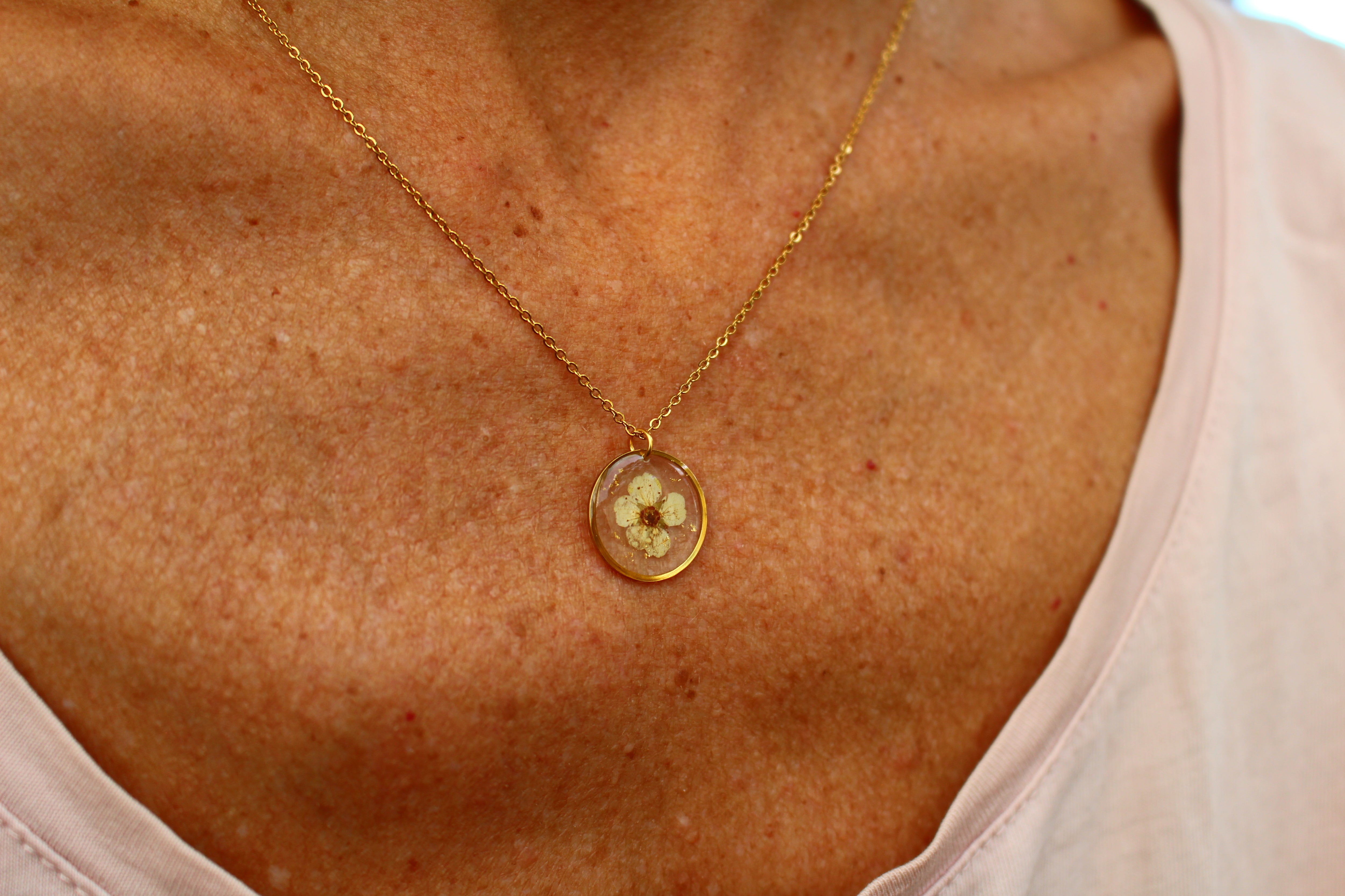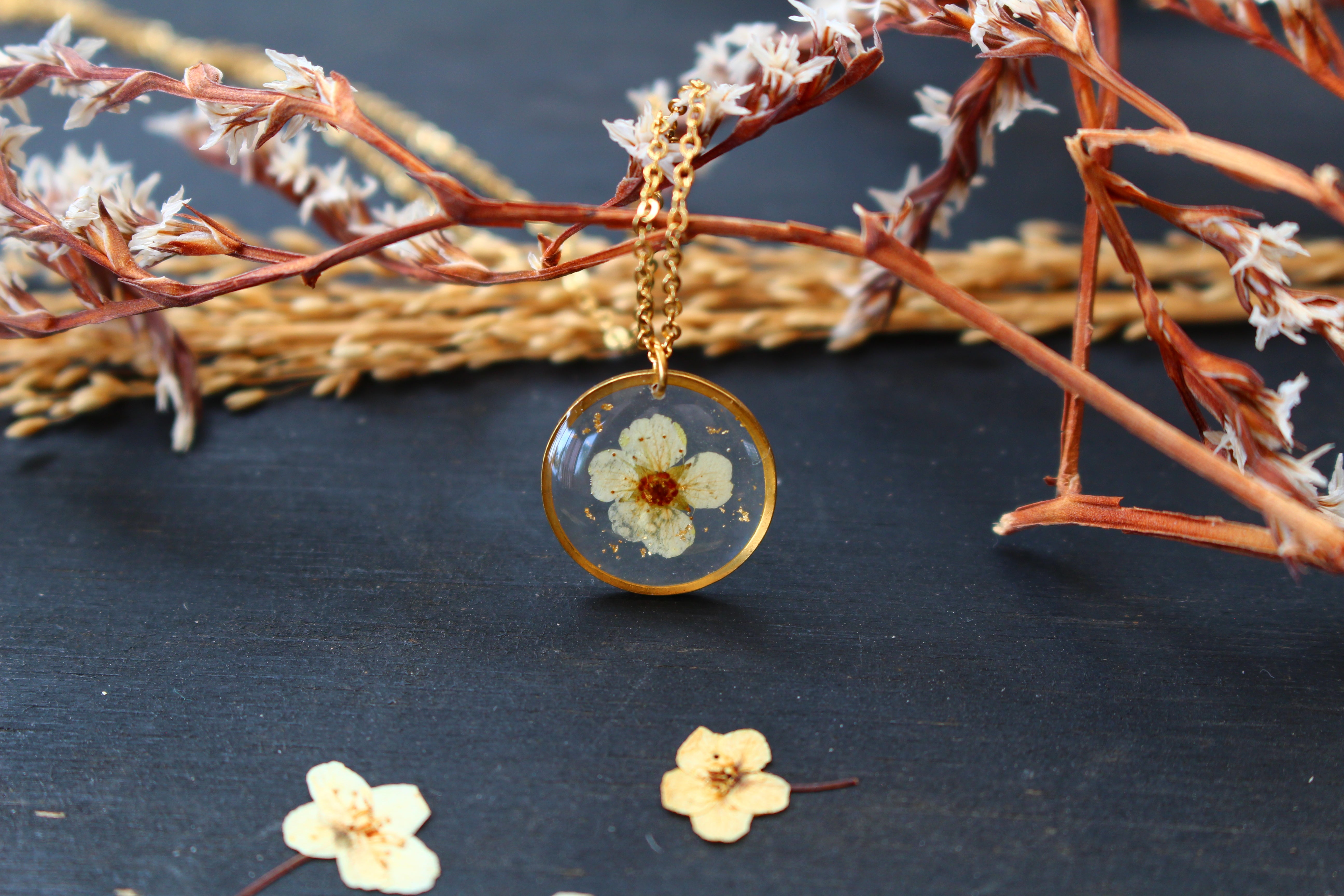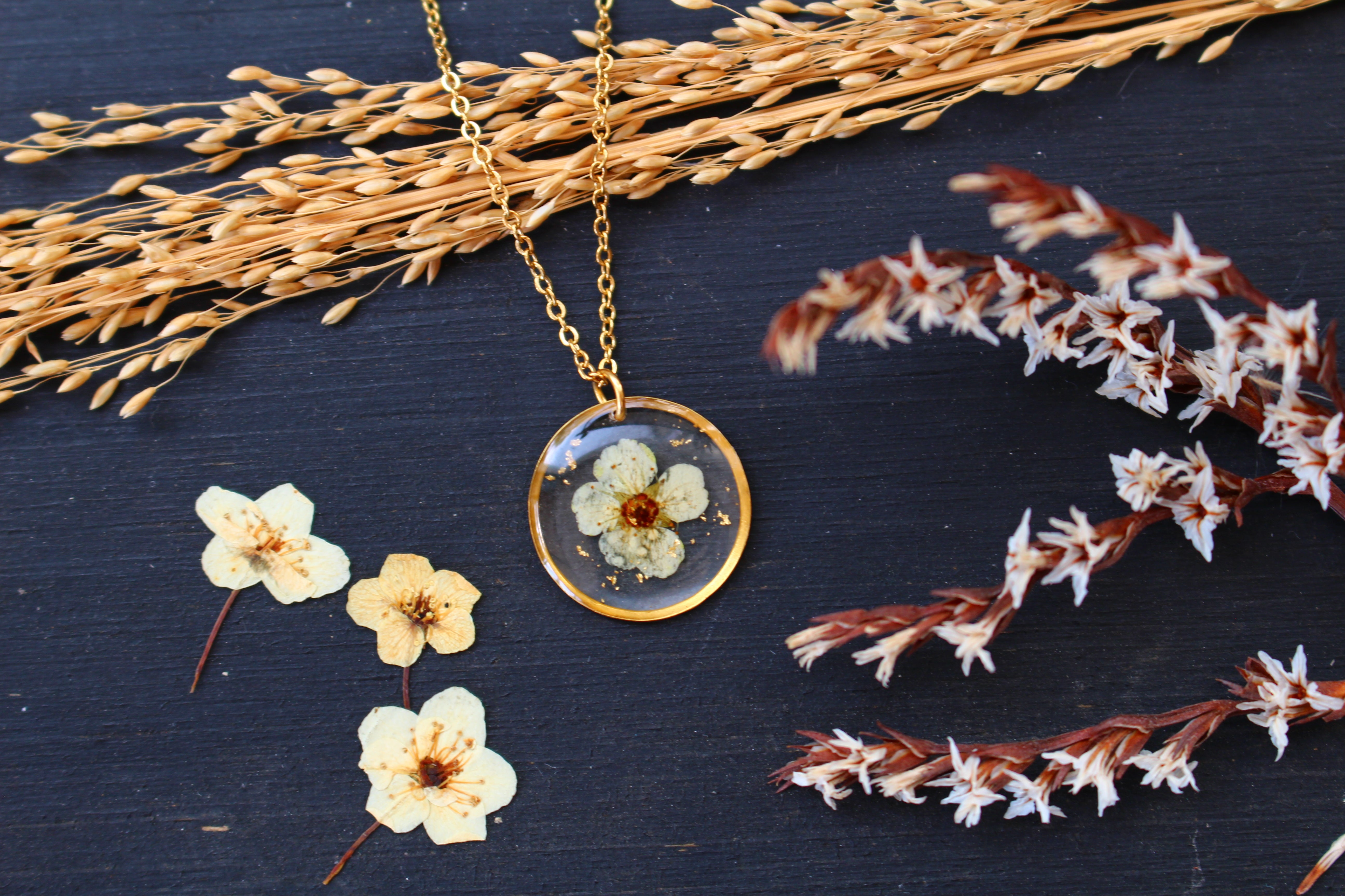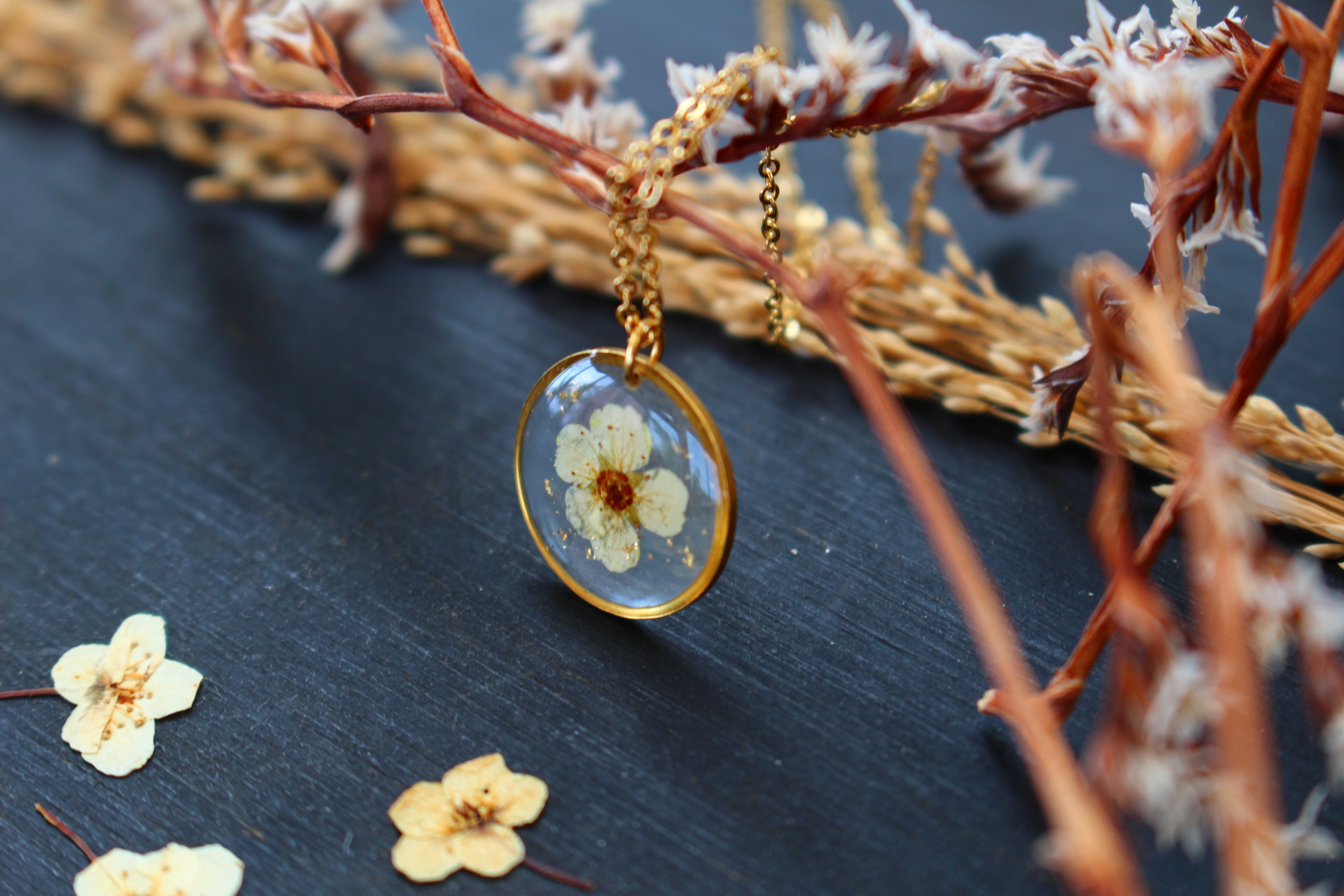 Collier composé d'un médaillon de 15mm de diamètre rempli de résine dans laquelle j'ai incrusté une petite fleur de spirée et quelques feuilles d'or.