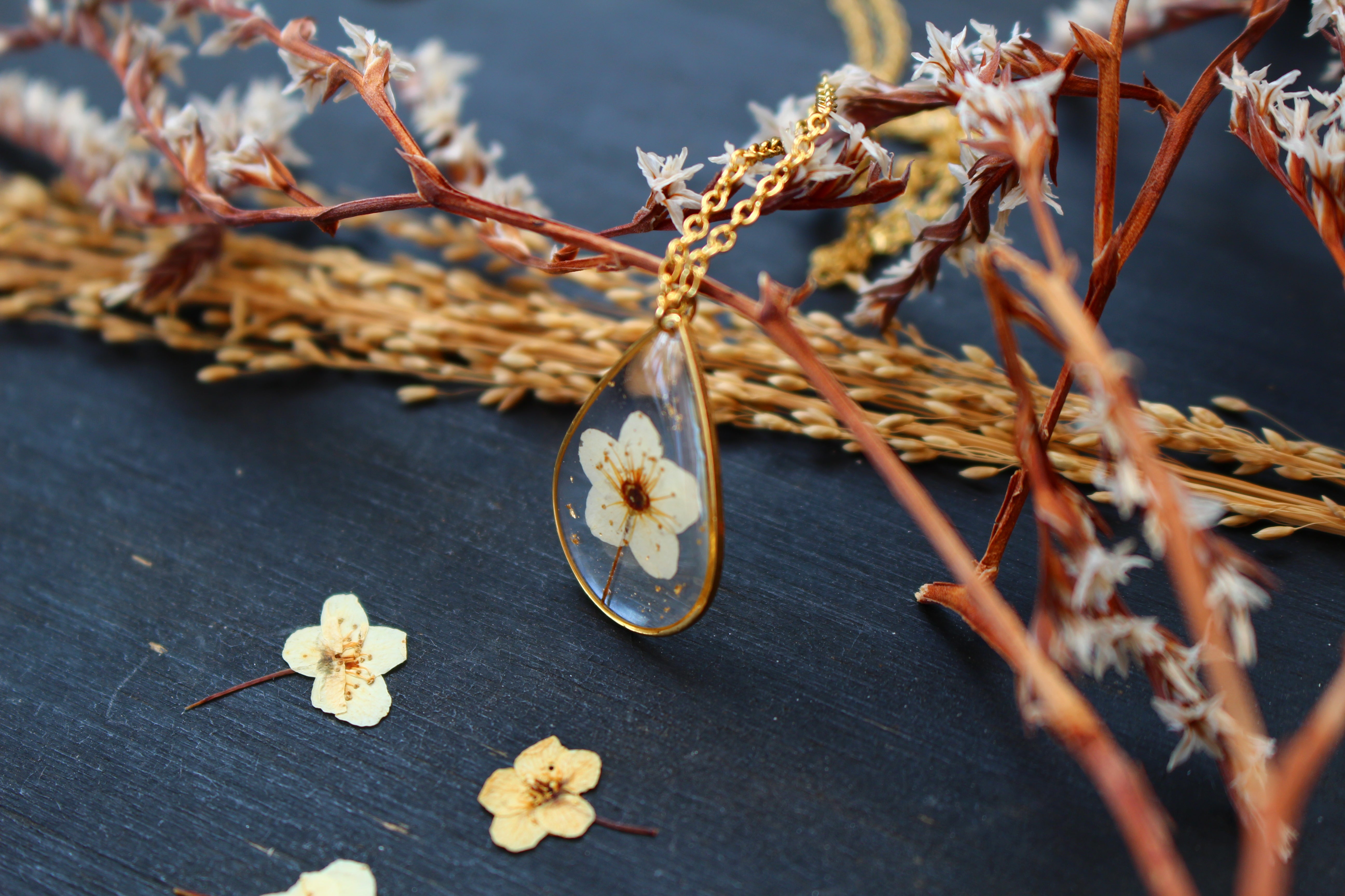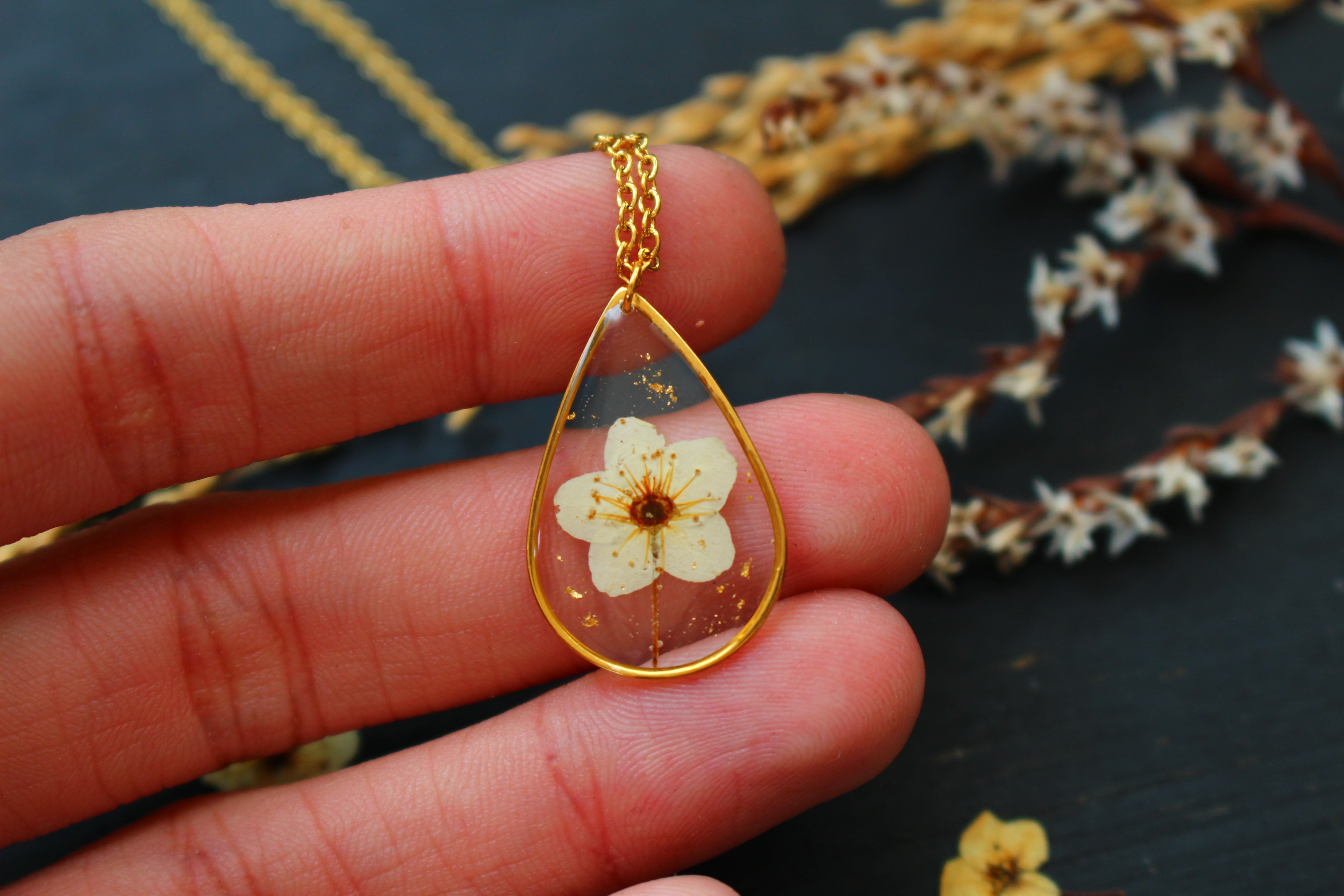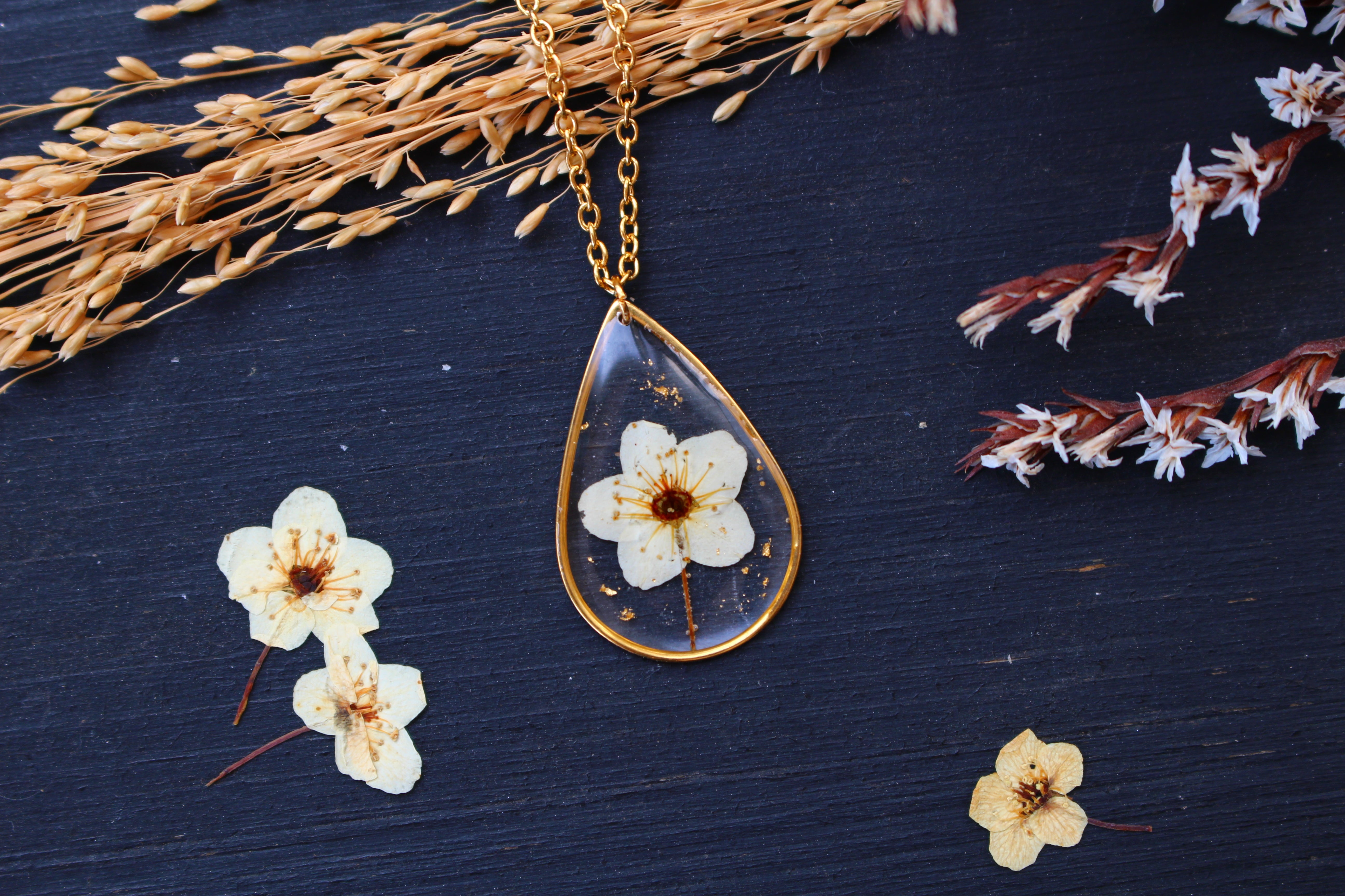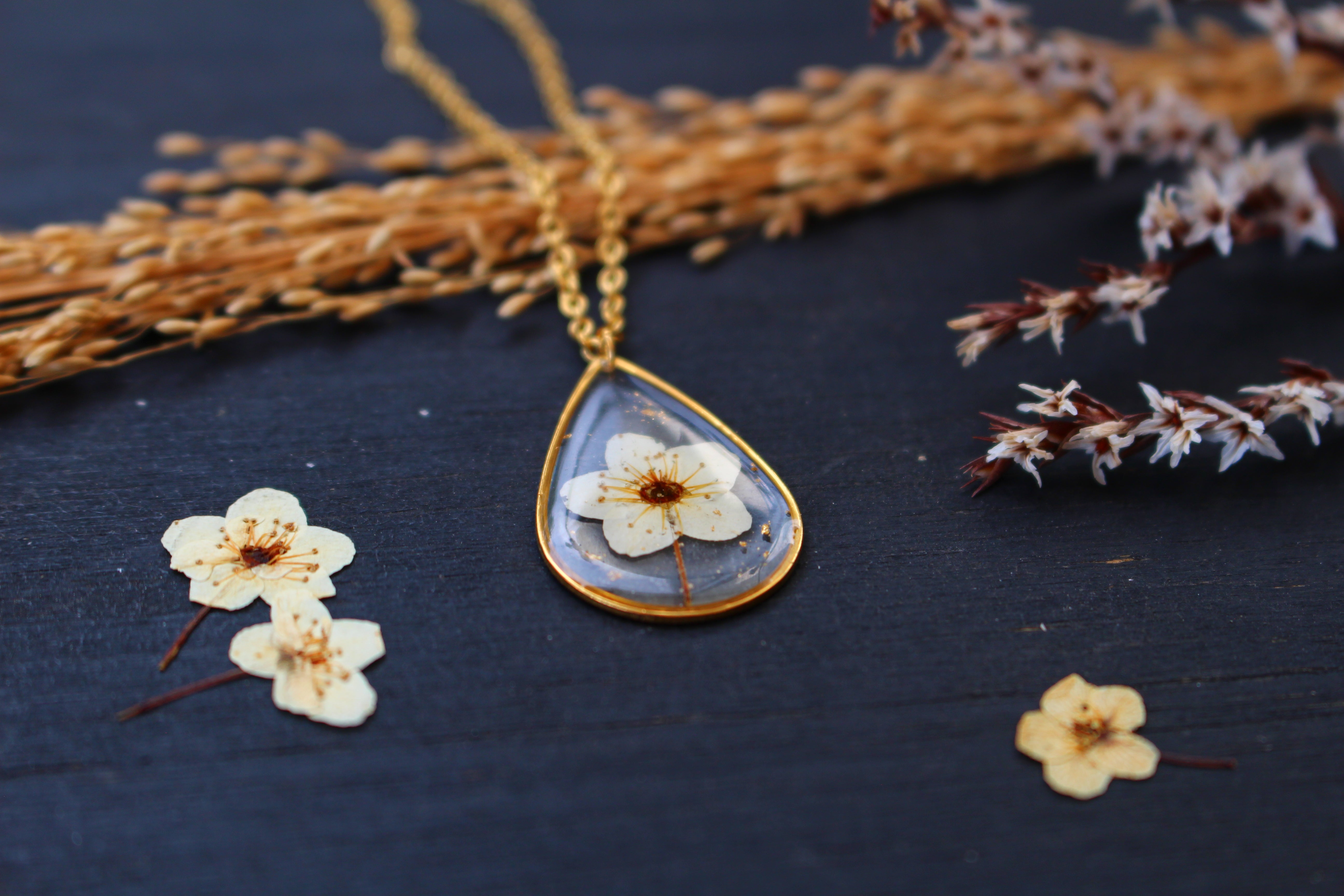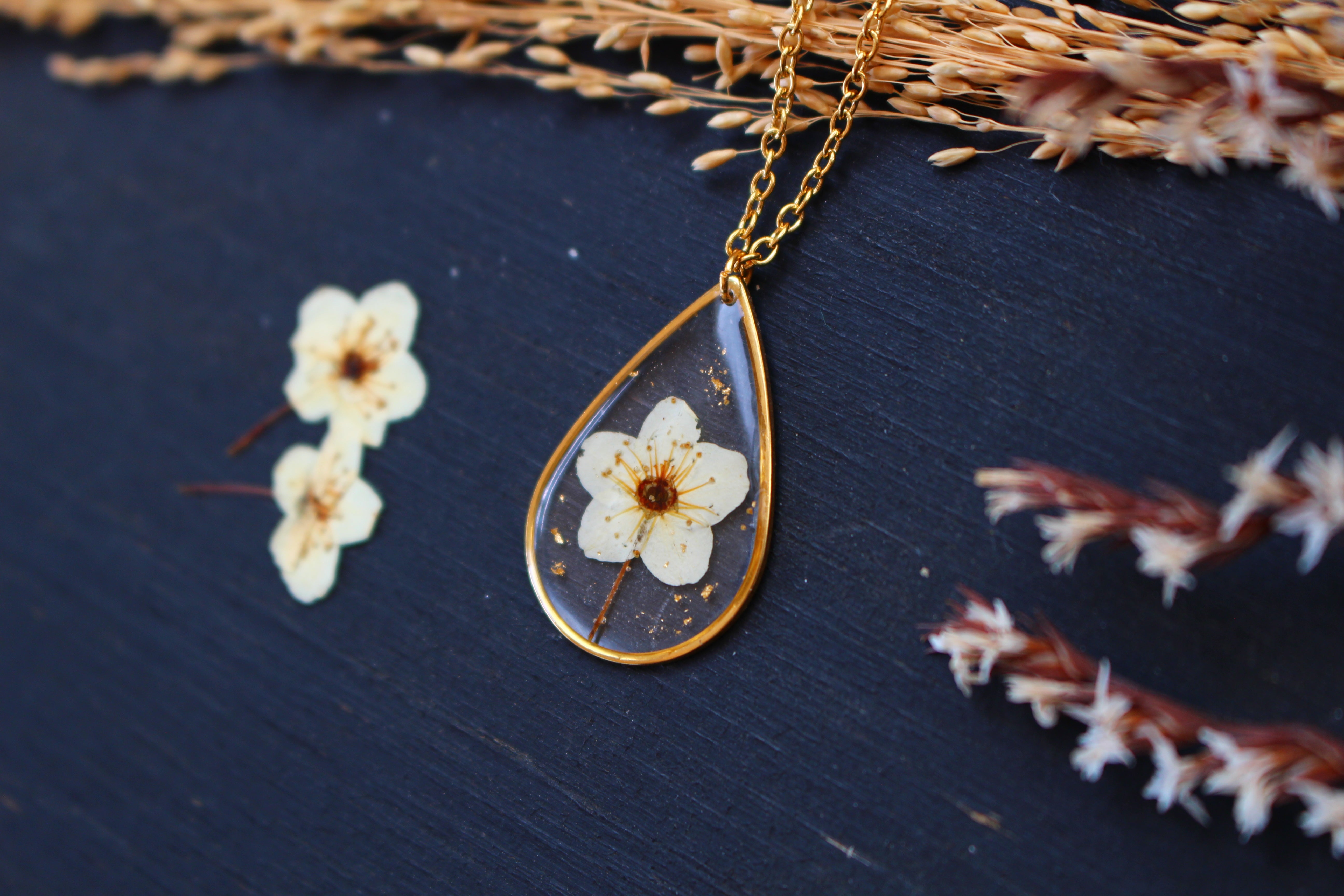 Collier composé d'un médaillon en forme de goutte rempli de résine dans laquelle j'ai incrusté une petite fleur de spirée et quelques feuilles d'or.