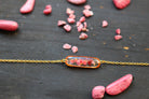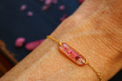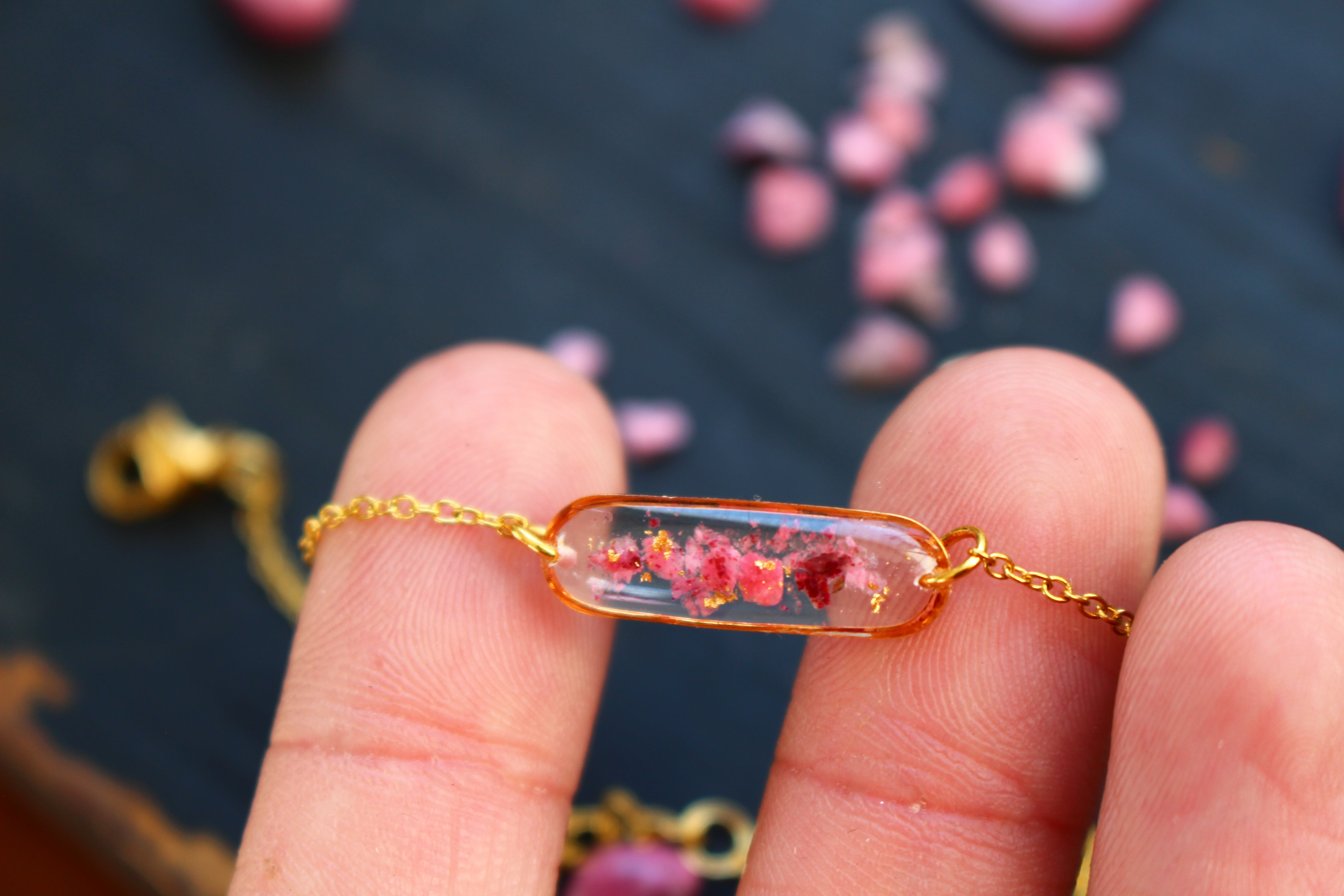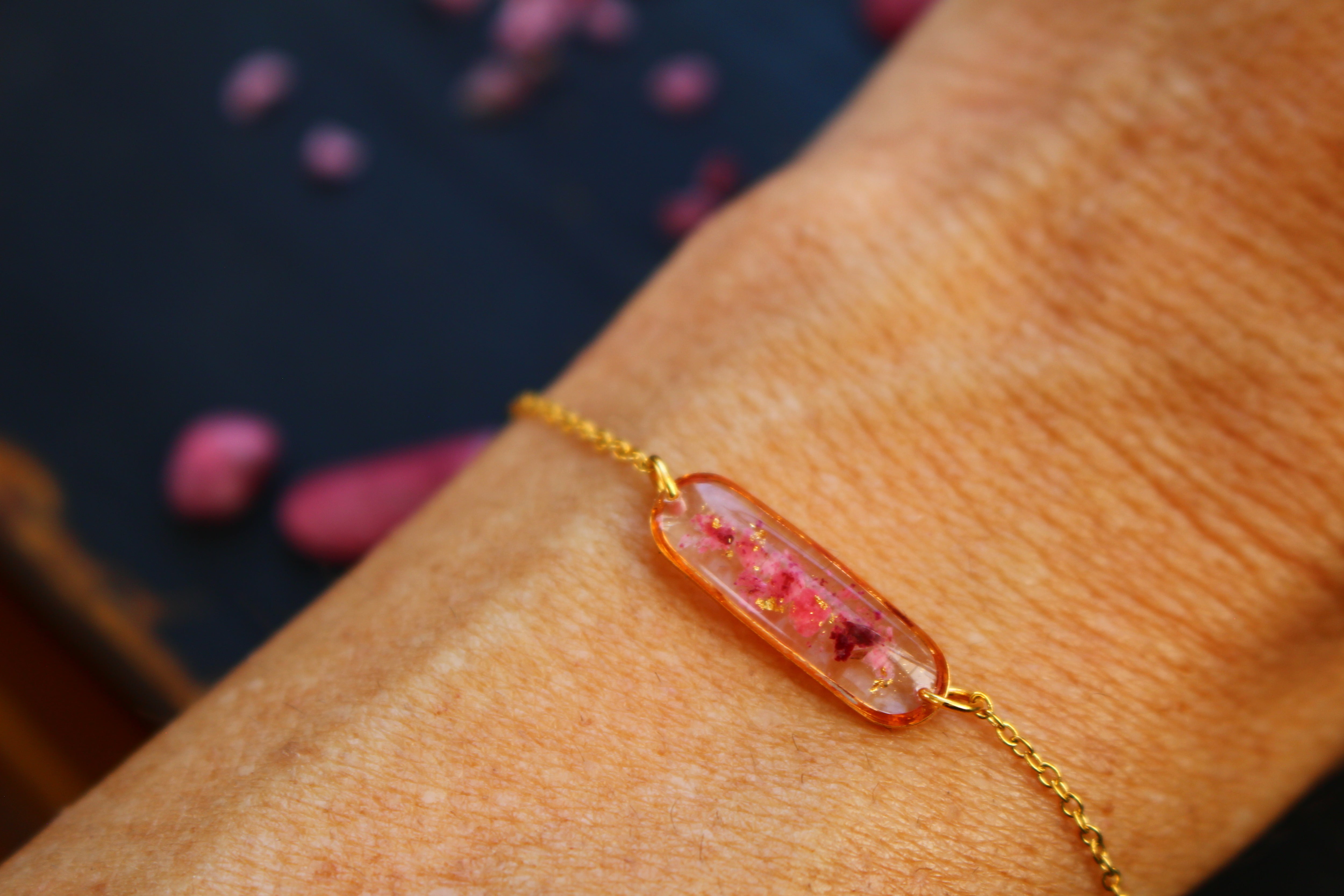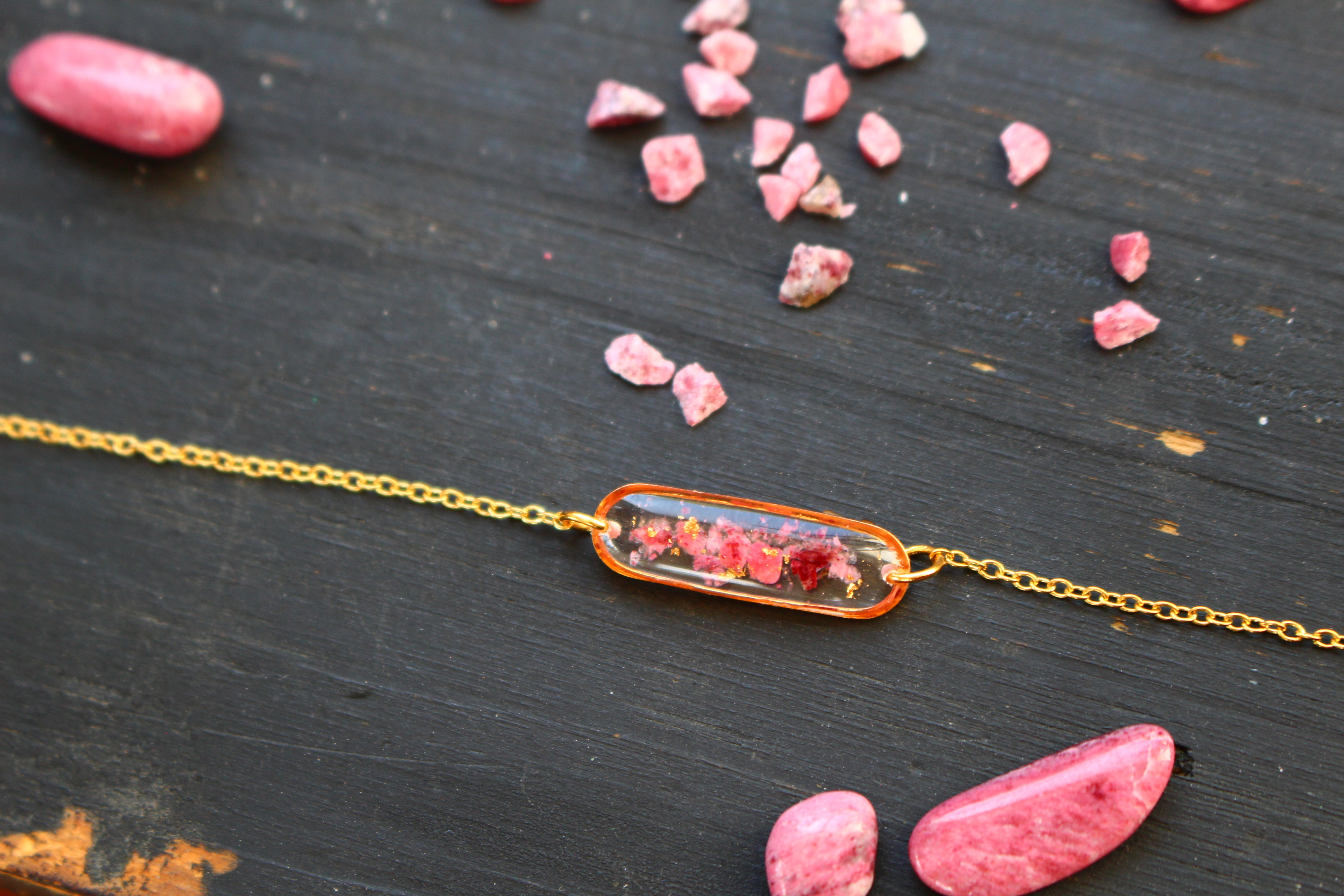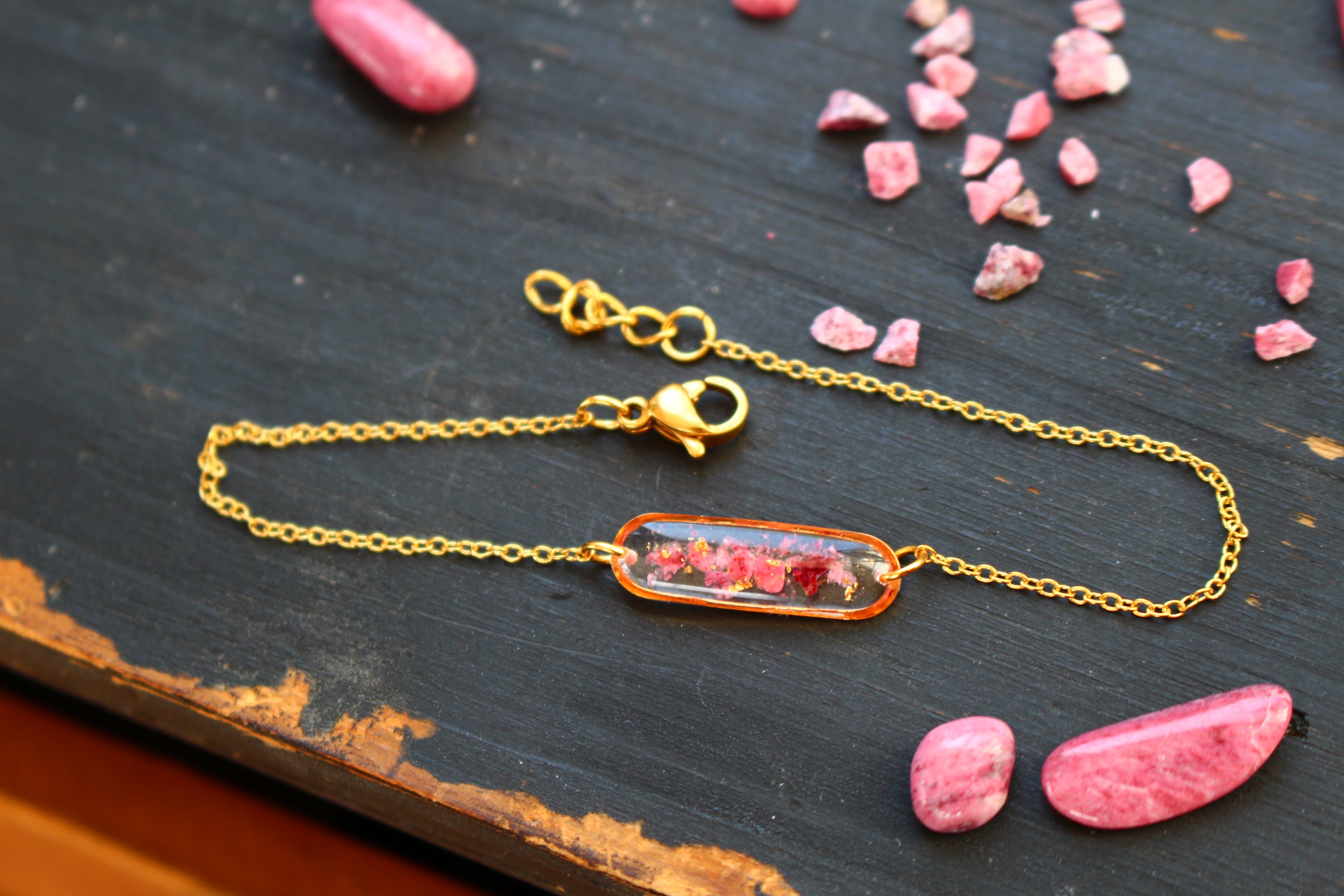 Bracelet composé d'un médaillon allongé rempli de résine dans laquelle j'ai incrusté de pierres de Thulite et de la feuille d'or