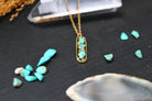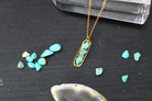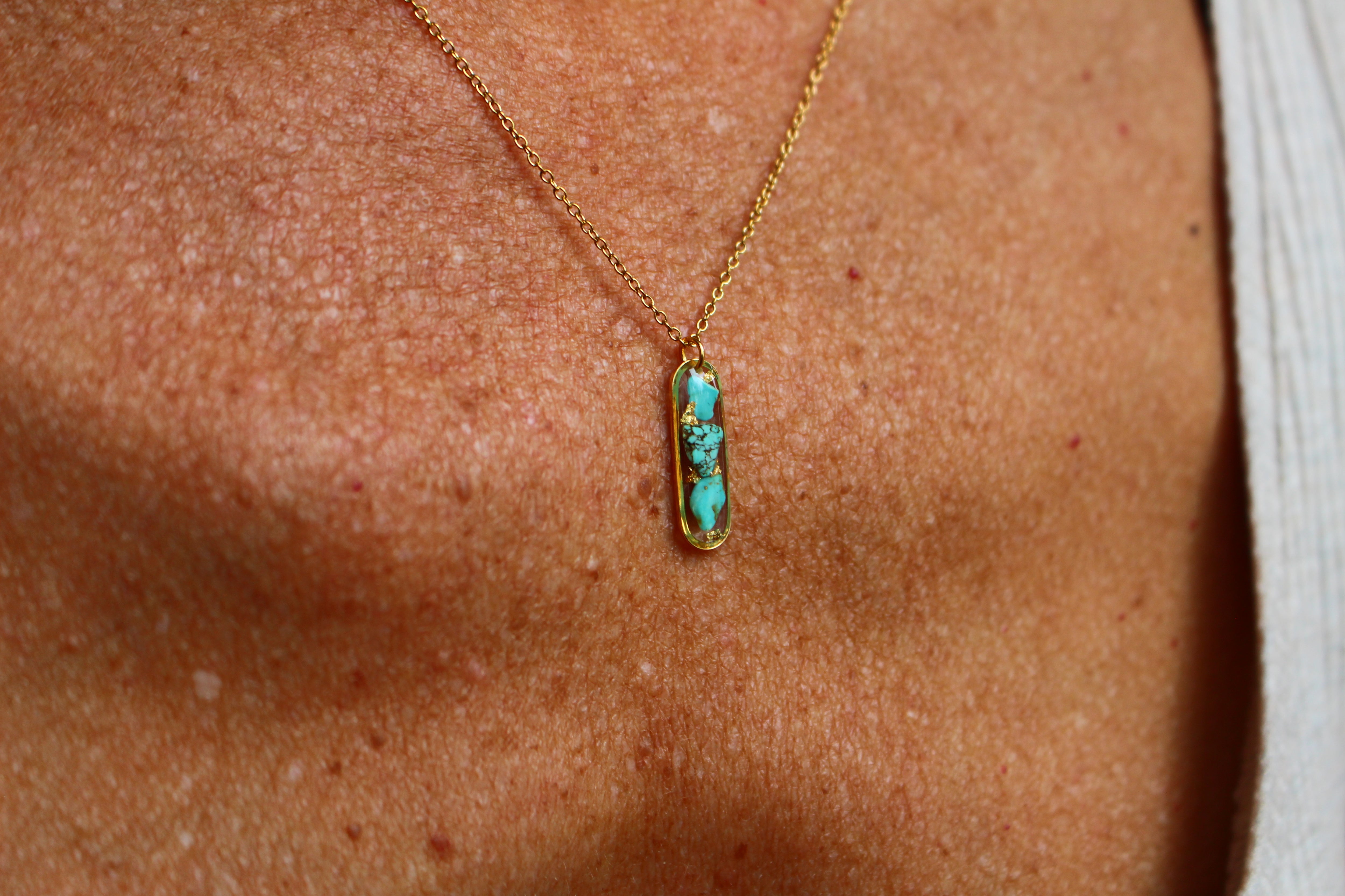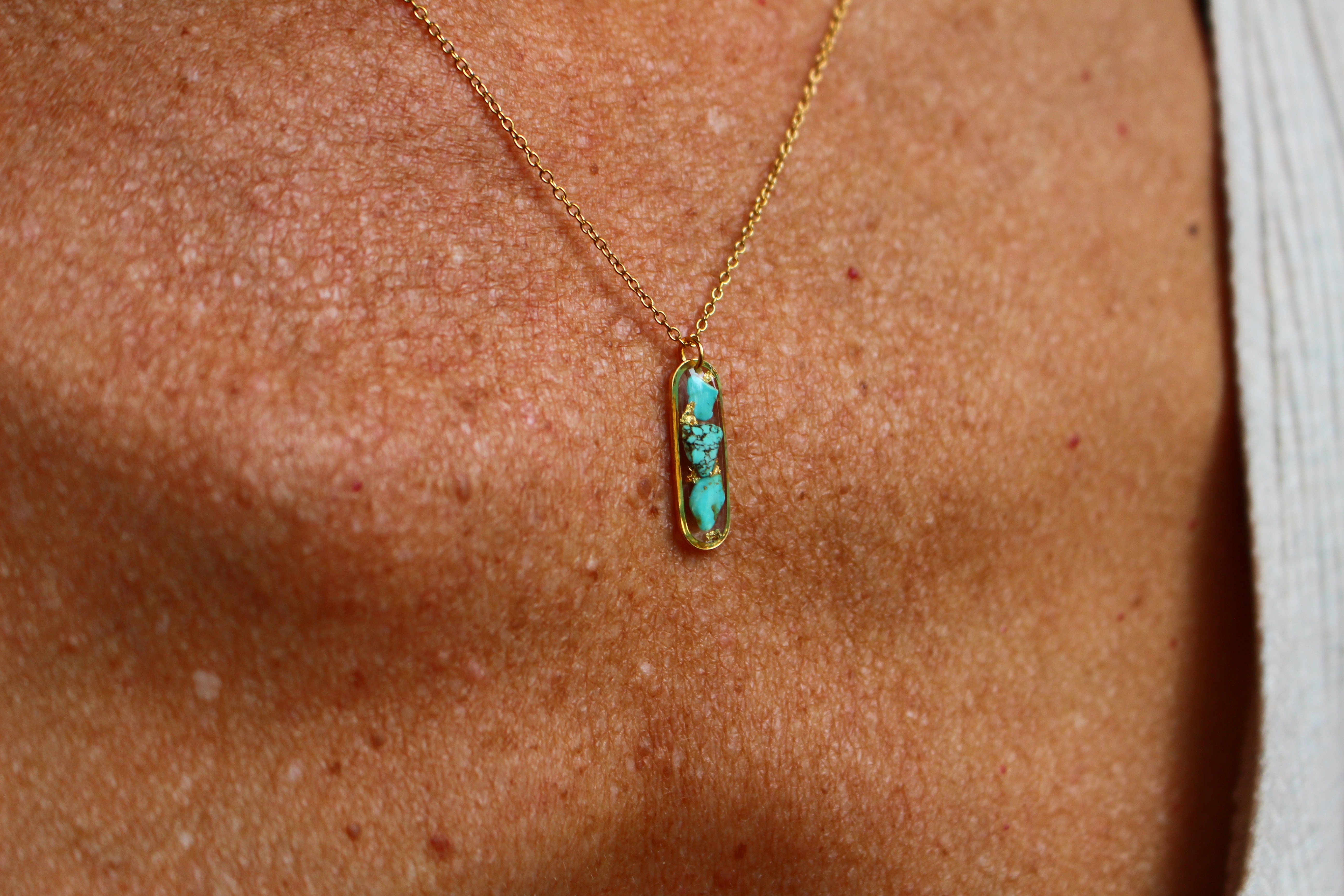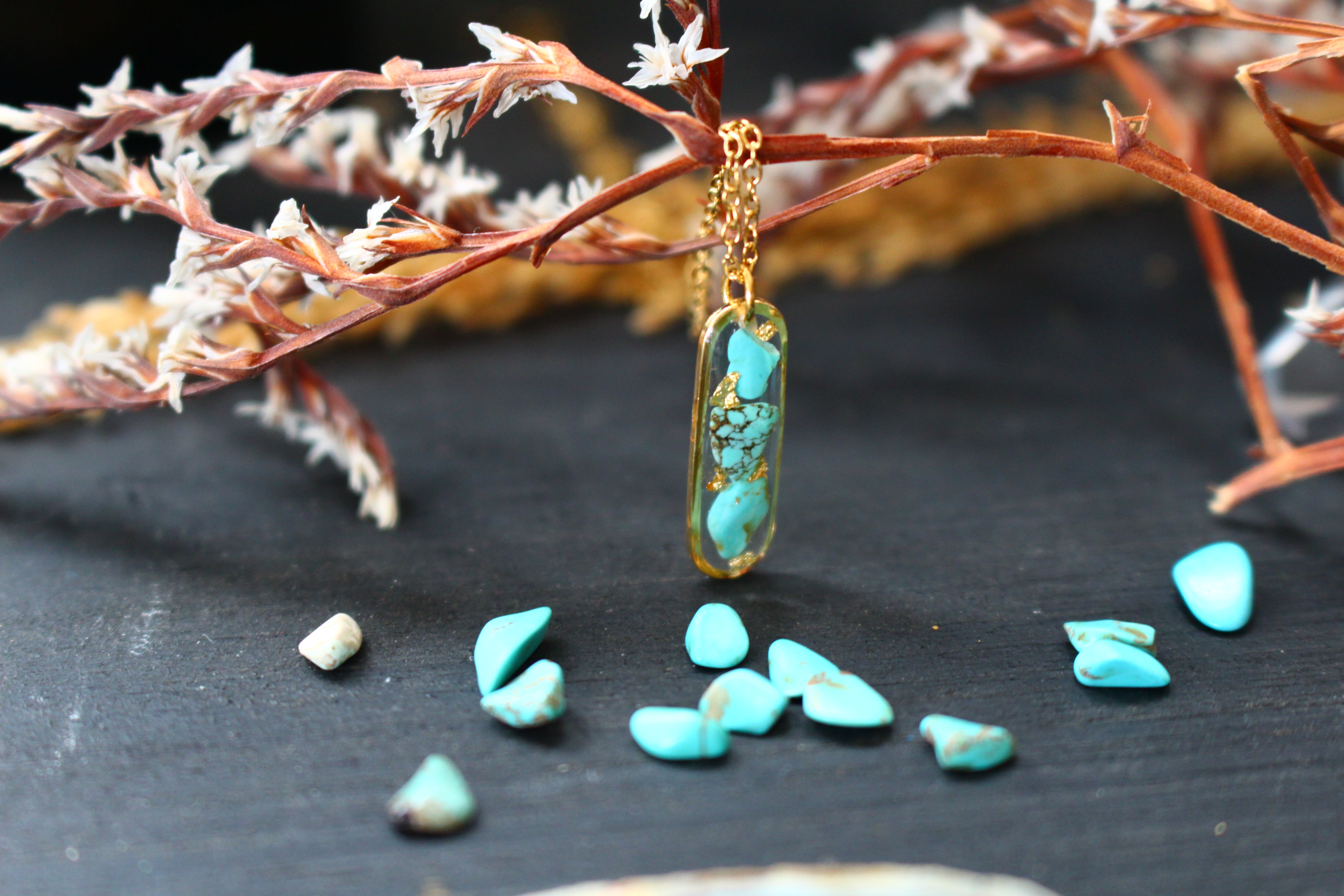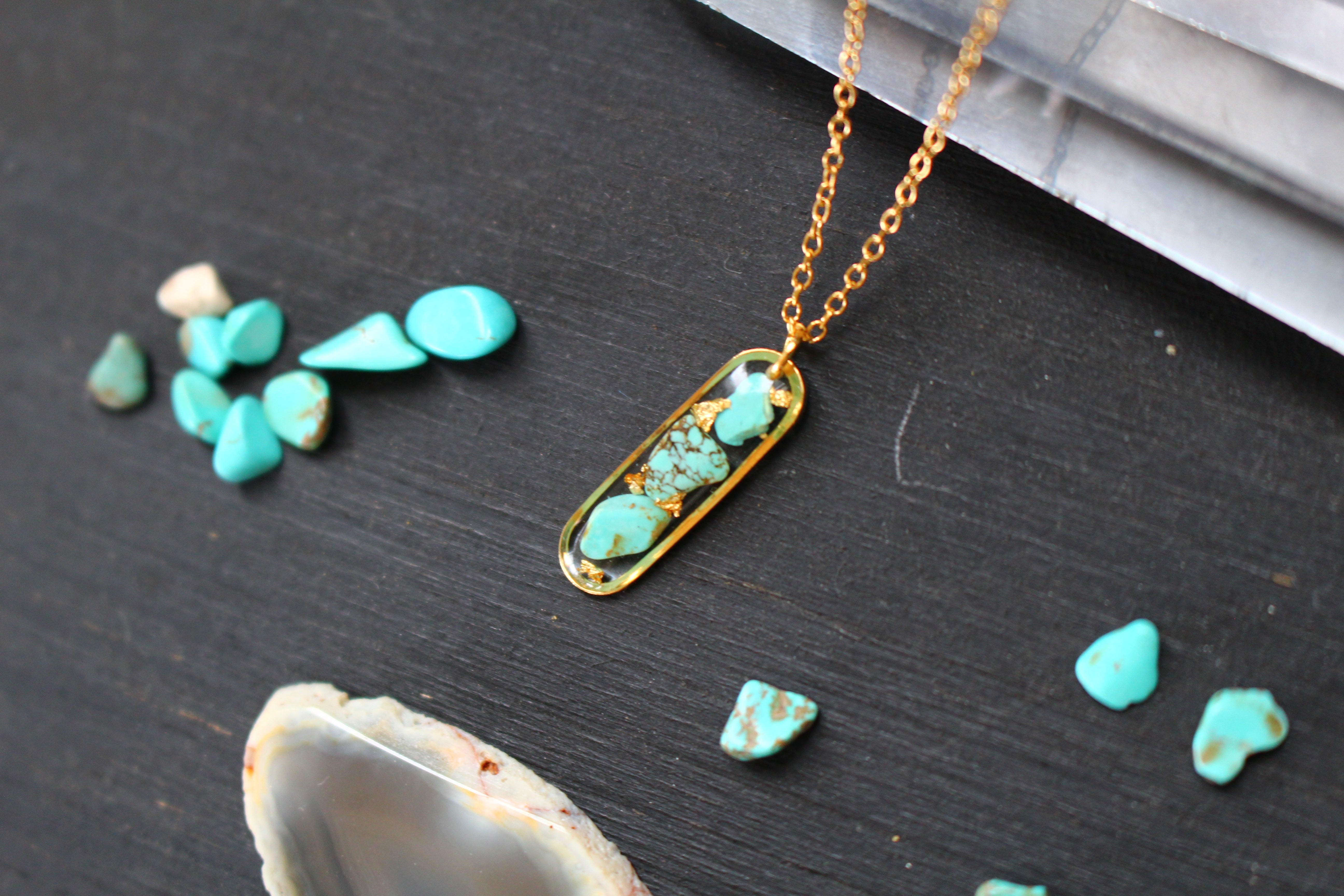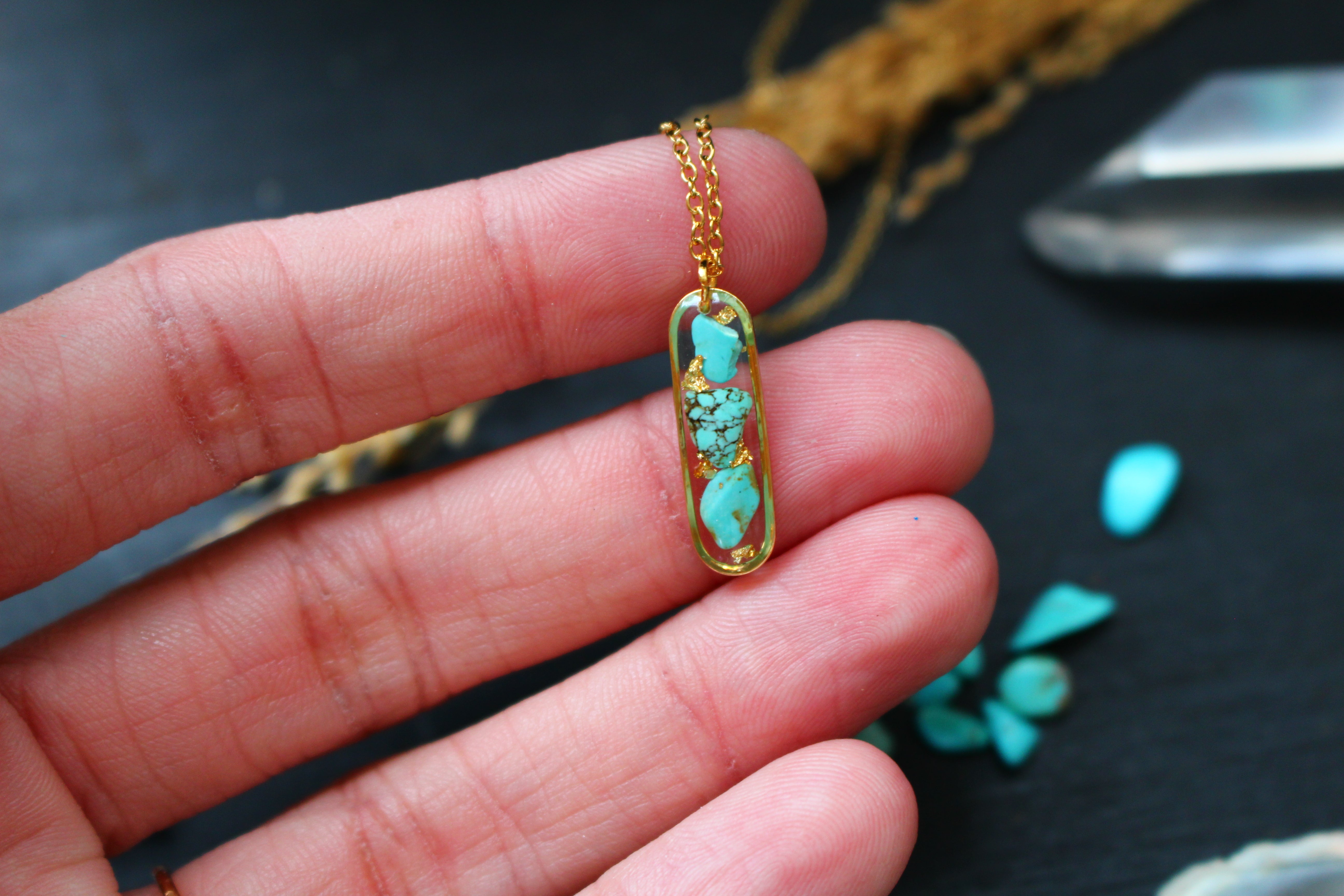 ollier composé d'un médaillon allongé rempli de résine dans laquelle j'ai incrusté de pierres de turquoise et de la feuille d'orl