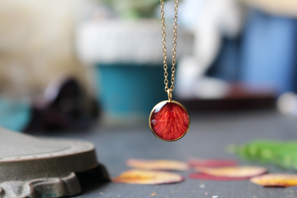 Necklace composed of a 12mm diameter solid medallion filled with resin in which I have encrusted part of a flamboyant petal and some gold leaf glitter.