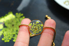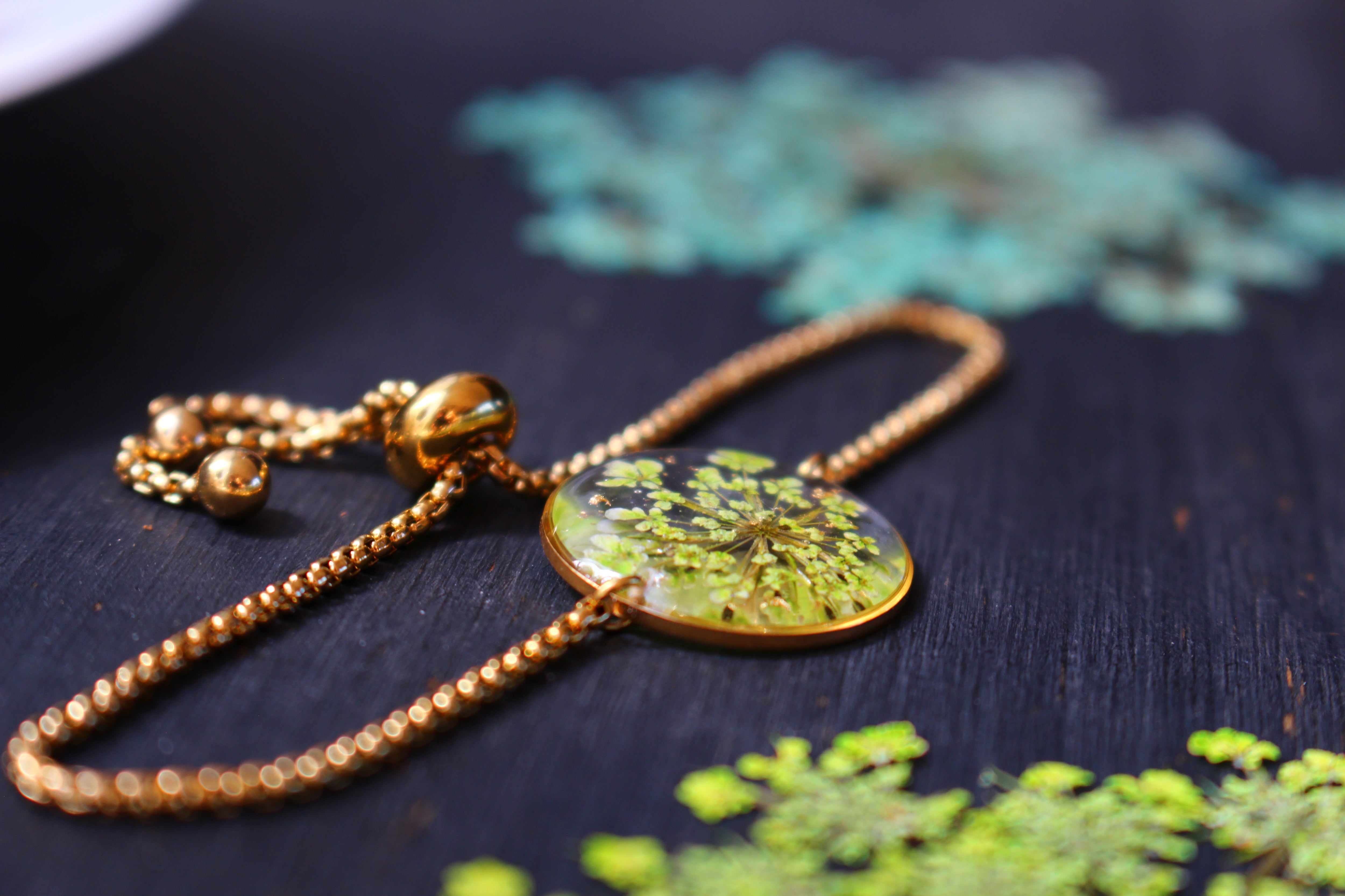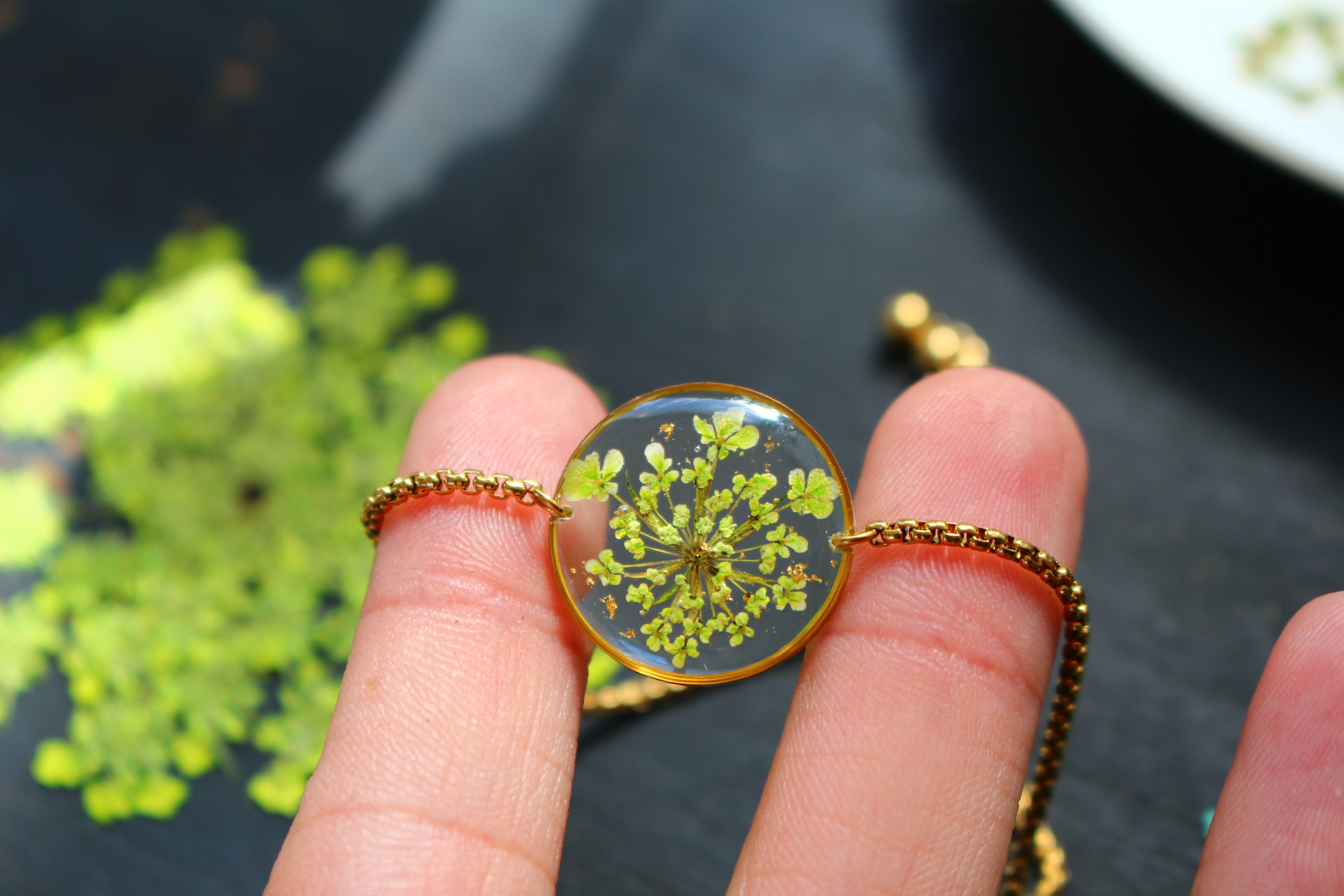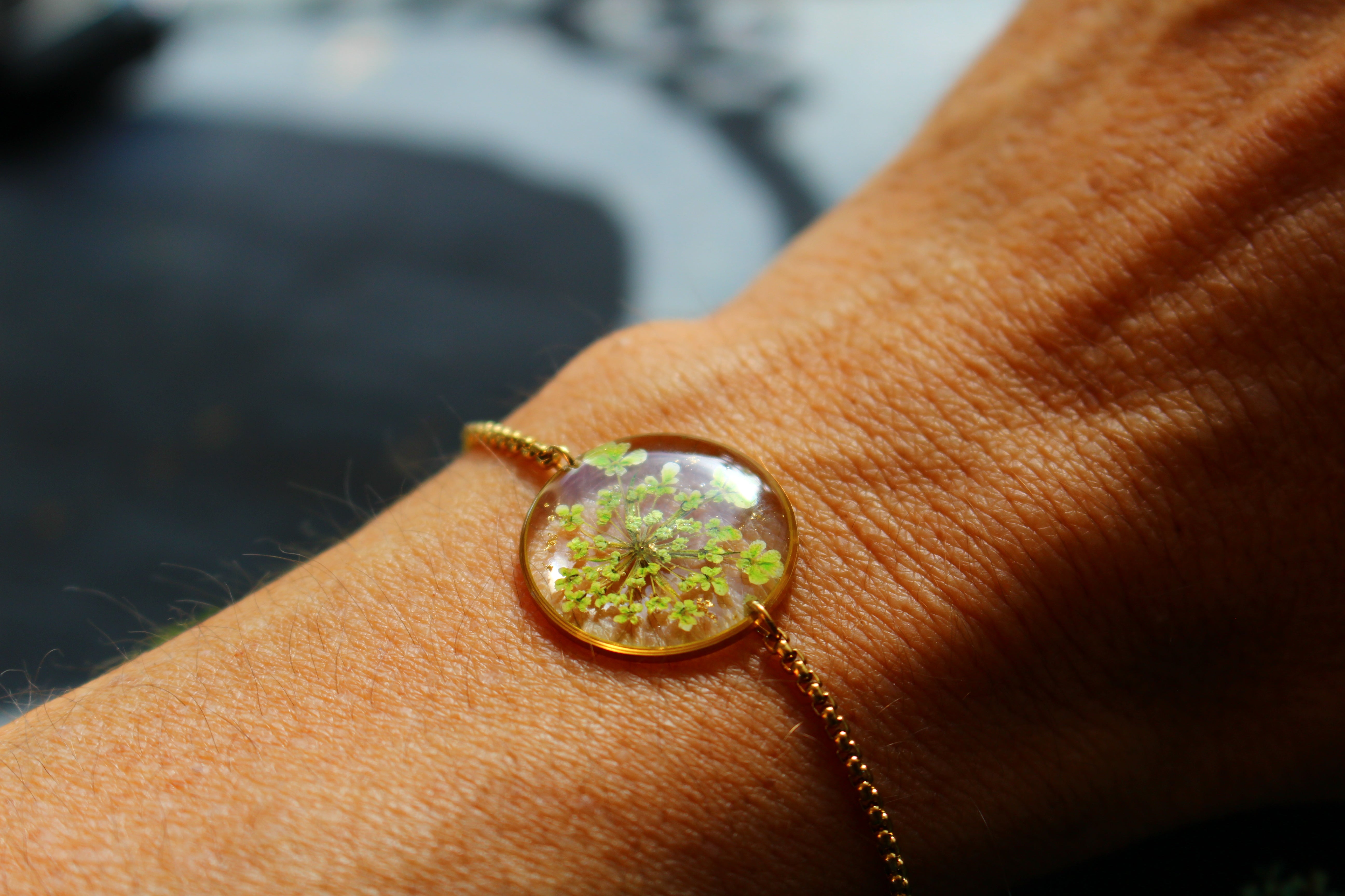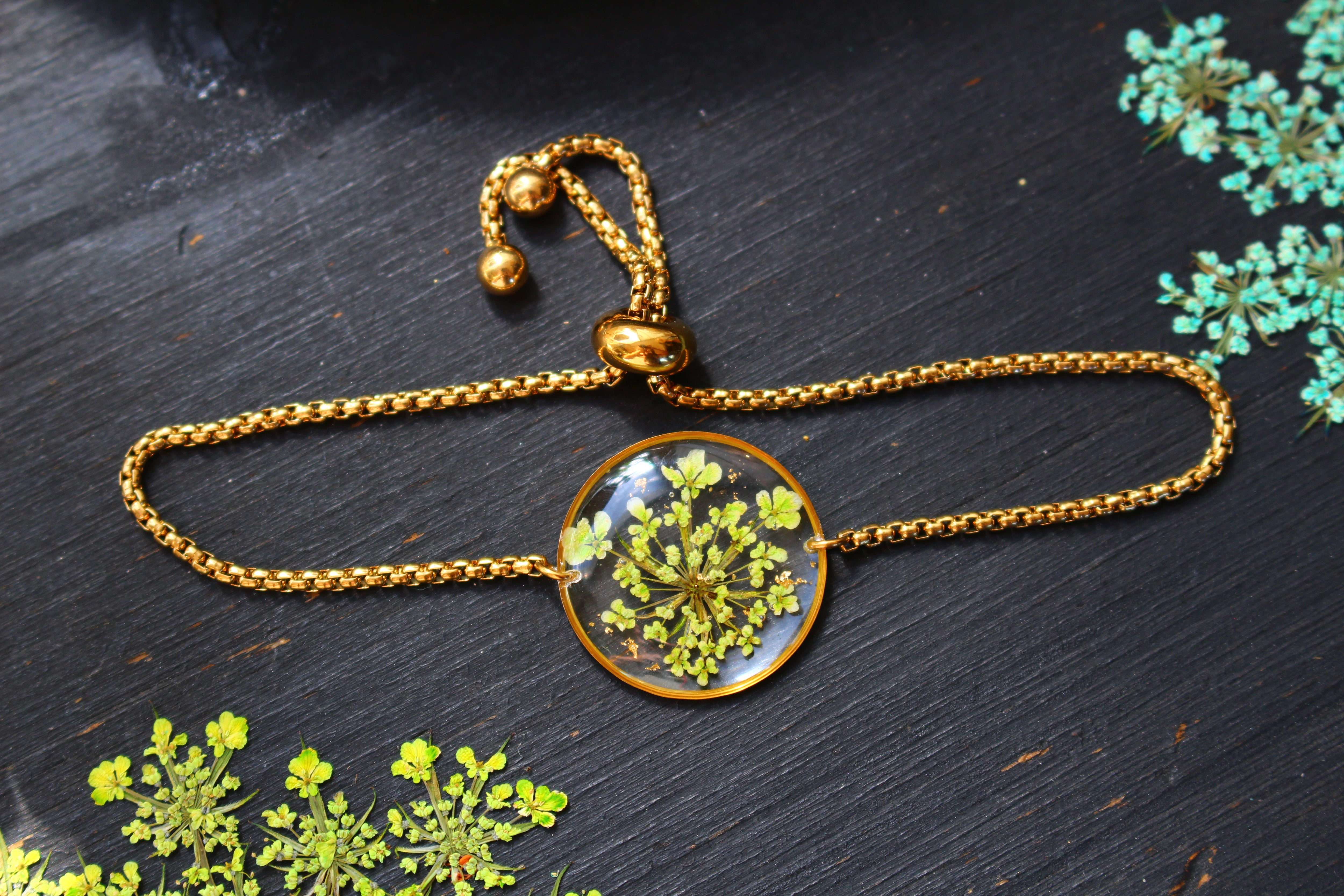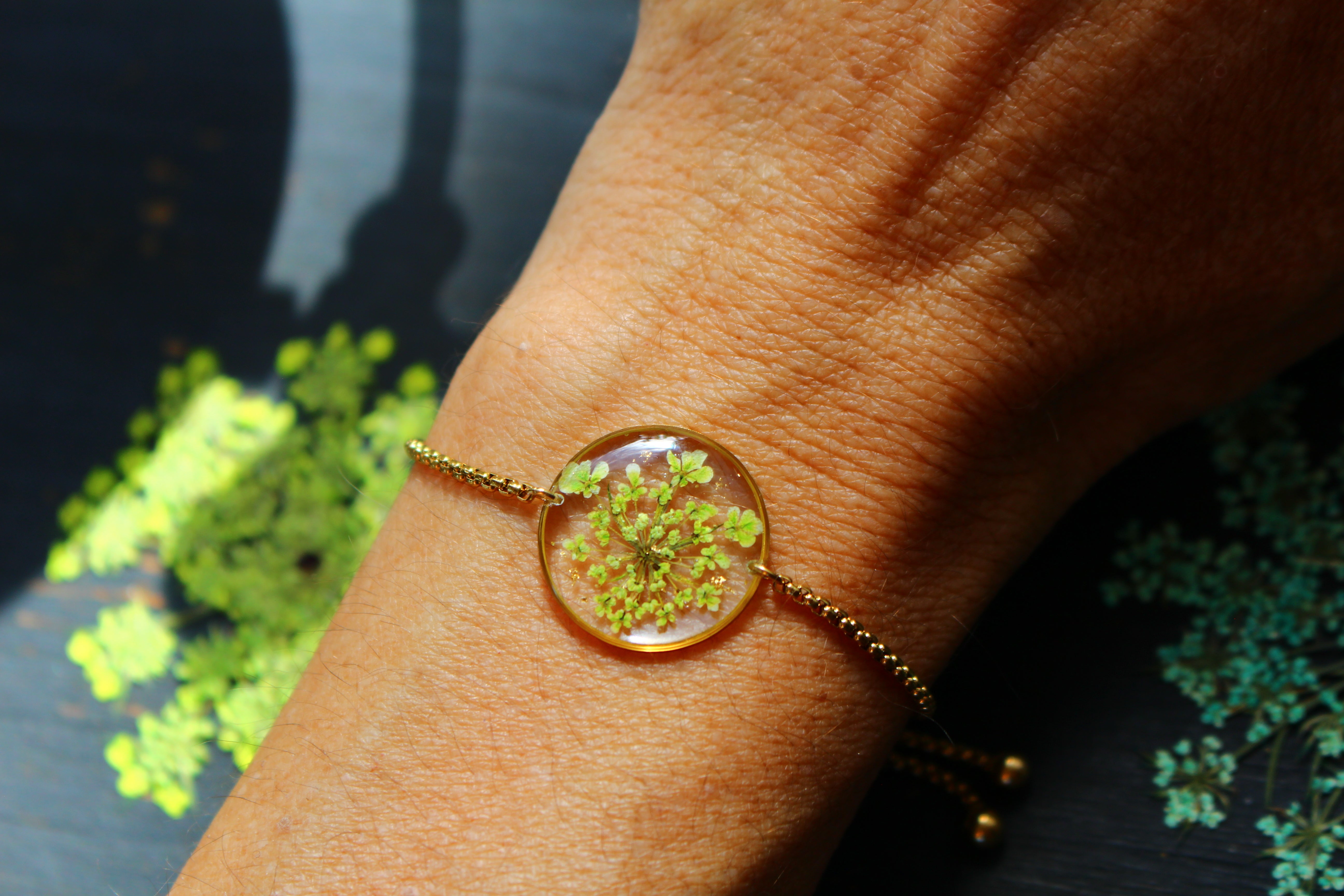 Bracelet made up of a 19mm diameter medallion filled with resin in which I have inlaid small flowers called Queen of Anne lace and pieces of gold leaf
