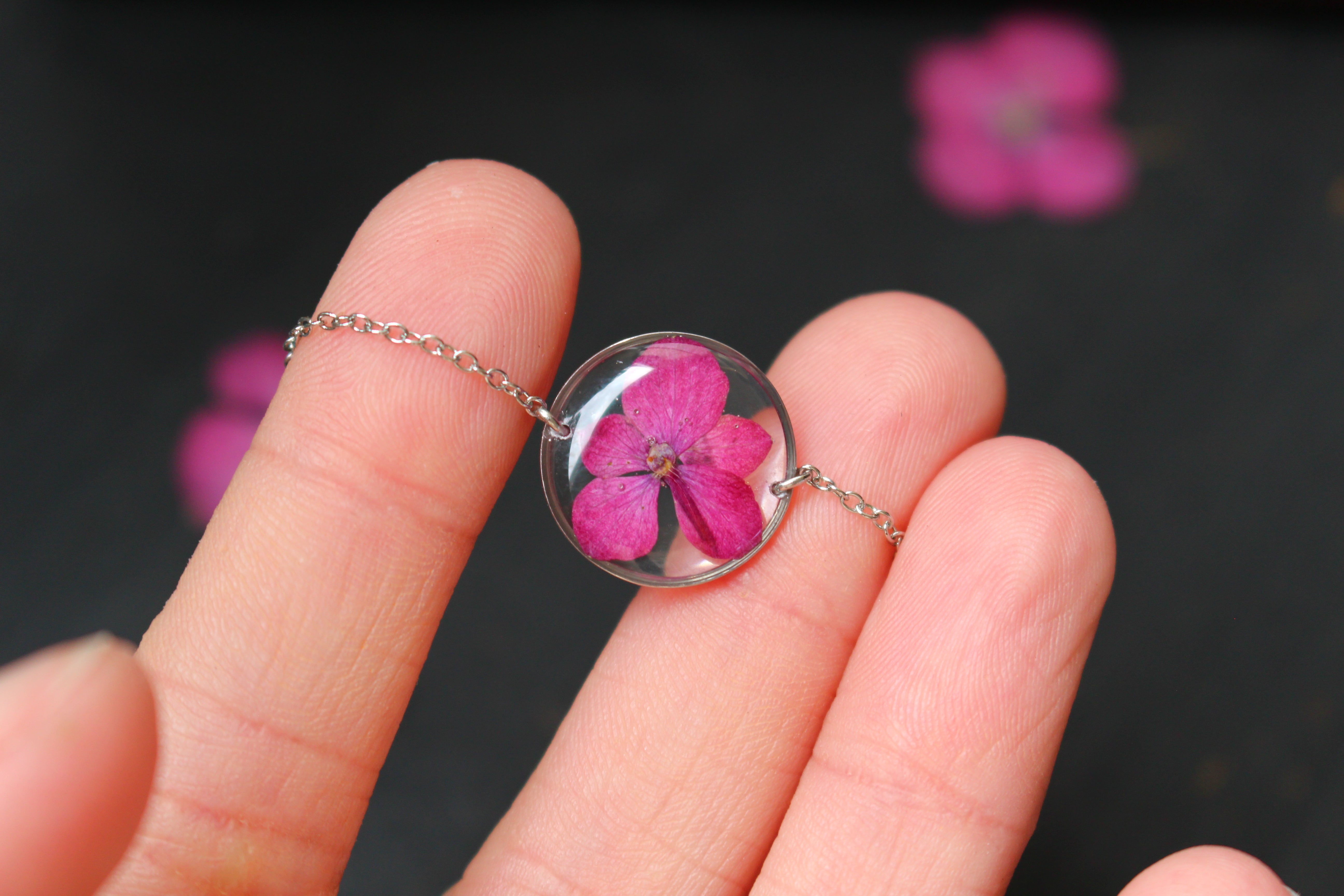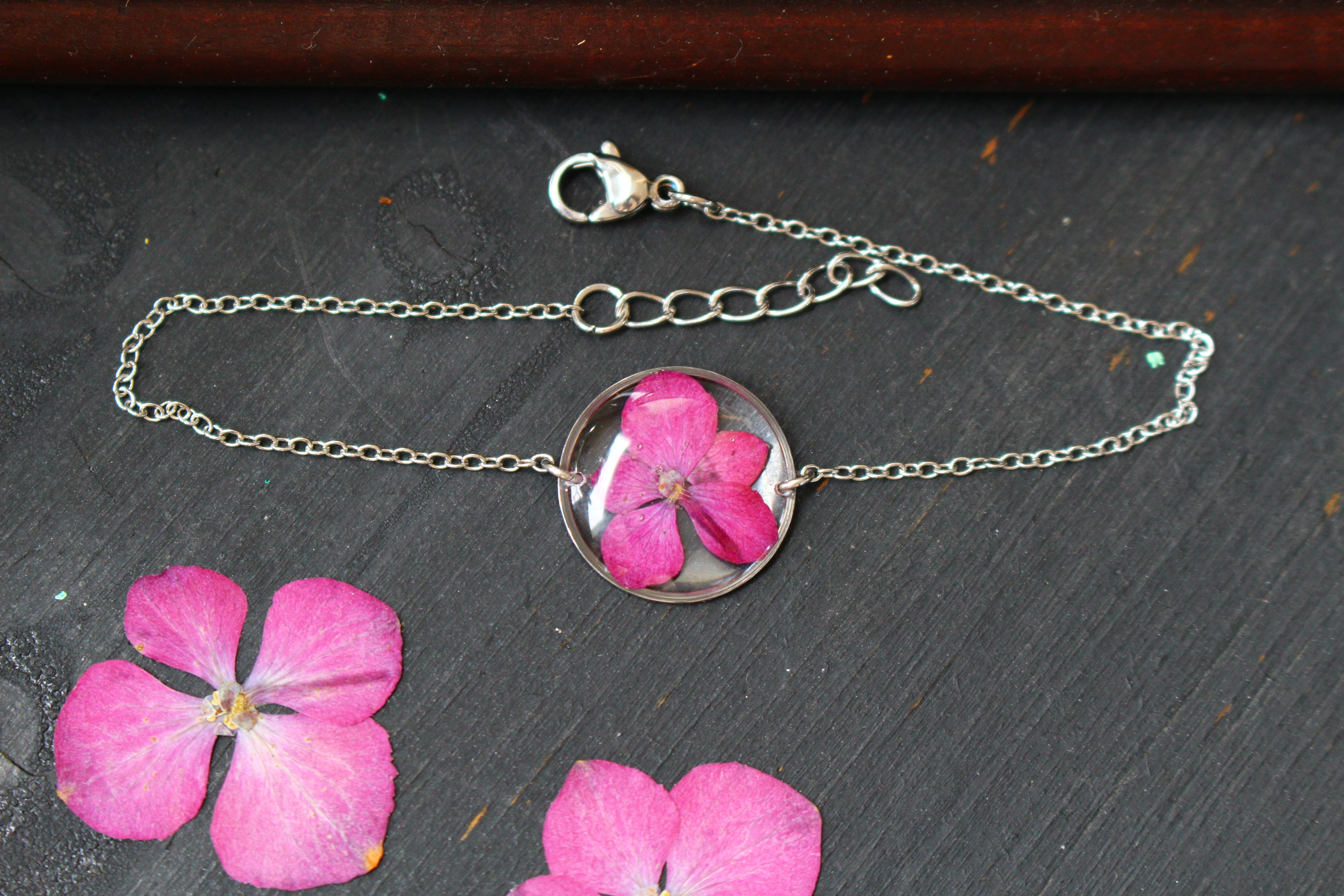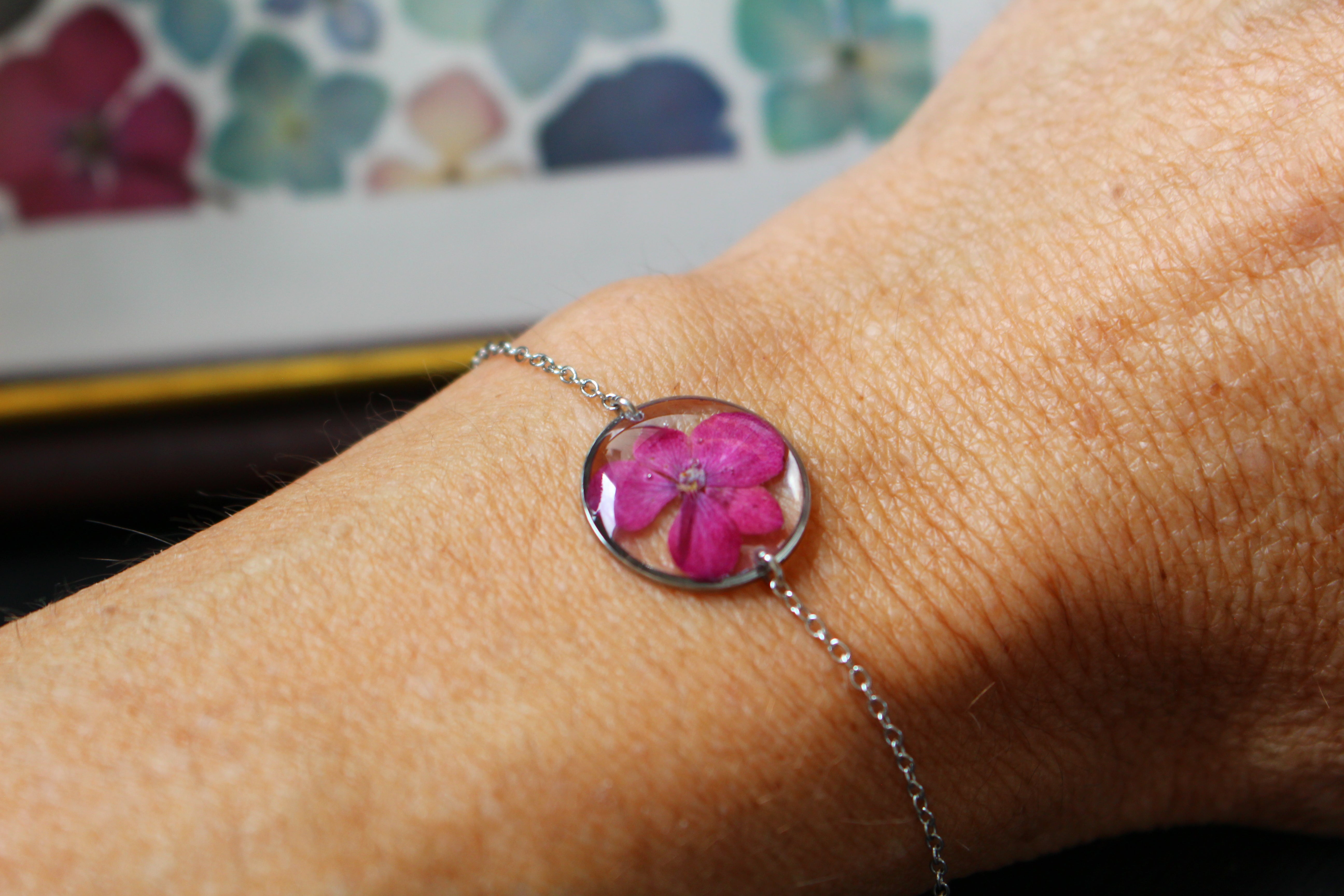 Bracelet composed of a hexagonal medallion filled with resin in which I encrusted a hydrangea flower