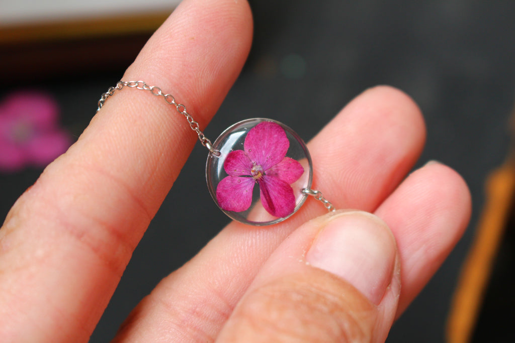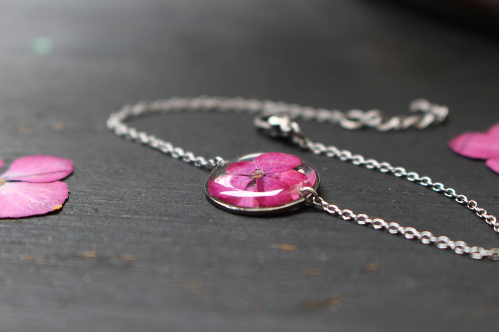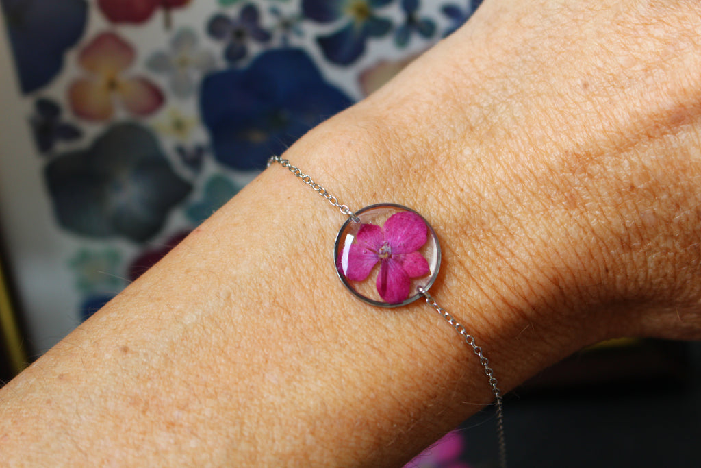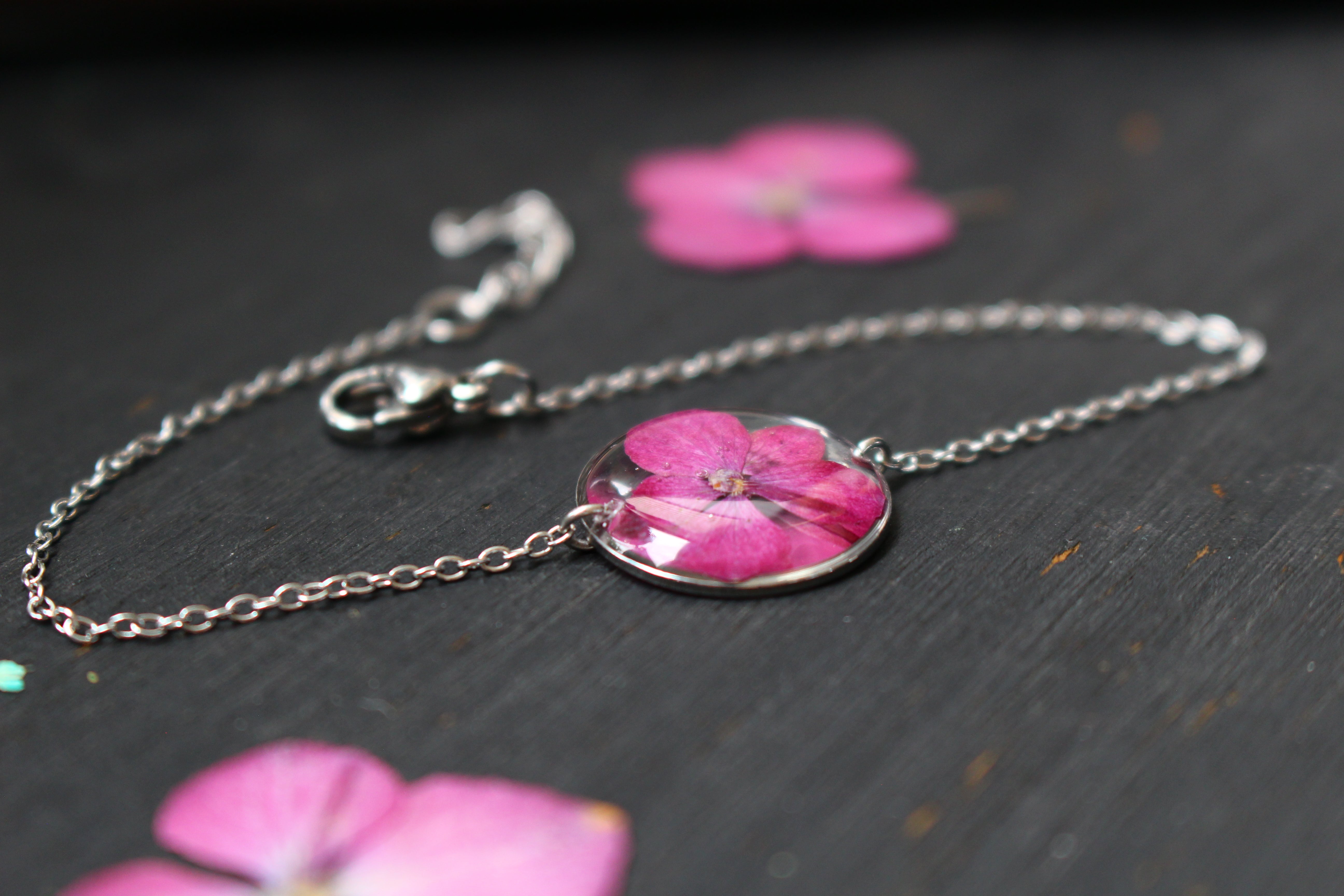 Bracelet composed of a hexagonal medallion filled with resin in which I encrusted a hydrangea flower