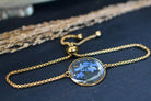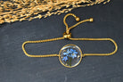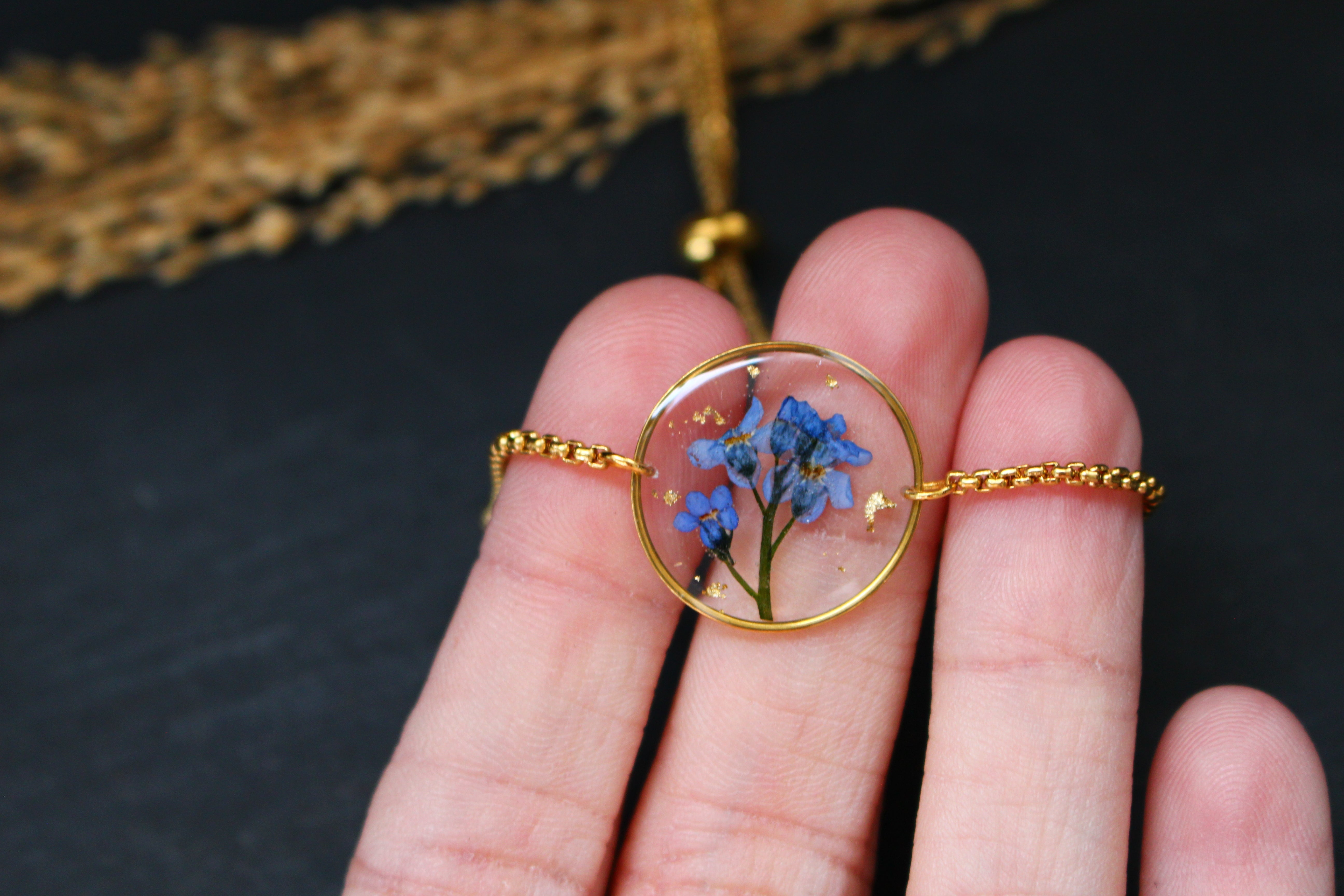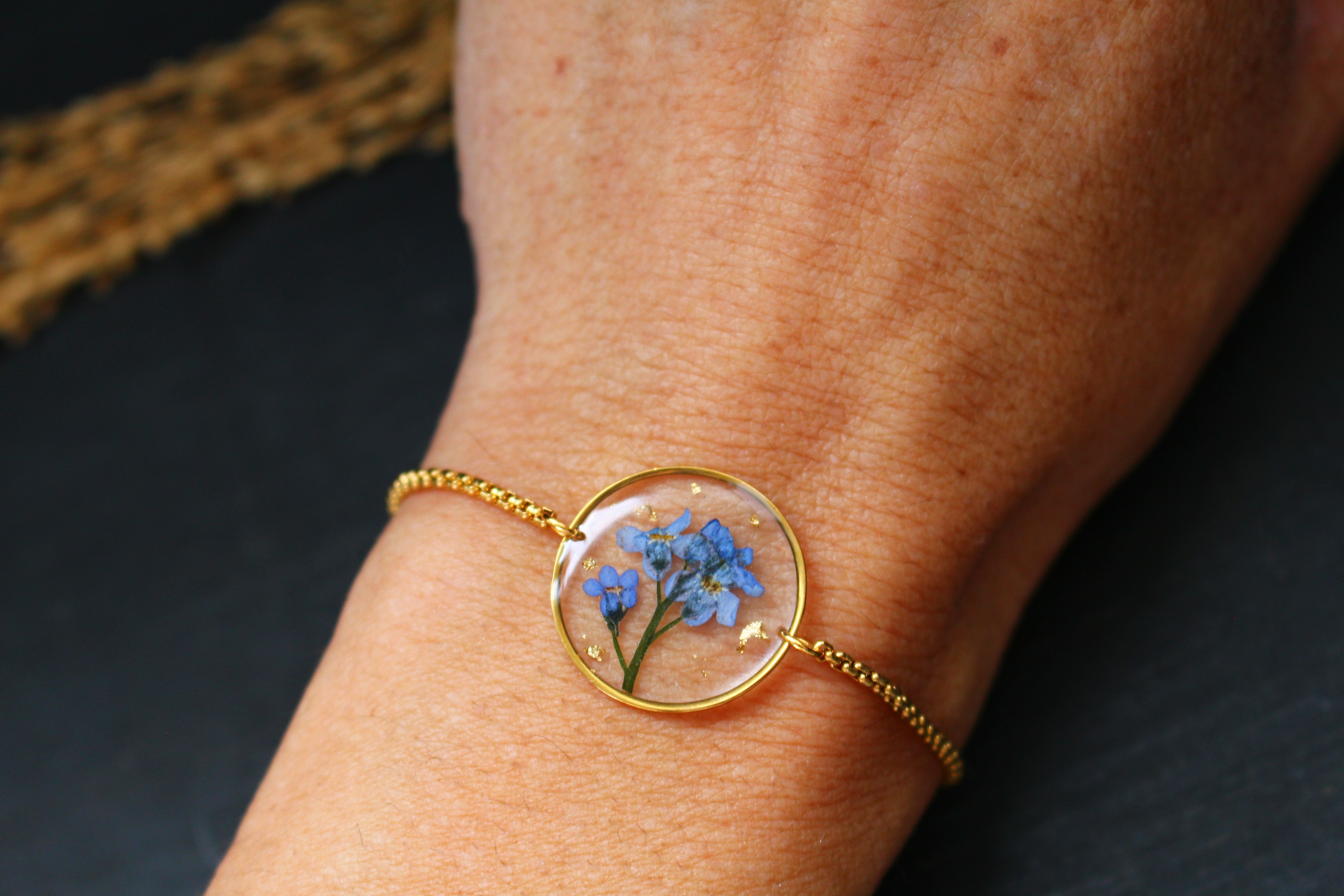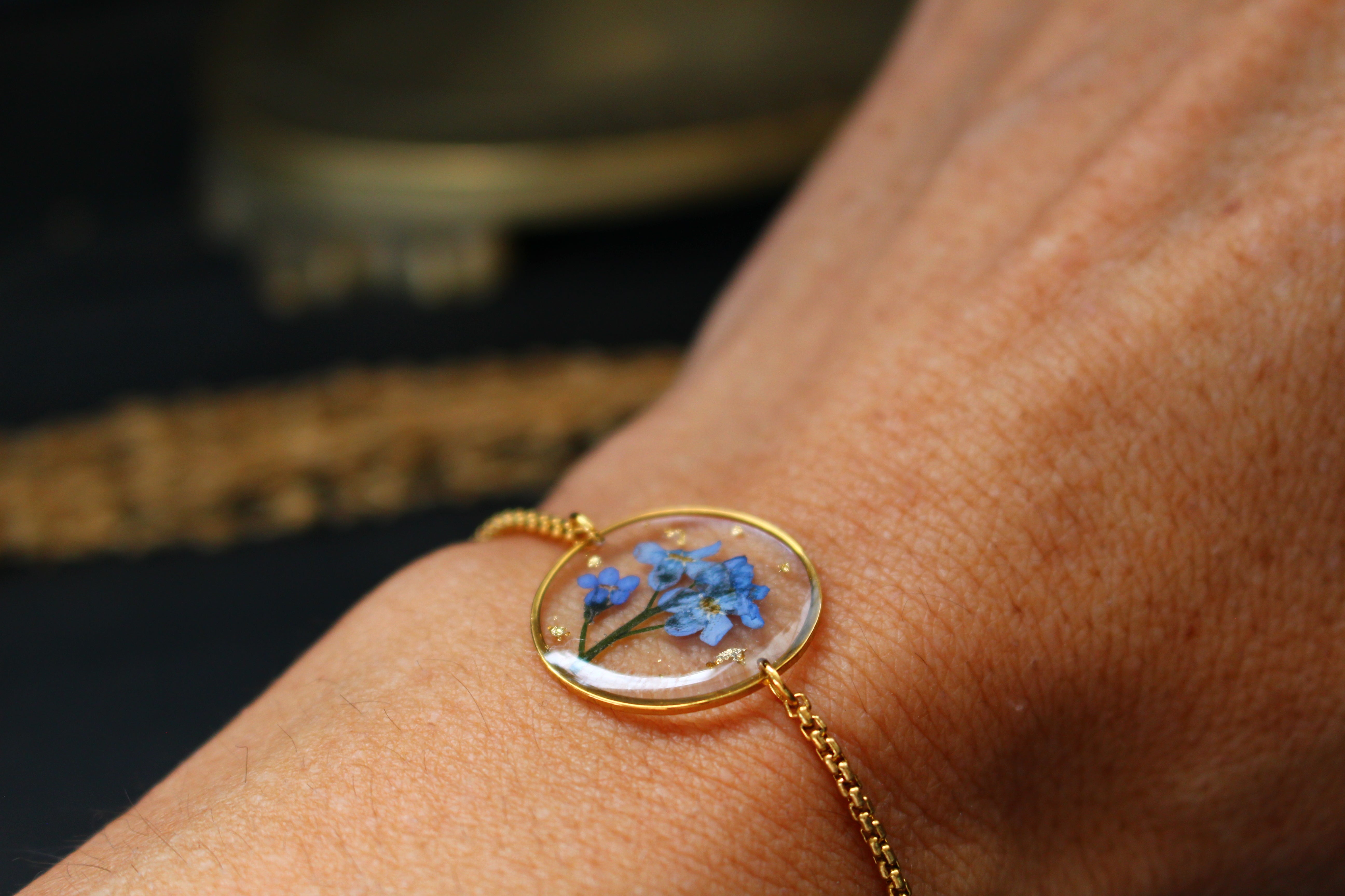 Bracelet composed of a 19mm diameter medallion filled with resin in which I have embedded small forget-me-not flowers.
