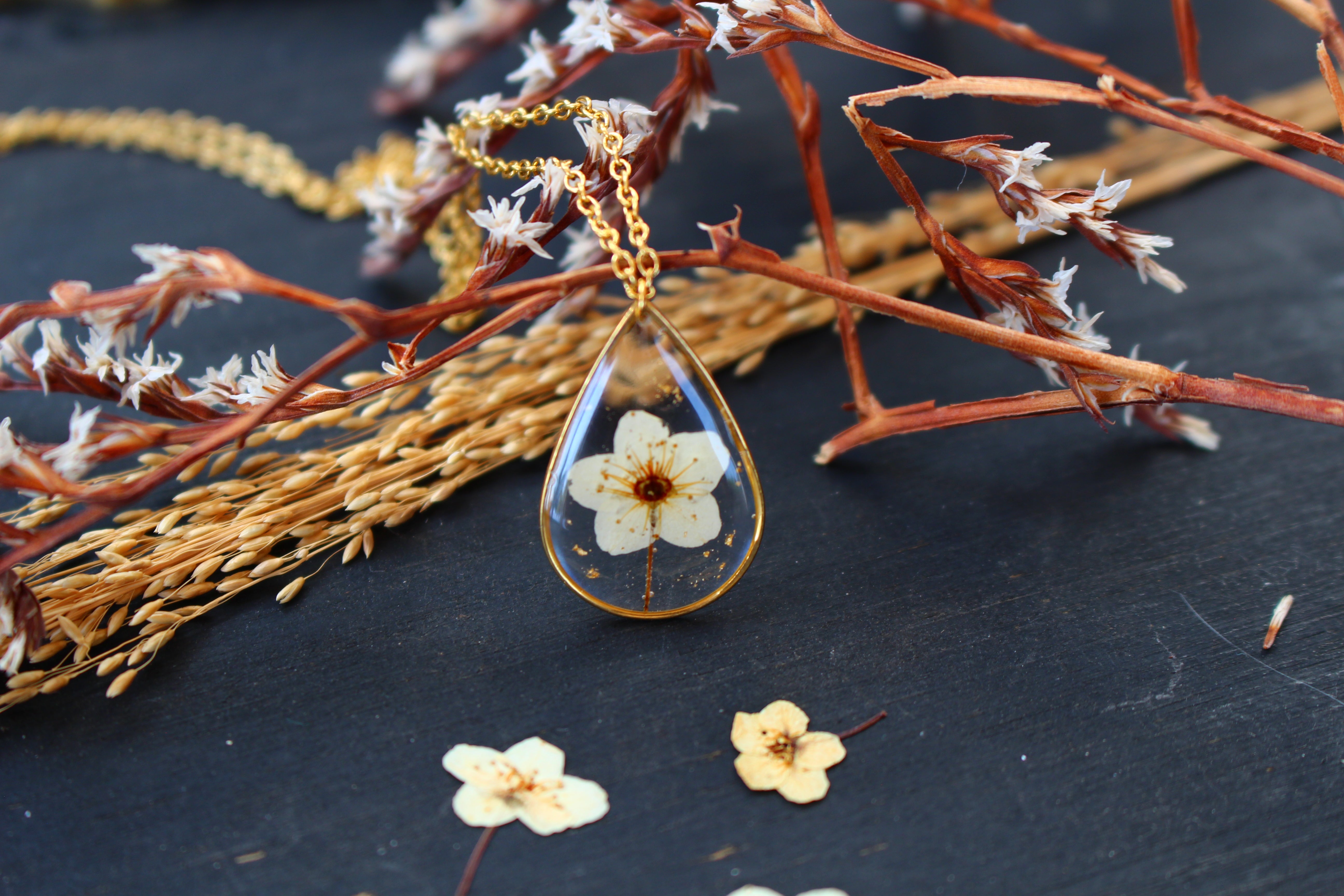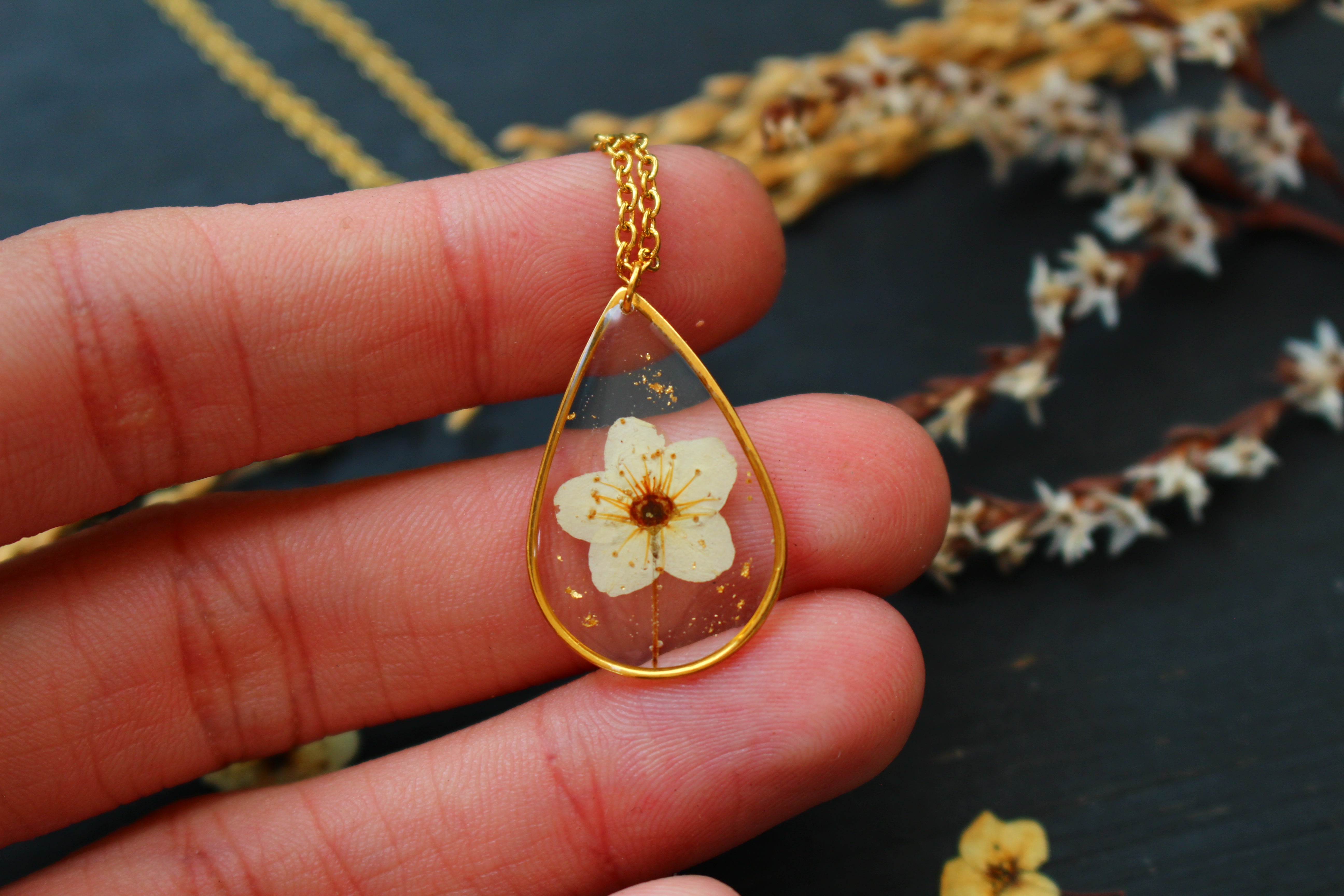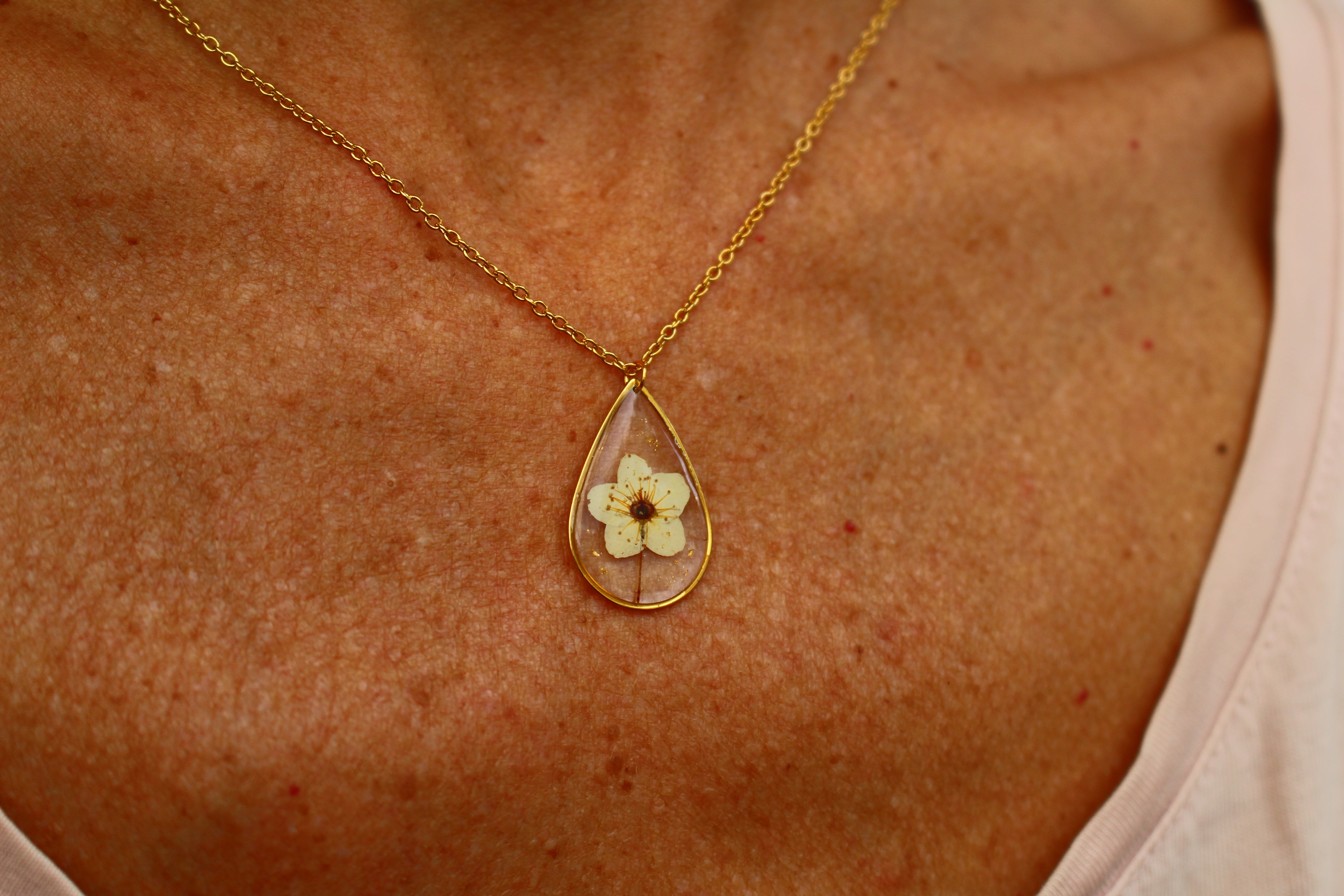 Necklace composed of a medallion in the shape of a drop filled with resin in which I have embedded a small spirea flower and some gold leaves.