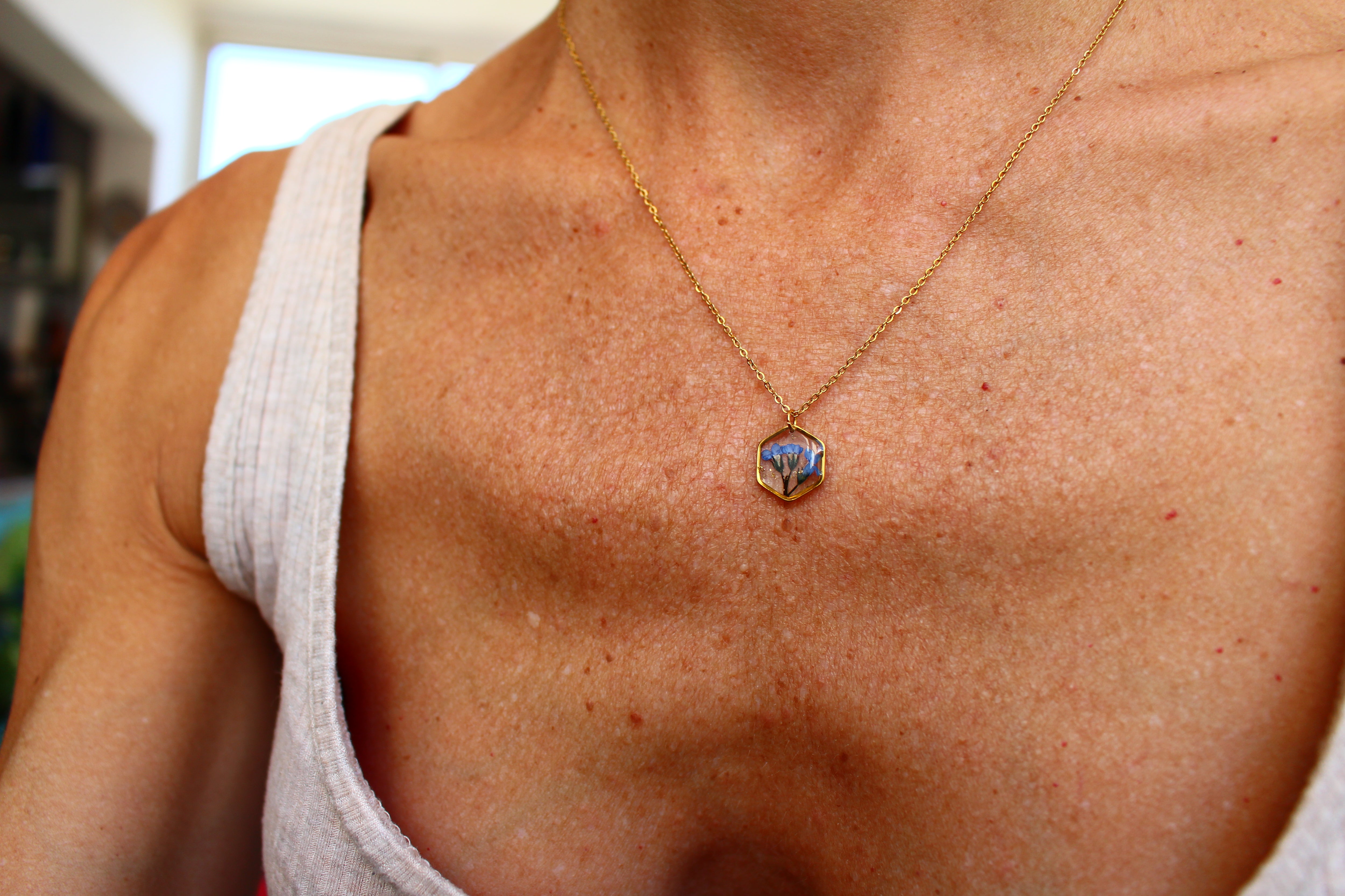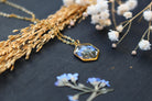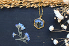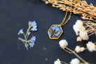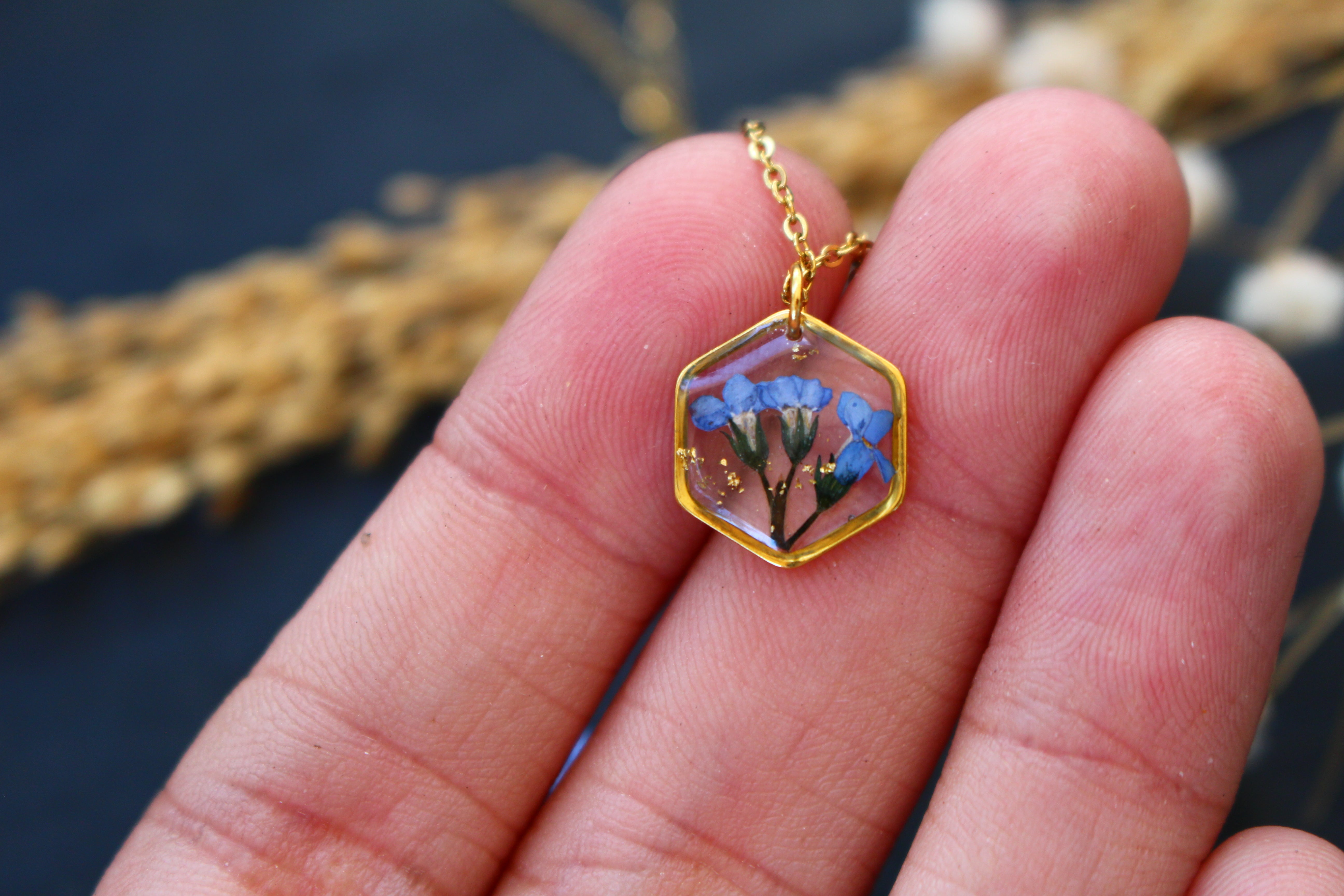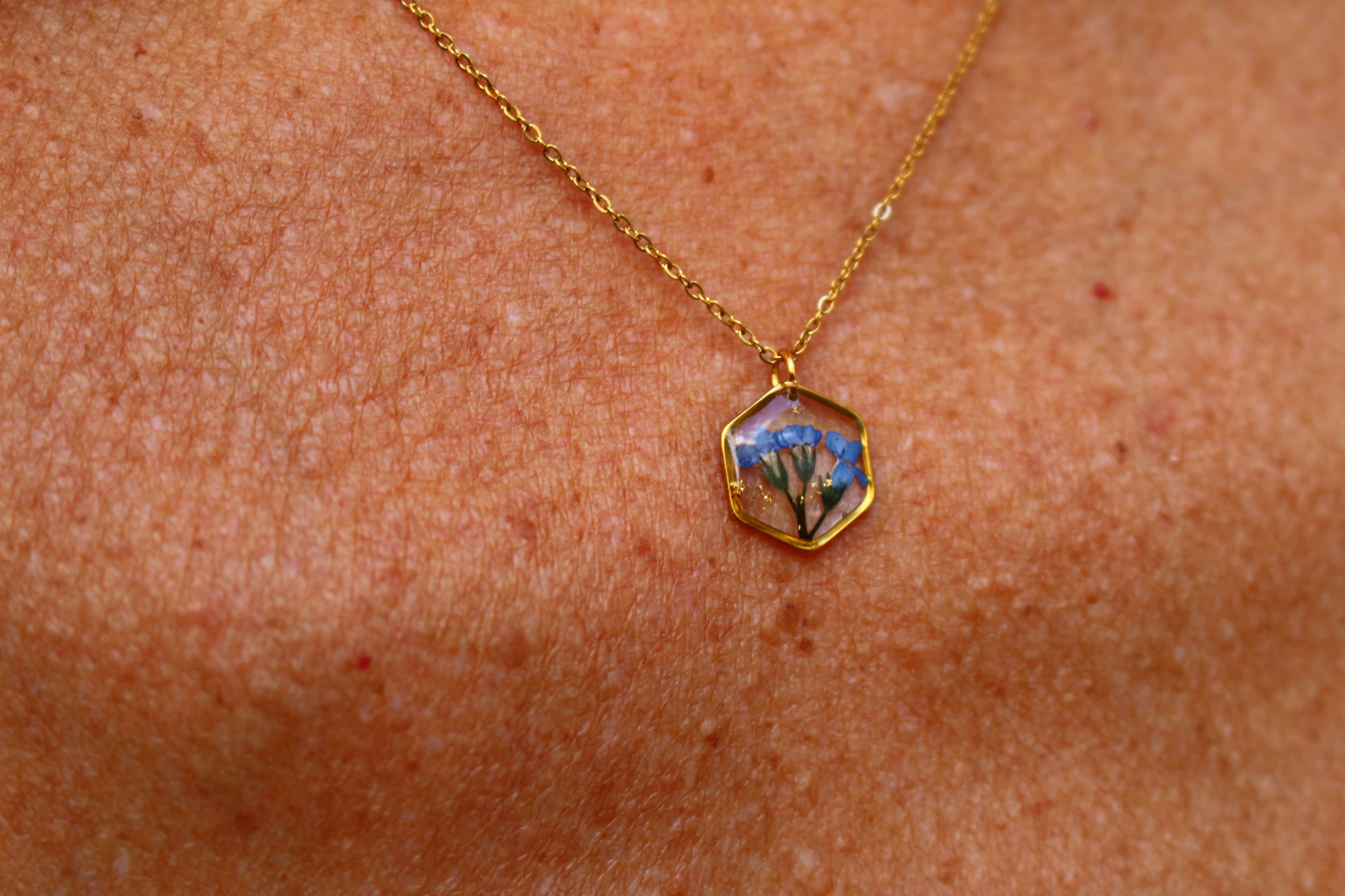 Necklace composed of a hexagonal medallion filled with resin in which I have embedded small forget-me-not flowers and a few particles of gold leaf.