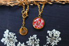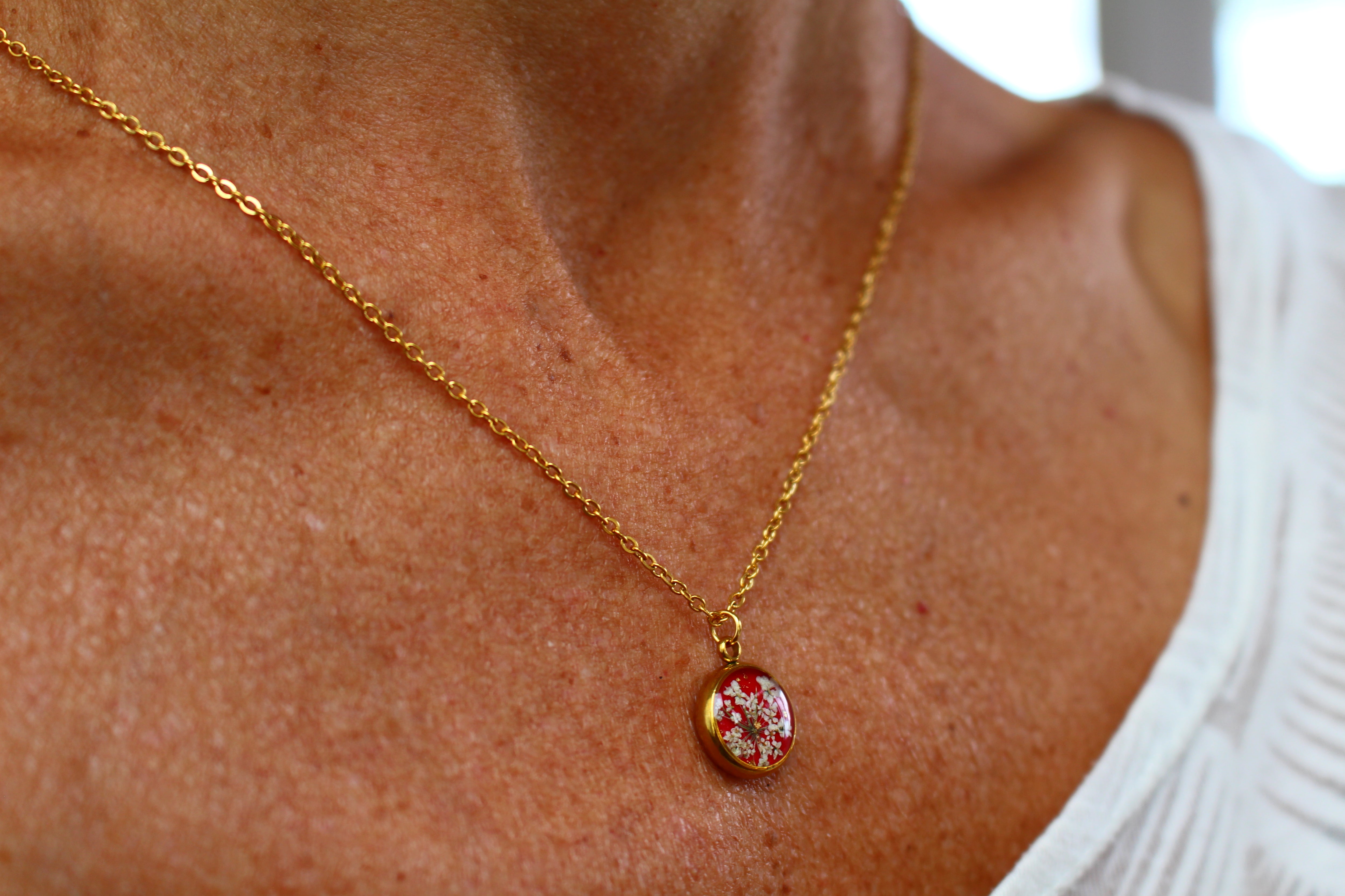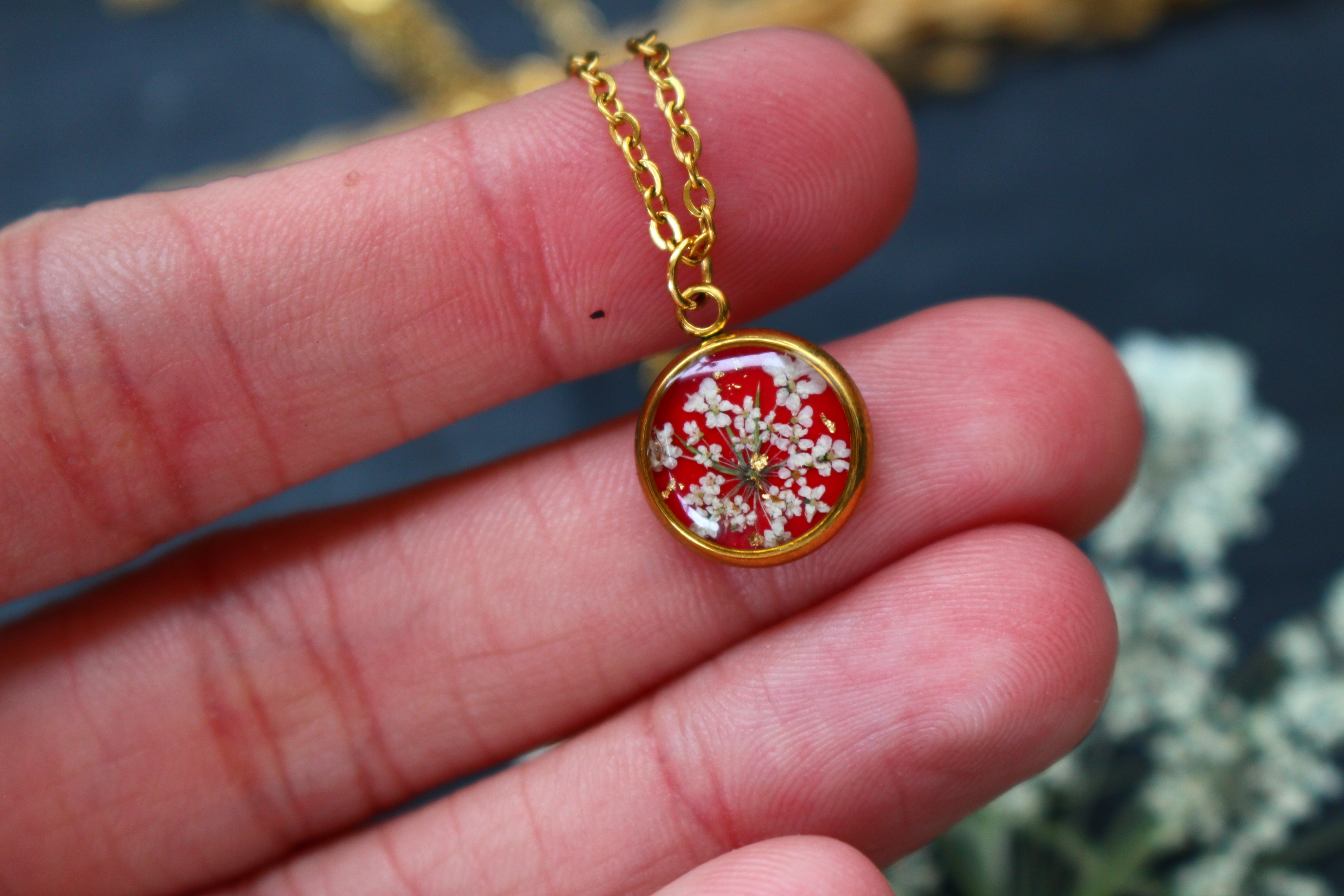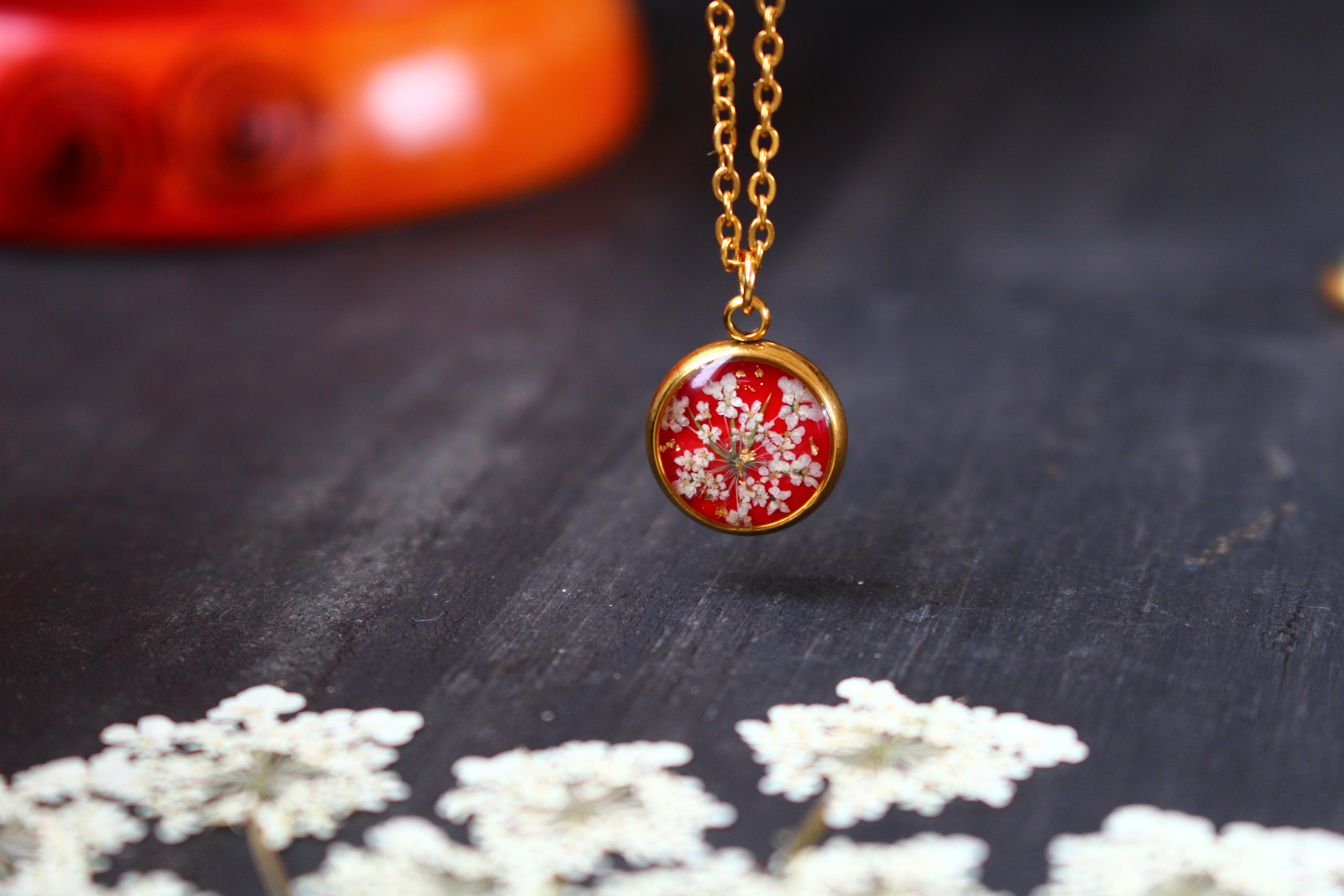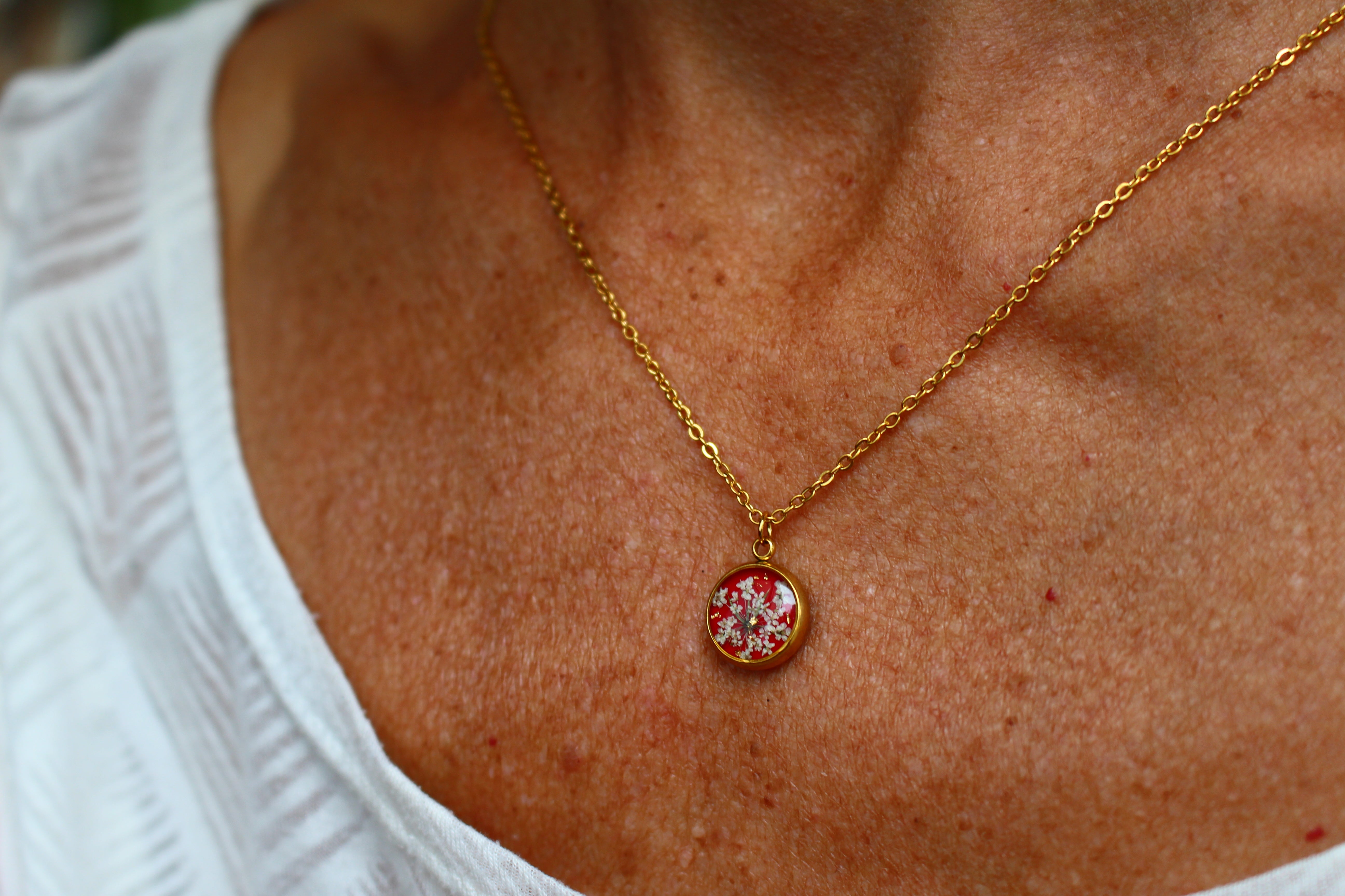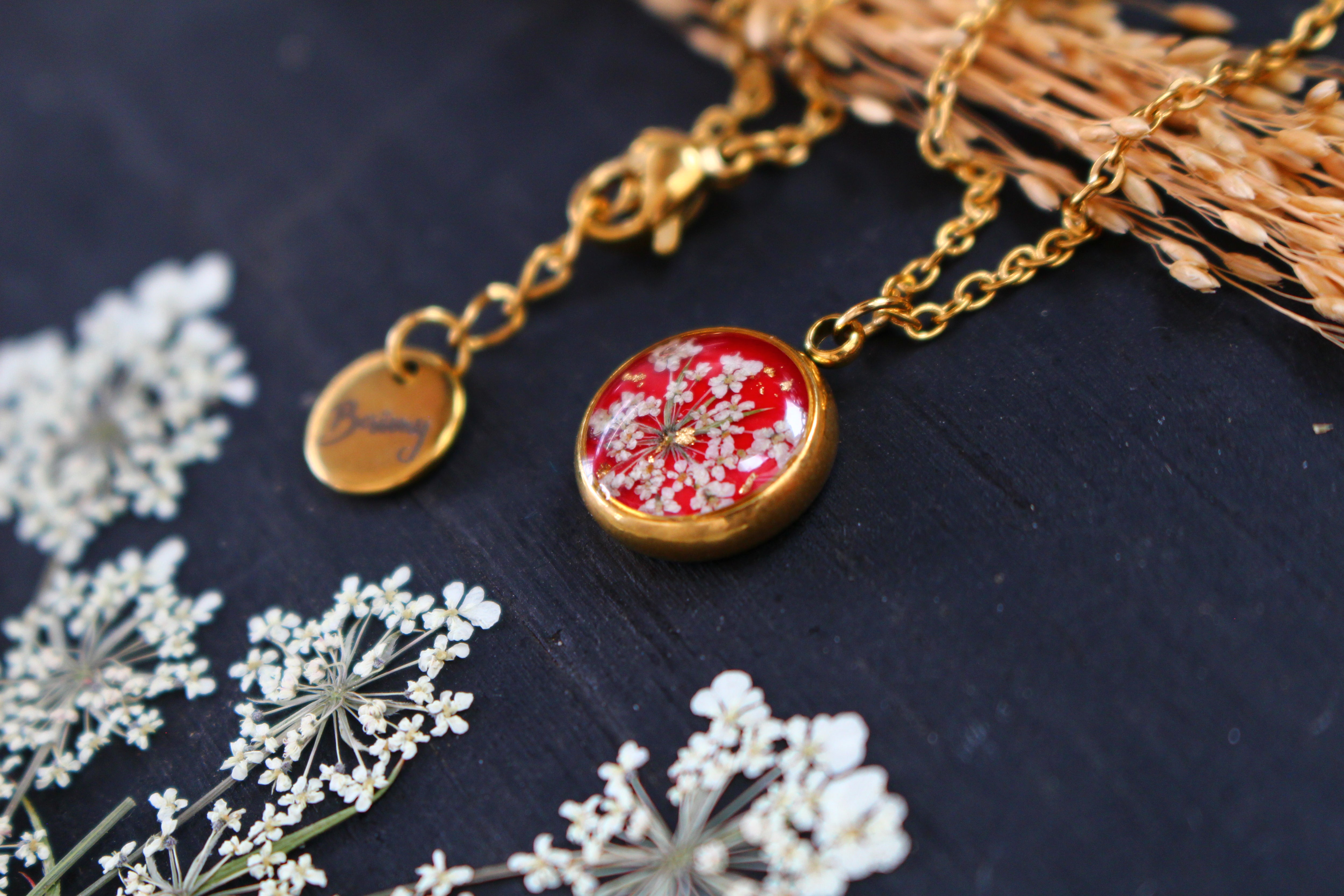 Necklace composed of a 12mm diameter medallion in which I have encrusted in resin, small dried flowers called Queen Anne's lace on a red background, and some gold leaves.
