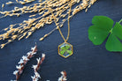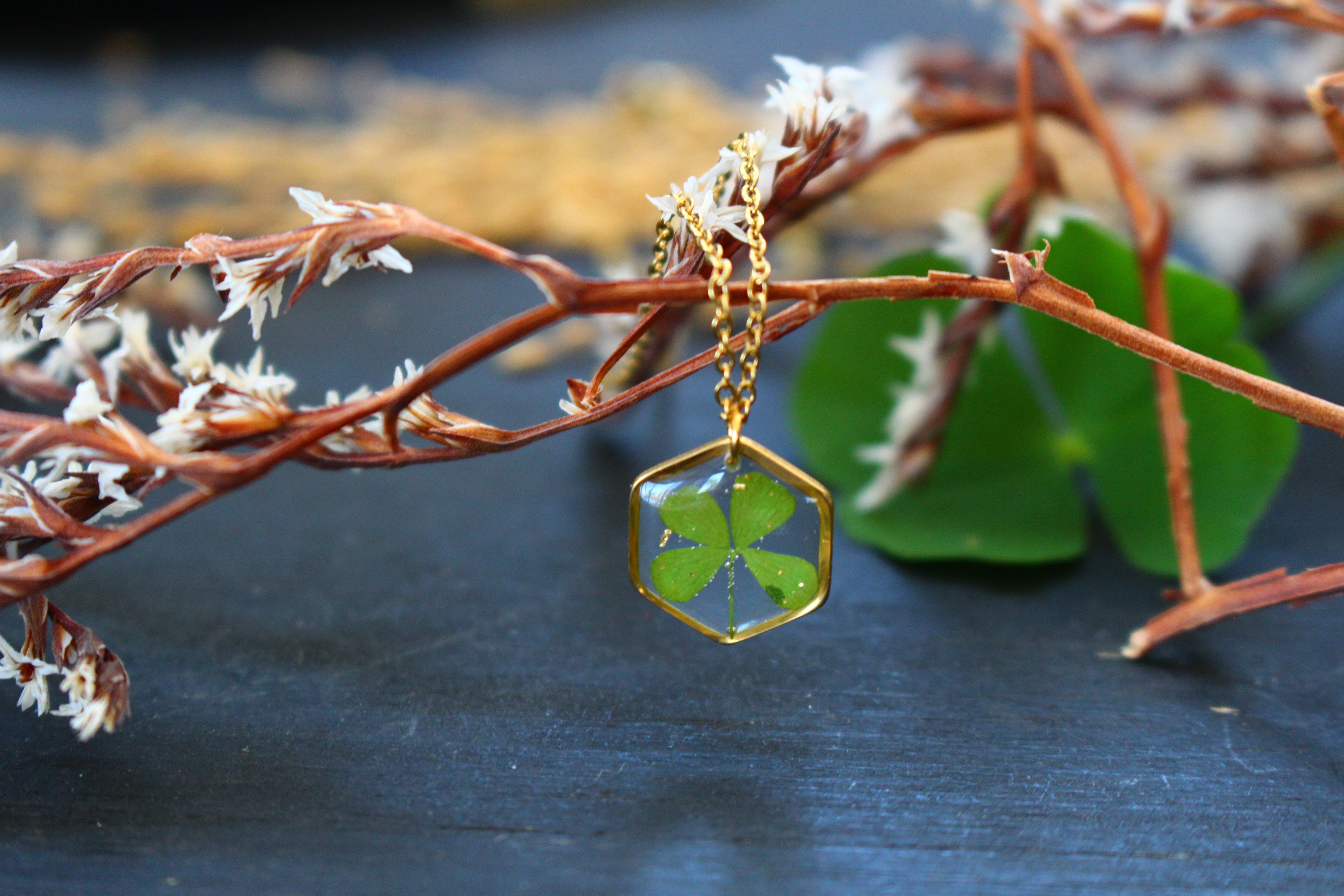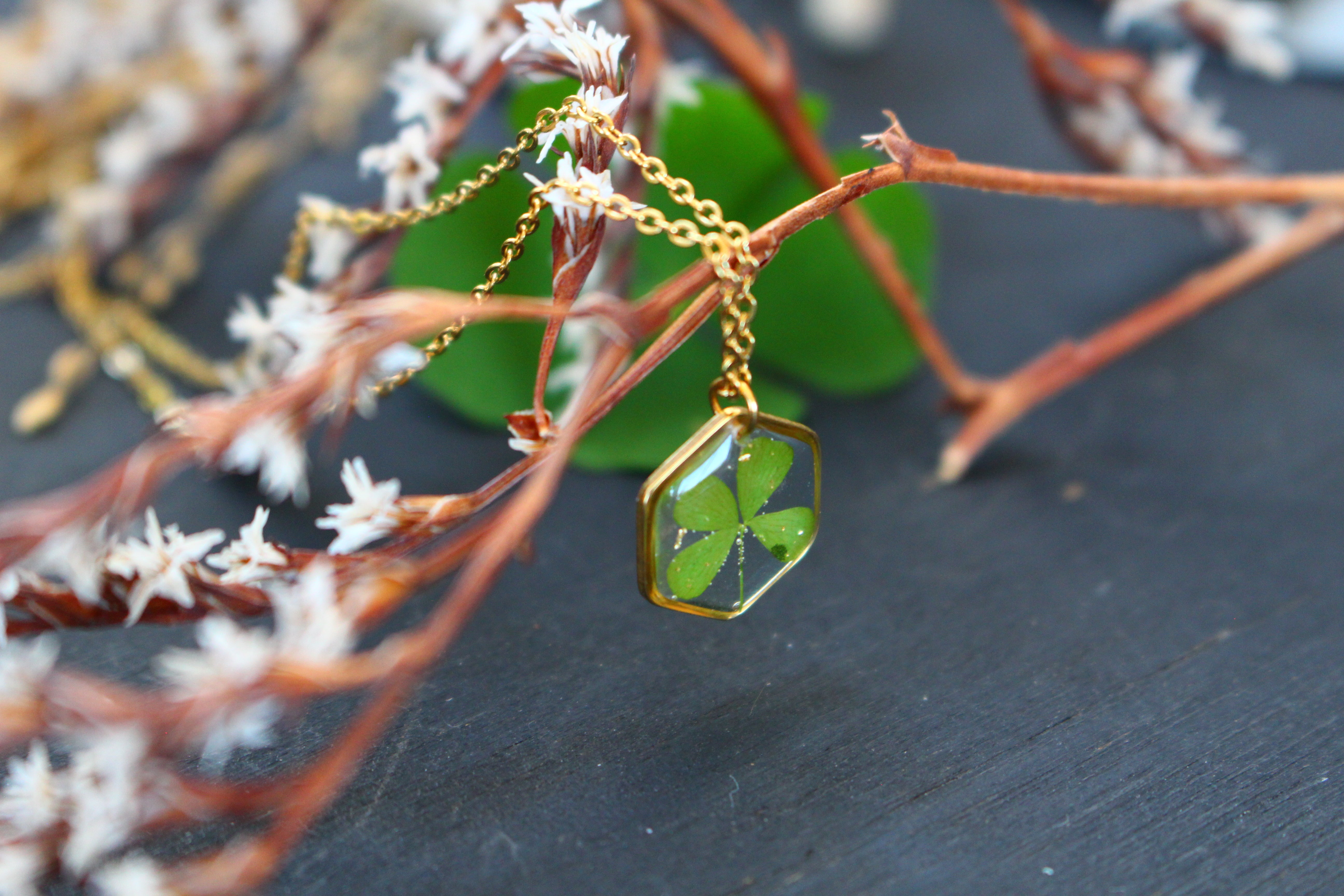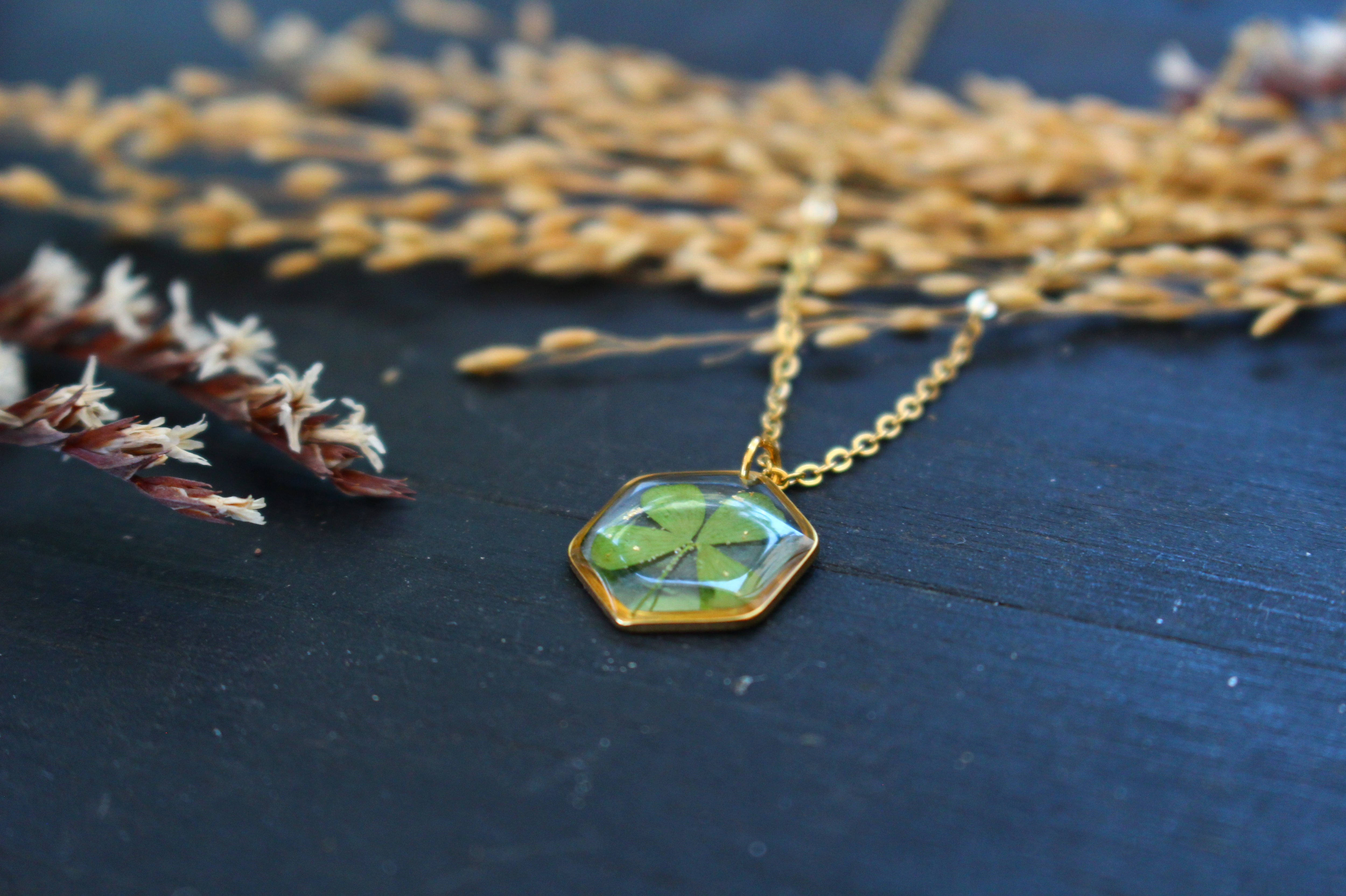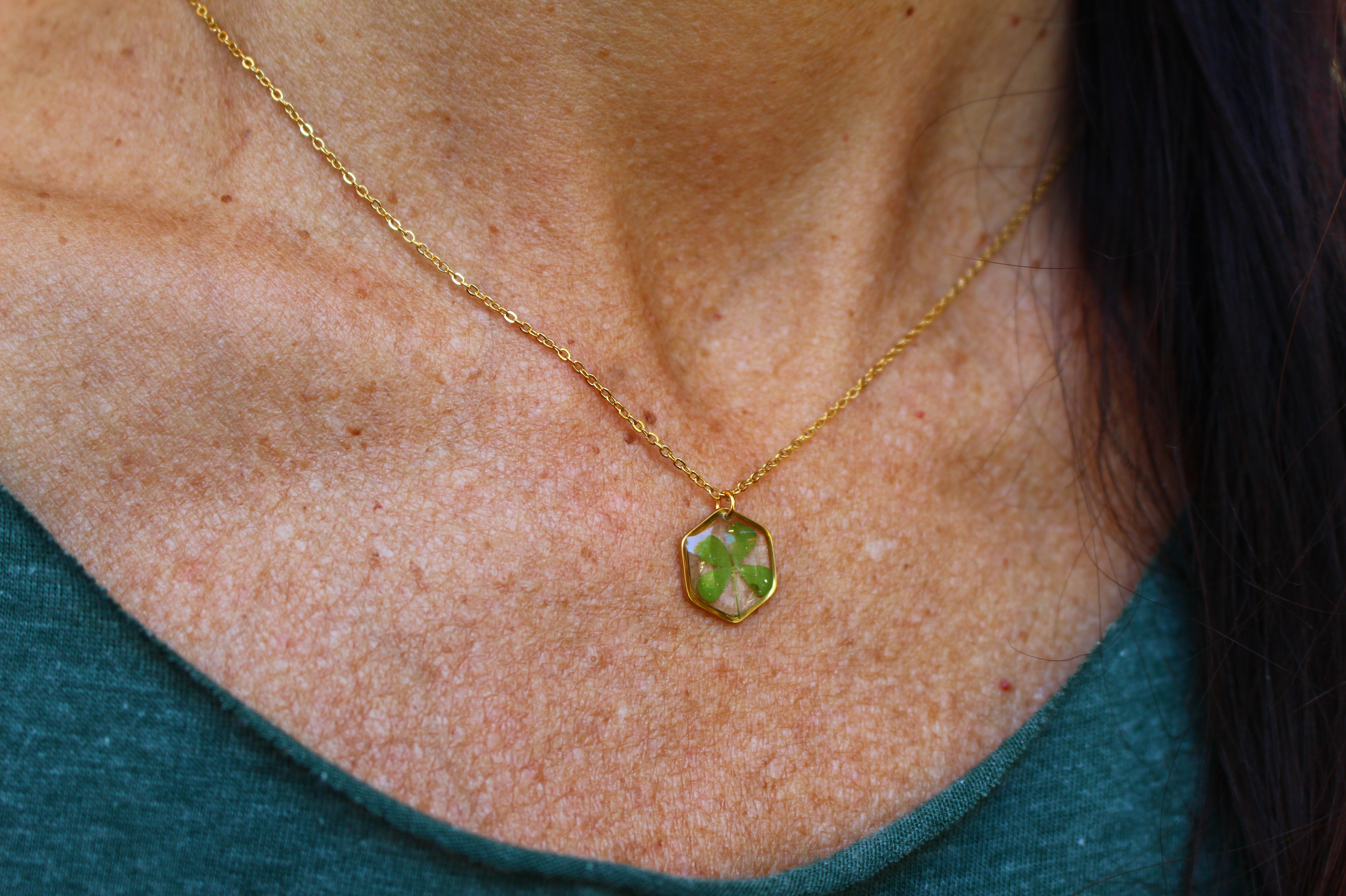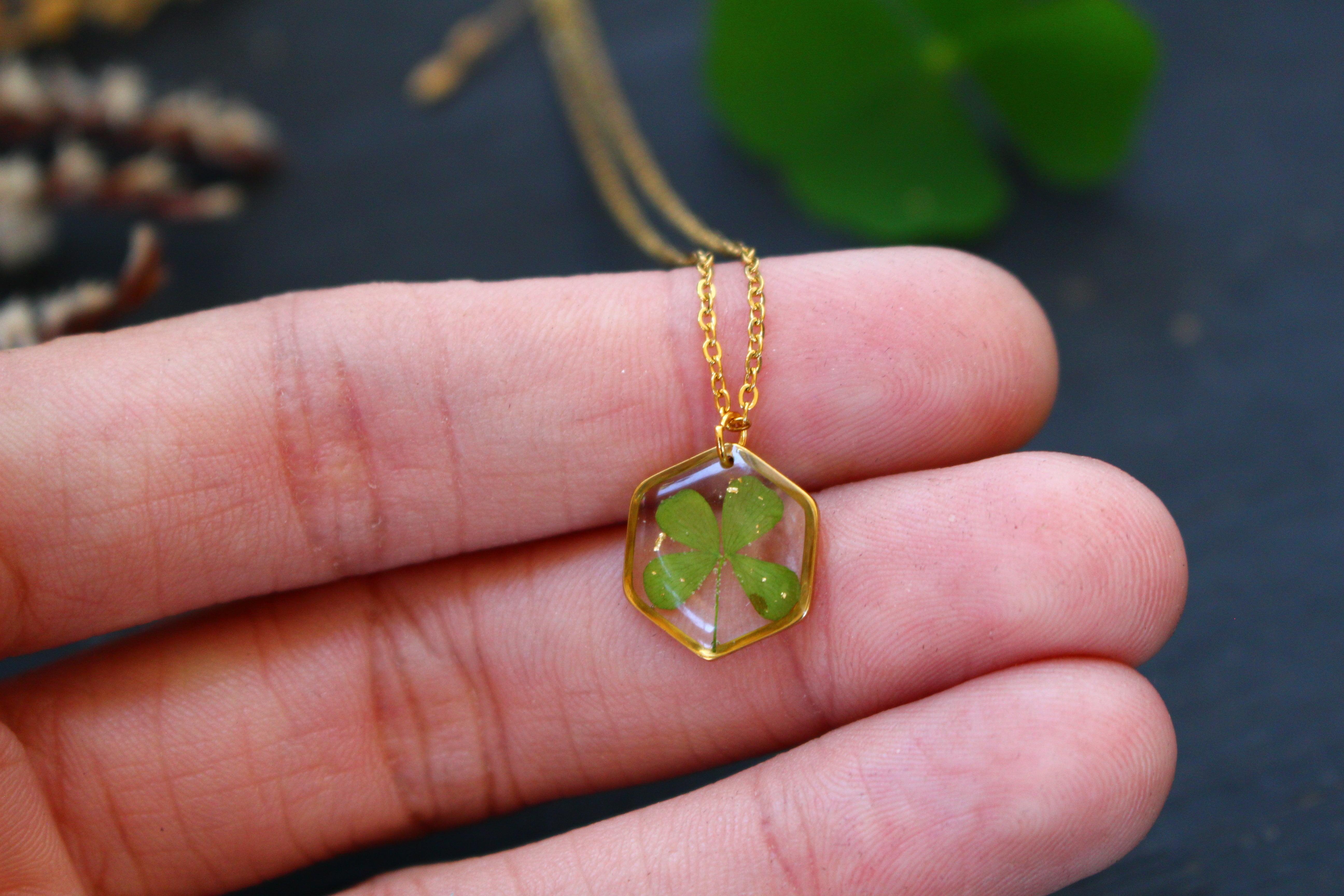 Necklace composed of a hexagonal medallion filled with resin in which I have embedded a 4-leaf clover from Saint leu on Reunion Island and a few pieces of gold leaf