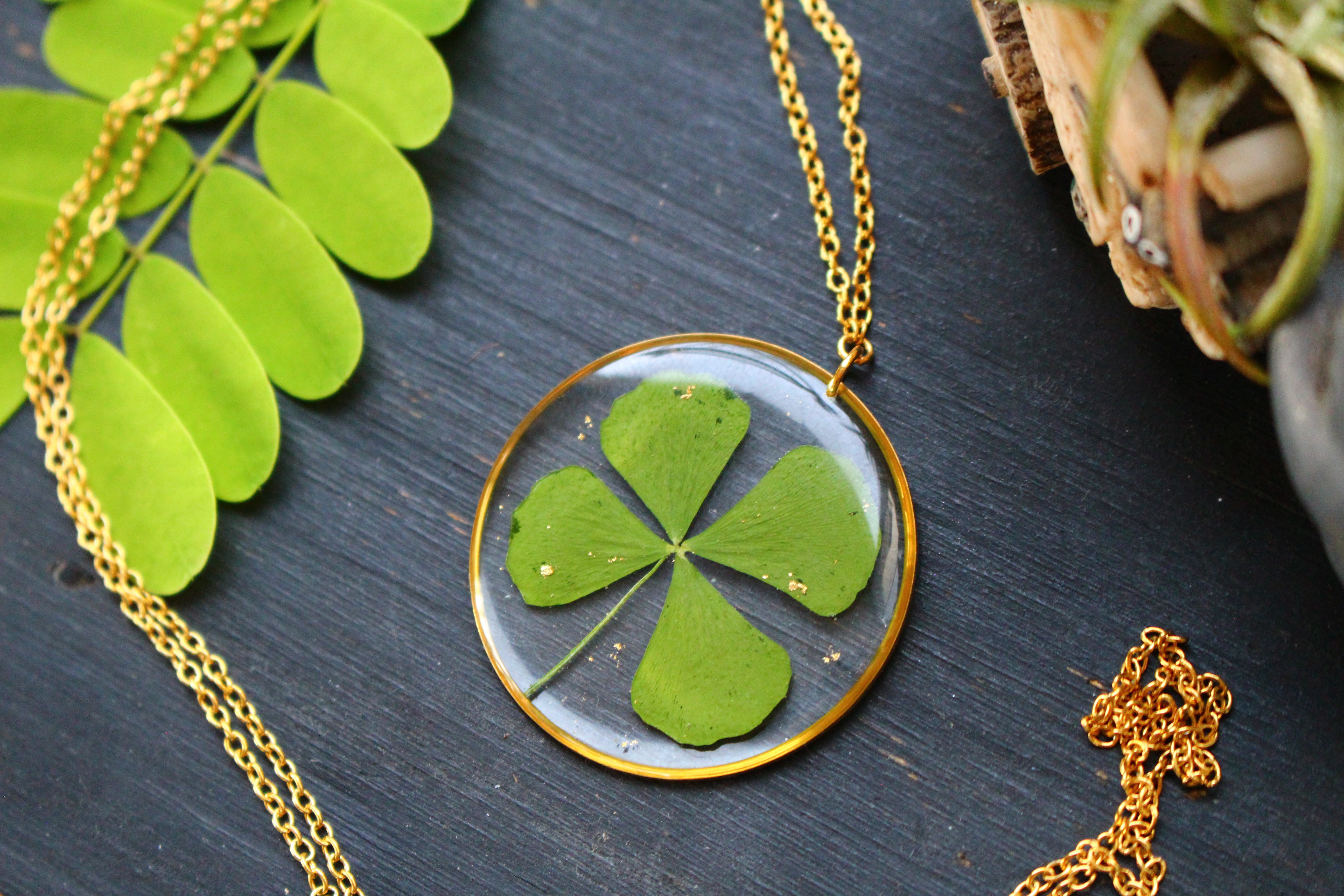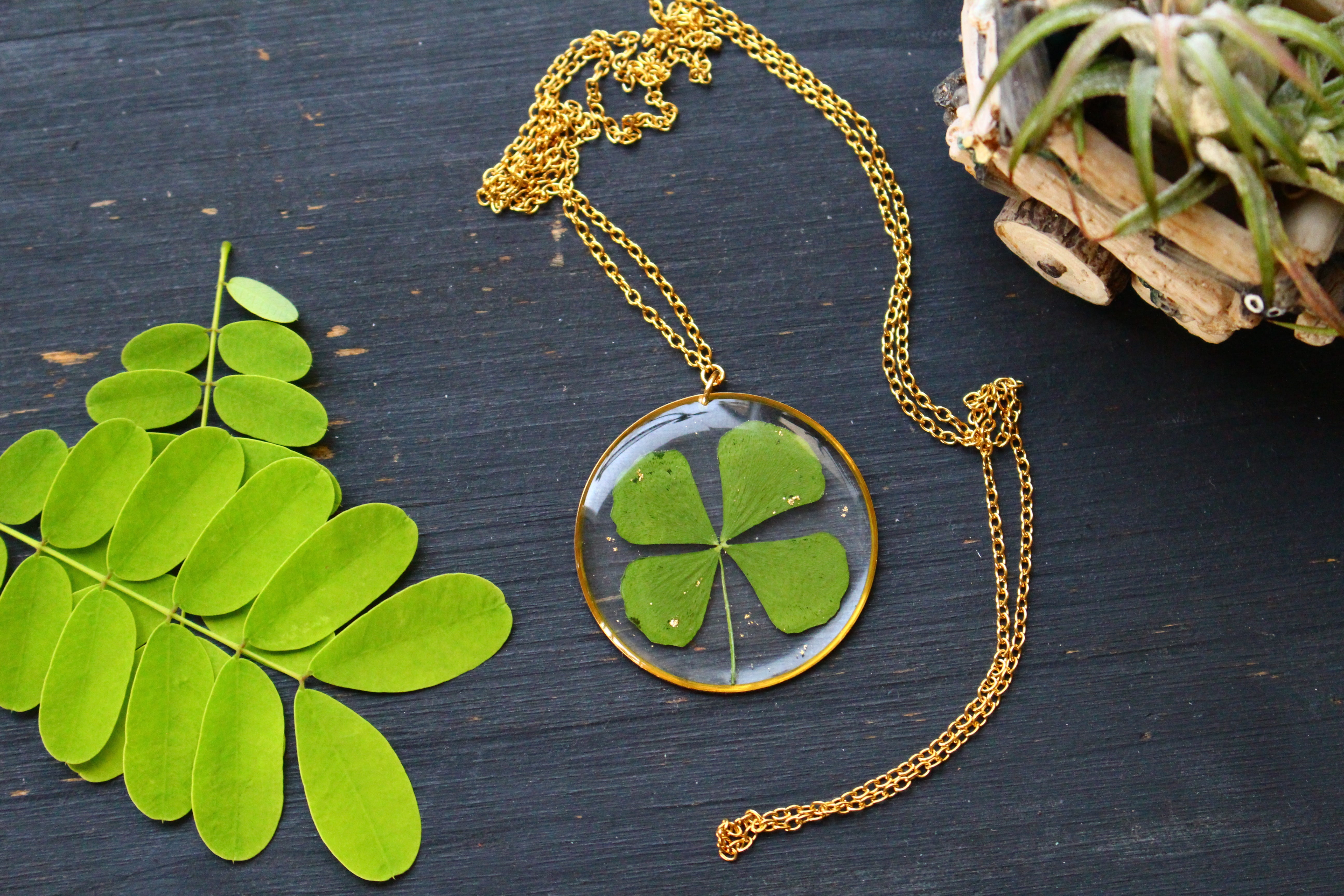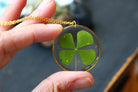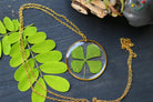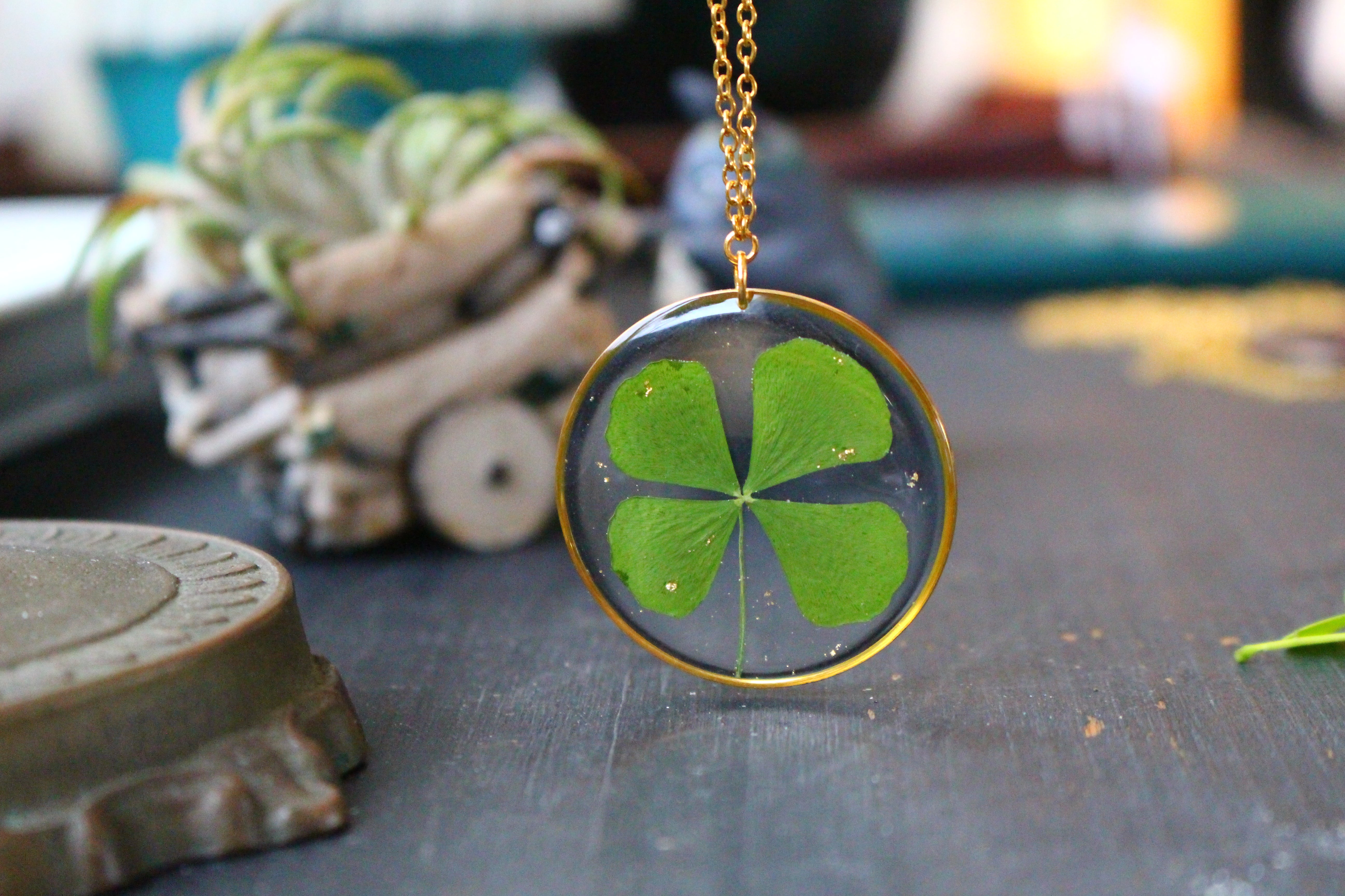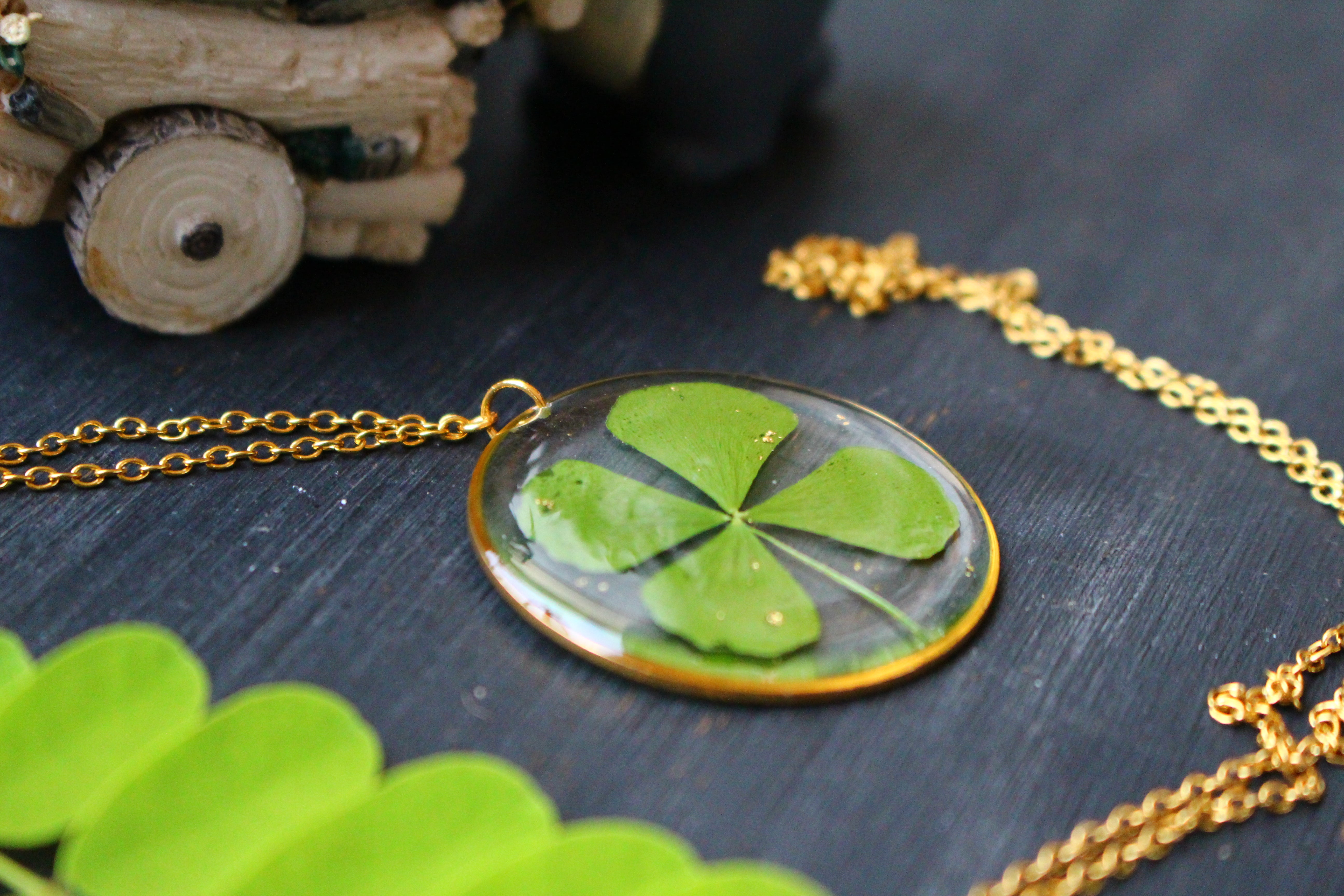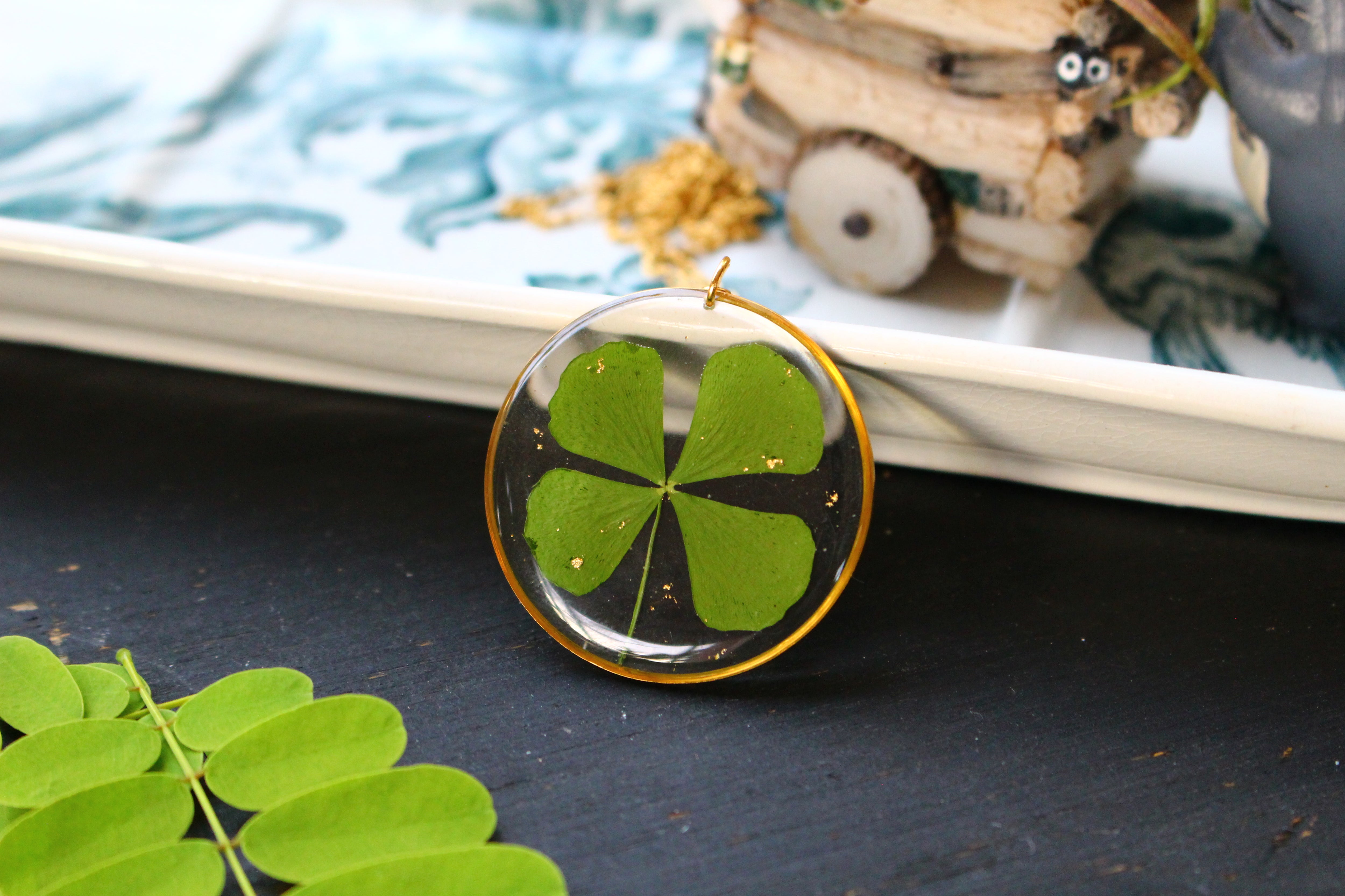 Necklace composed of a 30mm diameter medallion filled with resin in which I have embedded a 4-leaf clover from Saint leu on Reunion Island and a few pieces of gold leaf