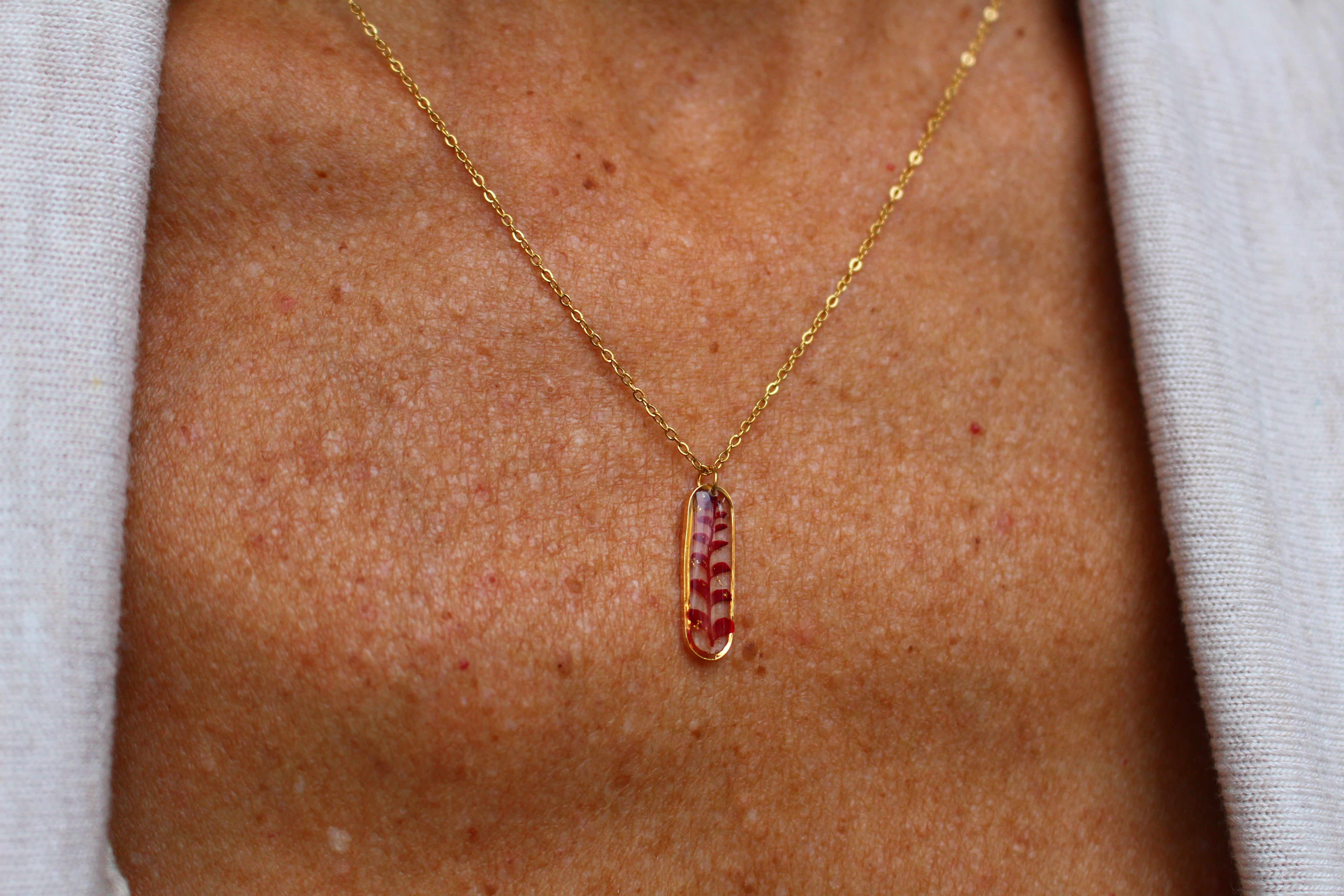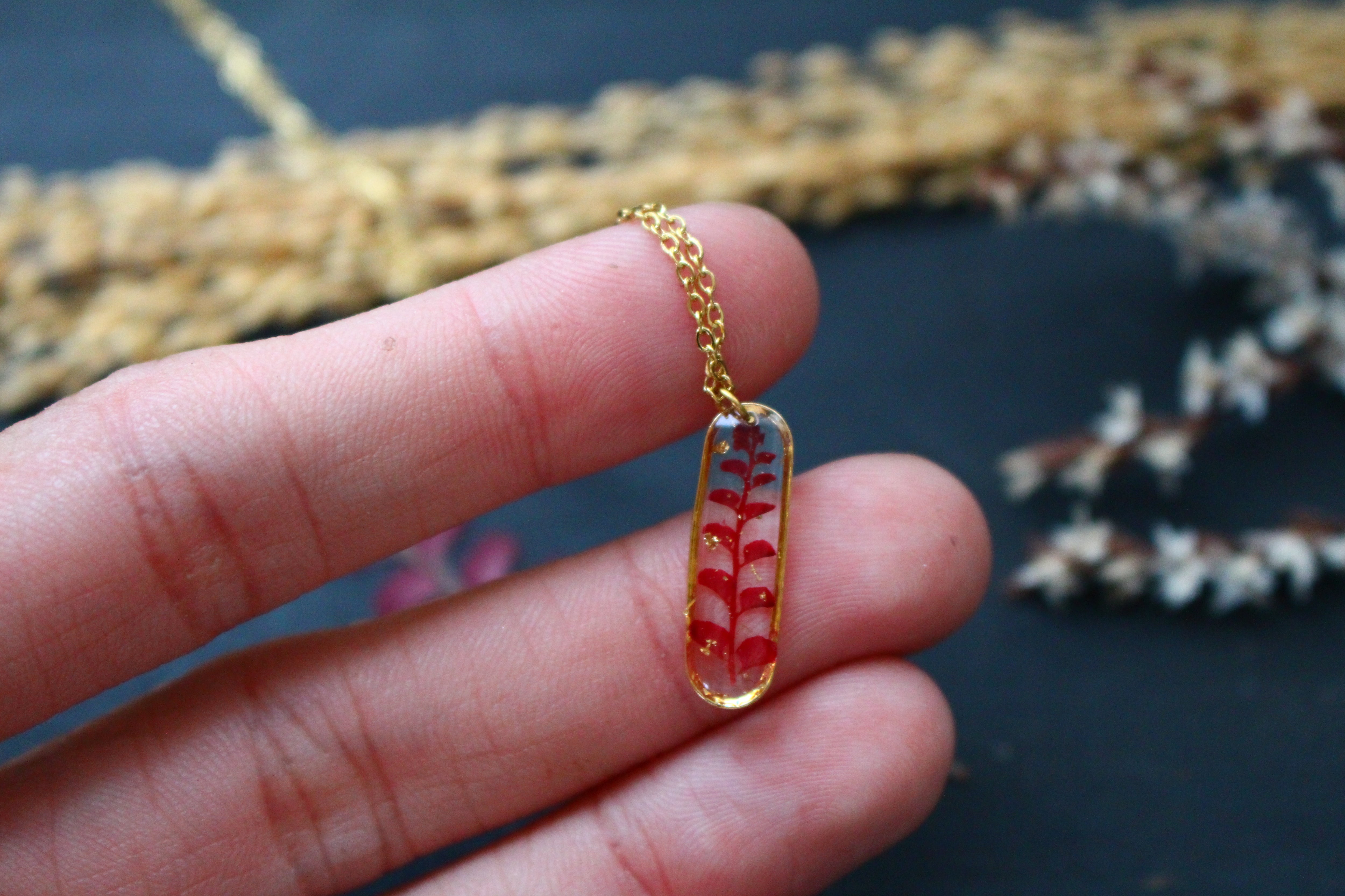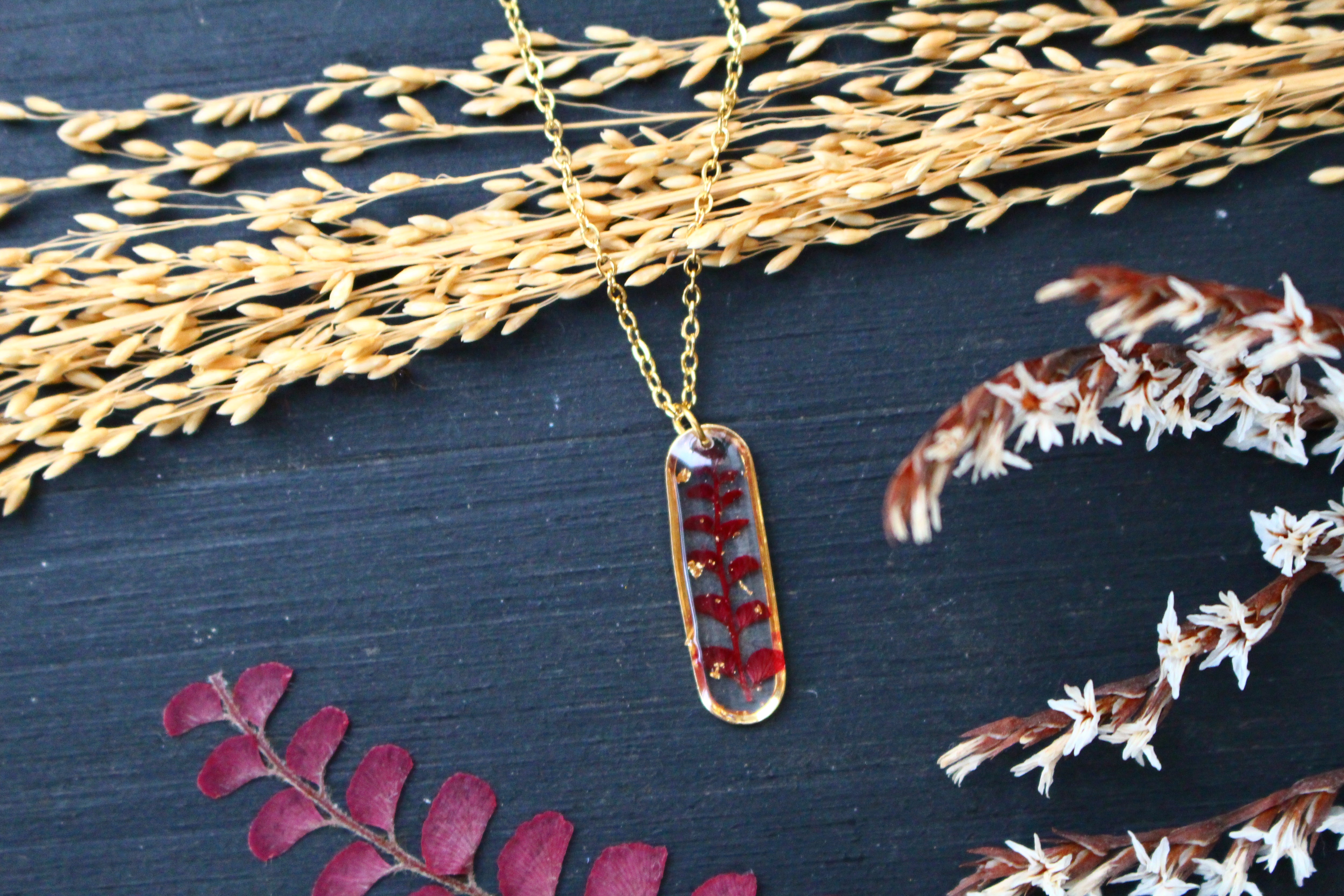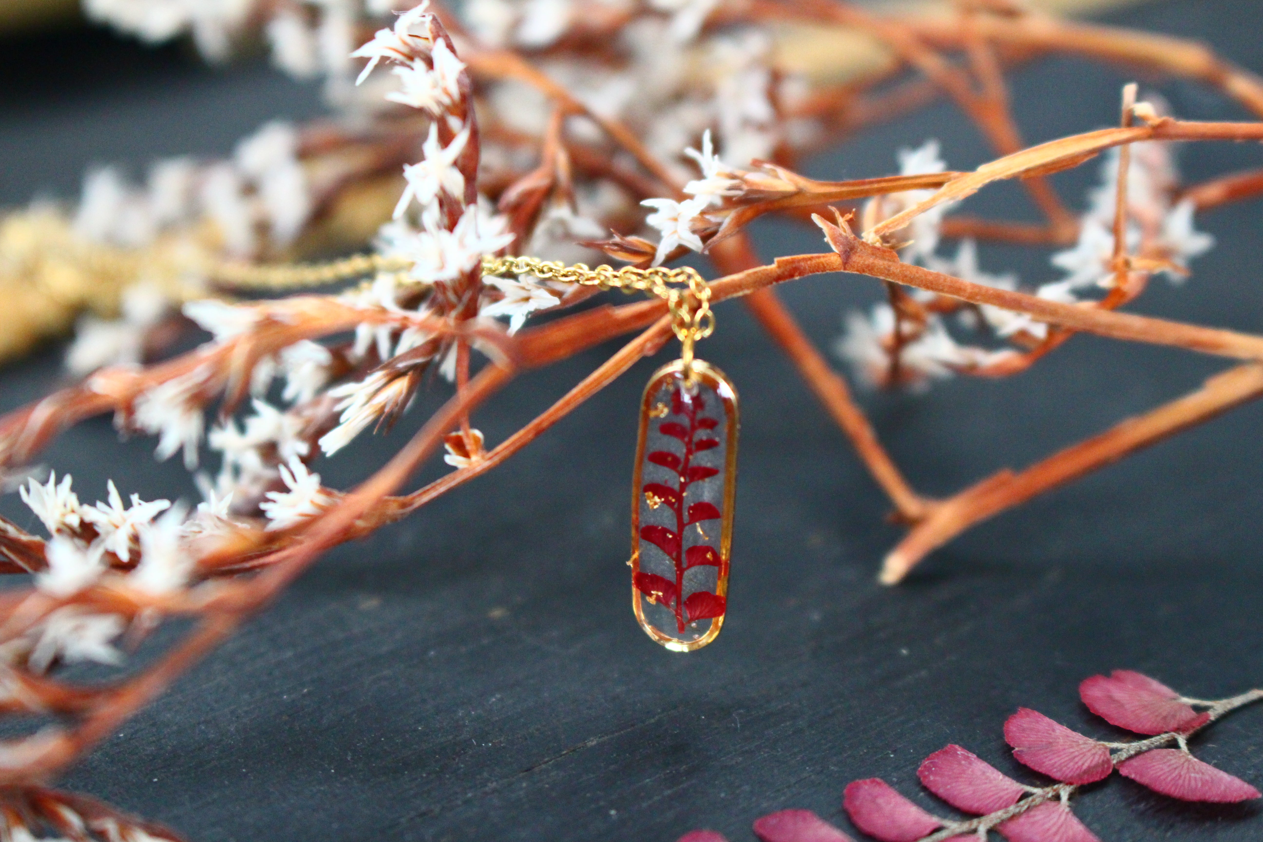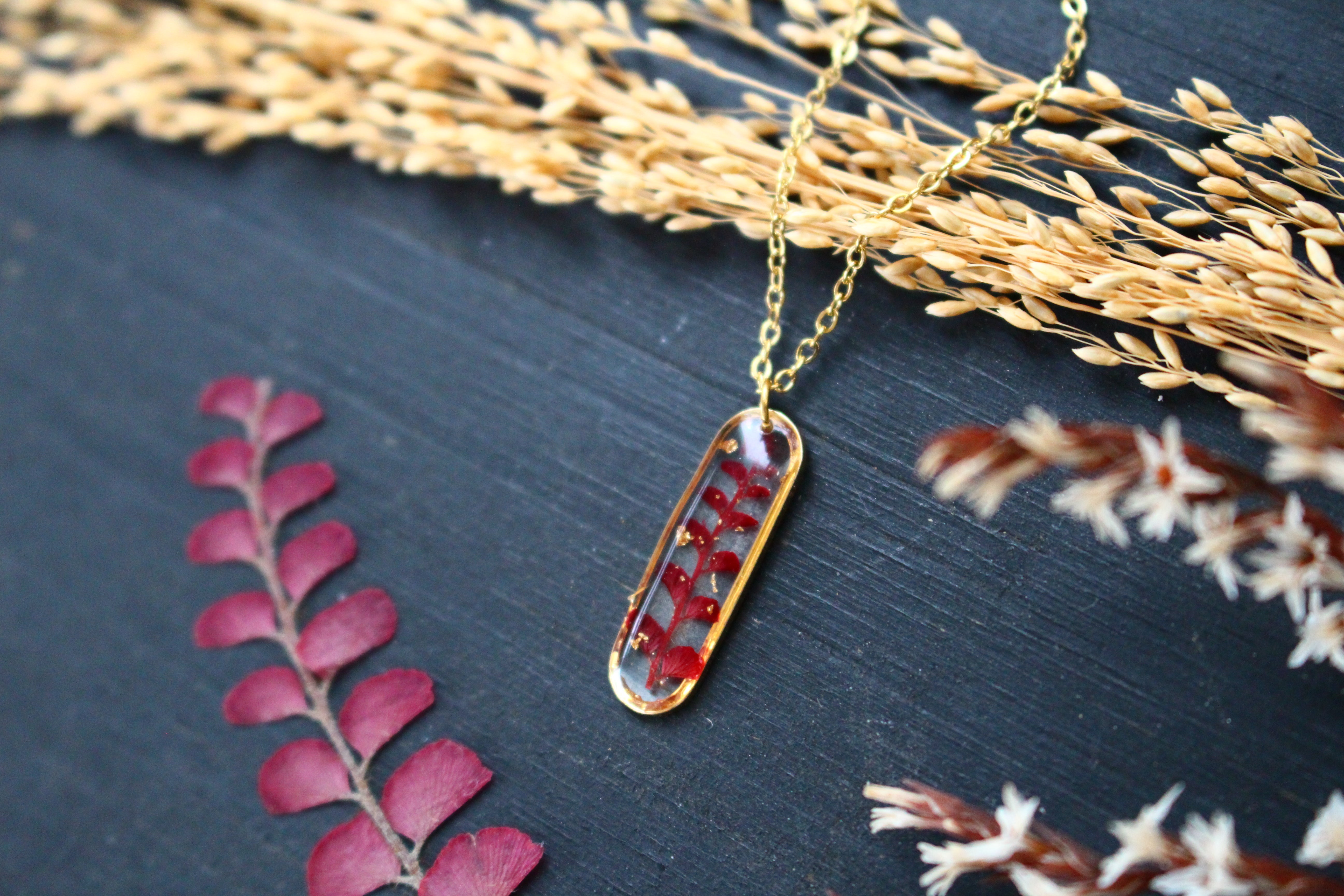 Necklace composed of a small elongated medallion filled with resin in which I have embedded a variety of fern called rough capillary which has a magnificent dark red color, coming from the pretty village of Les Makes. This young fern is enhanced by pieces of gold leaf