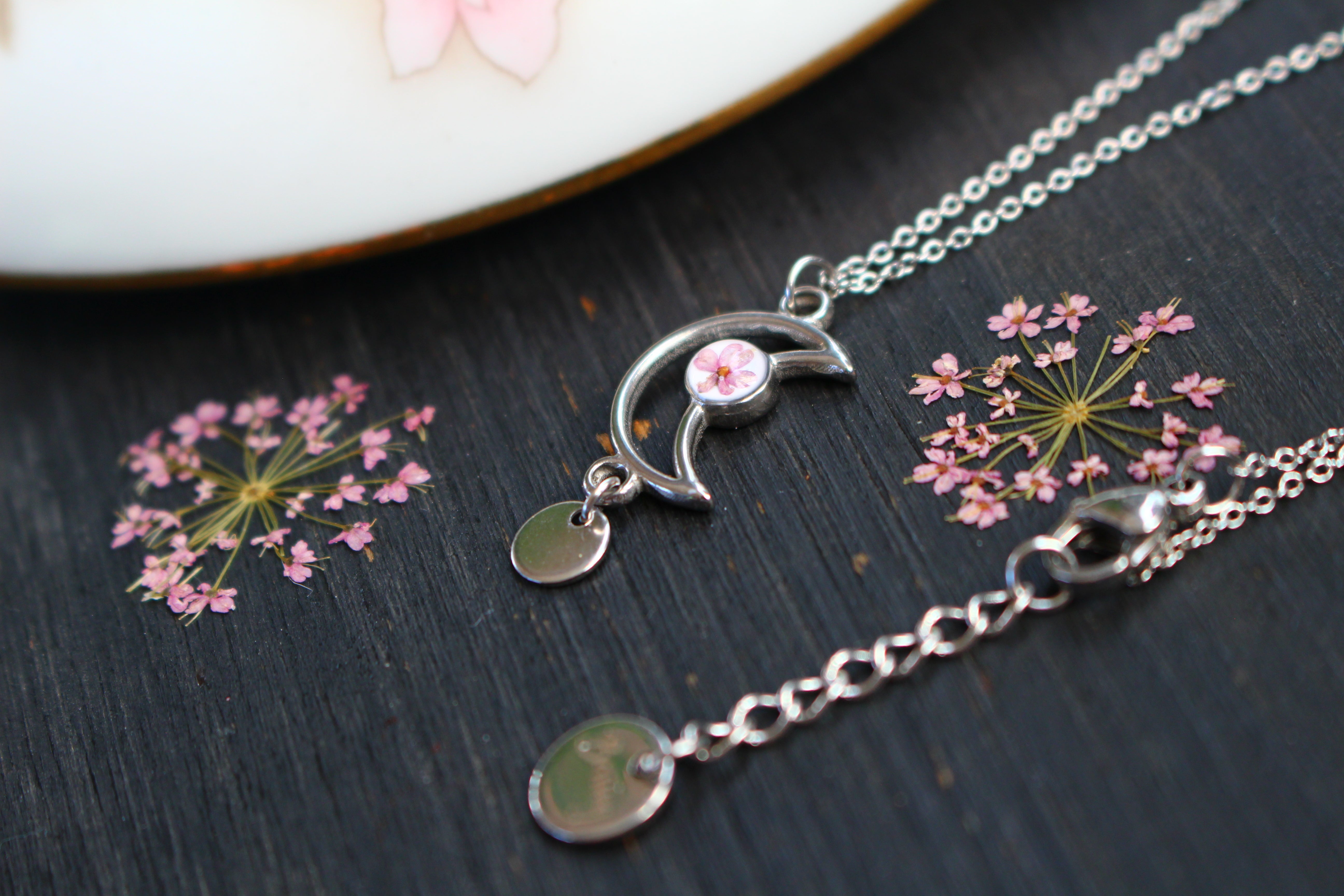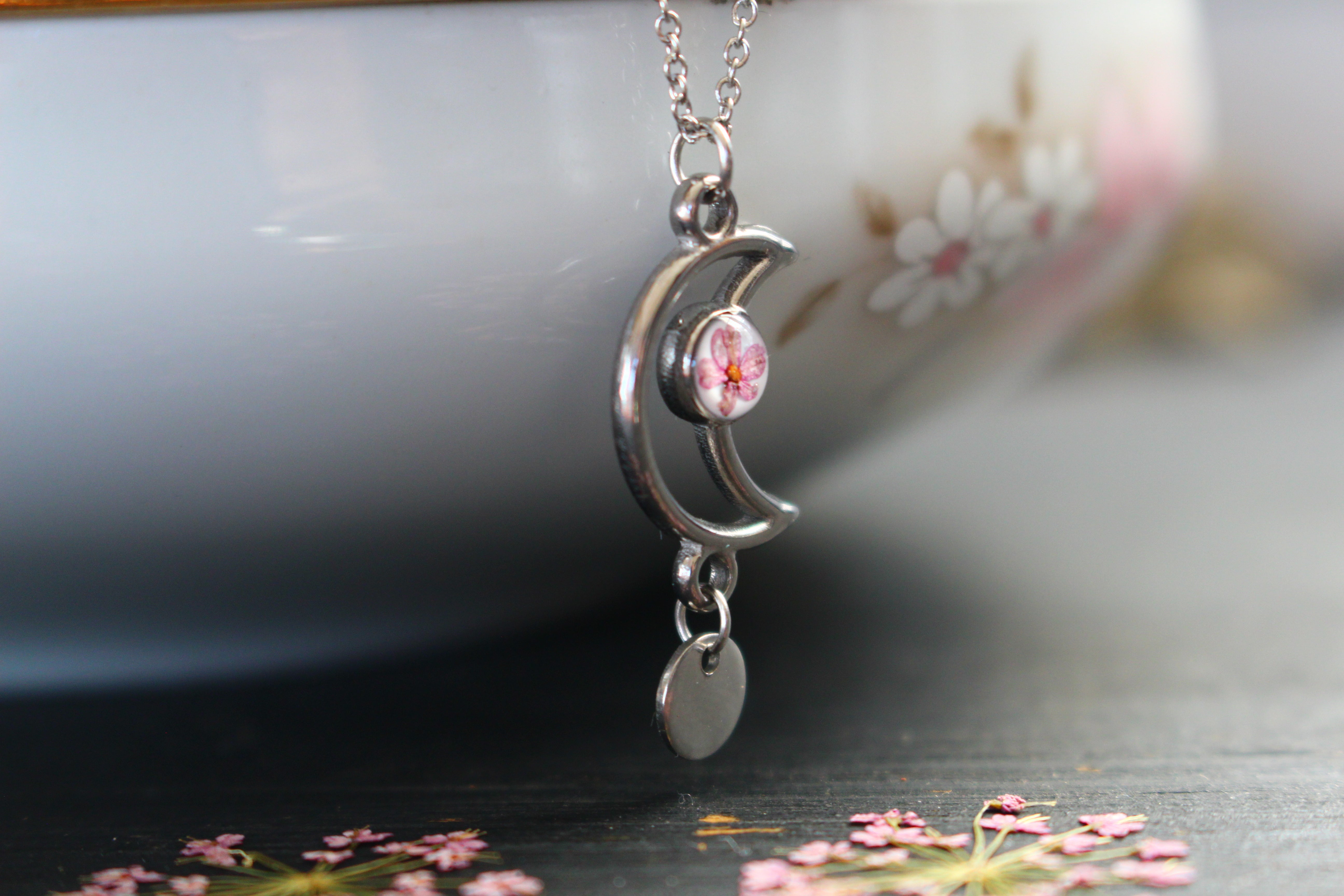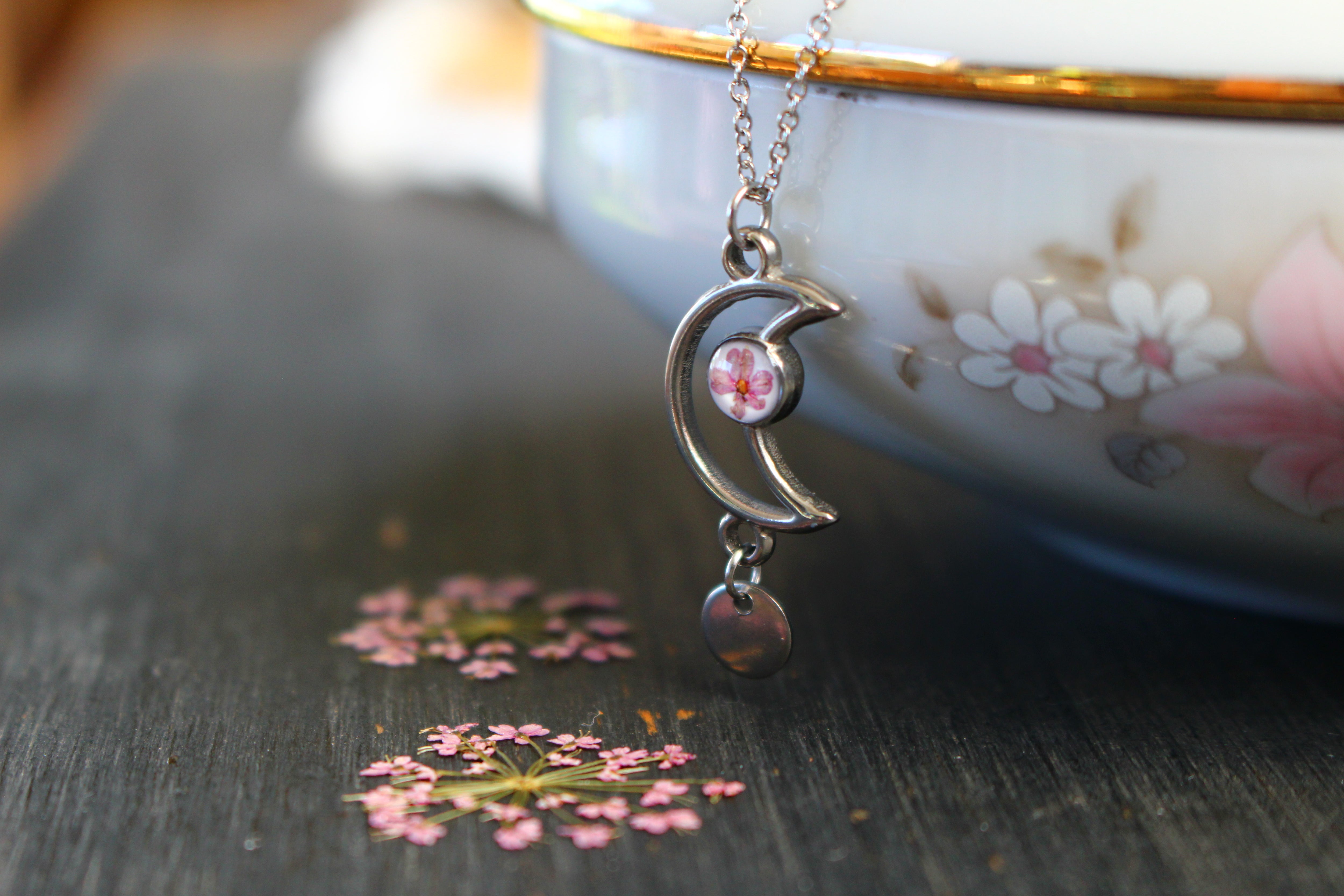 Necklace composed of a medallion in the shape of a small moon on which I have encrusted, in resin, a small flower of large boucage on a white background.