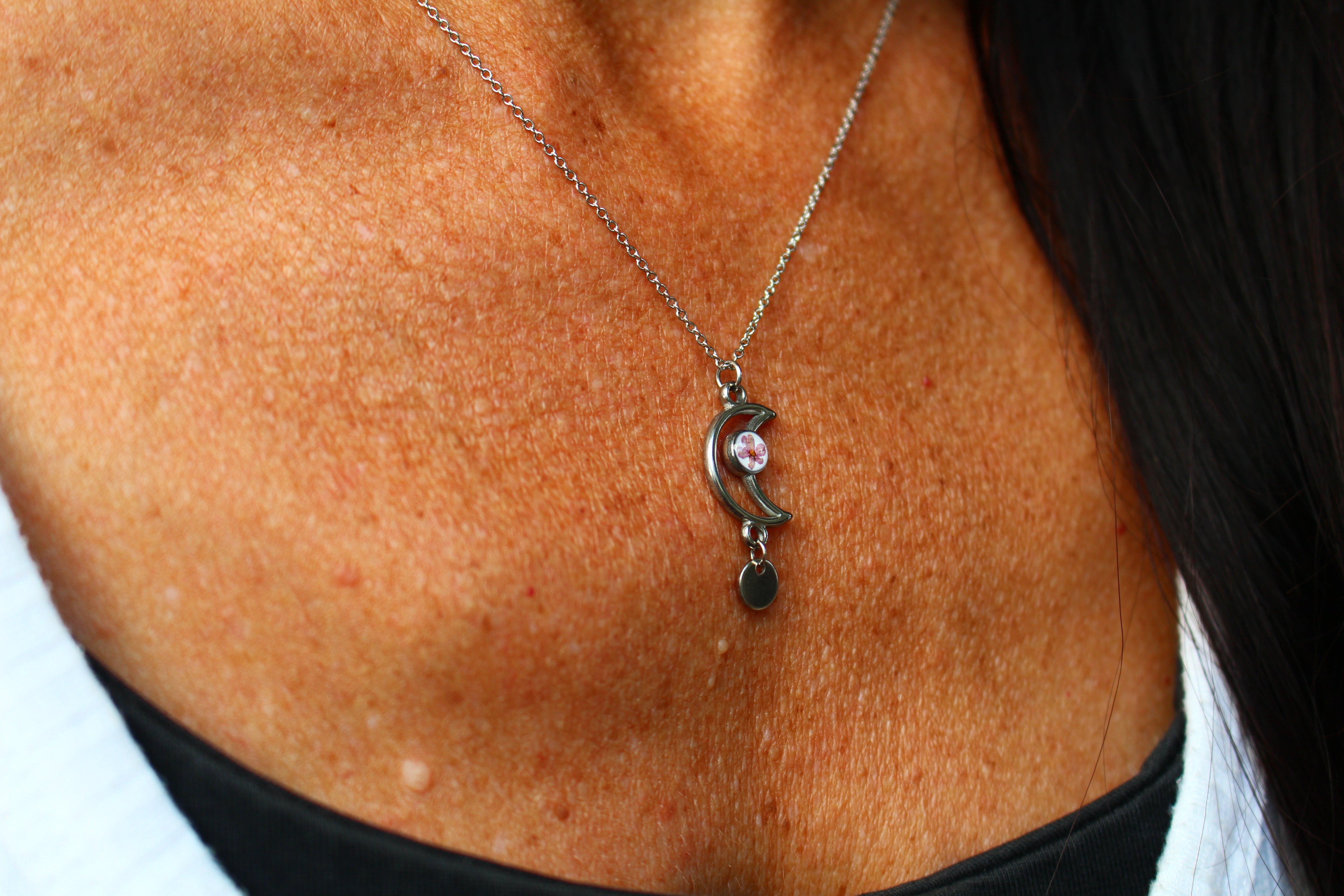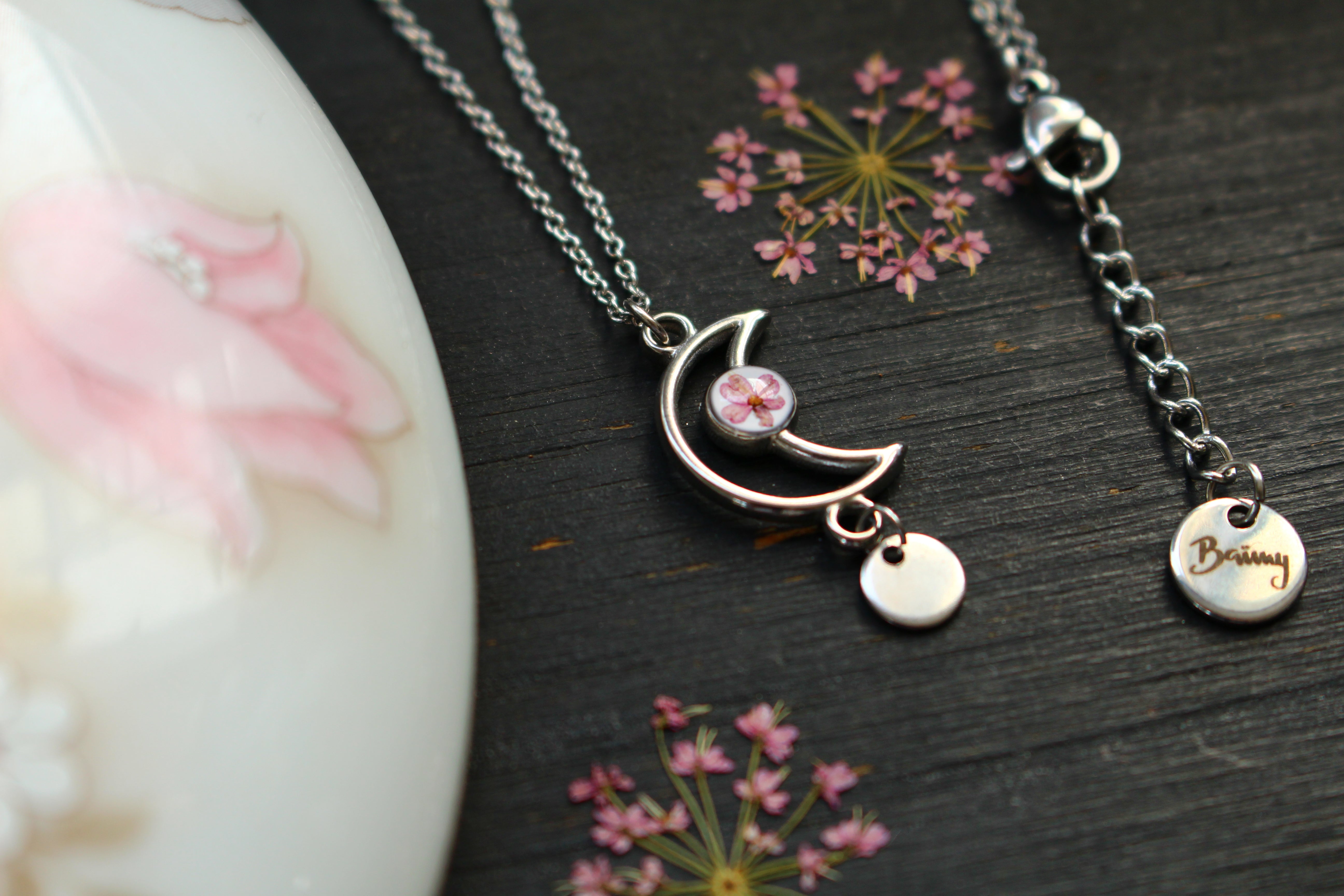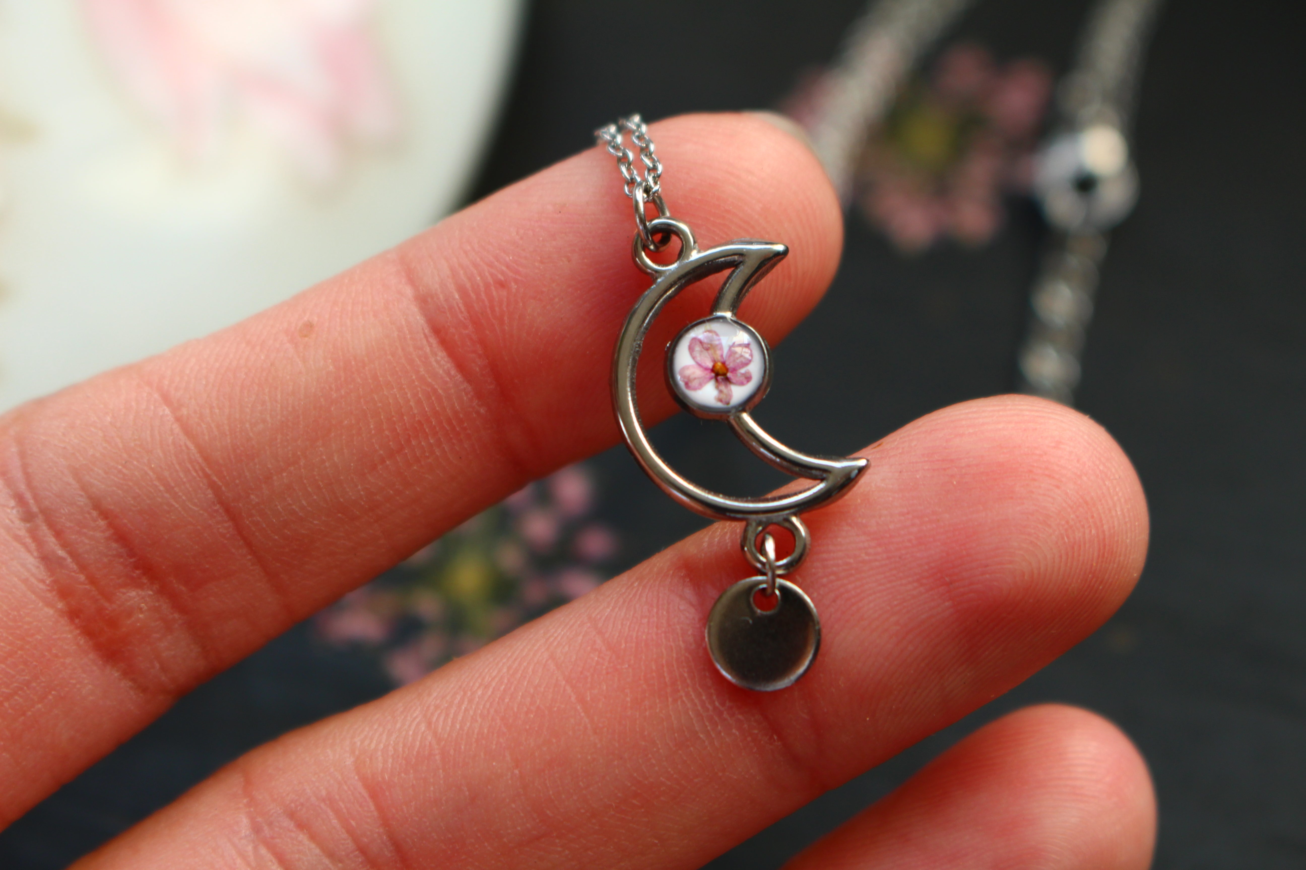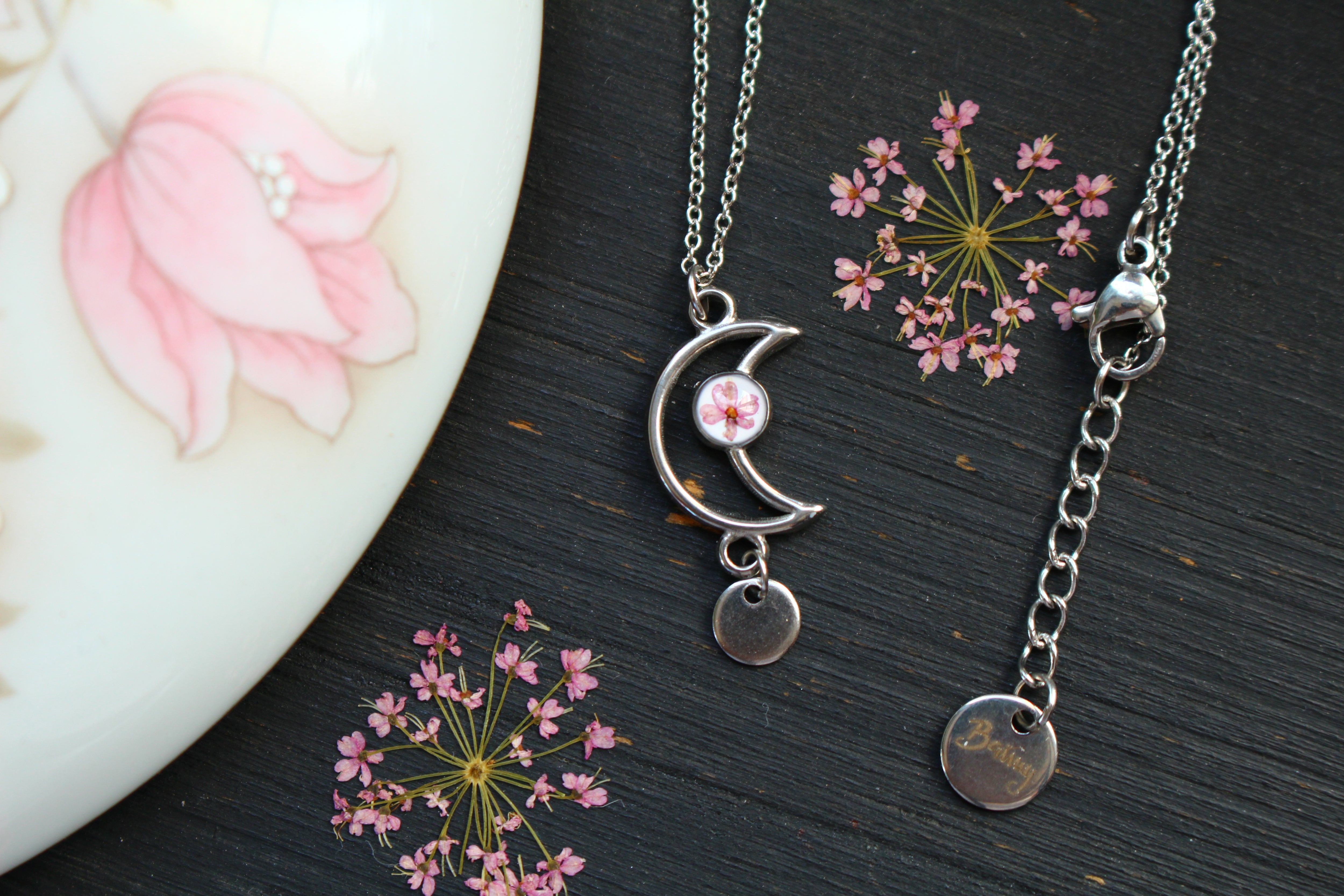 Necklace composed of a medallion in the shape of a small moon on which I have encrusted, in resin, a small flower of large boucage on a white background.