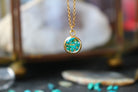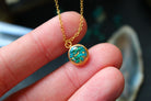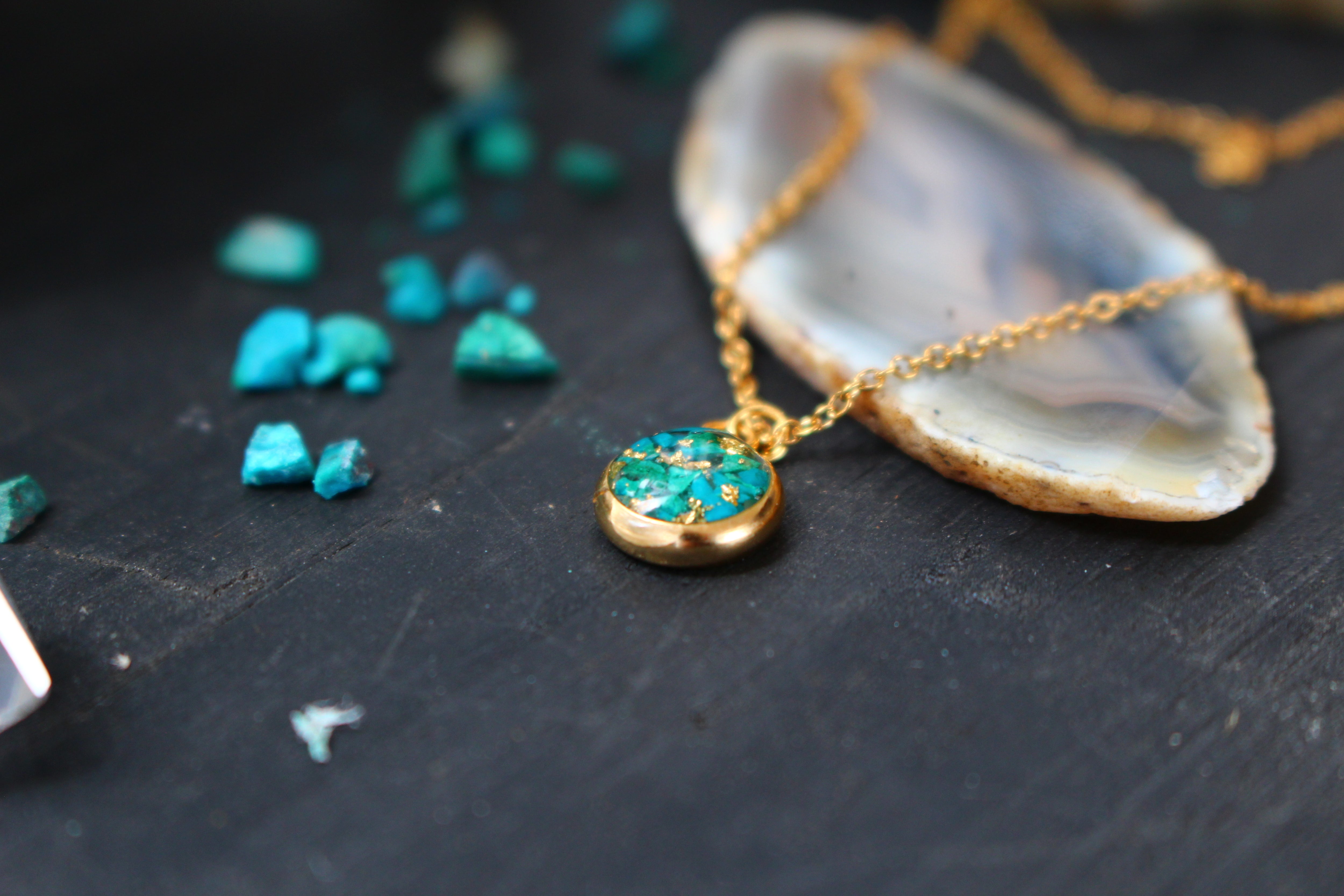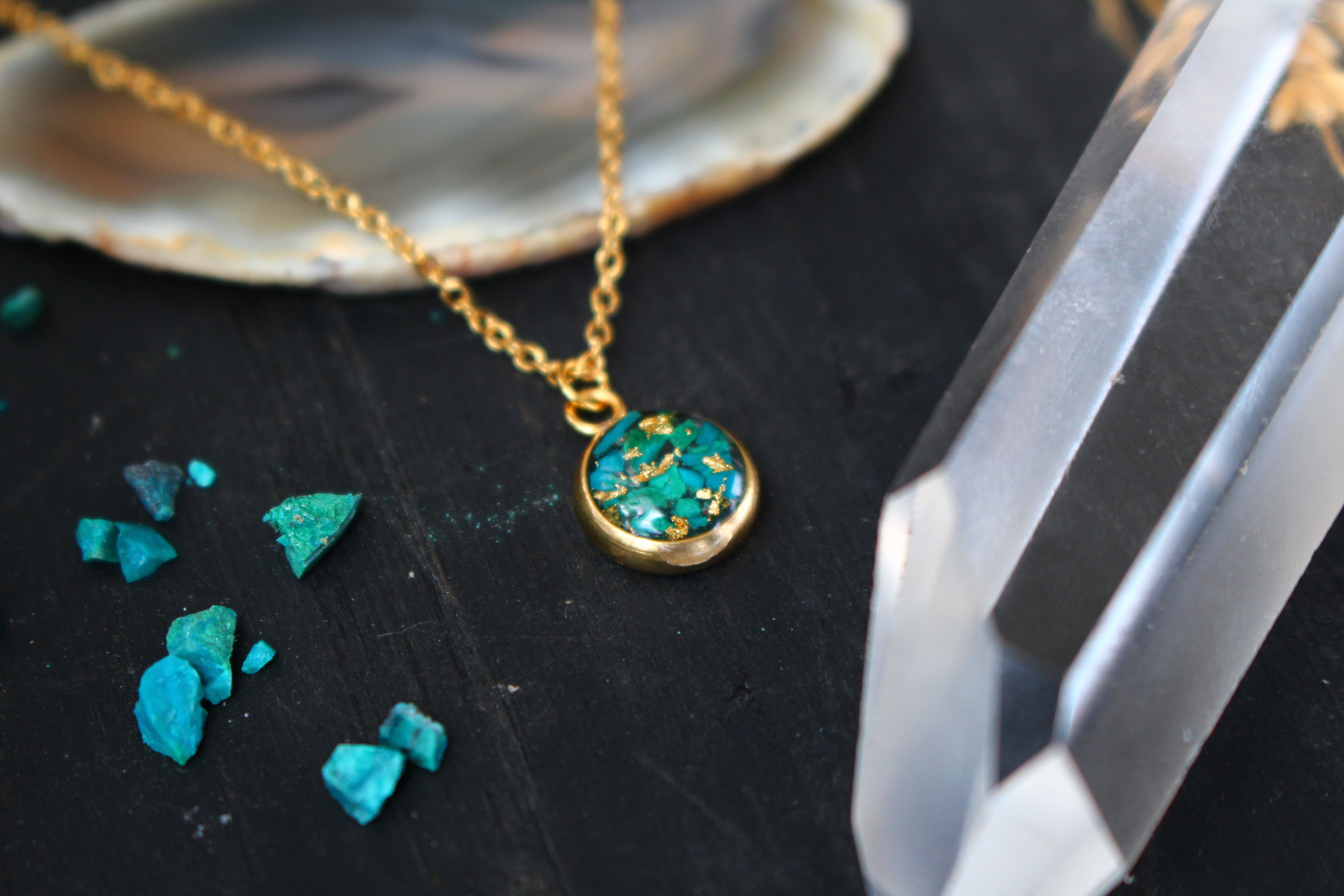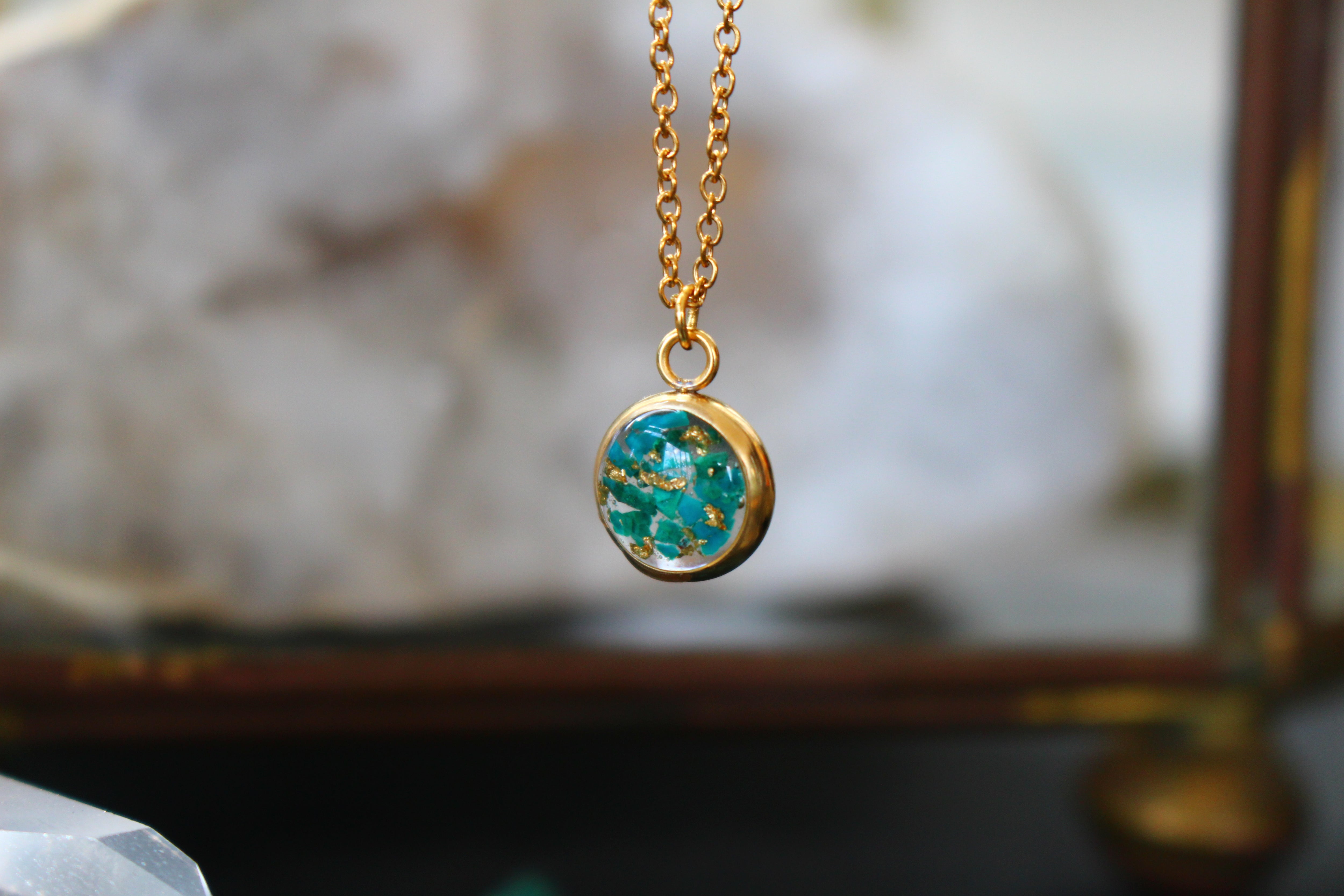 Collar compuesto por un medallón de 6mm de diámetro relleno de resina en el que he incrustado piezas de piedras Crisocola y pan de oro