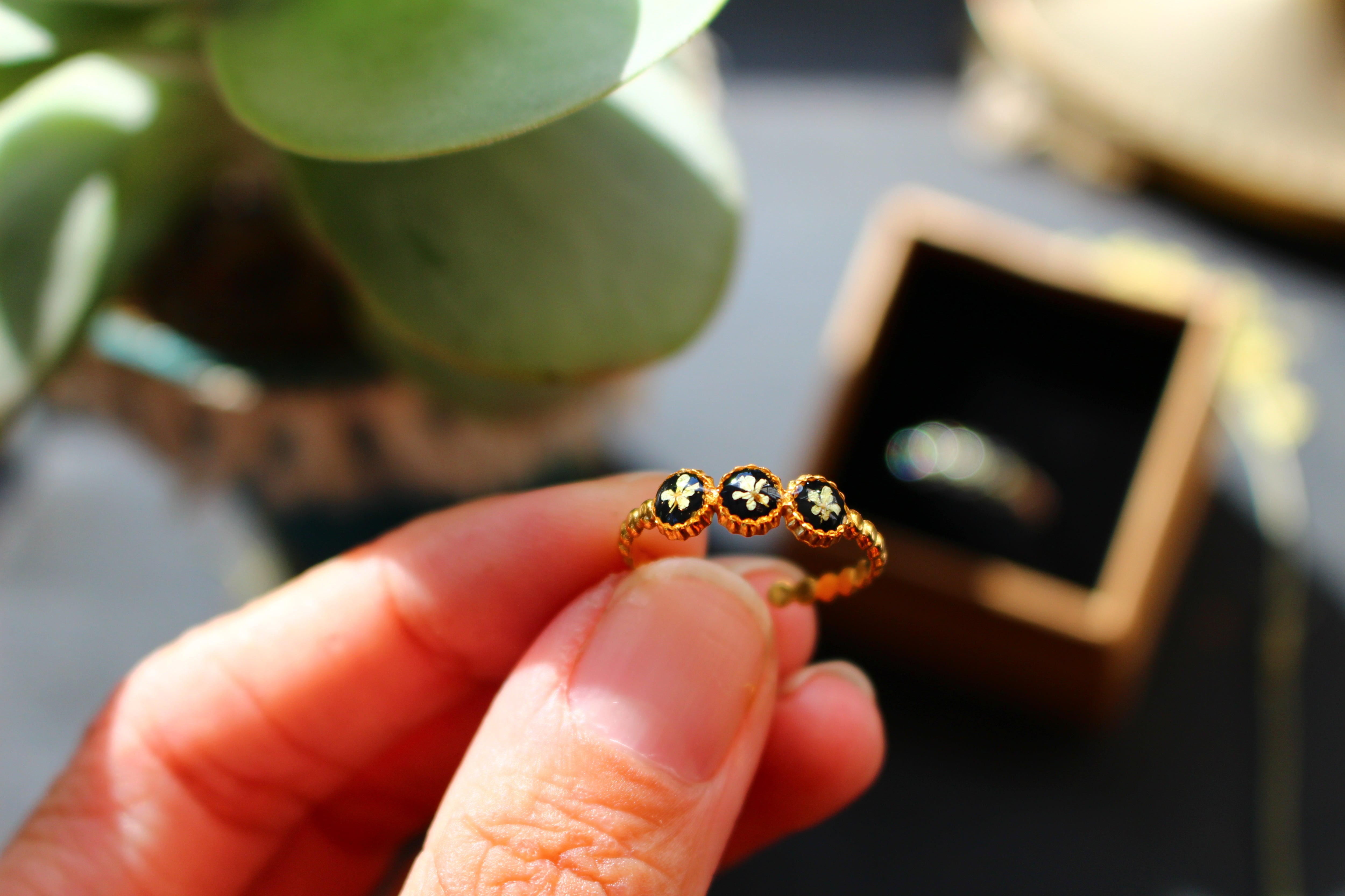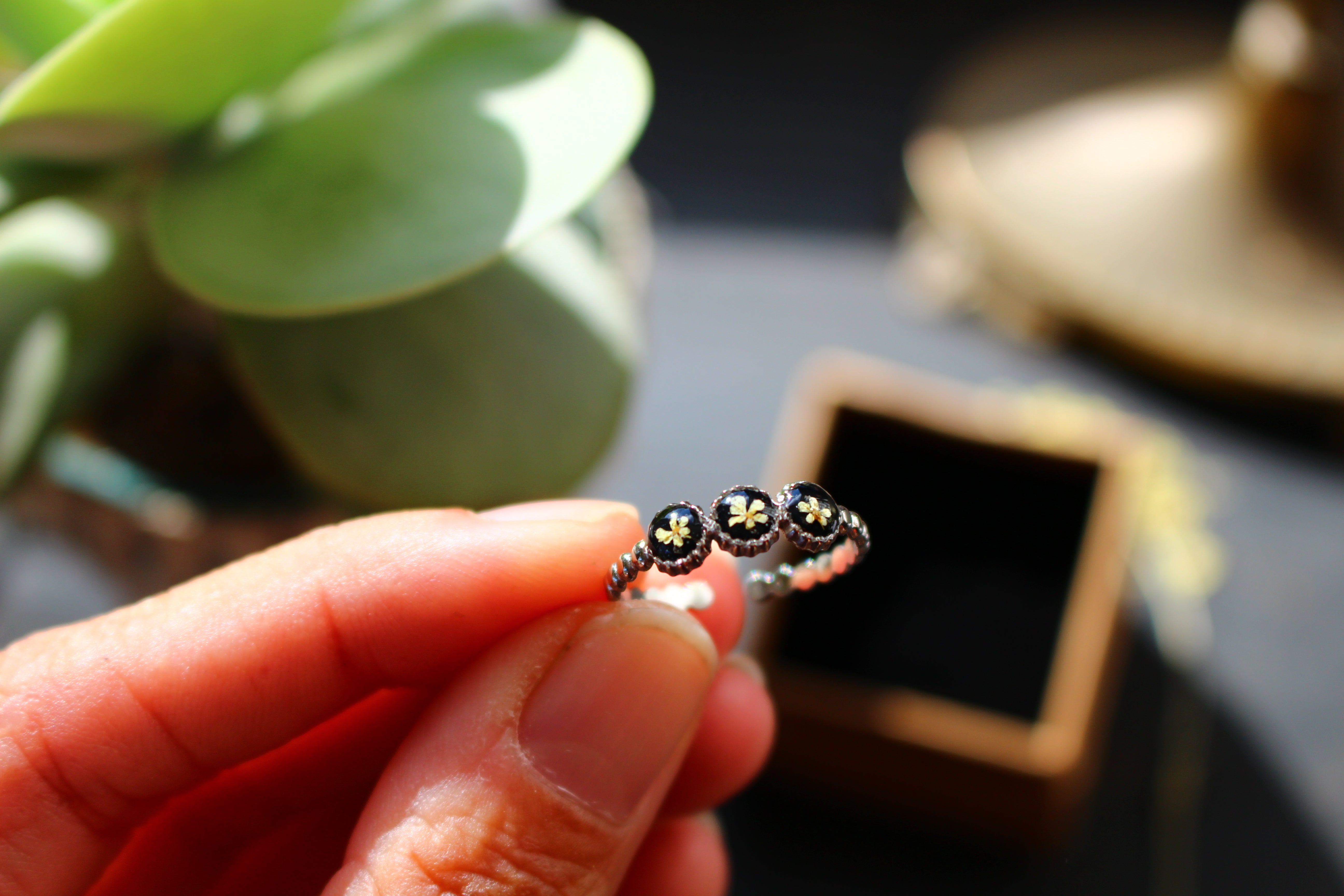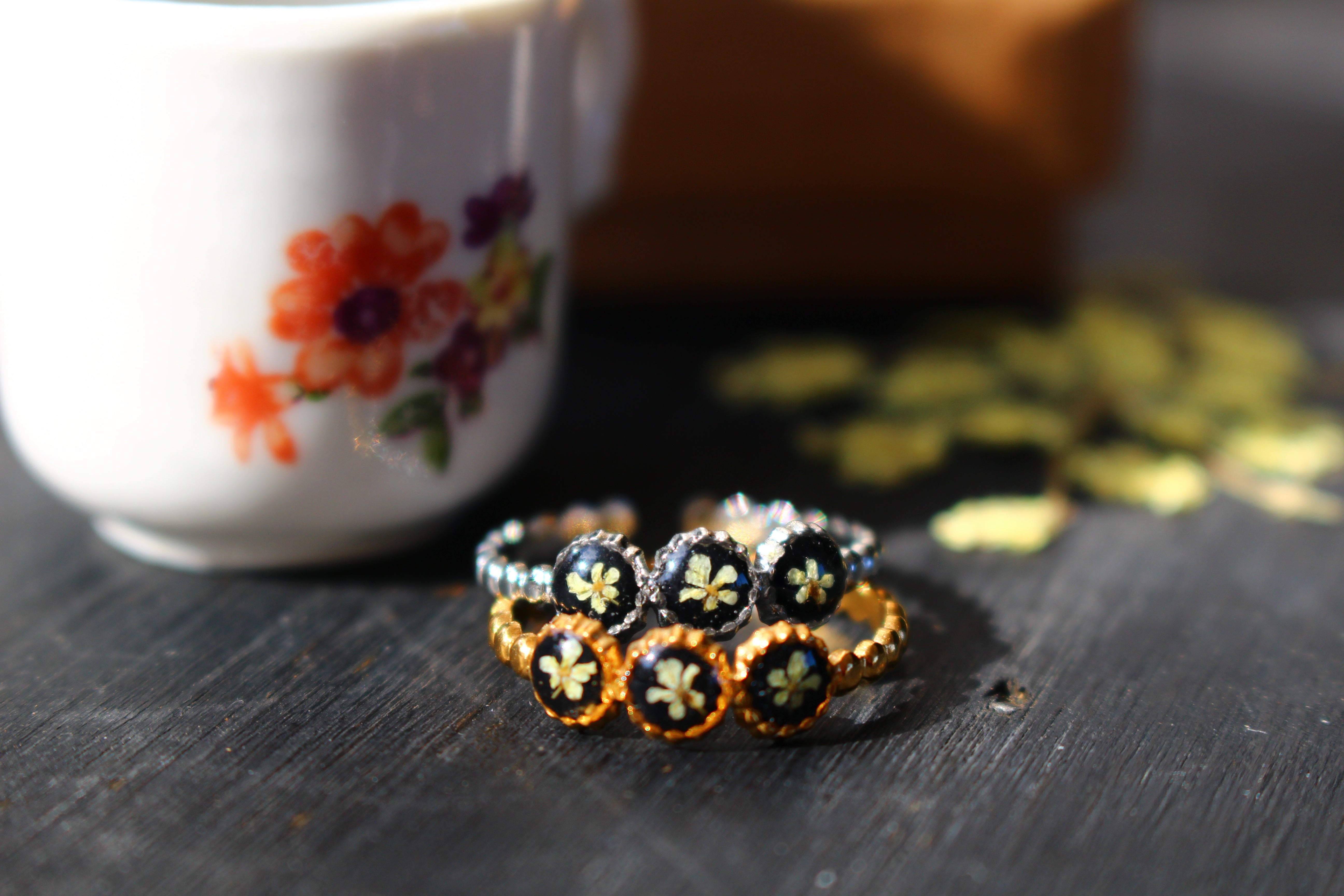 Anillo compuesto por un cabujón de 4mm de diámetro relleno de resina en el que está incrustada una pequeña flor de Encaje de Reina de Ana y unas piezas de pan de oro.