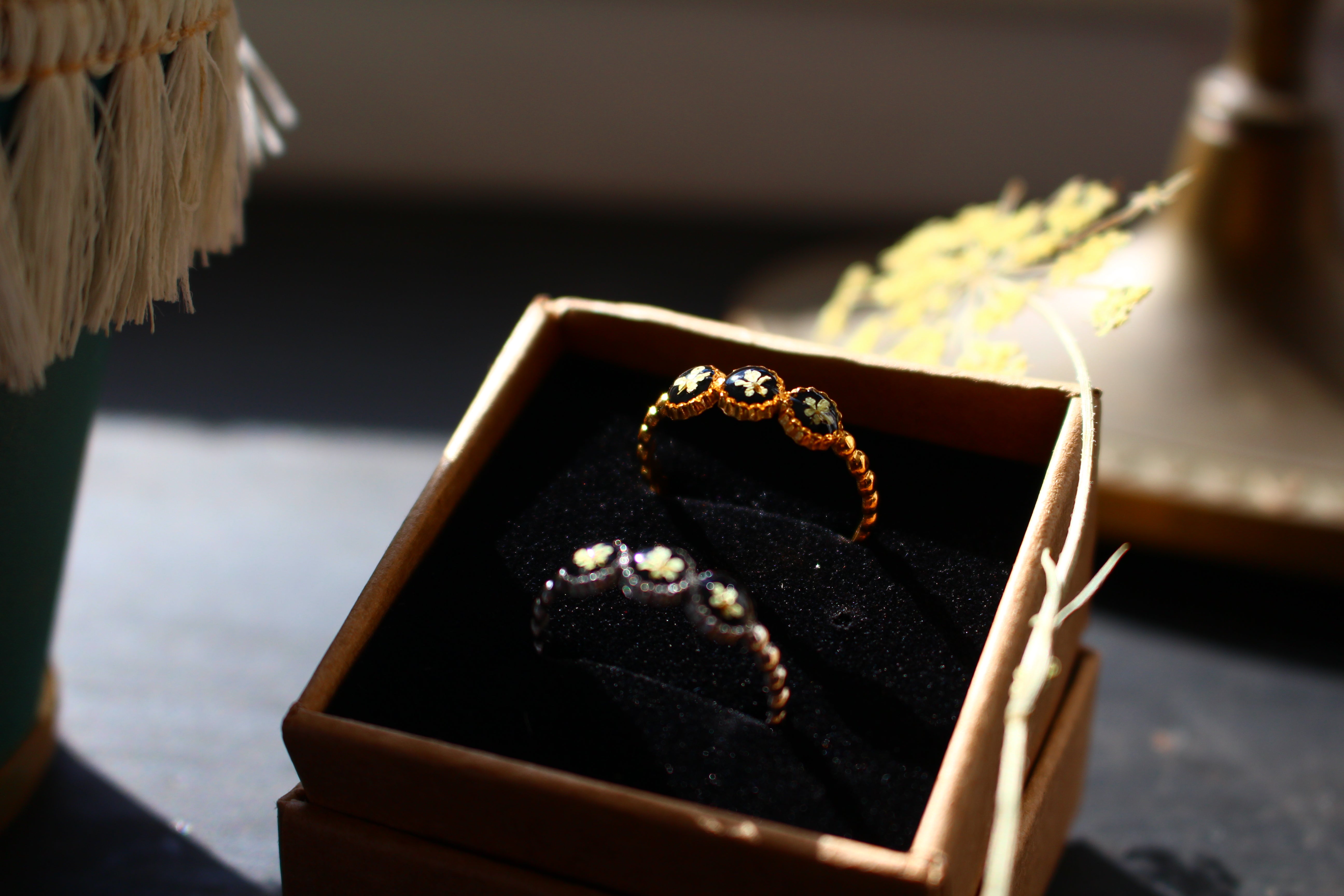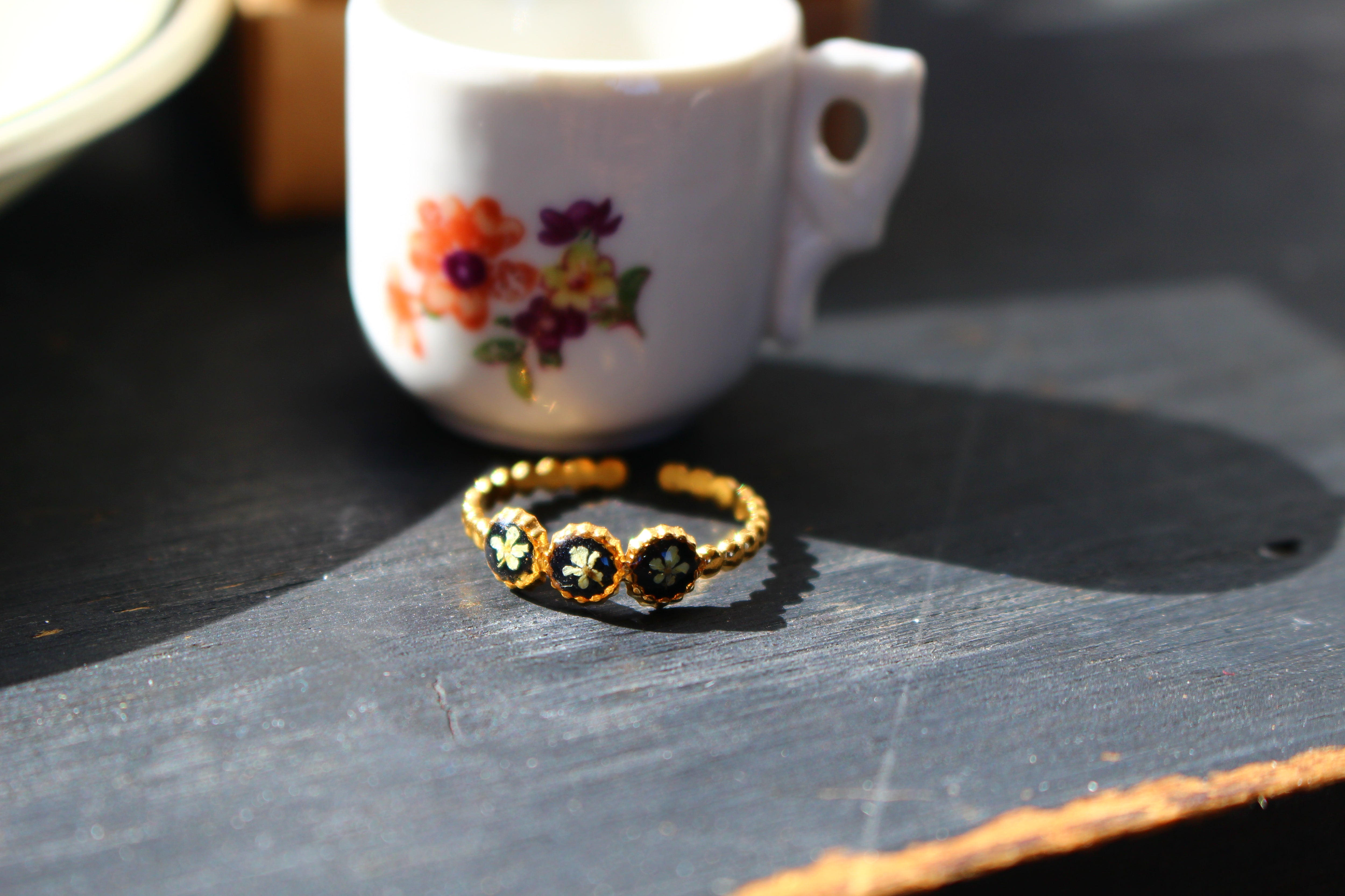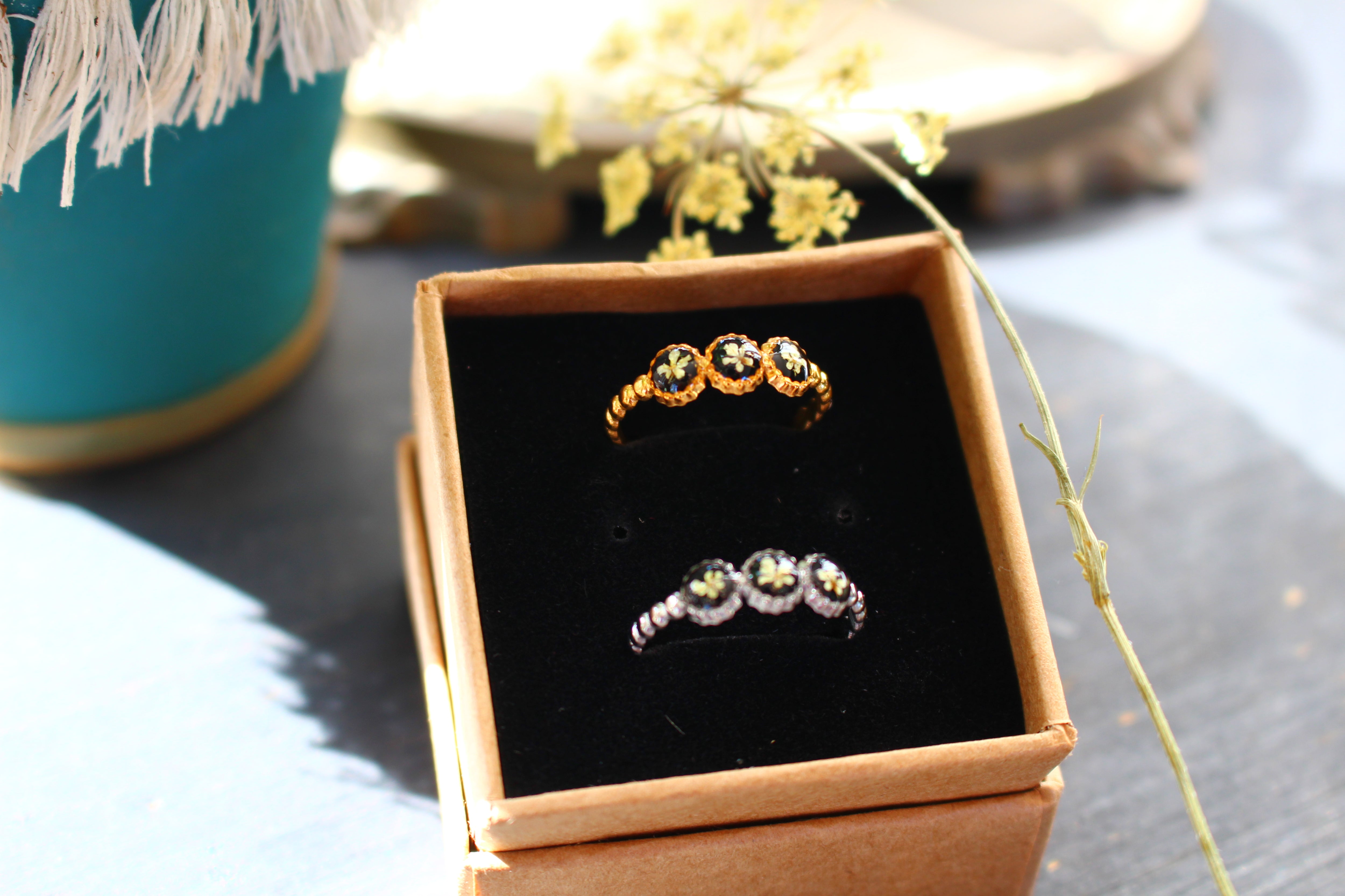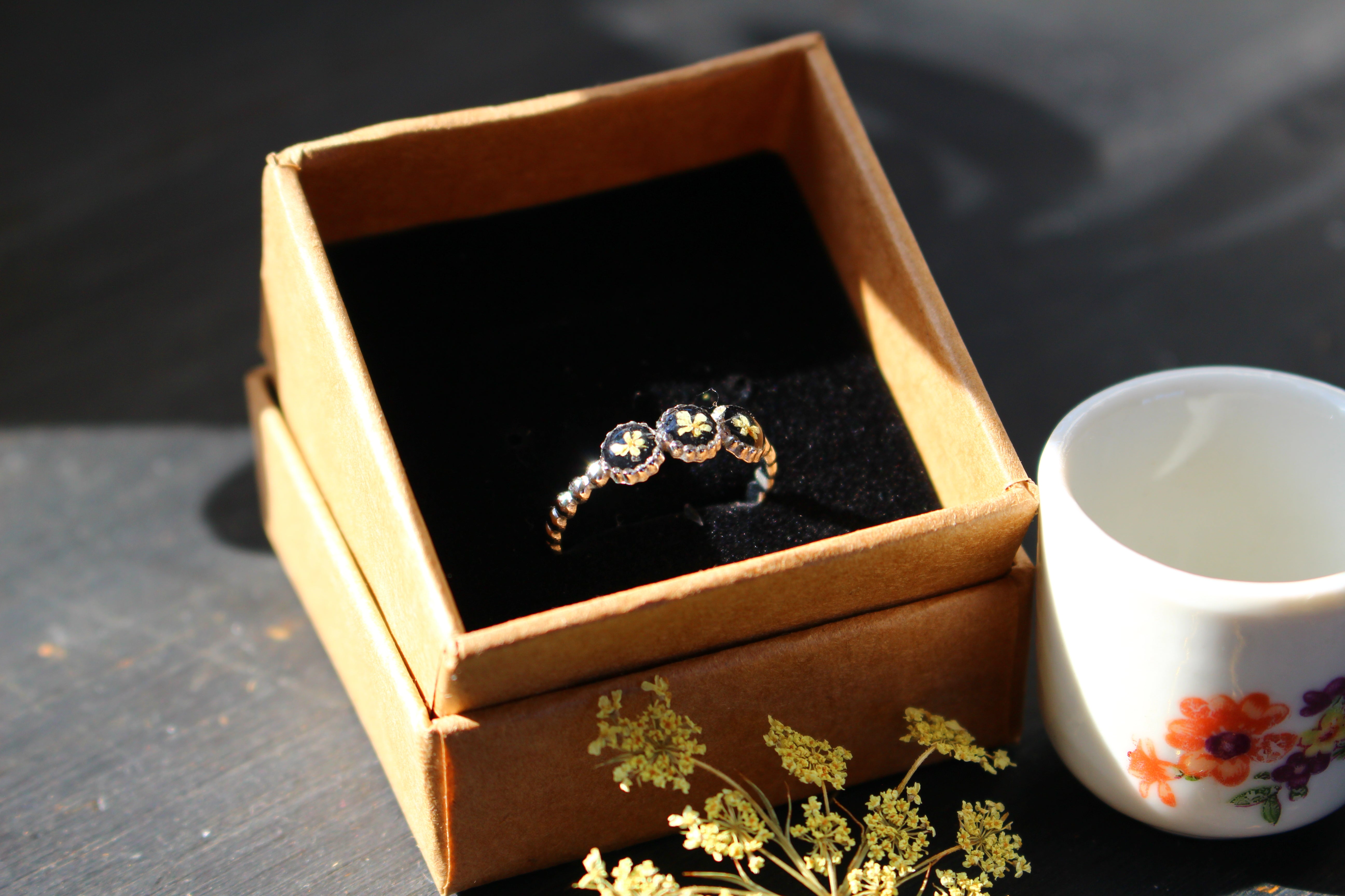 Anillo compuesto por un cabujón de 4mm de diámetro relleno de resina en el que está incrustada una pequeña flor de Encaje de Reina de Ana y unas piezas de pan de oro.