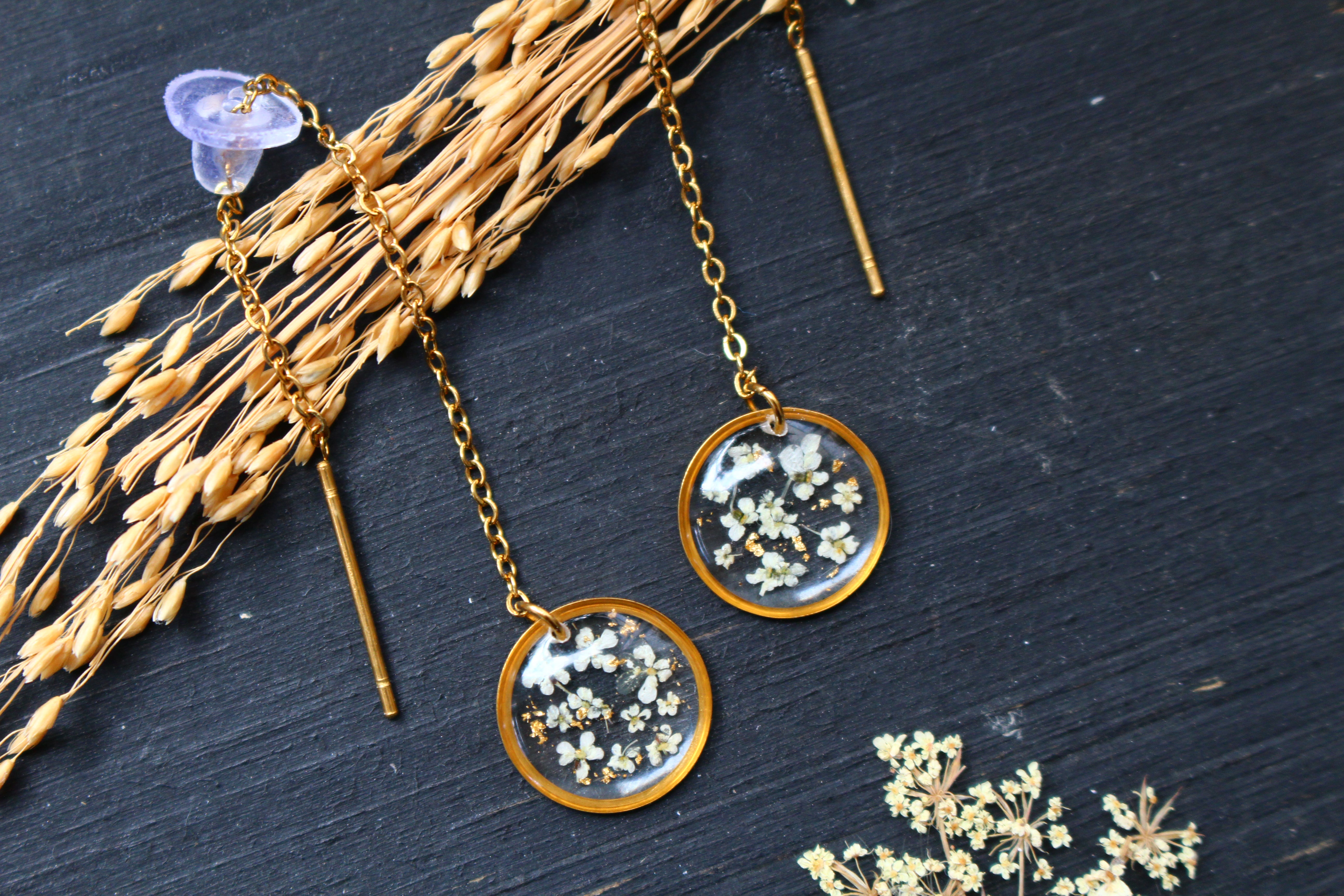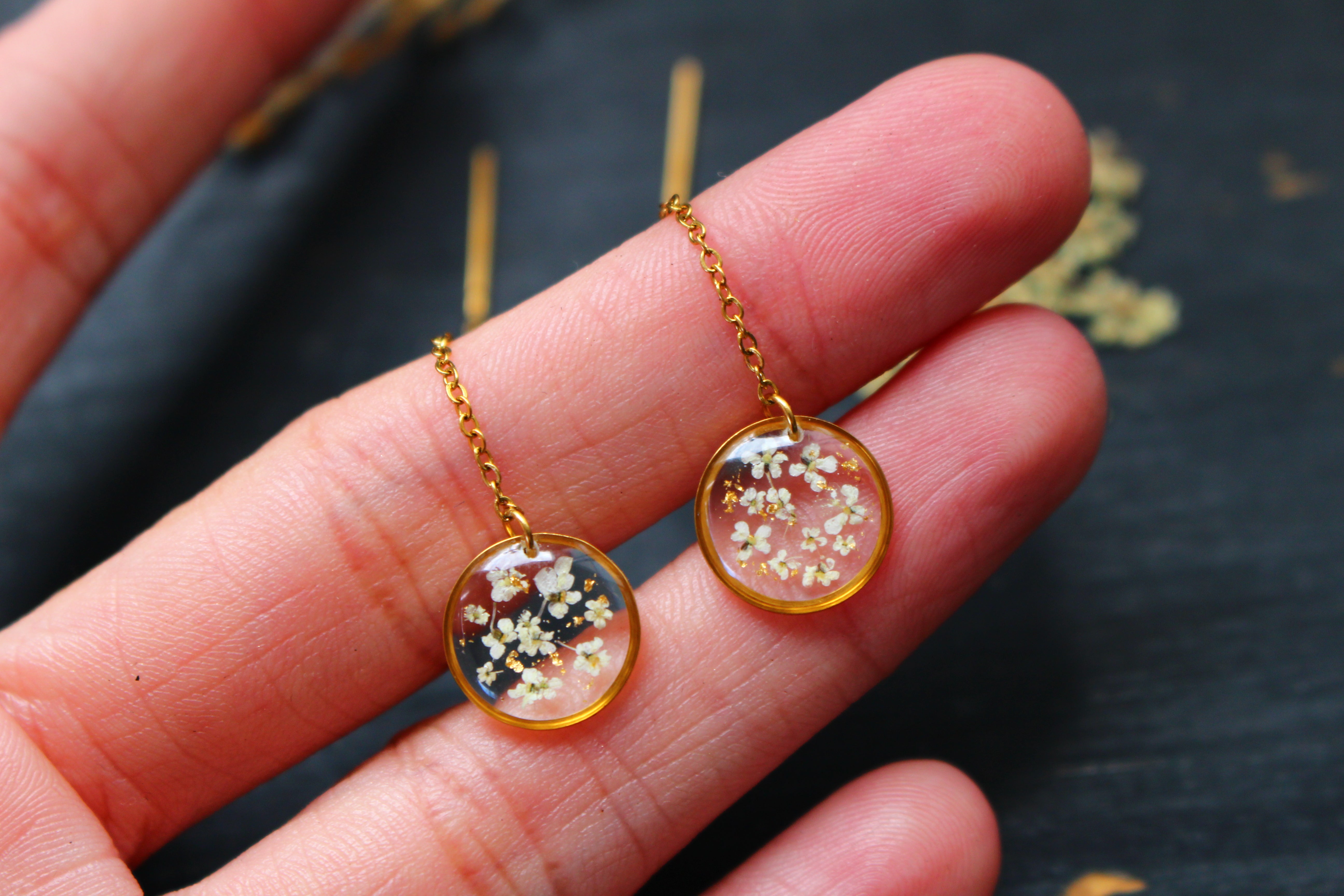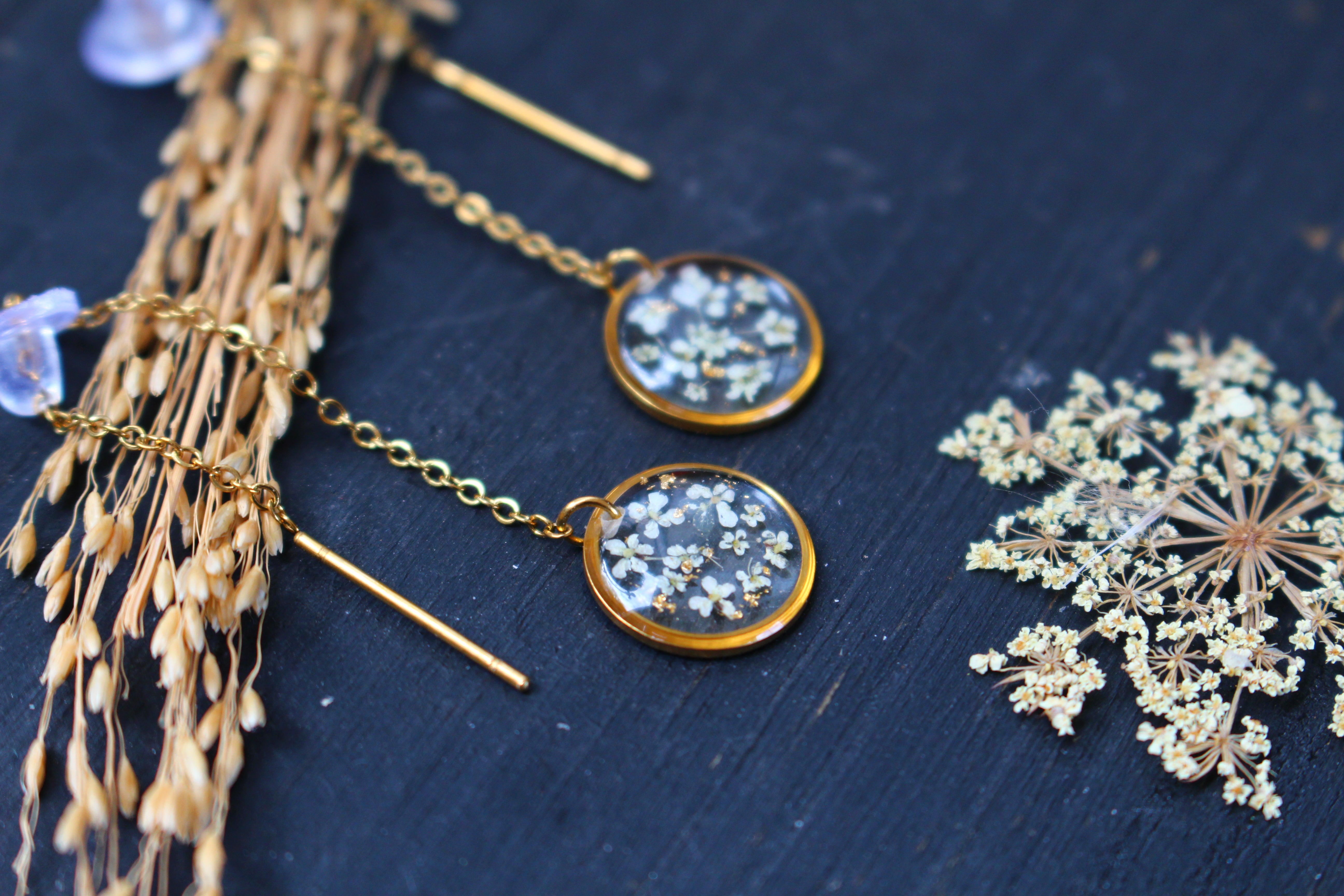 Pendientes compuestos por medallones de 12mm de diámetro rellenos de resina en los que he incrustado pequeñas flores Reina Ana y unas partículas de pan de oro.
