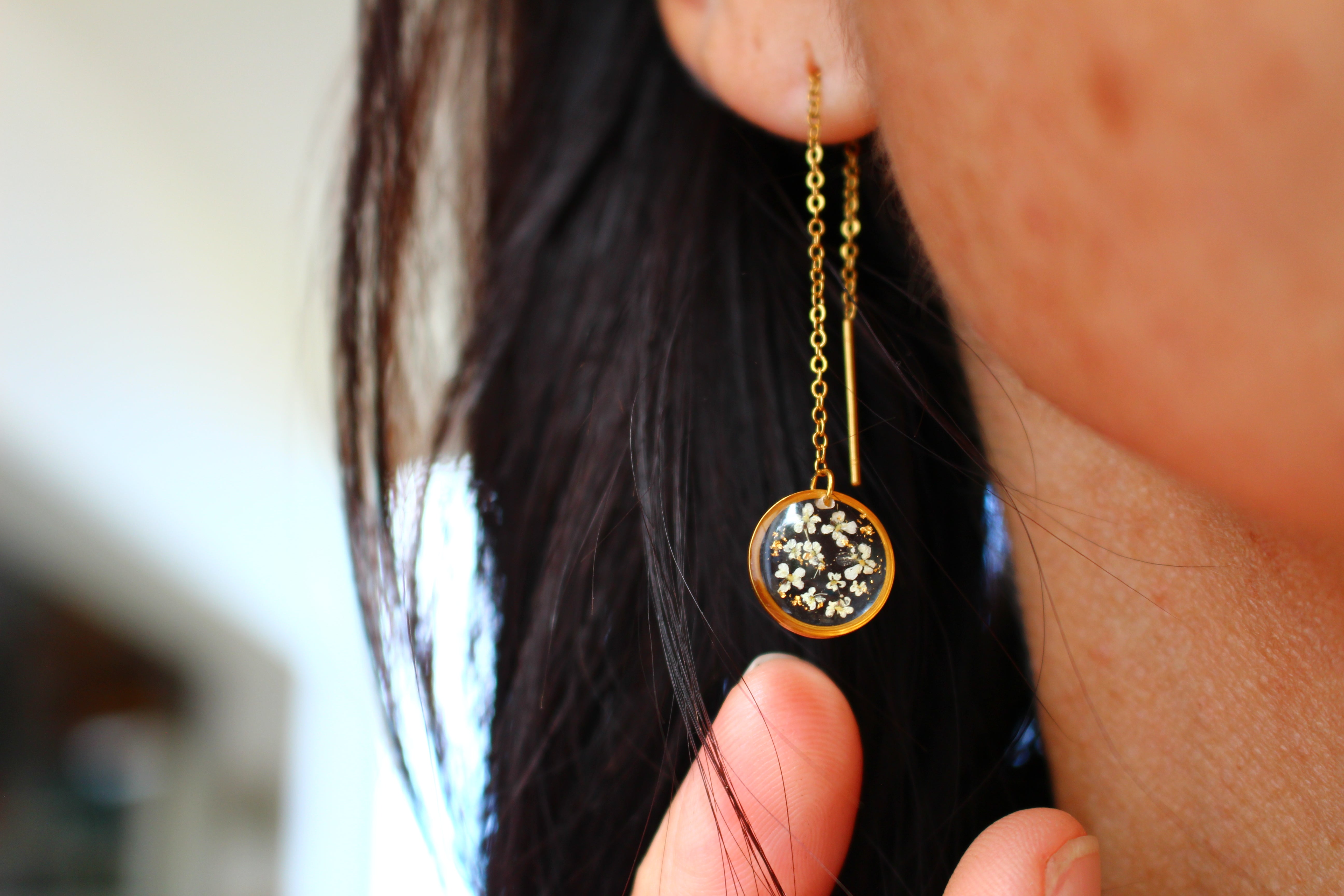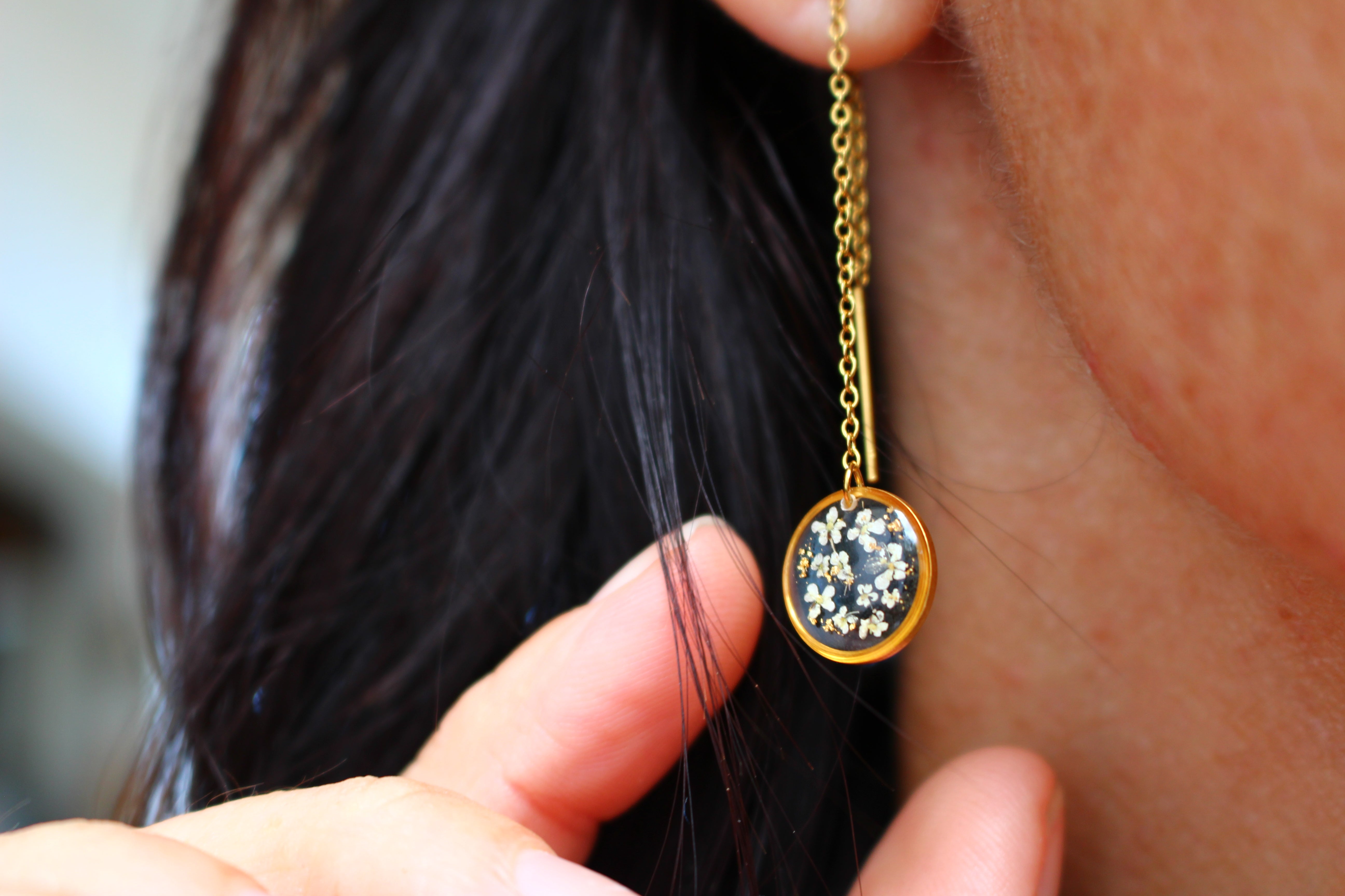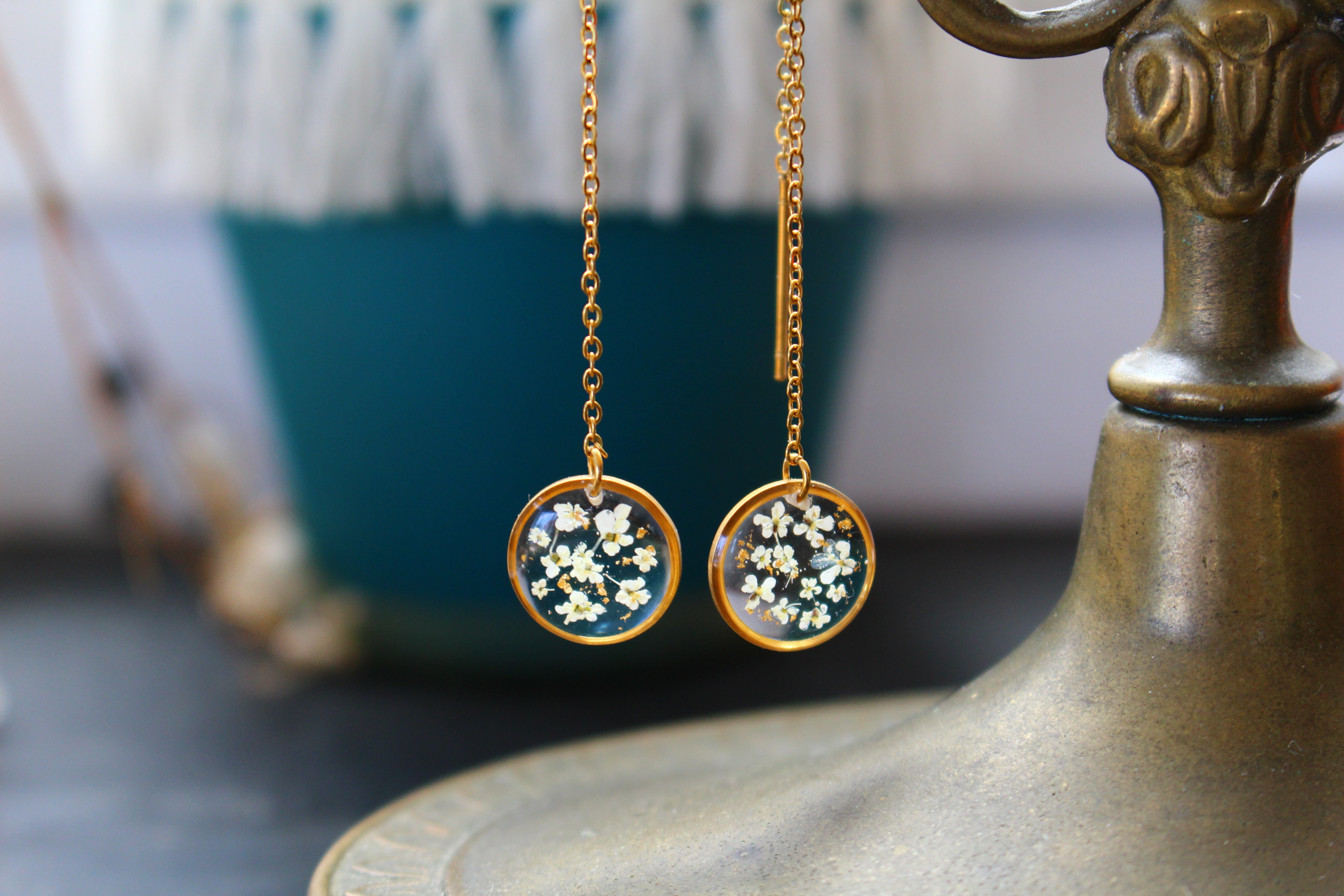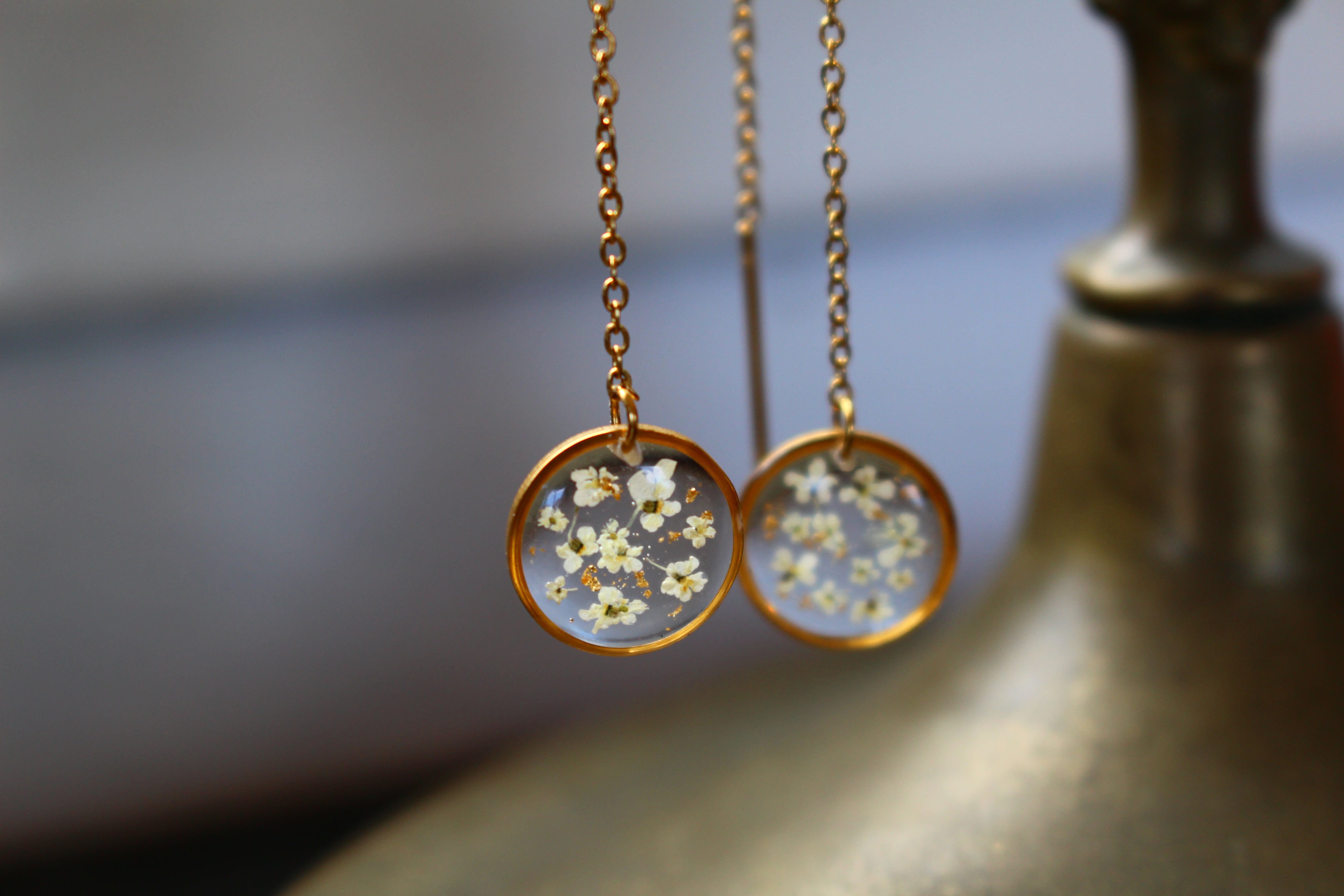 Pendientes compuestos por medallones de 12mm de diámetro rellenos de resina en los que he incrustado pequeñas flores Reina Ana y unas partículas de pan de oro.