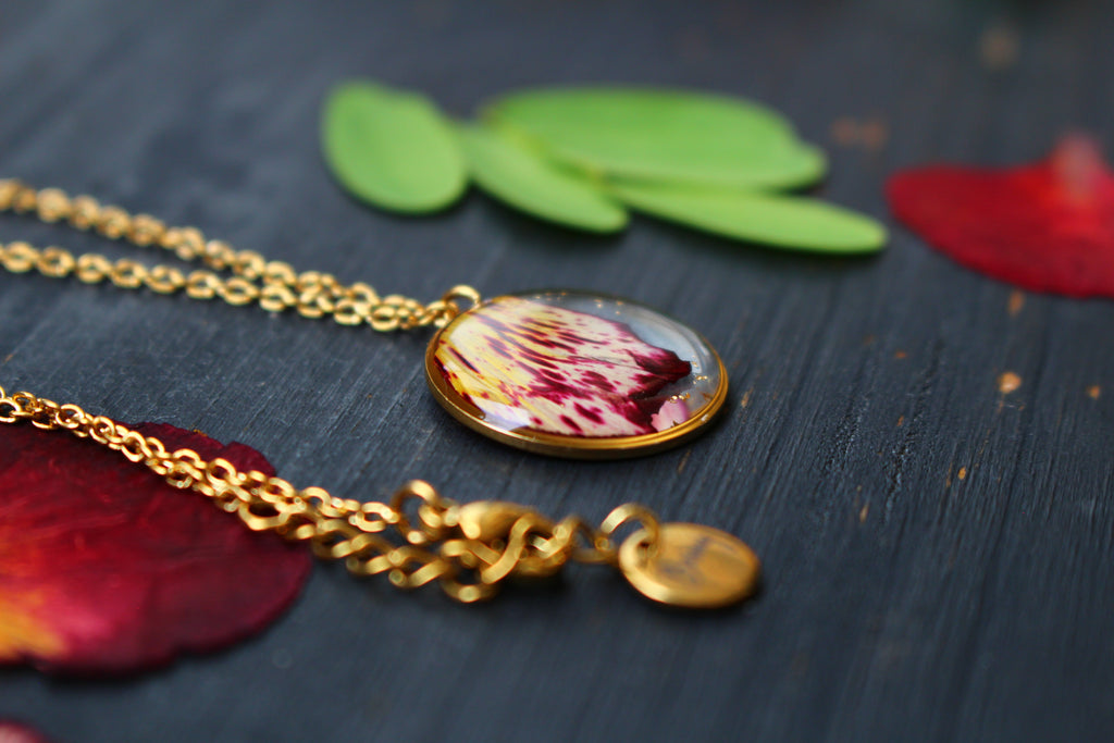 Collier composé d'un médaillon de 19mm de diamètre rempli de résine dans laquelle j'ai incrusté une partie d'un pétale de flamboyant et des particules de feuilles d'or. Aussi joli recto que verso :)