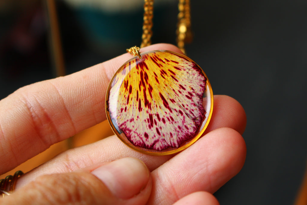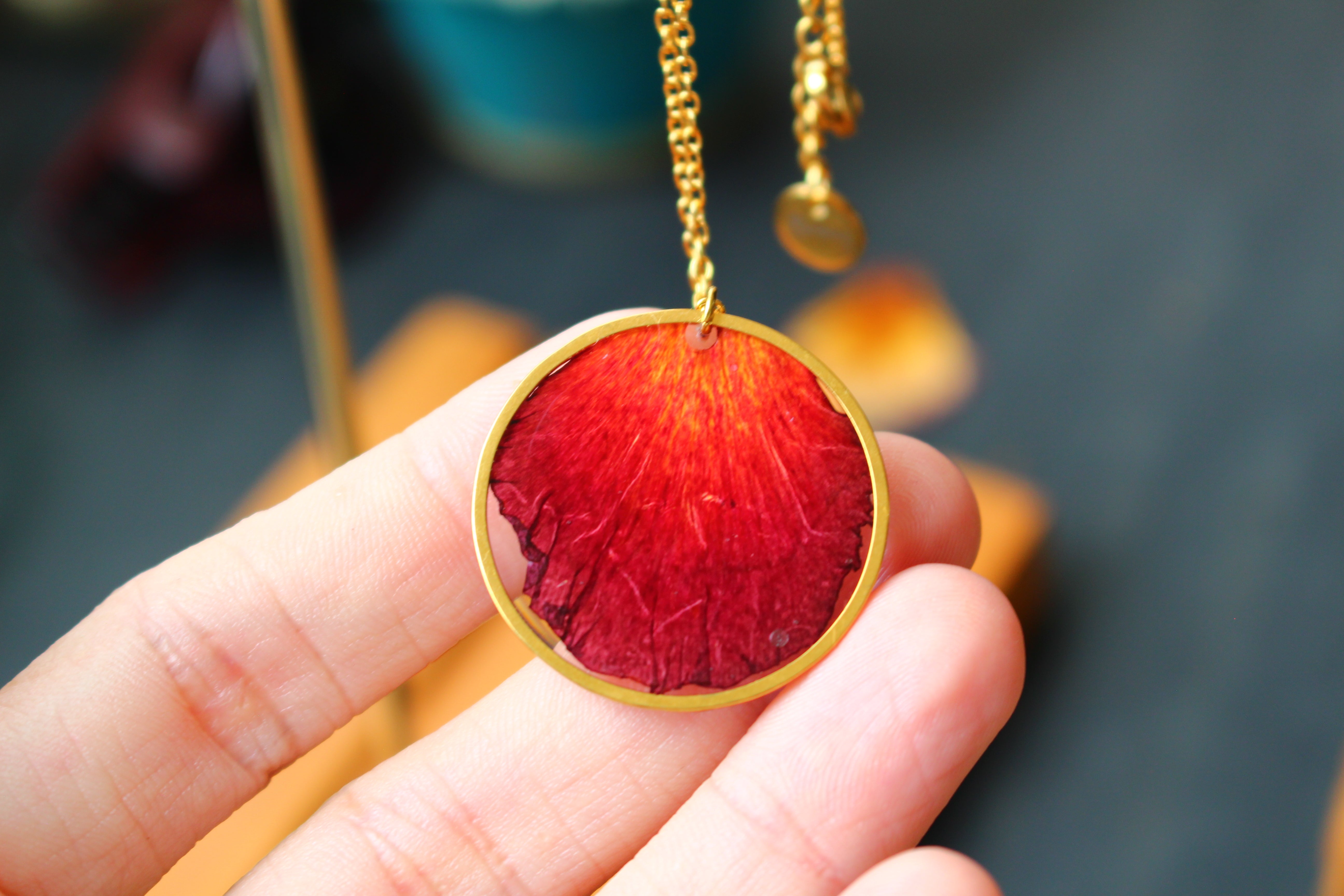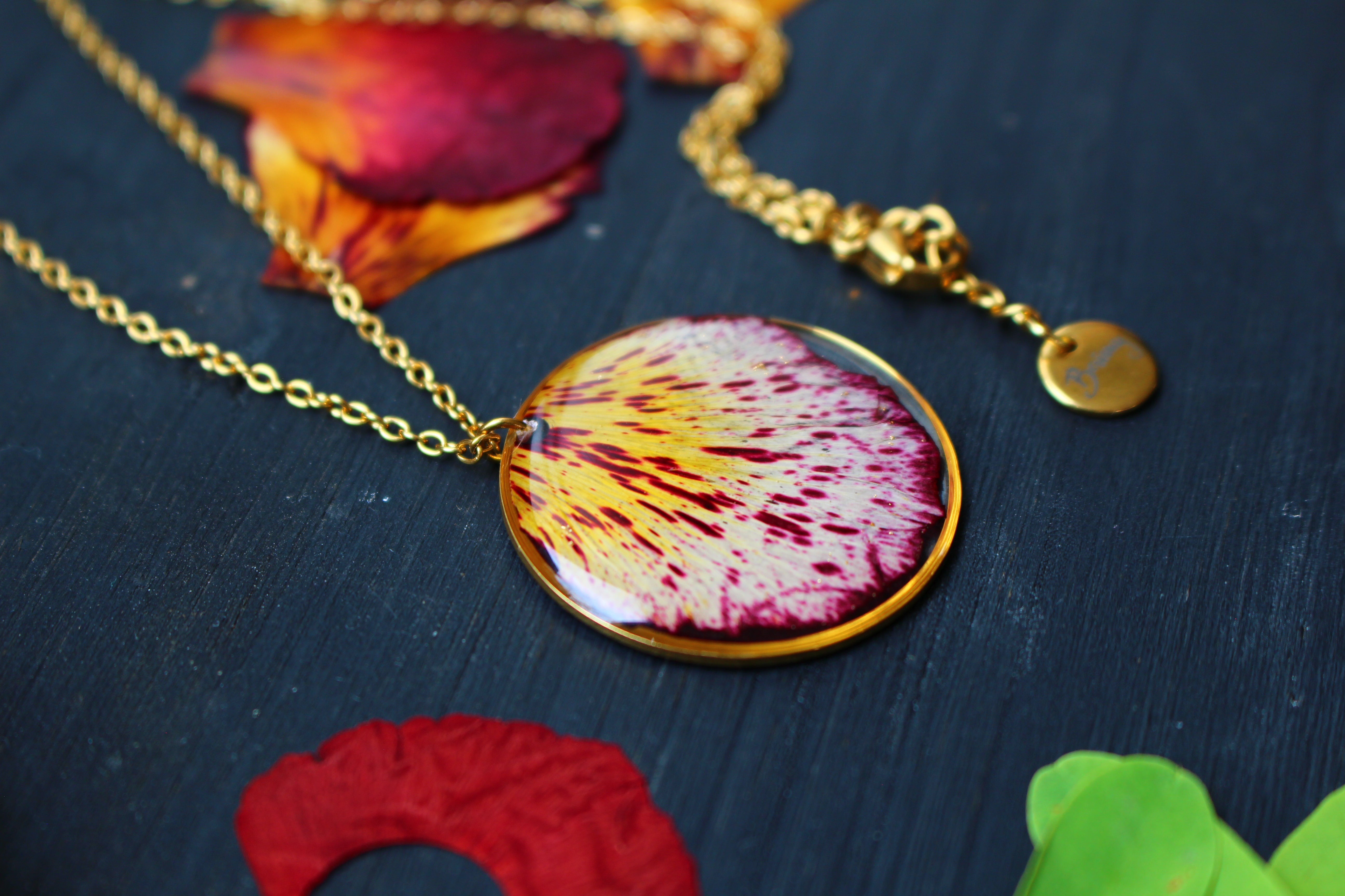 Collier mi long composé d'un médaillon de 30mm de diamètre rempli de résine dans laquelle j'ai incrusté un pétale de flamboyant et quelques morceaux de feuilles d'or
