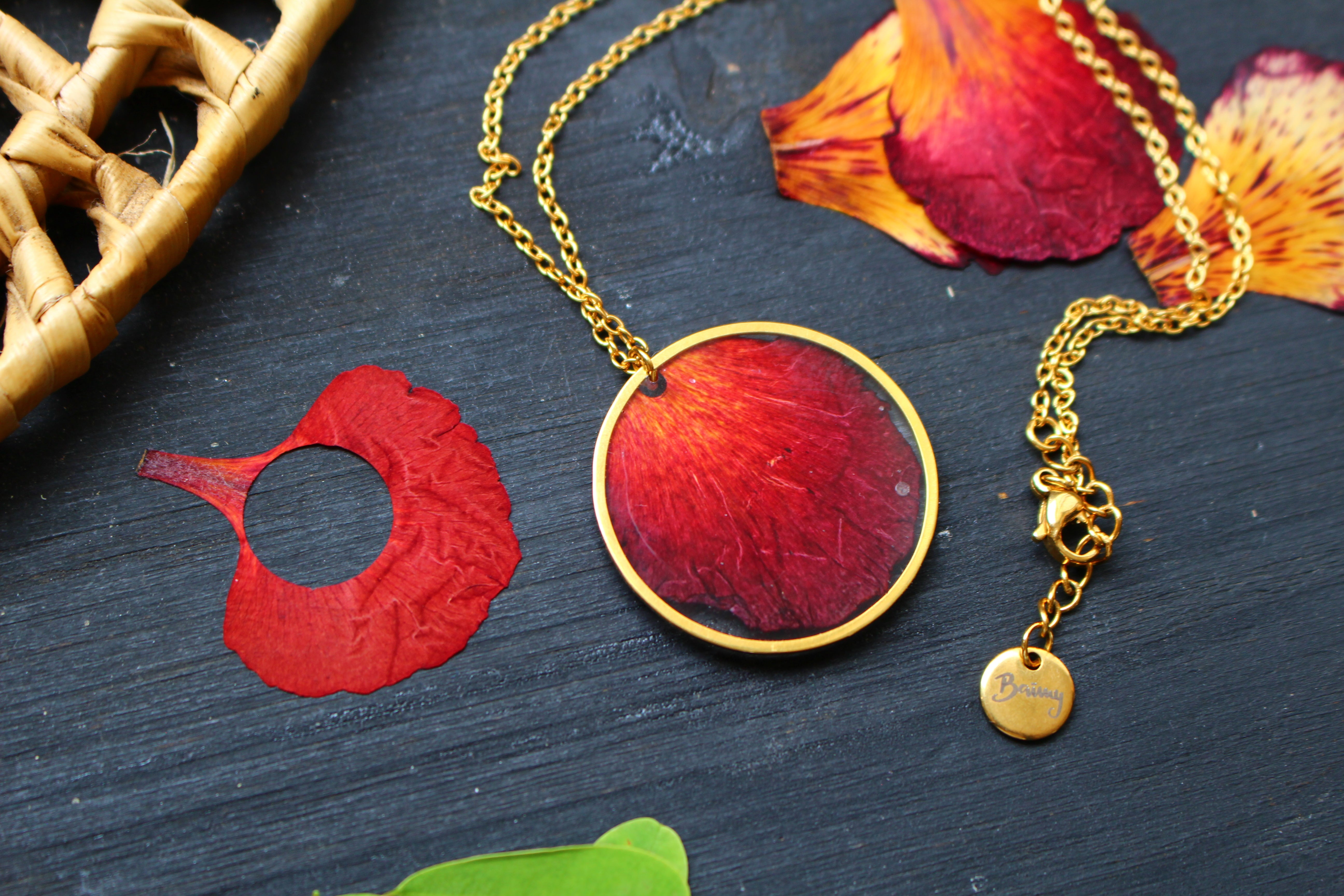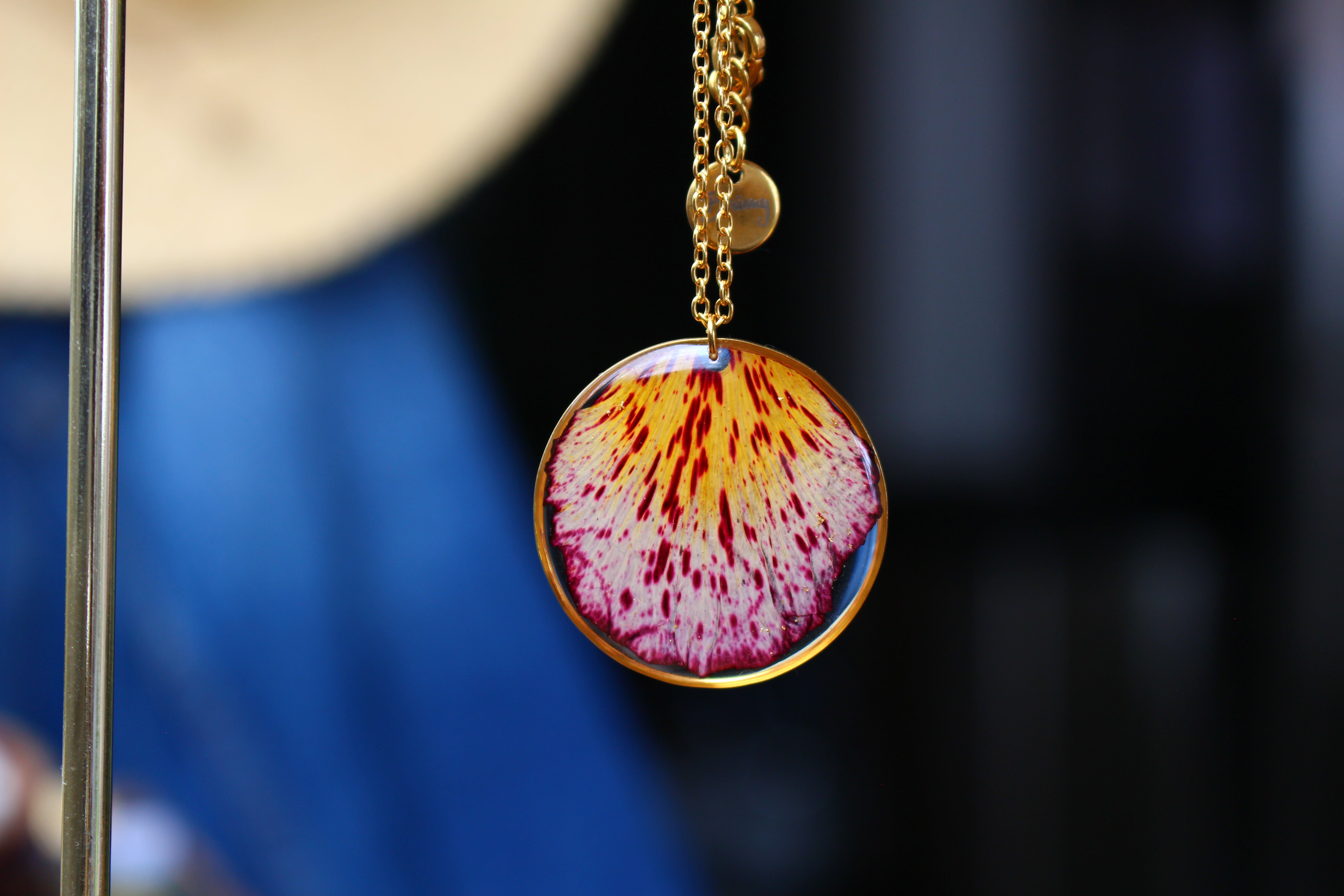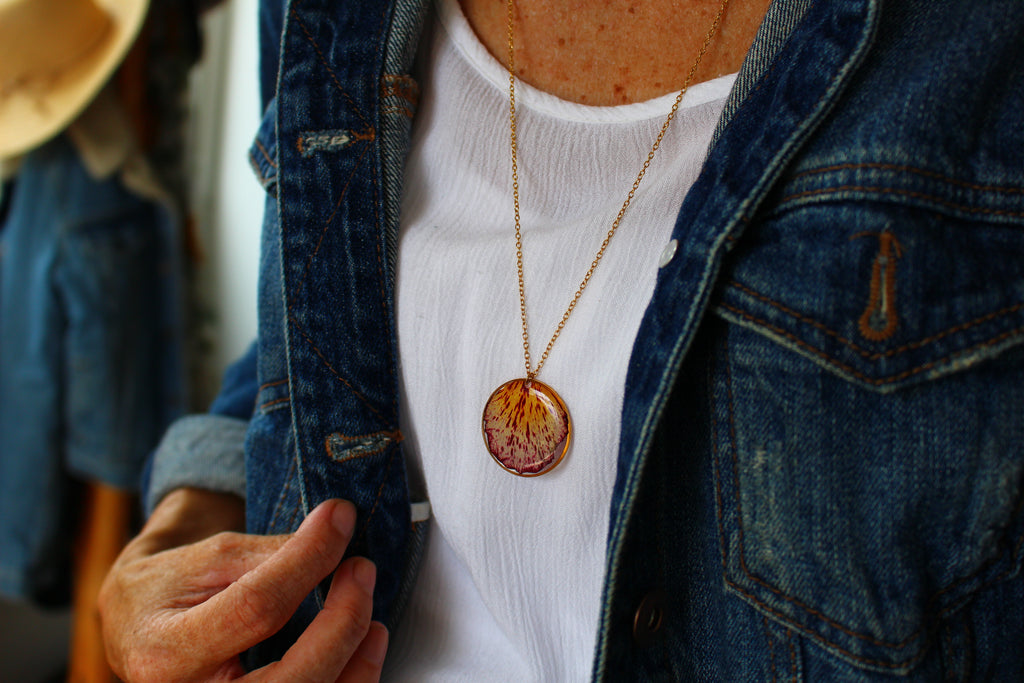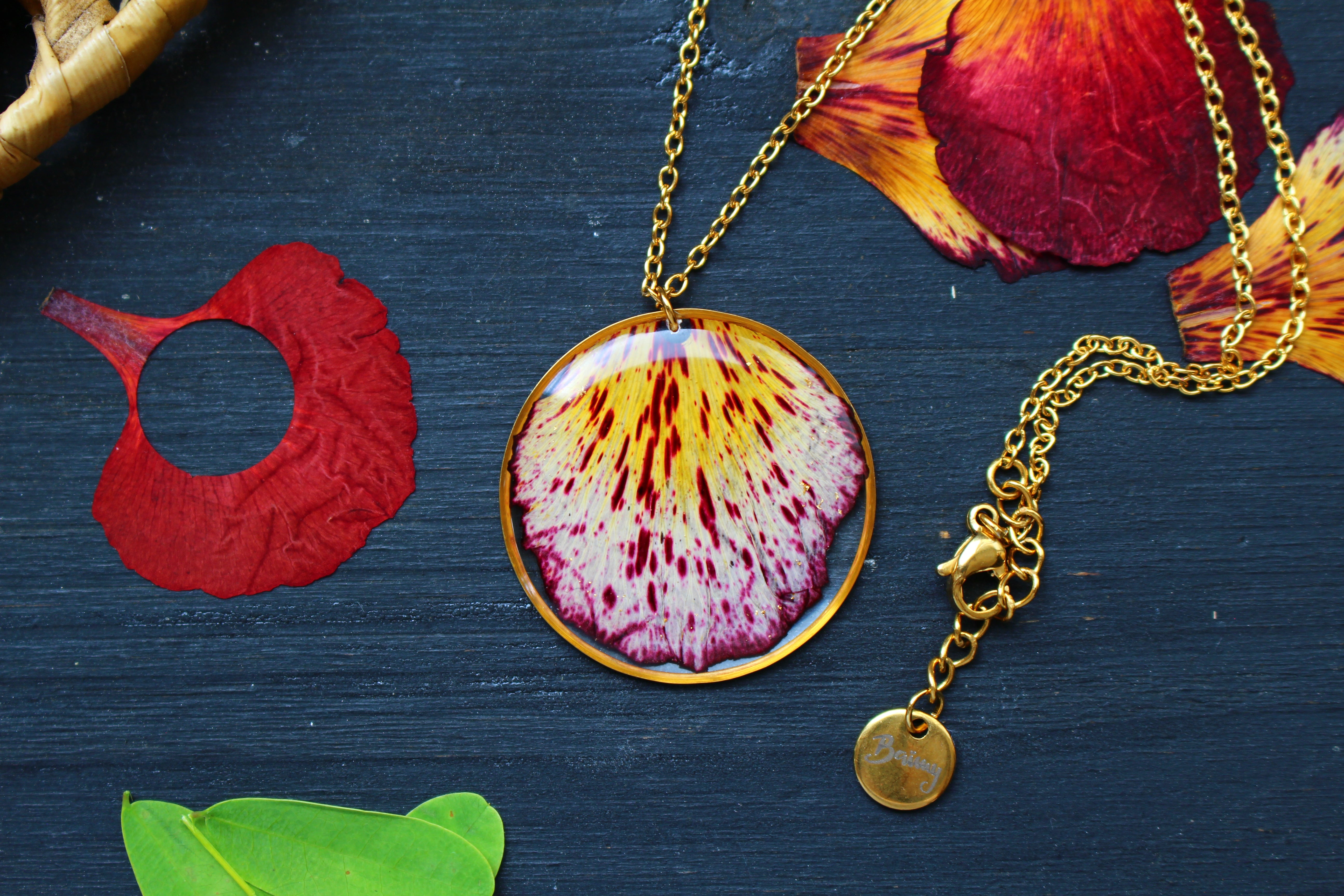 Collier mi long composé d'un médaillon de 30mm de diamètre rempli de résine dans laquelle j'ai incrusté un pétale de flamboyant et quelques morceaux de feuilles d'or