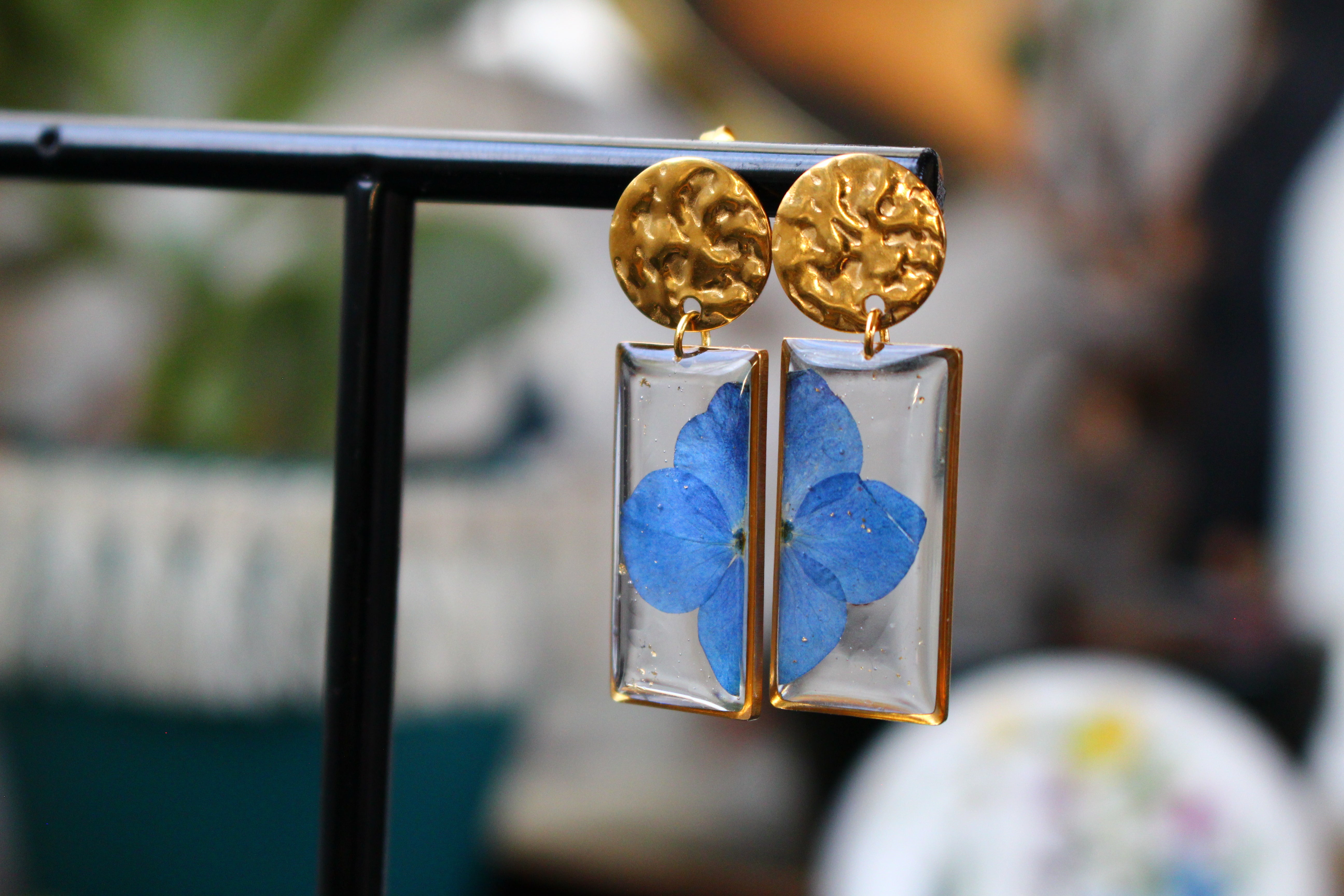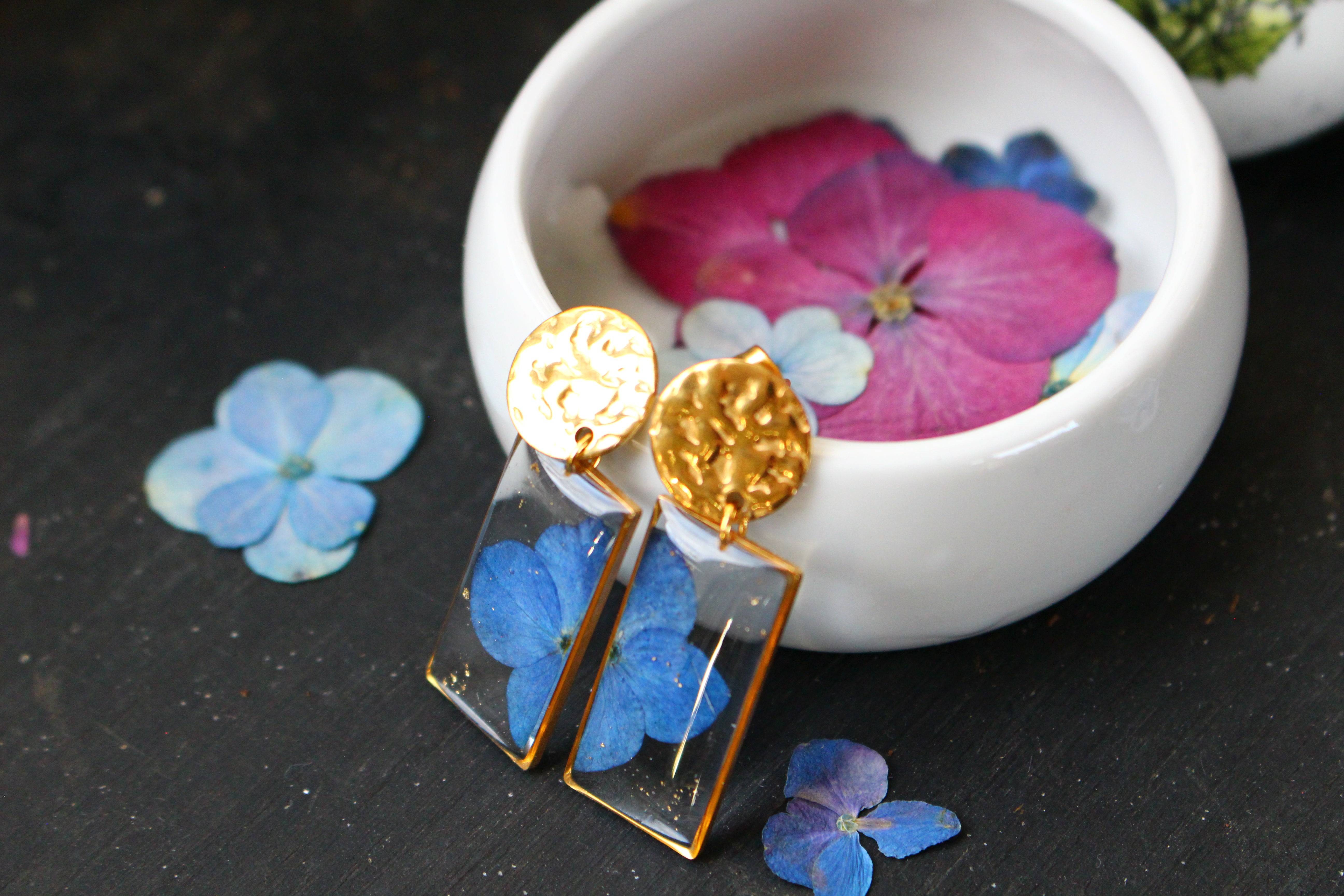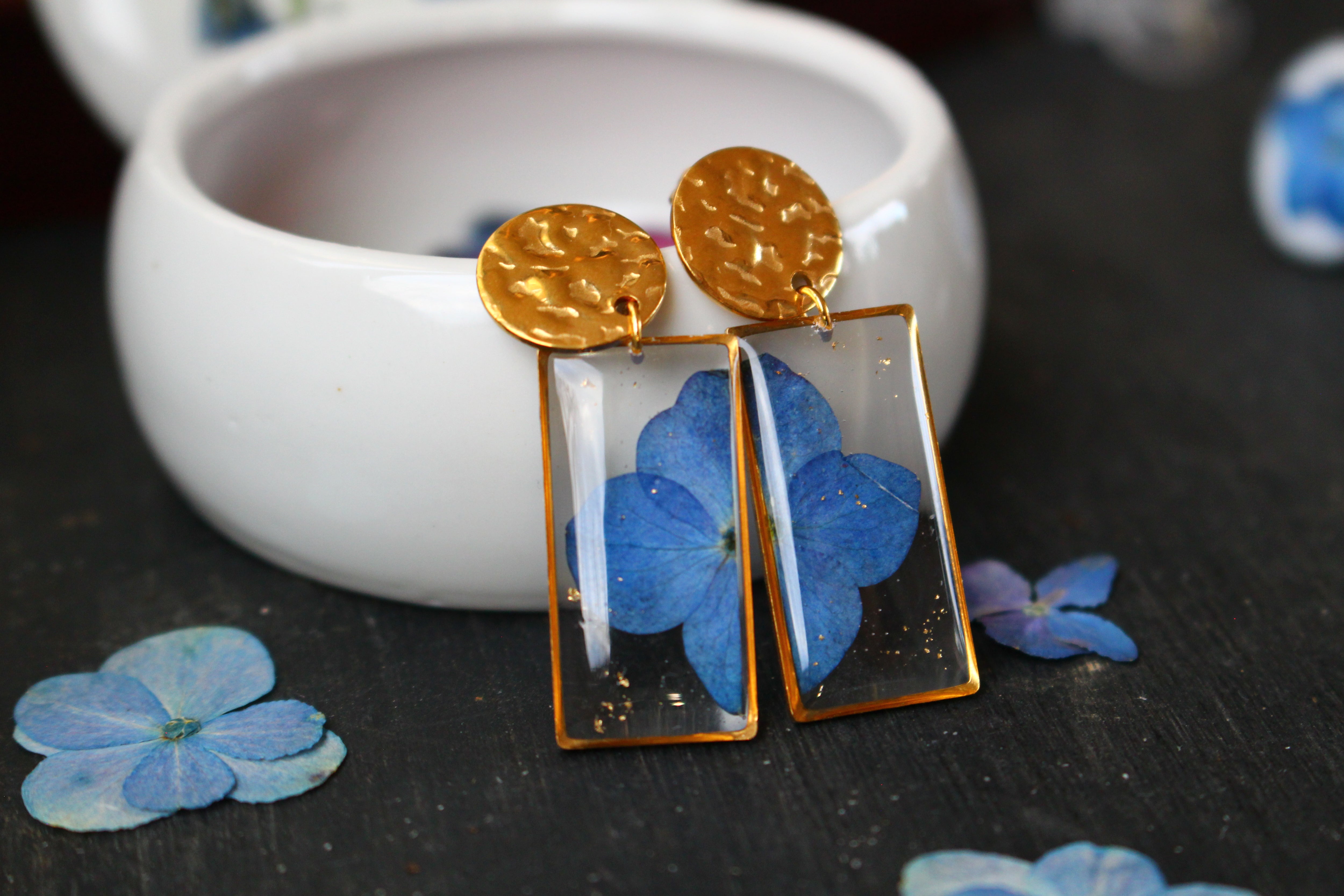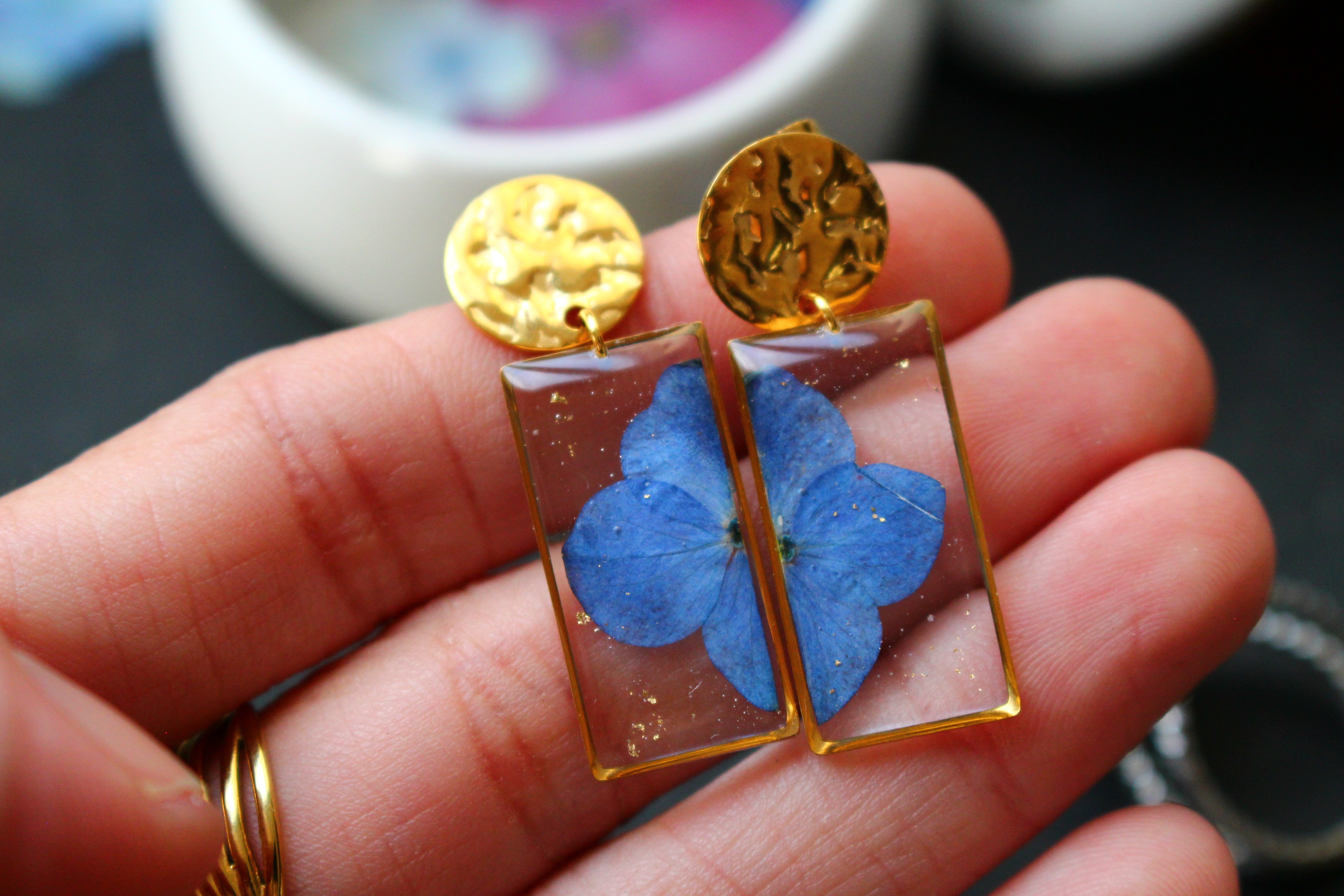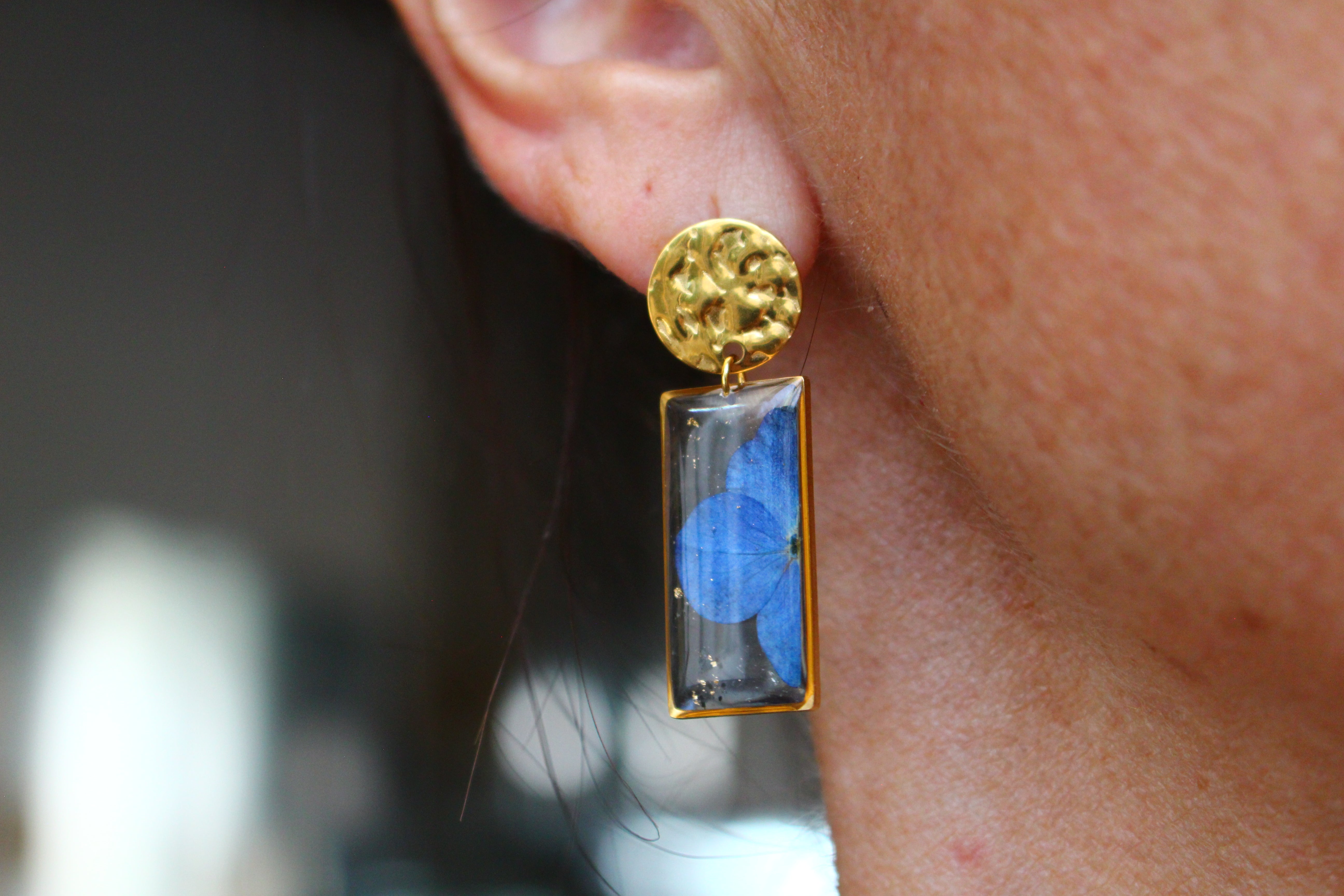 Boucles composées de médaillons rectangulaires remplis de résine dans laquelle j'ai incrusté une fleur d'Hortensia provenant de la plaine des cafres, sur l'île de la Réunion , et quelques morceaux de feuilles d'or